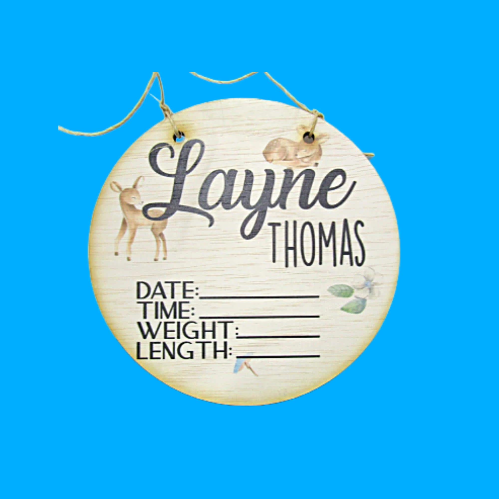 Custom Wood‑Printed Birth Announcement Sign • Woodland Baby Name Plaque • Newborn Stats Photo Prop & Nursery Decor