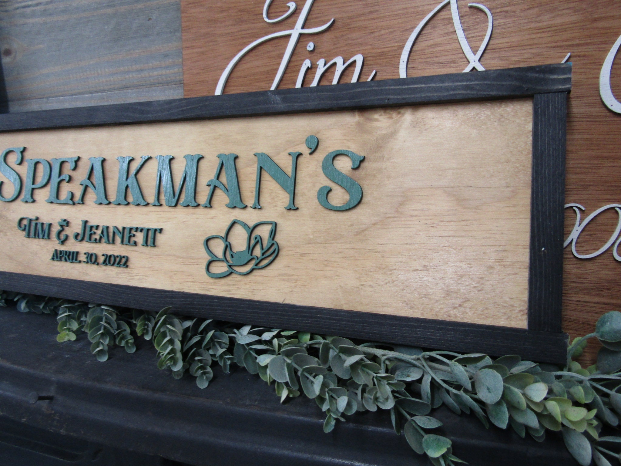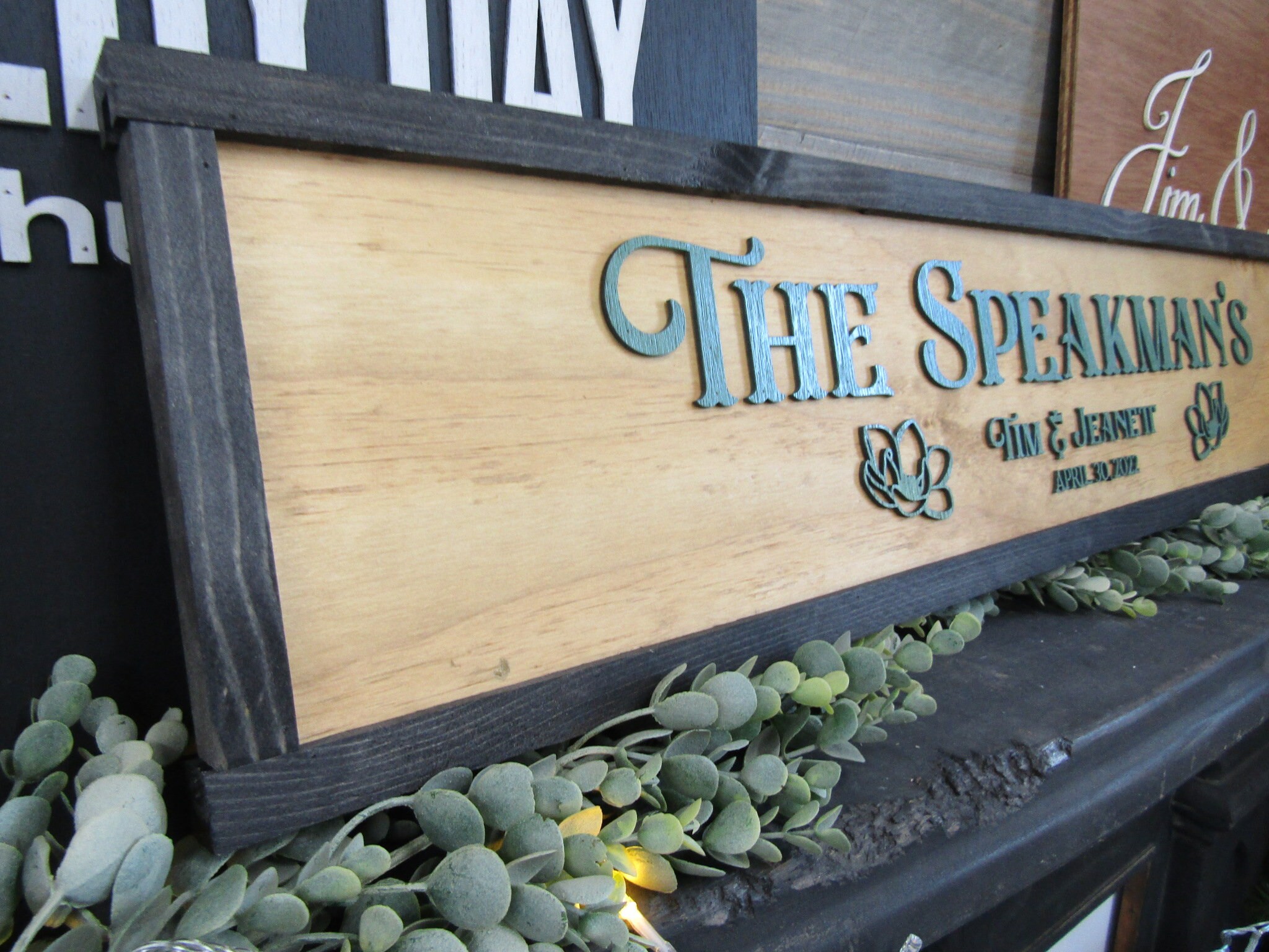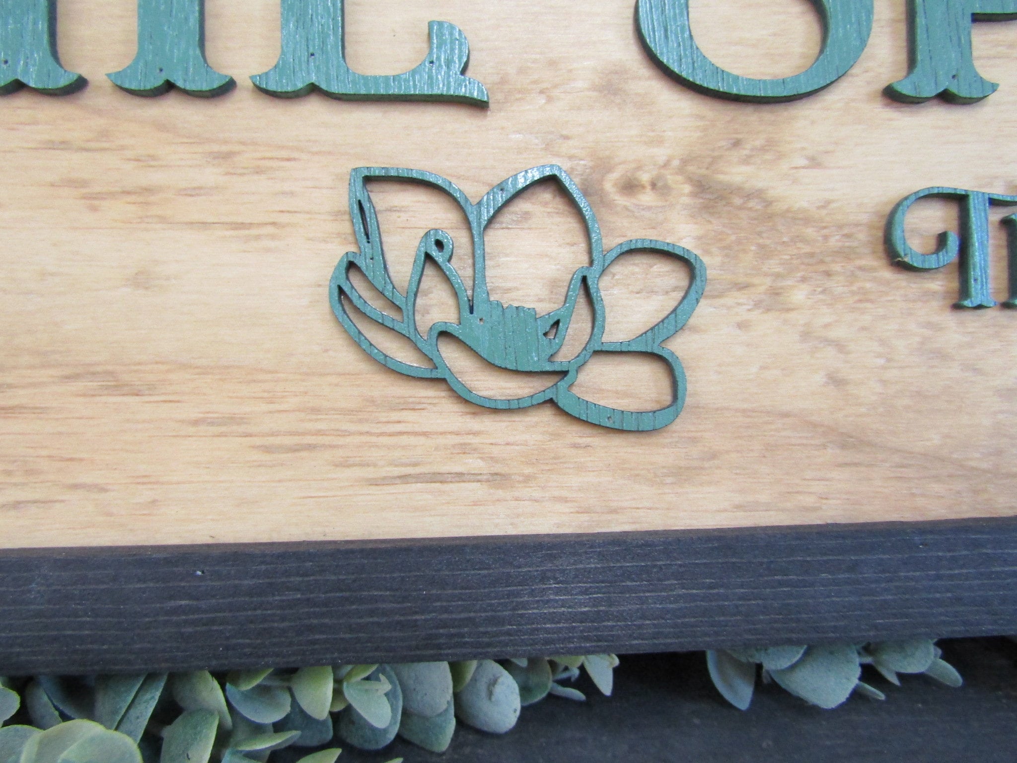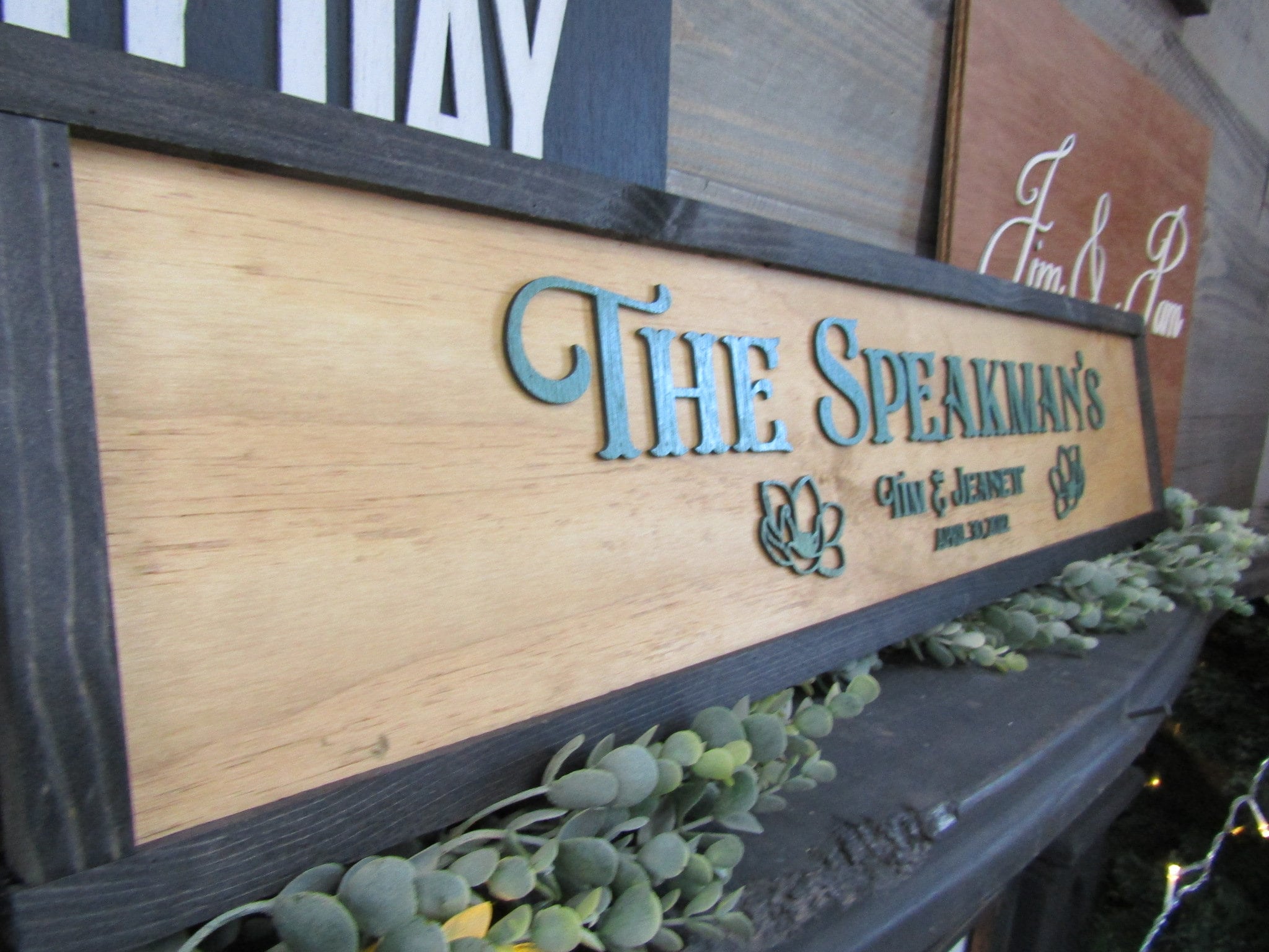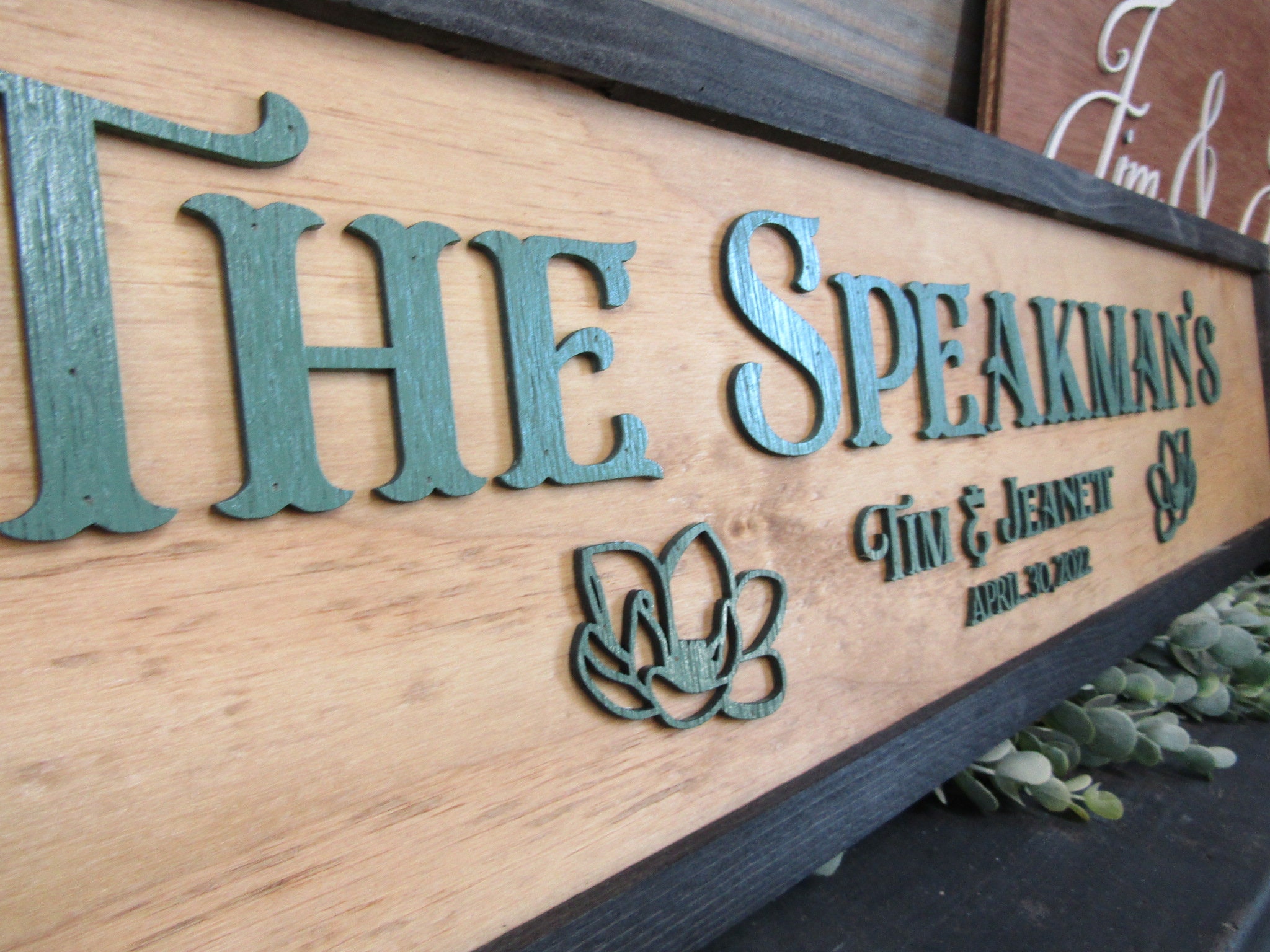 It has laser cut plywood letters and graphics. Your custom sign will NOT come standard with these graphics or lettering. All components can be customized. This sign has a solid wood frame stained ebony, medium brown stained backerboard, and green painted letters.
