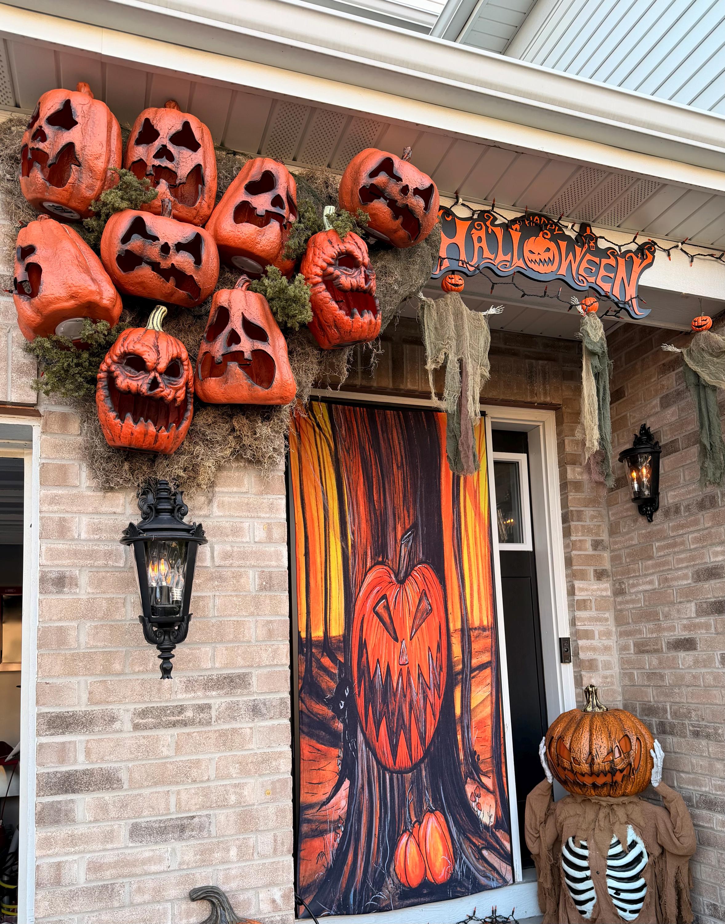 The sign we have here is a Happy Halloween orange and black sign. The sign you see has several halloween themed areas with a black cat, forest, grave yard and of course the pumpkin jack o lantern.