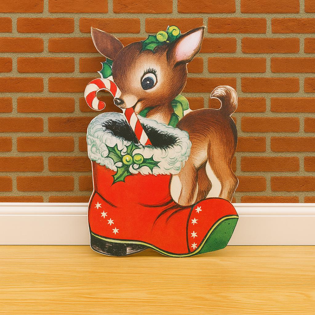 Add a touch of whimsy to your holiday decor with this adorable baby reindeer nestled in a festive Christmas stocking. Crafted from marine-grade plywood, this cutout is built to last through seasons of cheer—perfect for porches, party backdrops, or cozy indoor displays.
