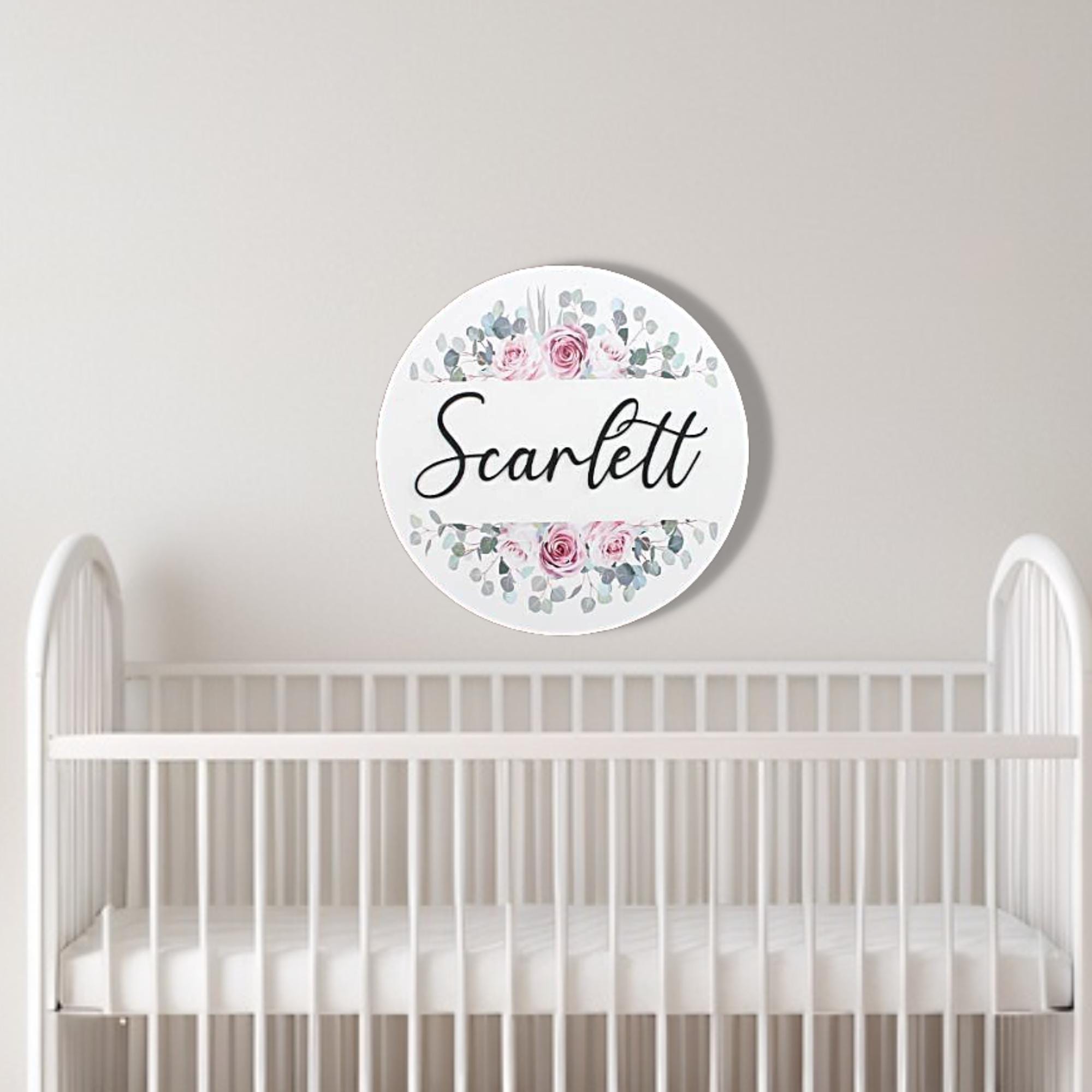 Custom 3D UV Printed Name Sign • Raised Text Floral Nursery Sign • Personalized Baby Name Round • Watercolor Flower Wall Decor