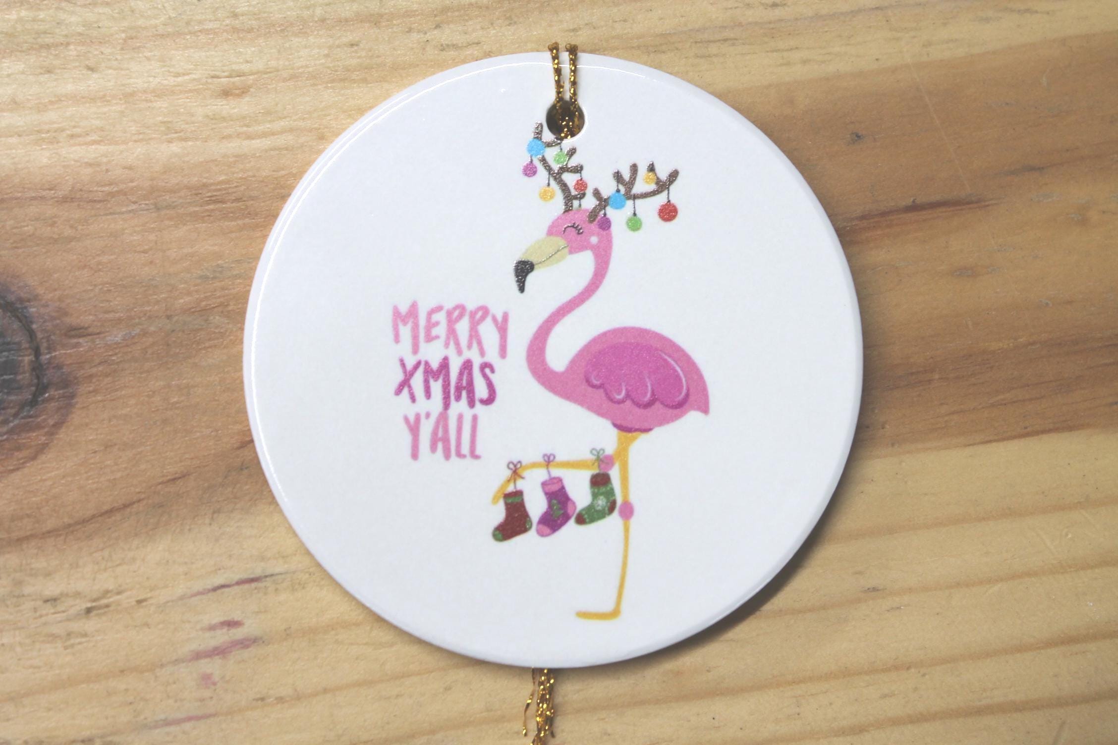 Merry XMas Yall Flamingo Holiday Ceramic Christmas tree Decoration Animal Ornament Decor Circle Gift Hanging Circle Bird Beach Bird Ocean