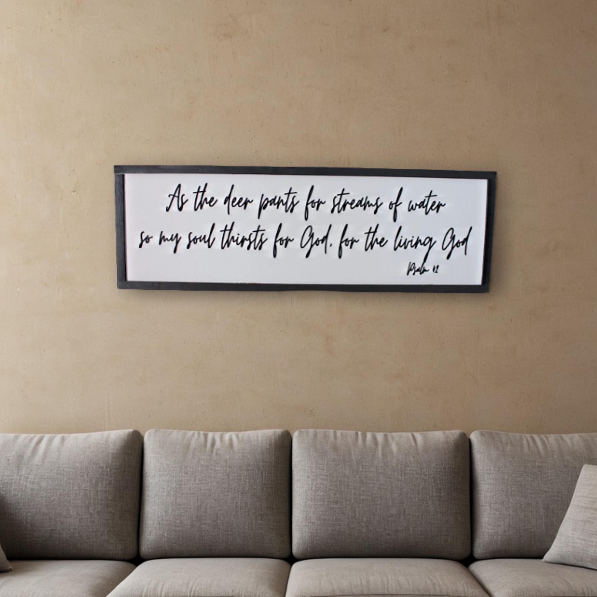 The size is in inches, and it is the overall size of the size, frame included. It is mounted on white painted 3/8 inch plywood with 1/4 inch laser cut plywood letters. Complete with solid wood frame. The frame is stained in an ebony coloring.