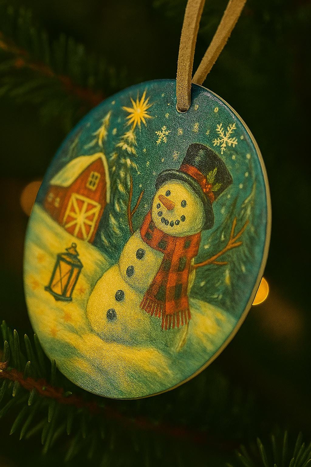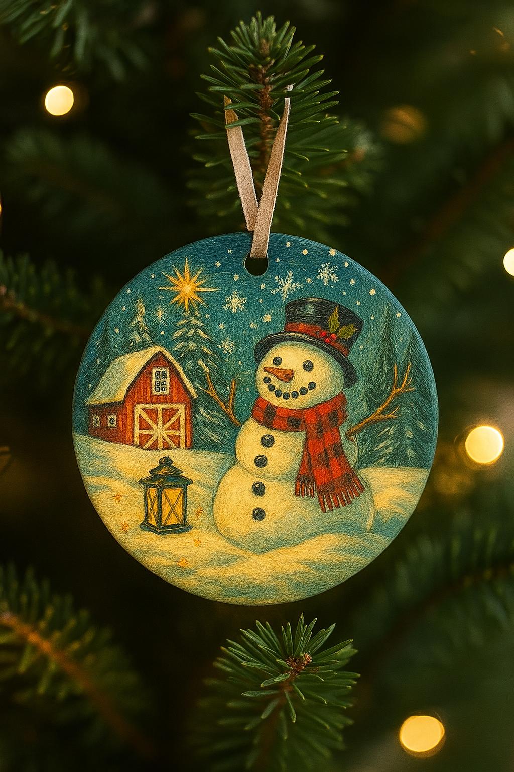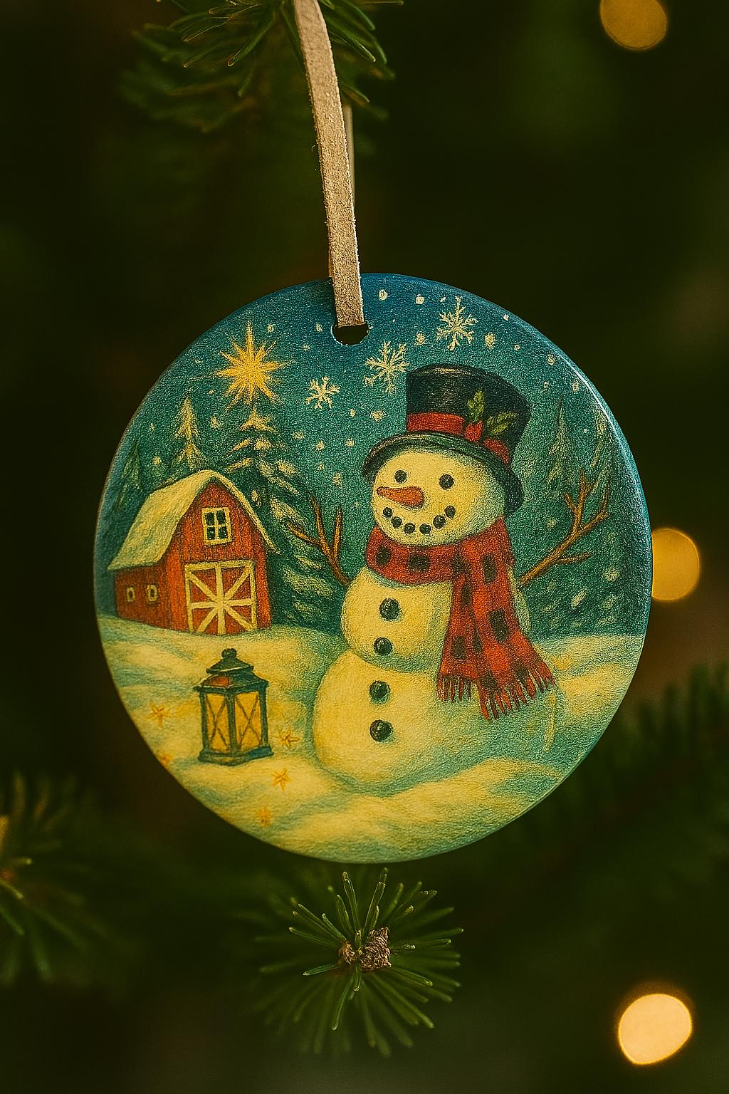 Celebrate the magic of the season with this charming ceramic ornament featuring a cheerful snowman, glowing lantern, and classic red barn nestled in a snowy pine forest. Designed to evoke cozy winter nights and festive farmhouse charm, this ornament makes a perfect addition to your Christmas tree decorations or a thoughtful holiday gift for loved ones.