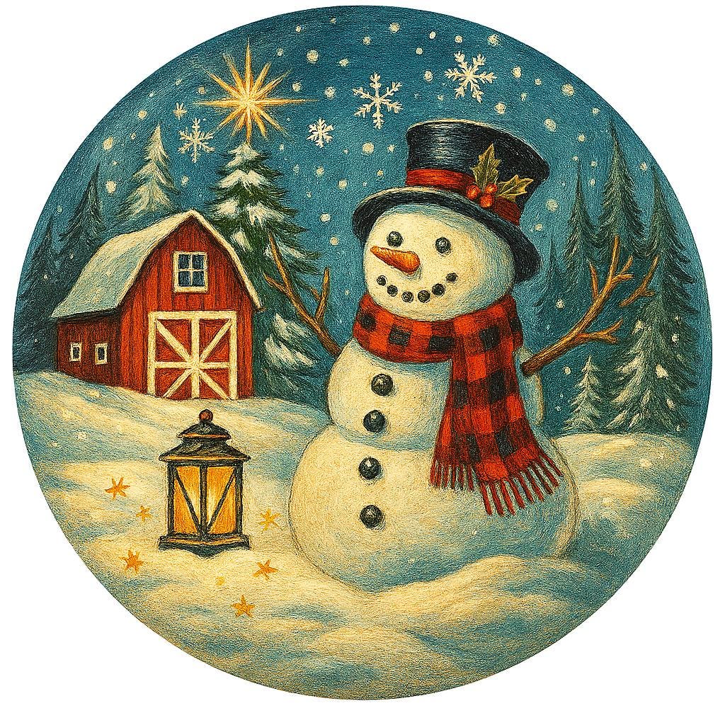Vibrant winter scene with snowman, barn, and lantern