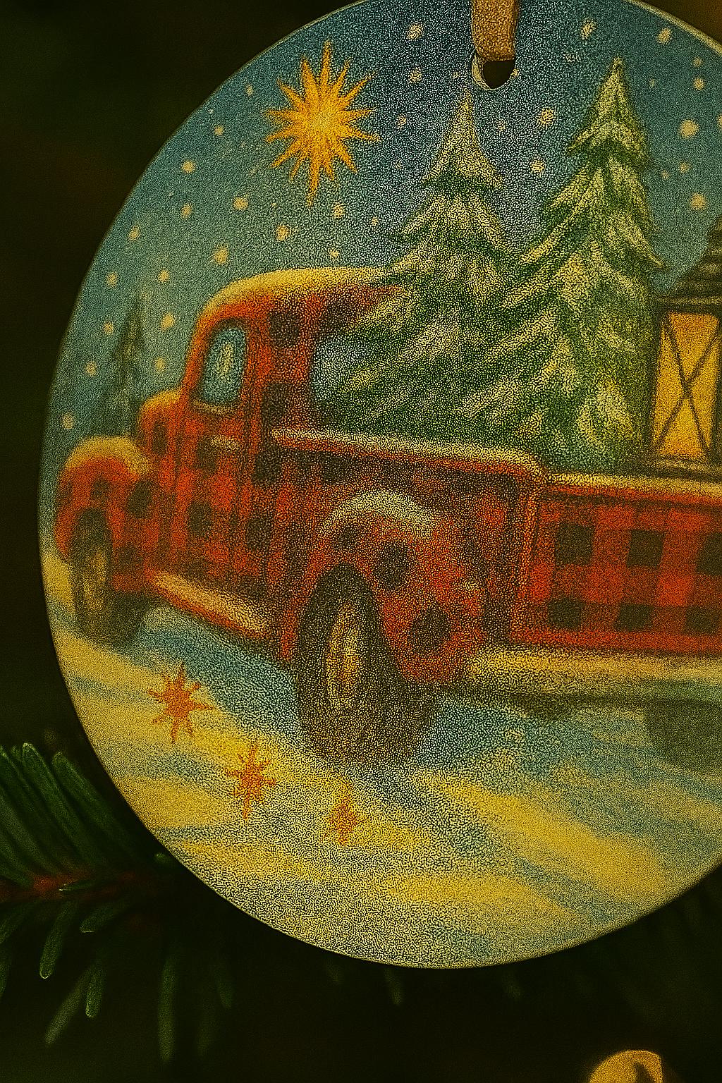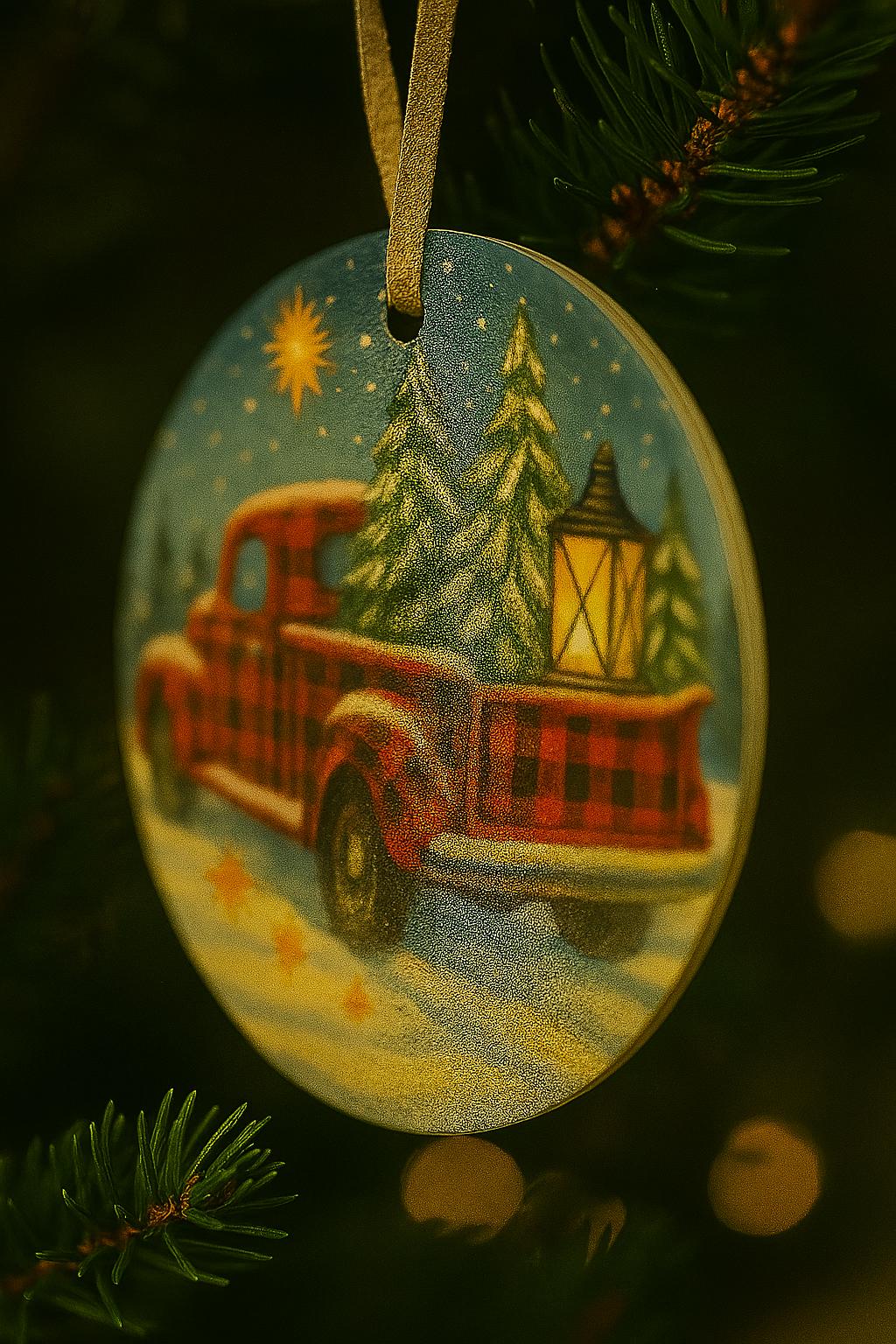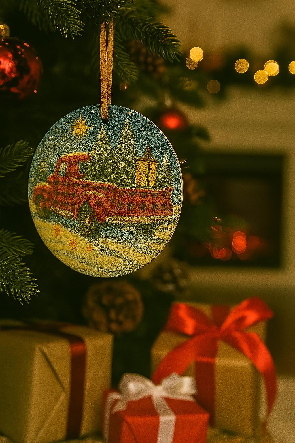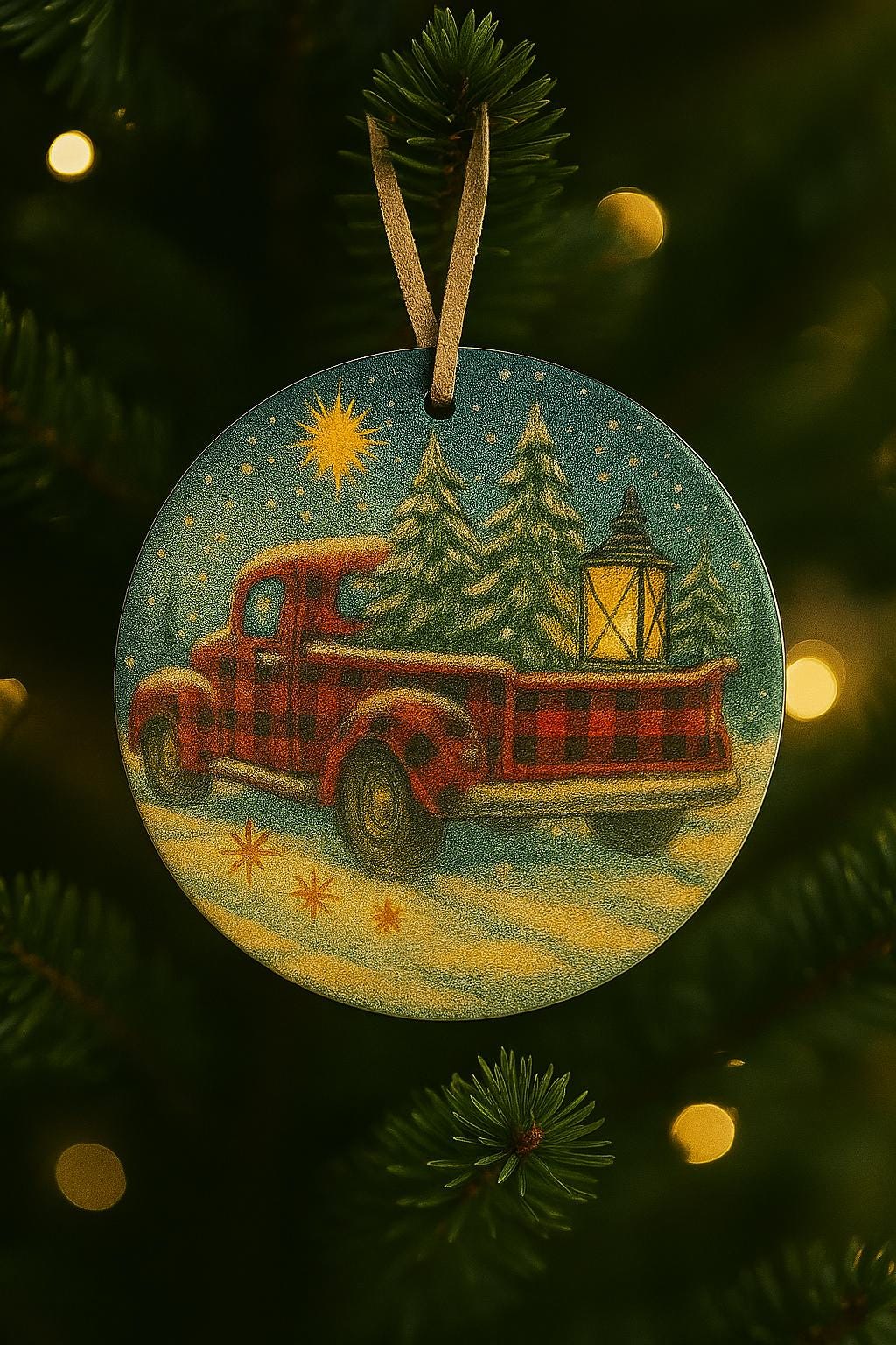 Bring nostalgic charm to your holiday decor with this festive ceramic ornament featuring a vintage red pickup truck driving through a snowy forest. Loaded with snow-covered pine trees and a glowing lantern, this cozy winter scene captures the magic of Christmas night under a starry sky. A perfect gift or keepsake for anyone who loves rustic holiday vibes and classic truck decor.