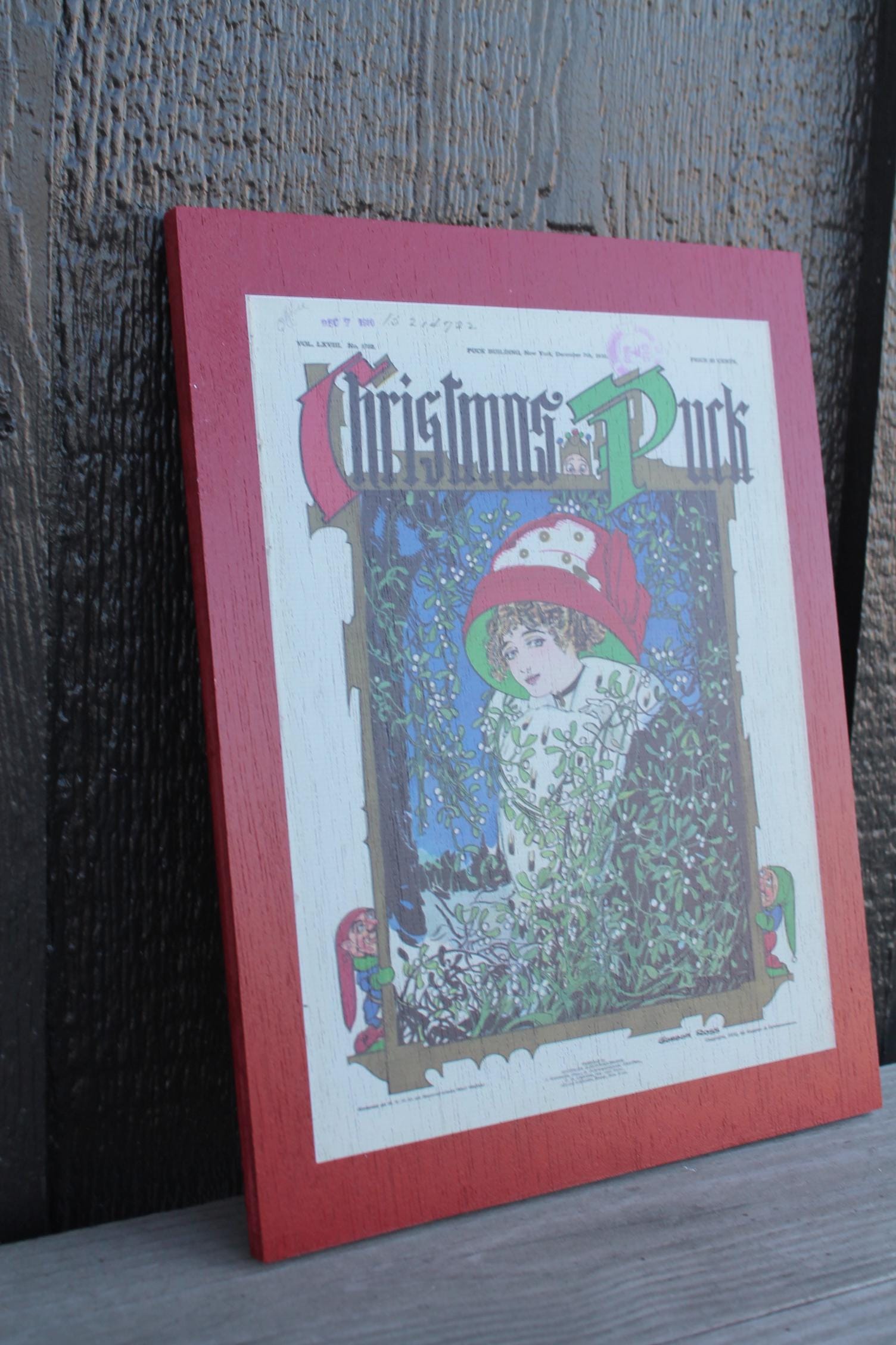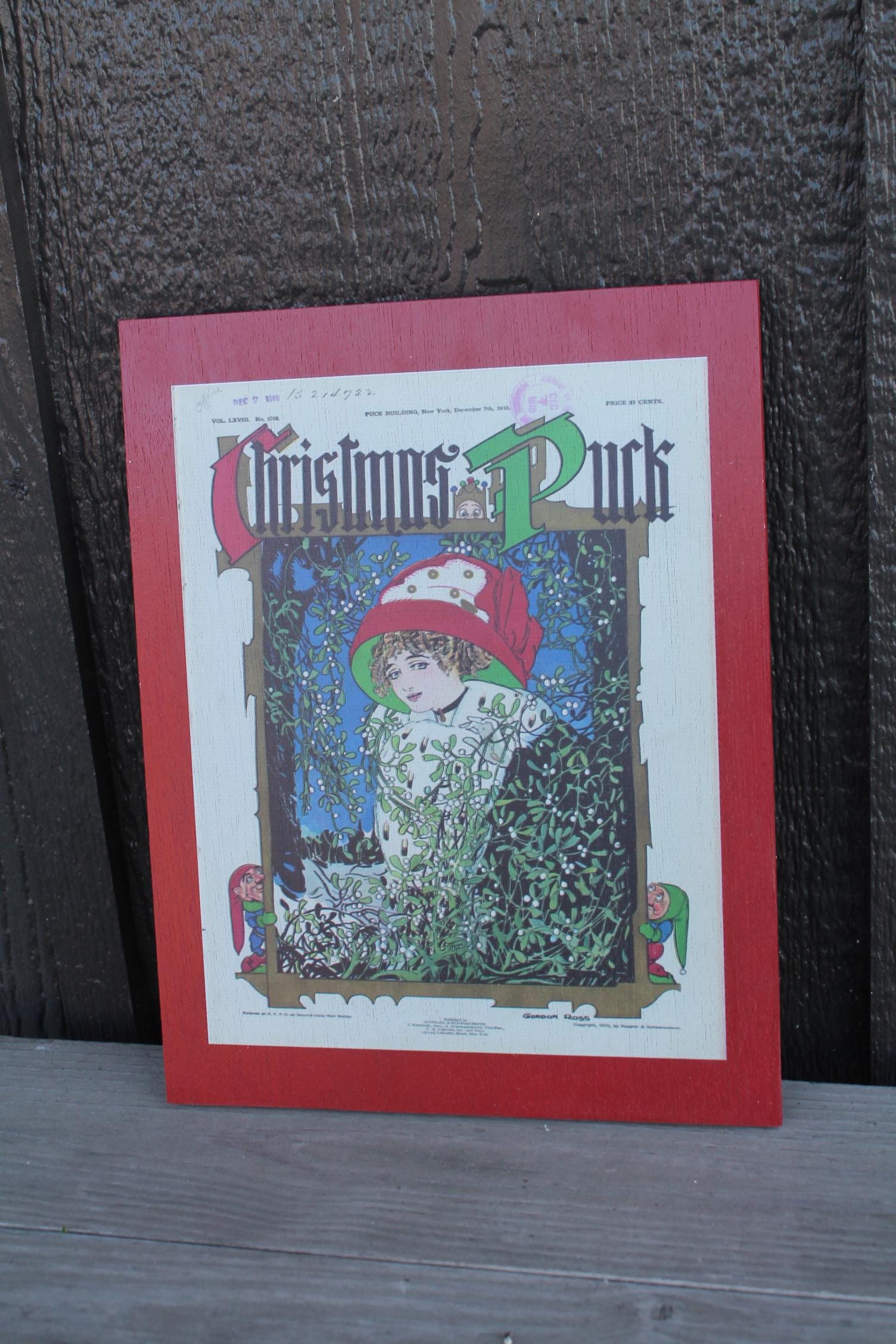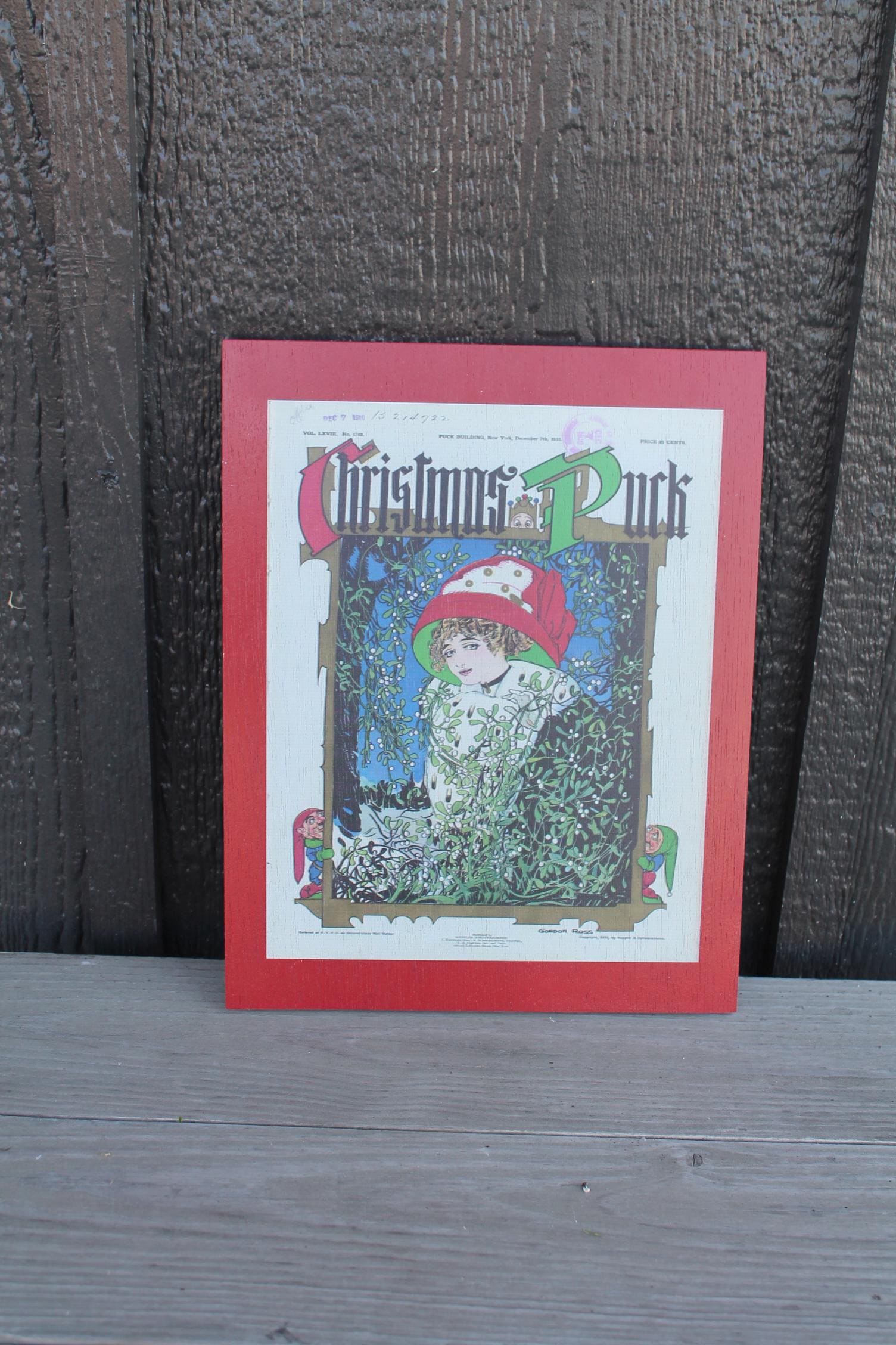 Christmas Lady in the Window Cartoon Puck Magazine Wood Decorative Sign Art 1800s Vintage Antique Printed Vignette Early 1900s Comics