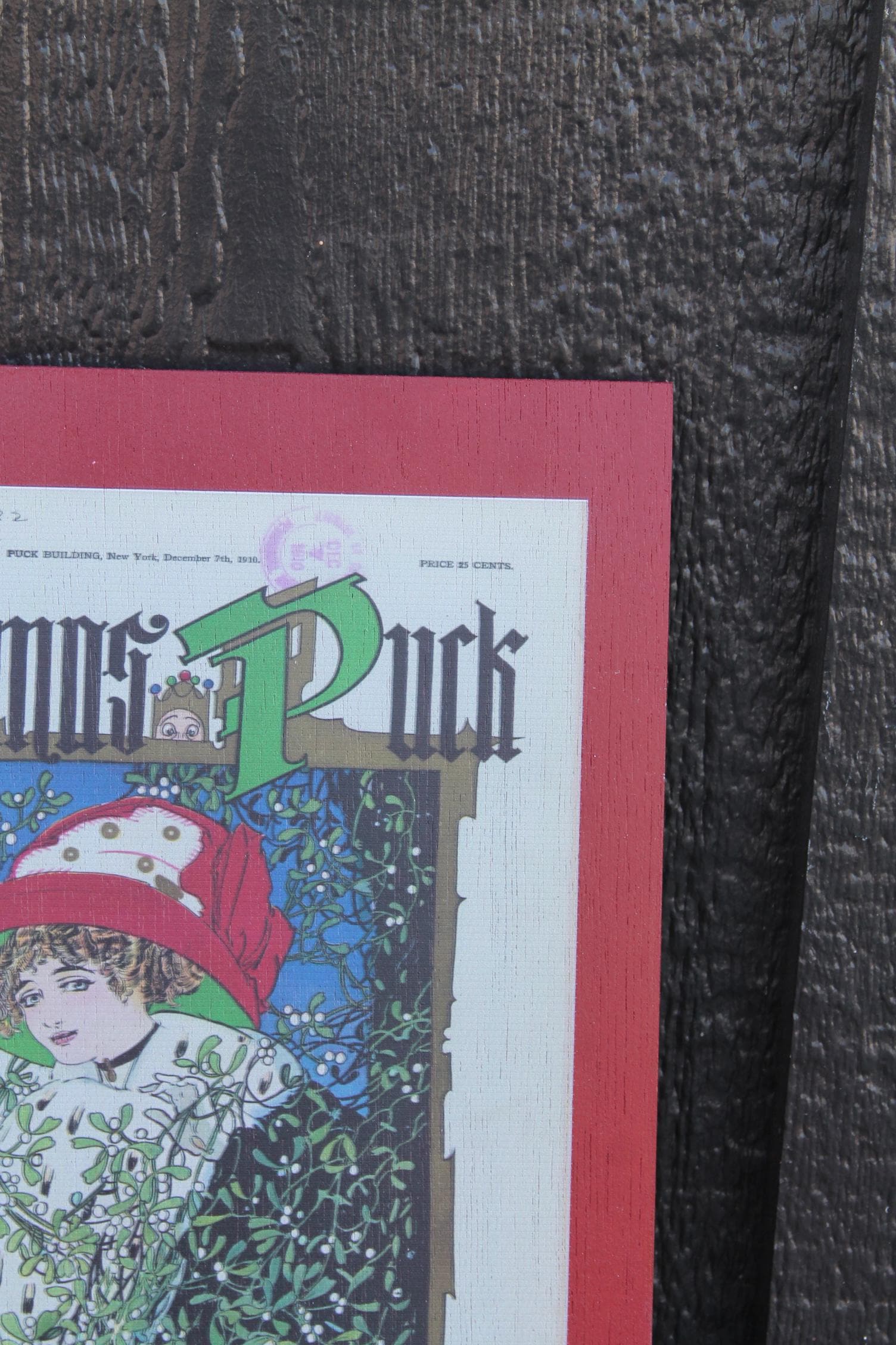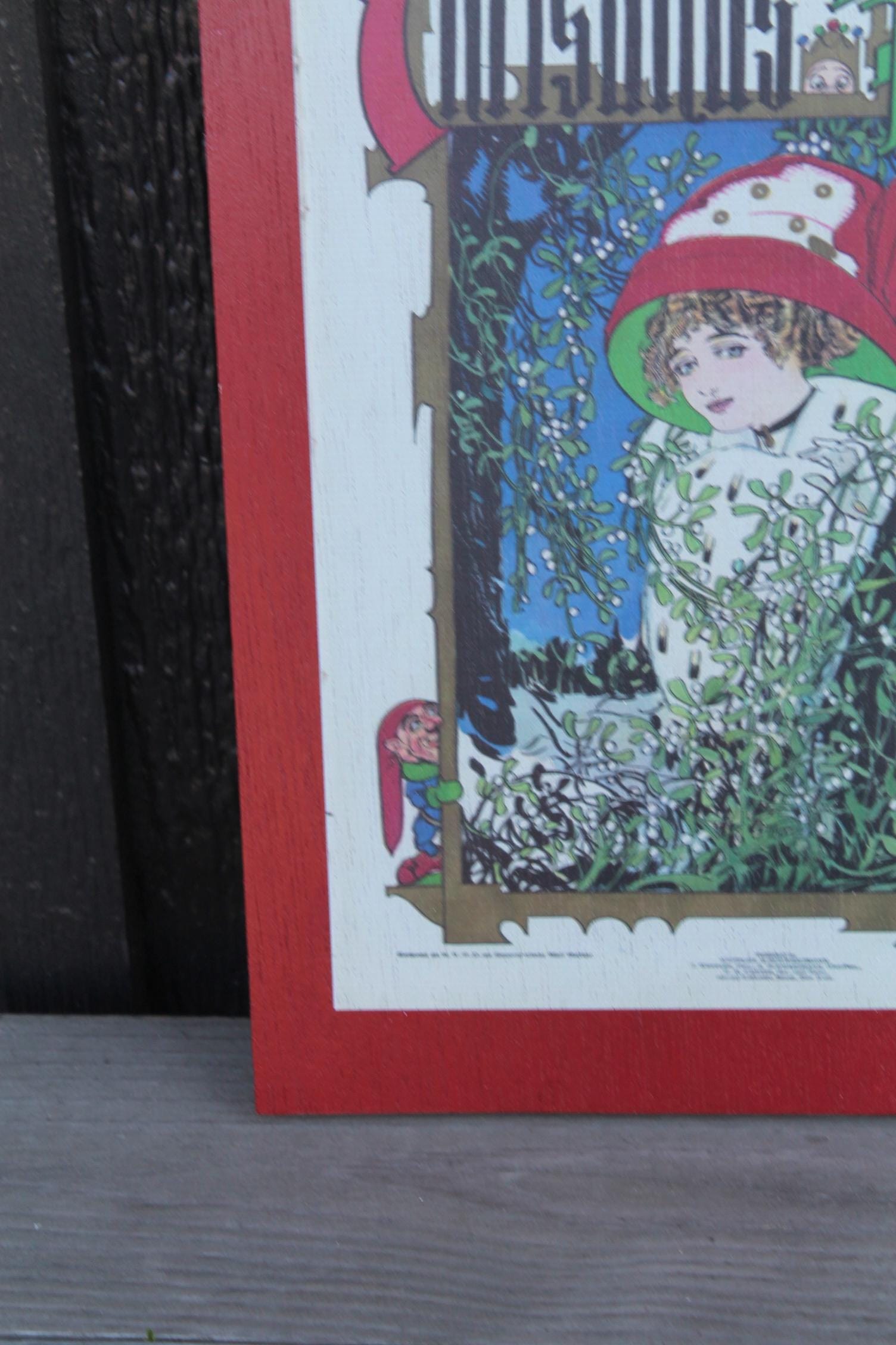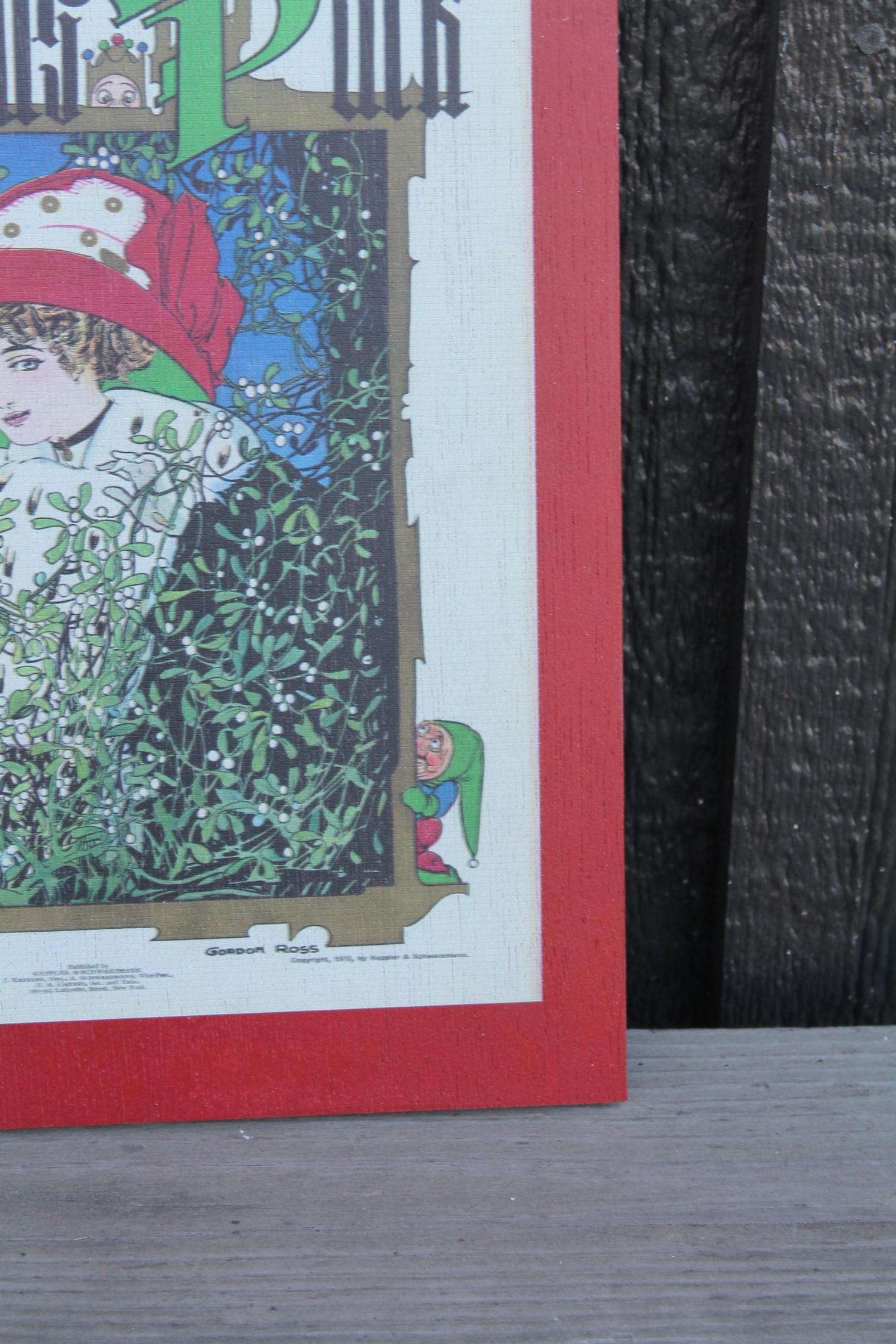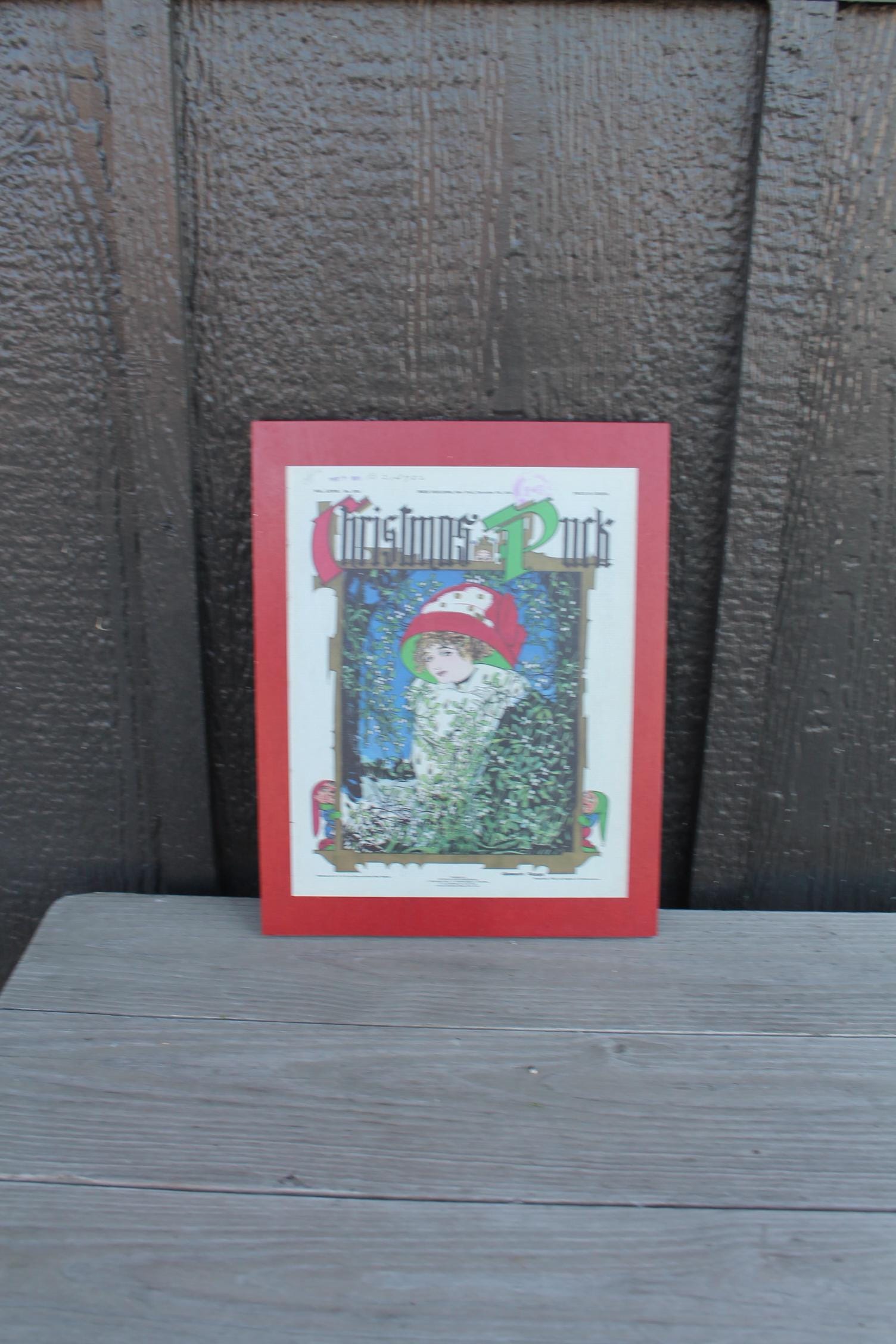 Christmas Lady in the Window Cartoon Puck Magazine Wood Decorative Sign Art 1800s Vintage Antique Printed Vignette Early 1900s Comics