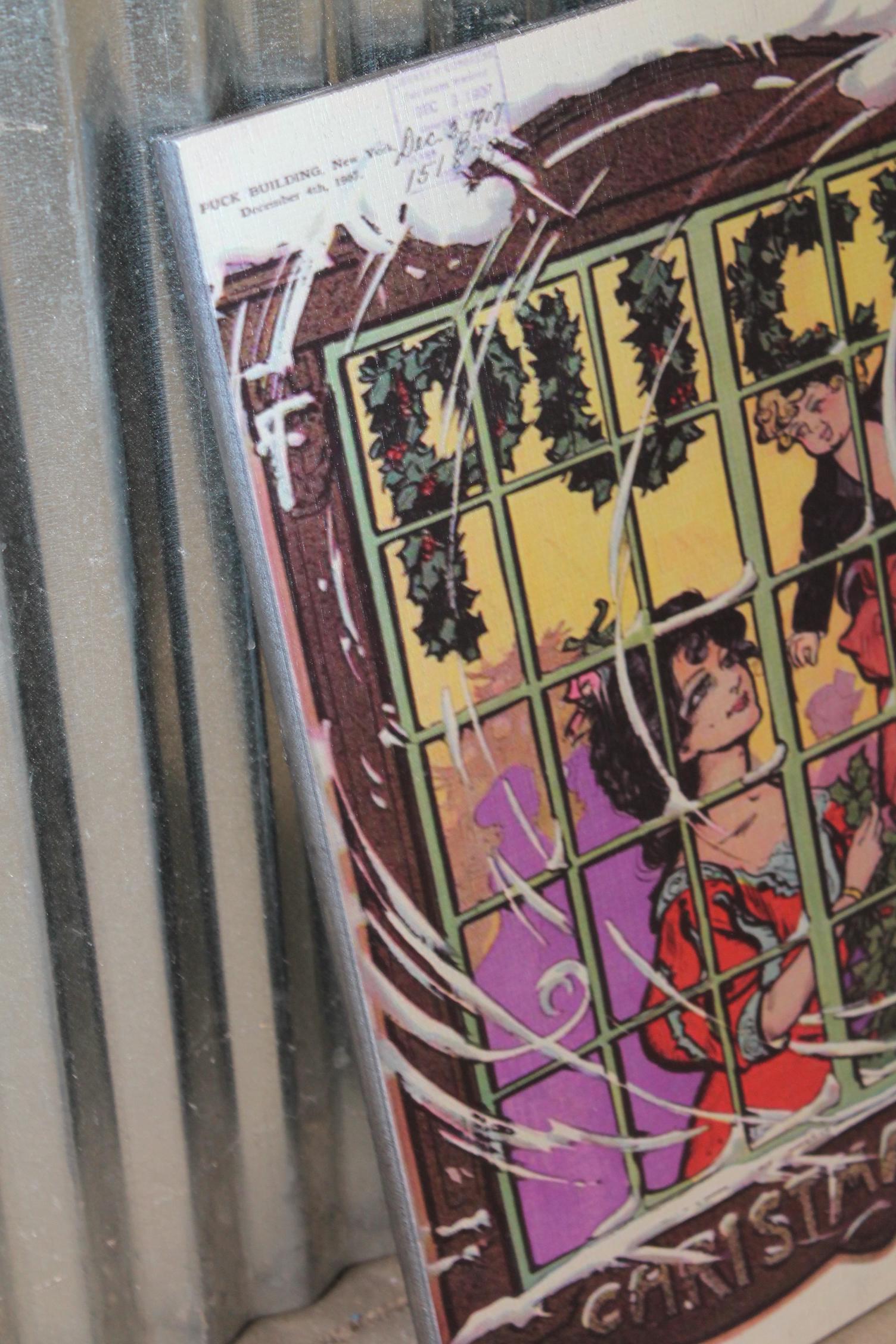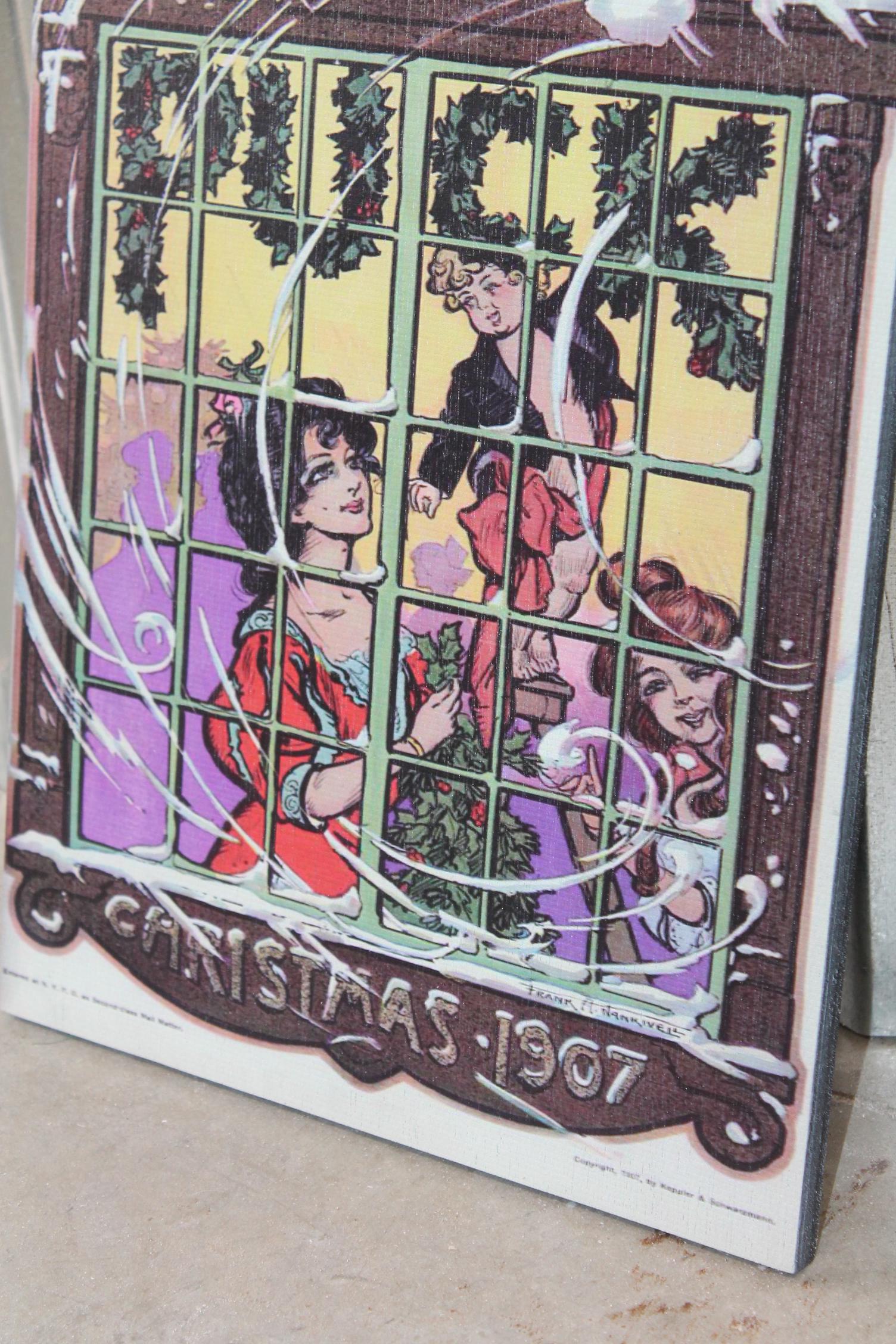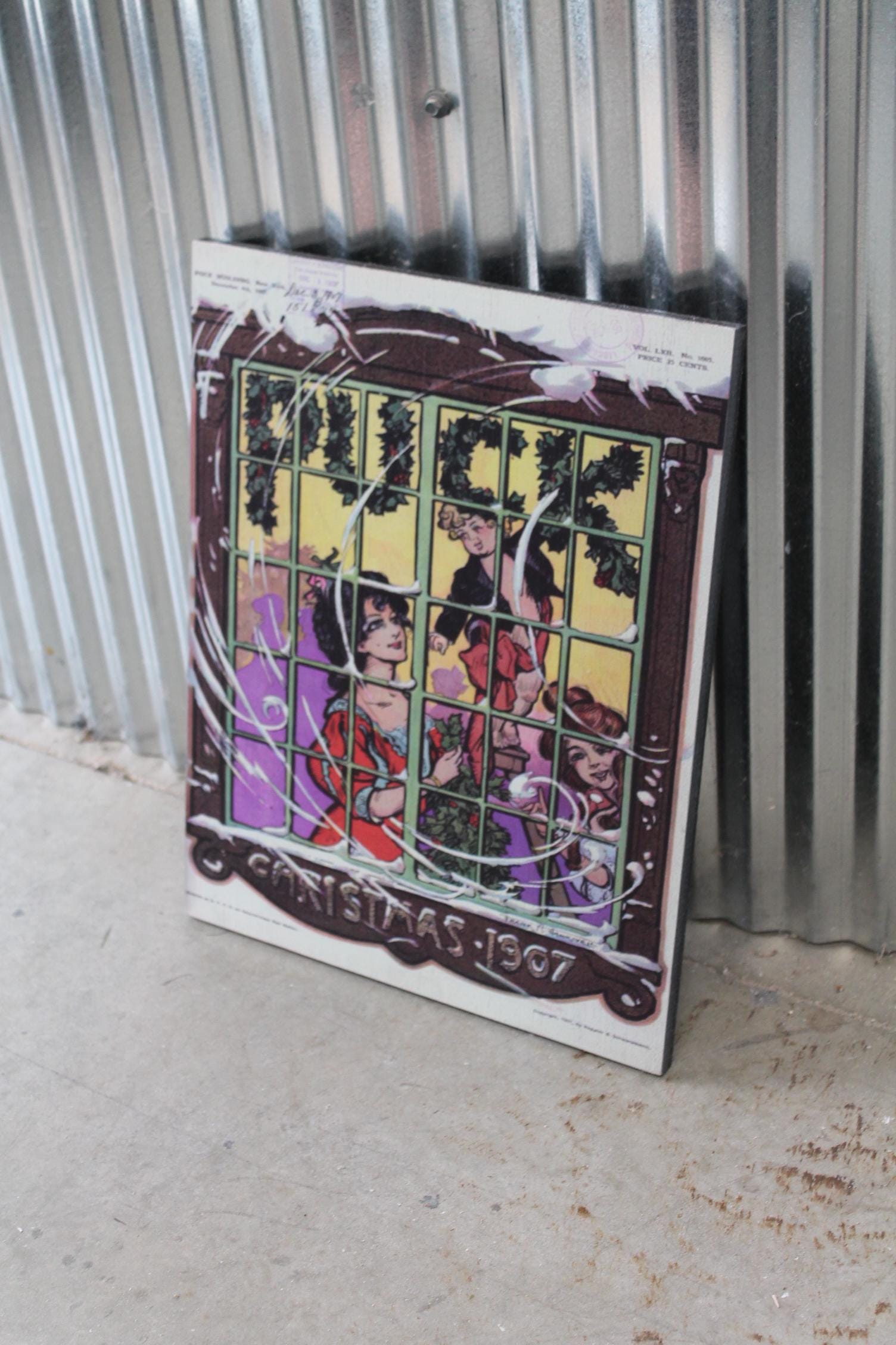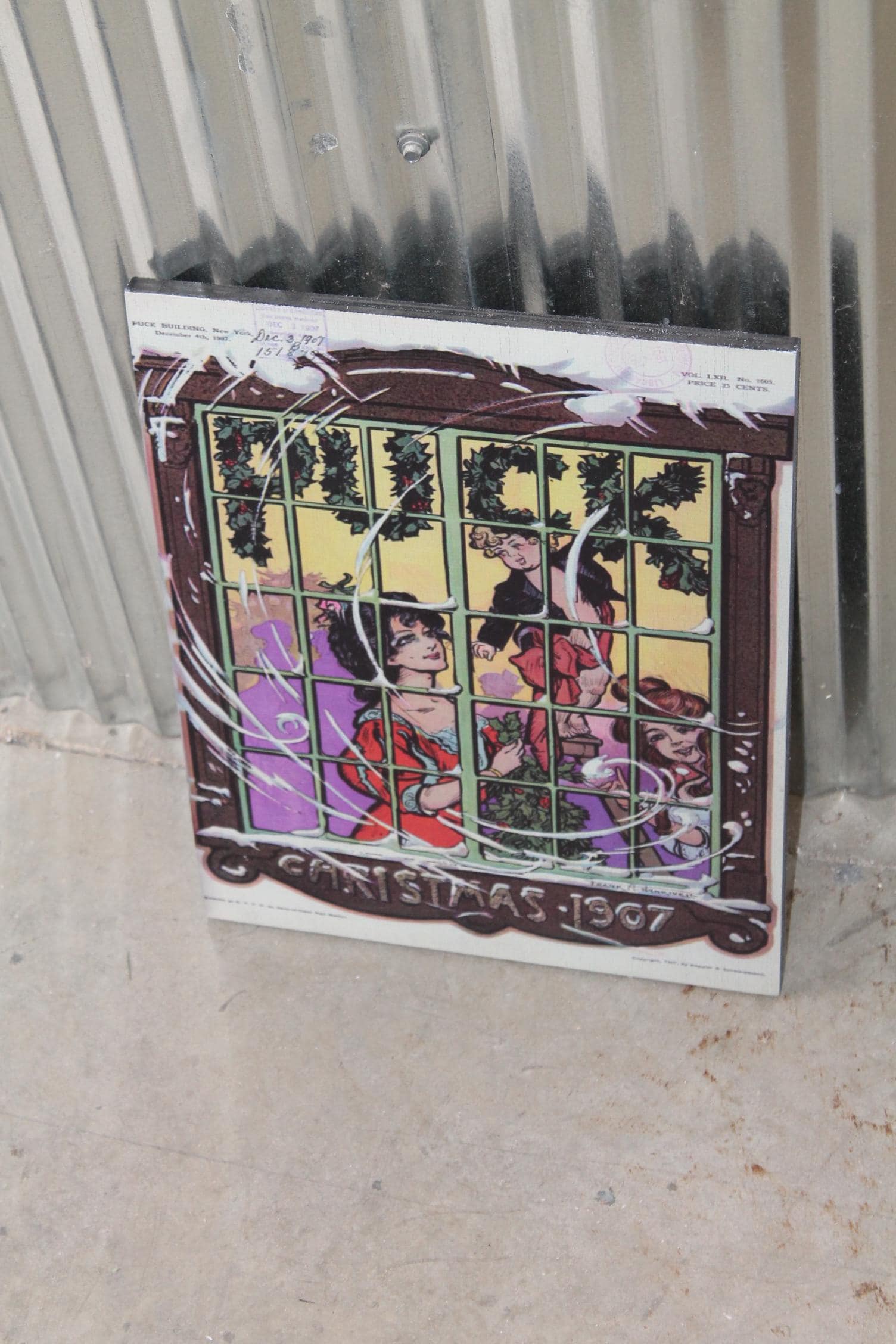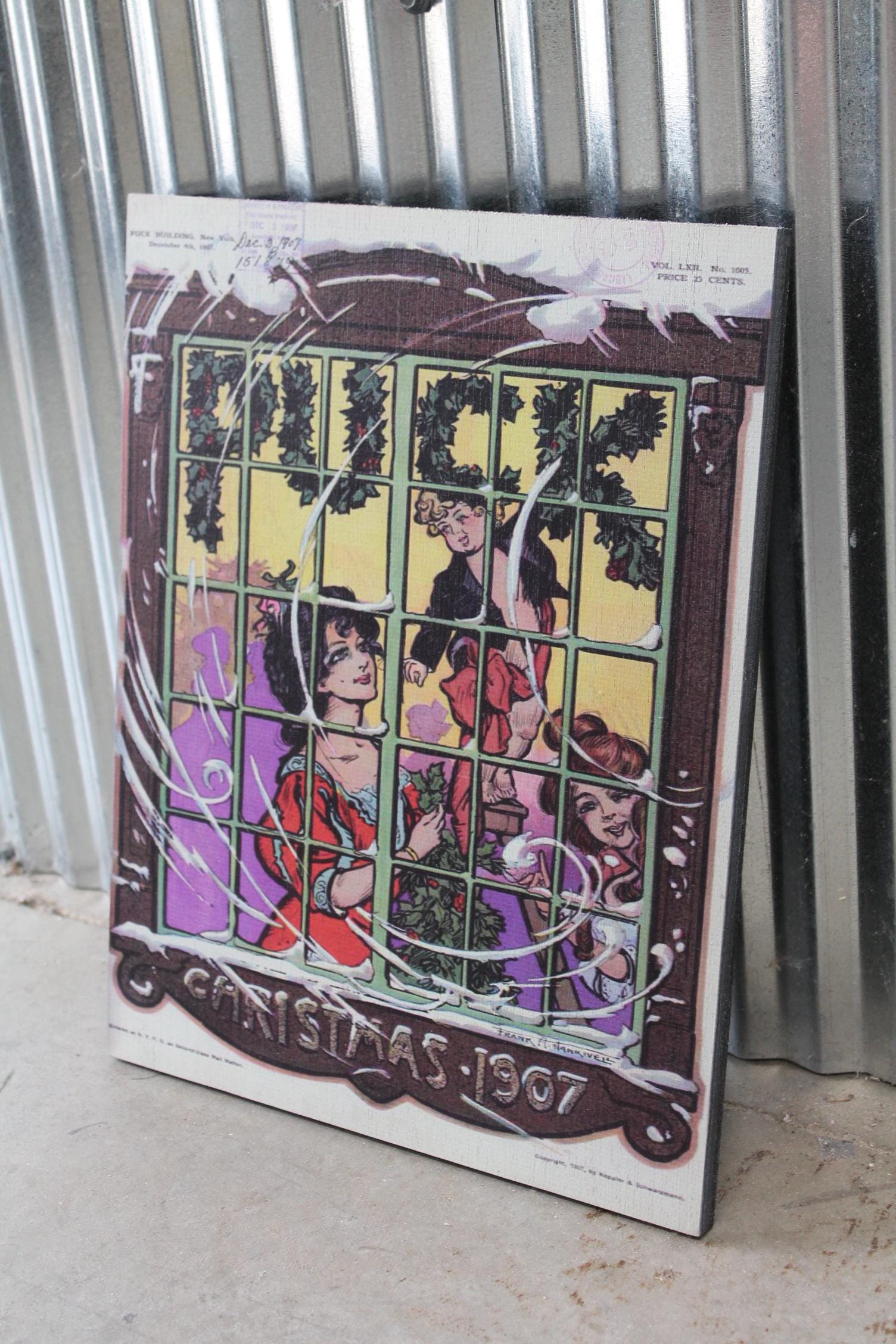 Christmas Window Cartoon Puck Magazine Wood Decorative Sign Caricature 1800s Vintage Antique Printed Vignette Early 1900s Comics