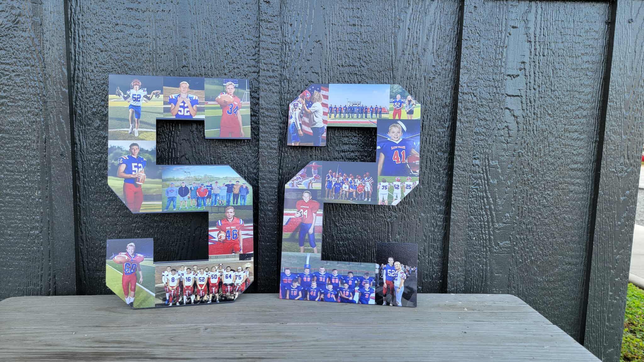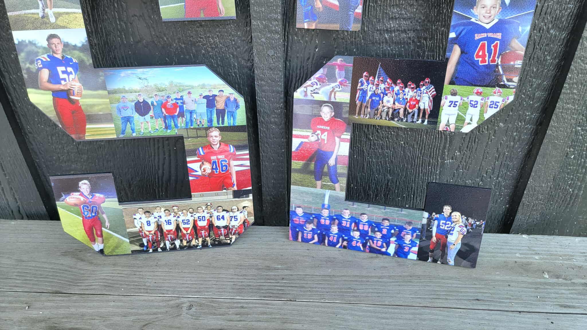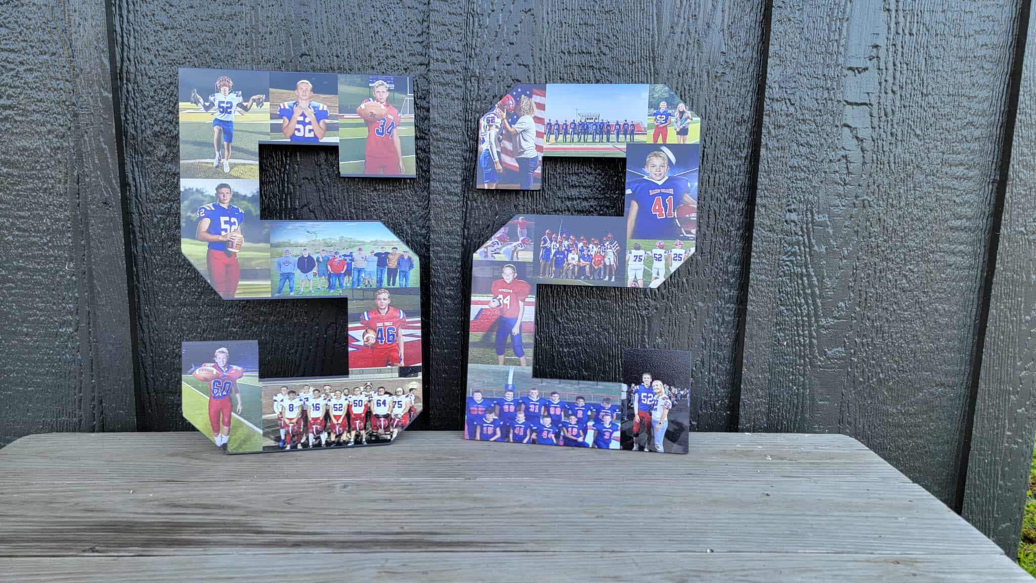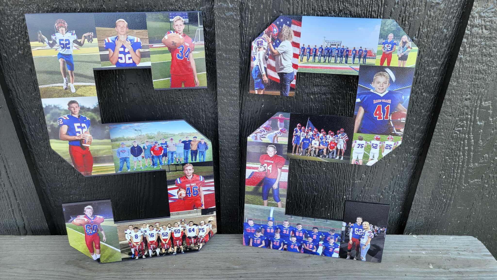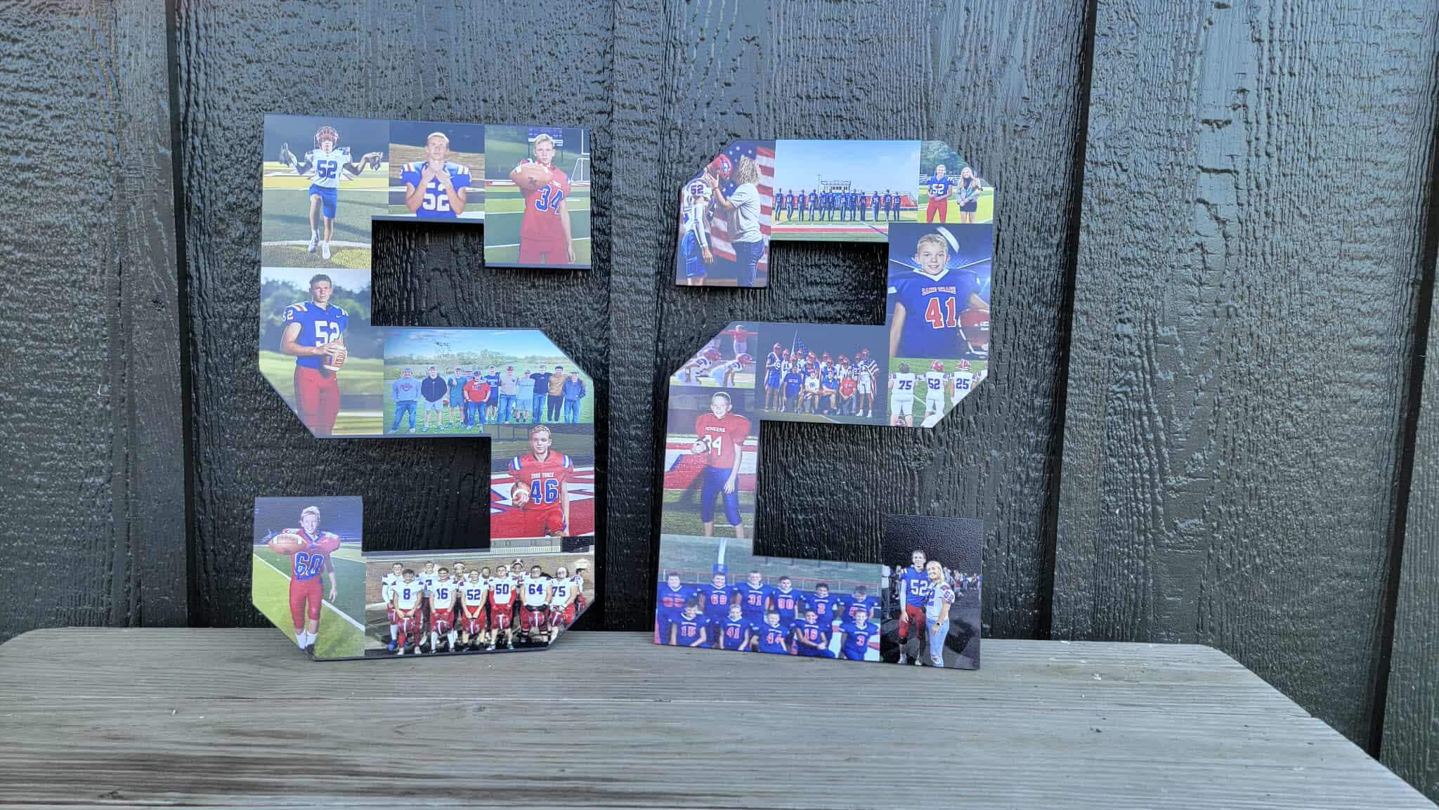 Here we have custom sports number personalized with photos sign! The image is printed directly onto the wood with our UV printer! These are handmade in our shop in Tarlton, Ohio and we offer Free Shipping to the US. NO LIMITS ON COLORS!! The printing will be very similar to the colors in your logo or choice of artwork. Each piece has its own natural texture and grain pattern, so no two pieces will be alike. You will be able to see some of the grain through the image itself.