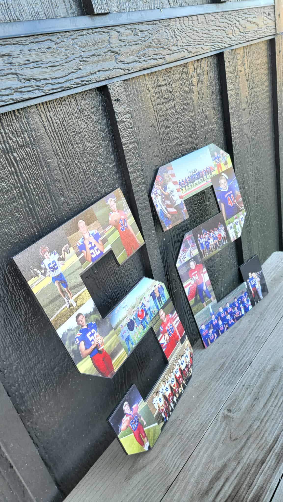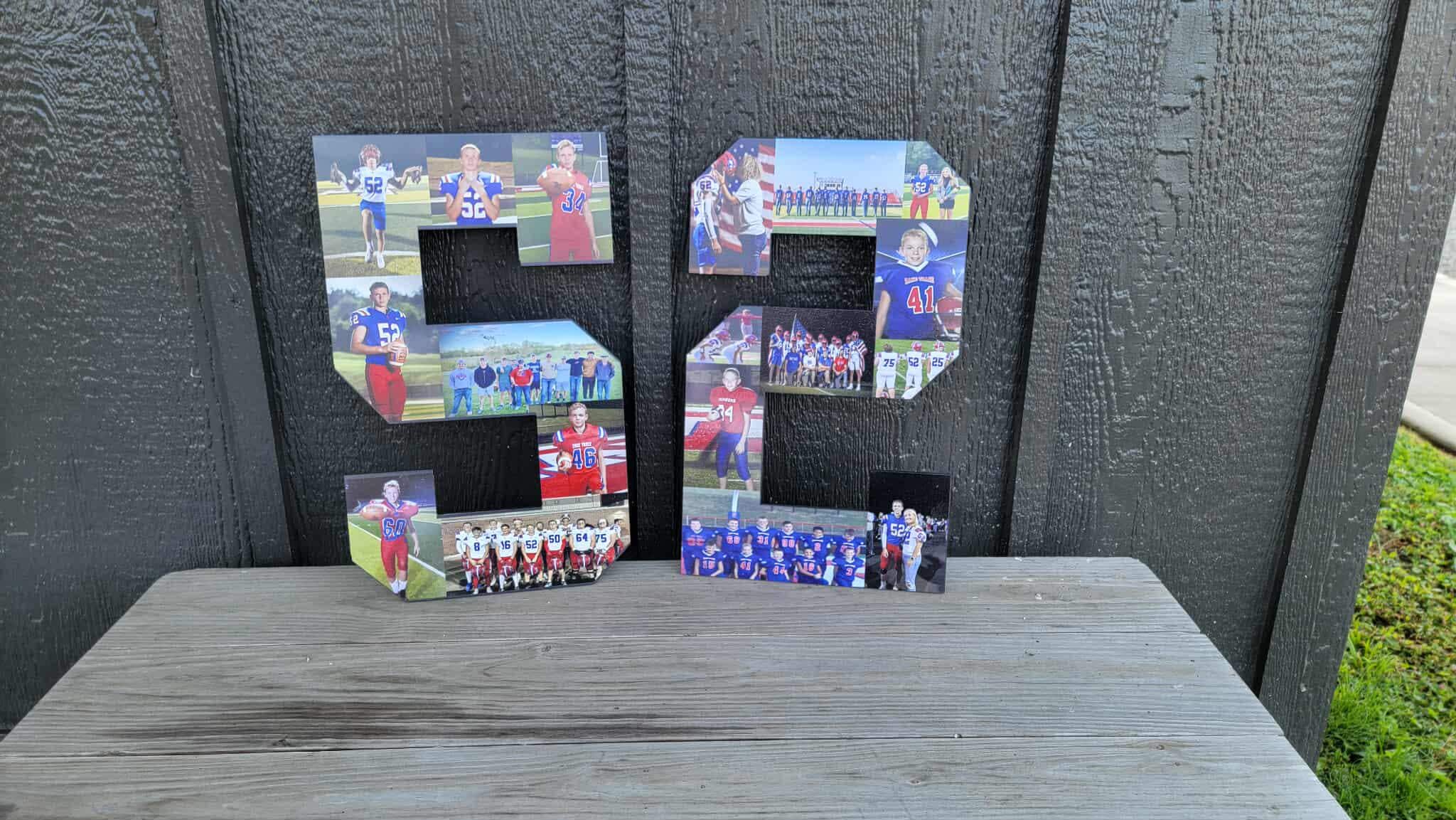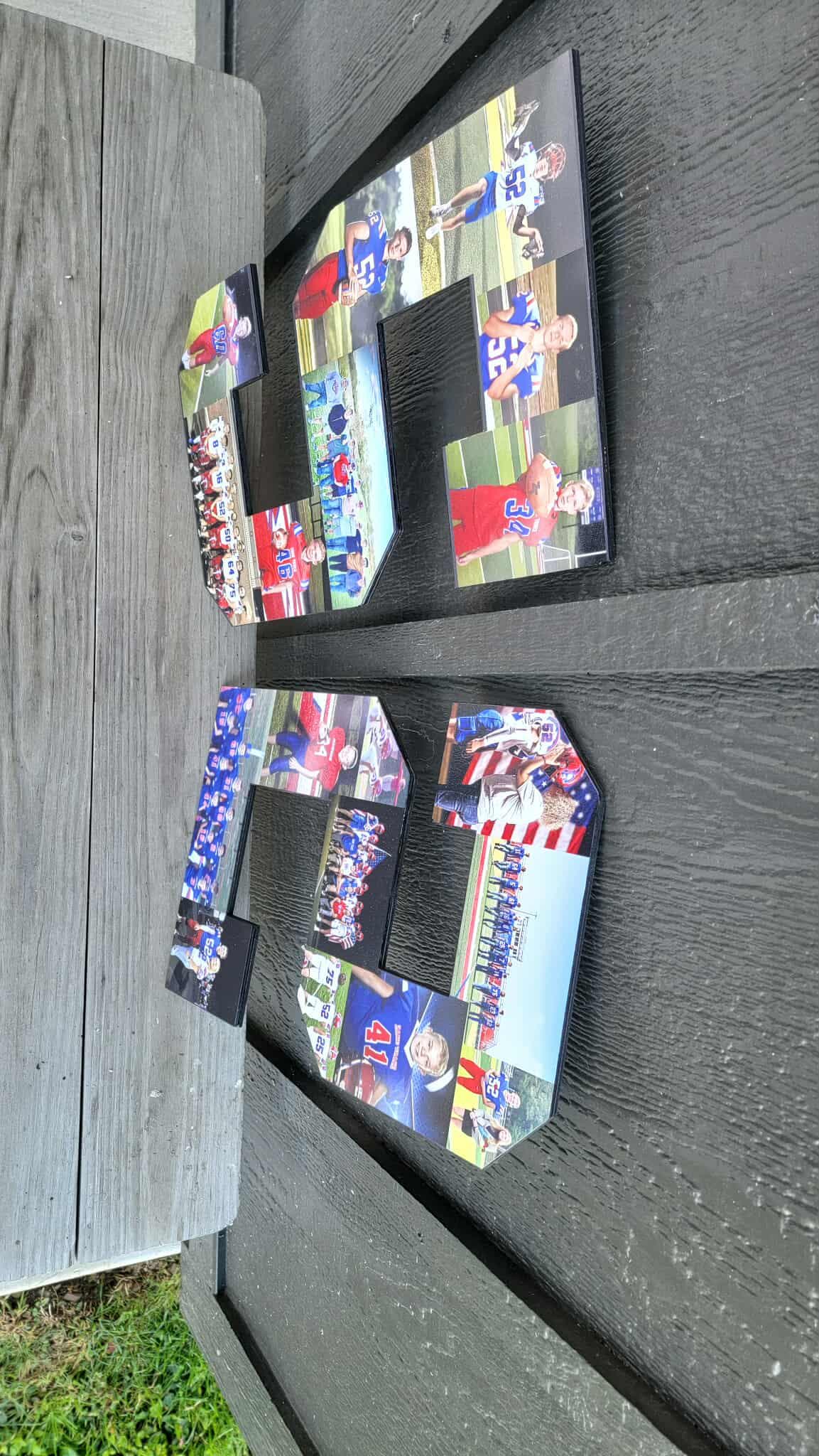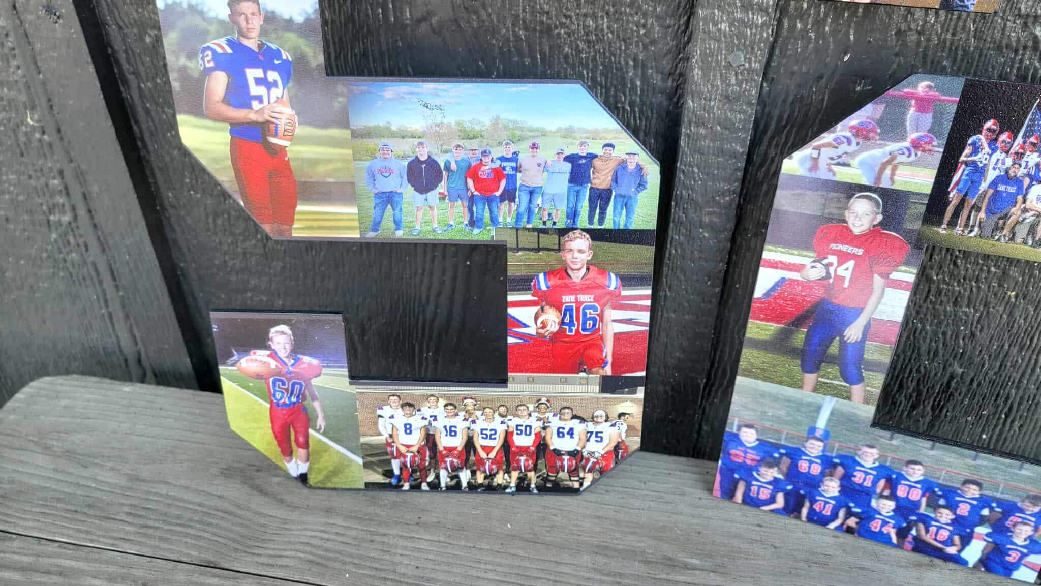 Here we have custom sports number personalized with photos sign! The image is printed directly onto the wood with our UV printer! These are handmade in our shop in Tarlton, Ohio and we offer Free Shipping to the US. NO LIMITS ON COLORS!! The printing will be very similar to the colors in your logo or choice of artwork. Each piece has its own natural texture and grain pattern, so no two pieces will be alike. You will be able to see some of the grain through the image itself.