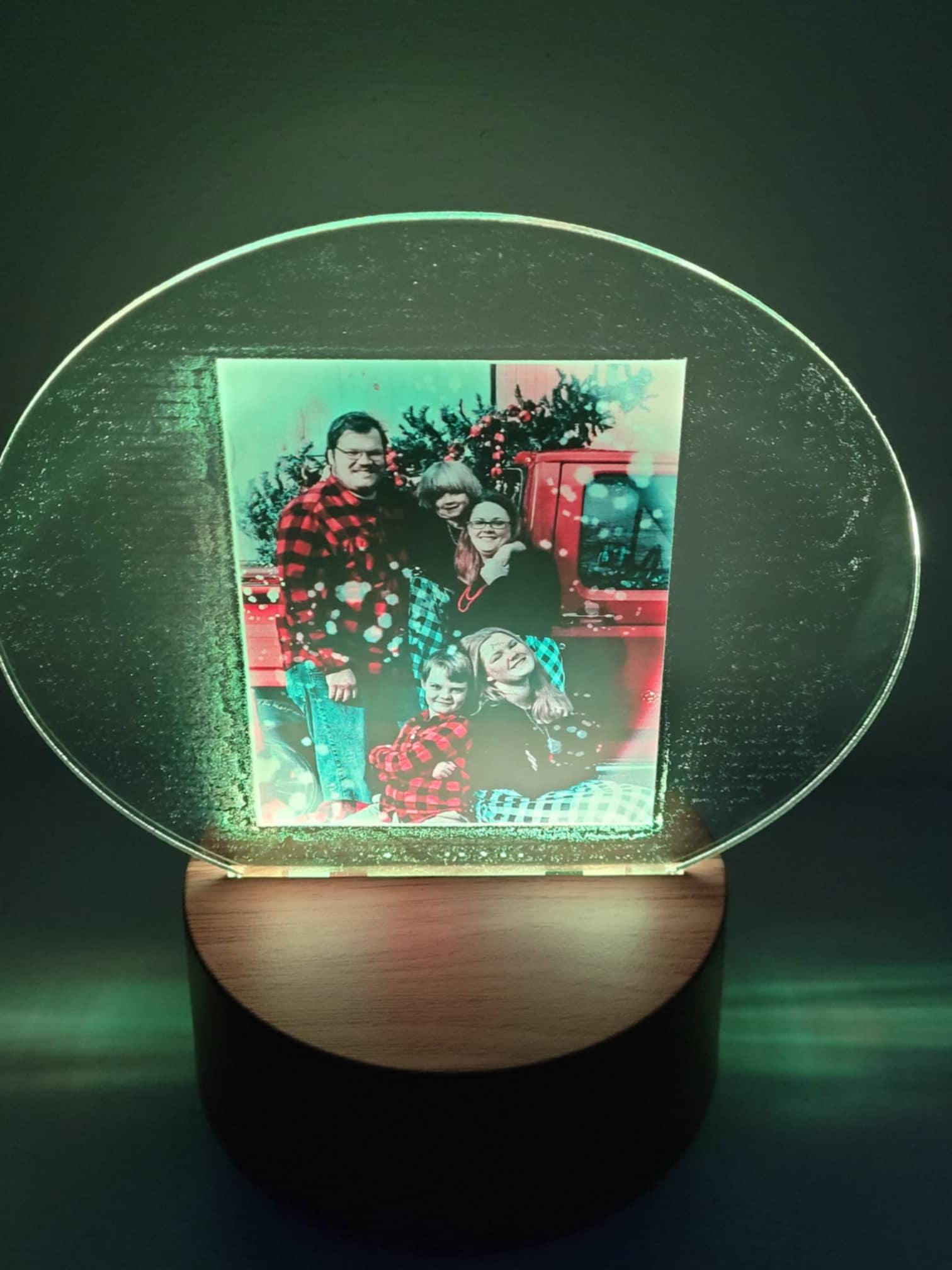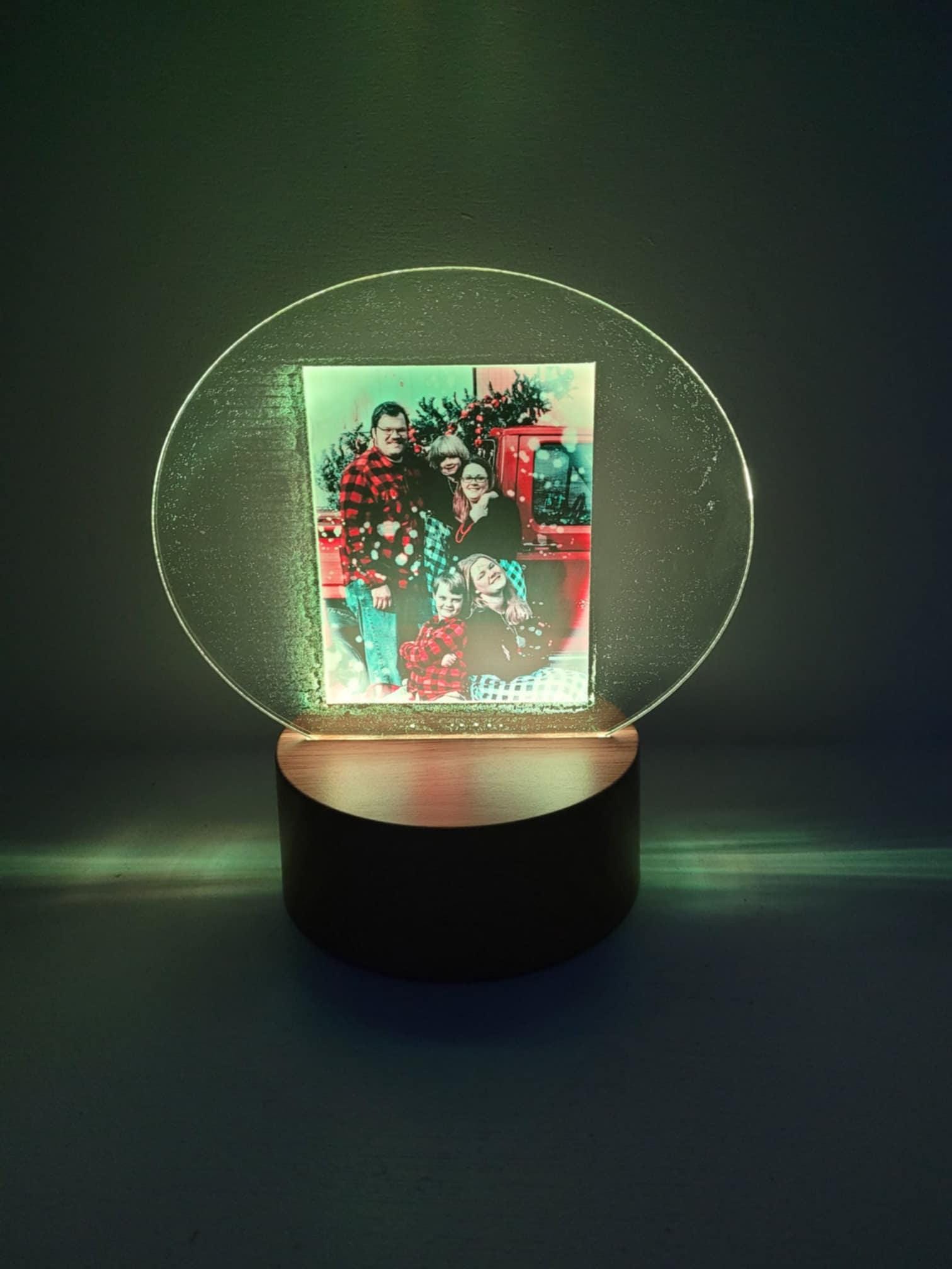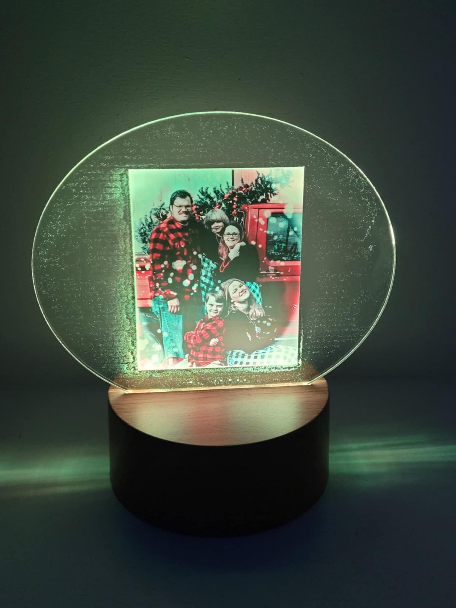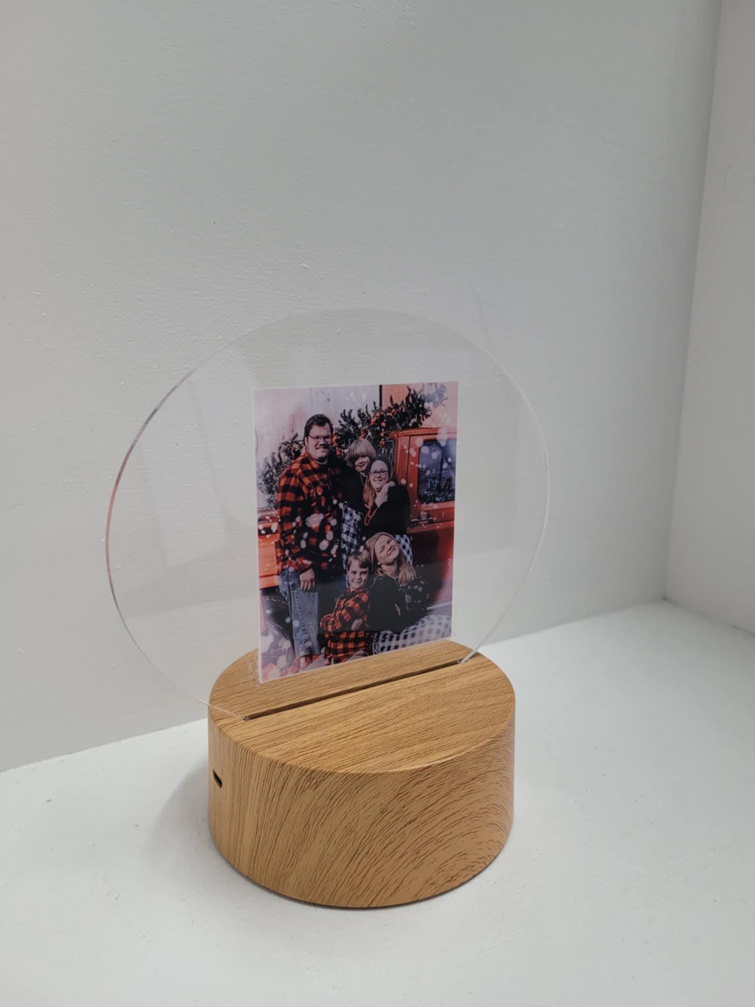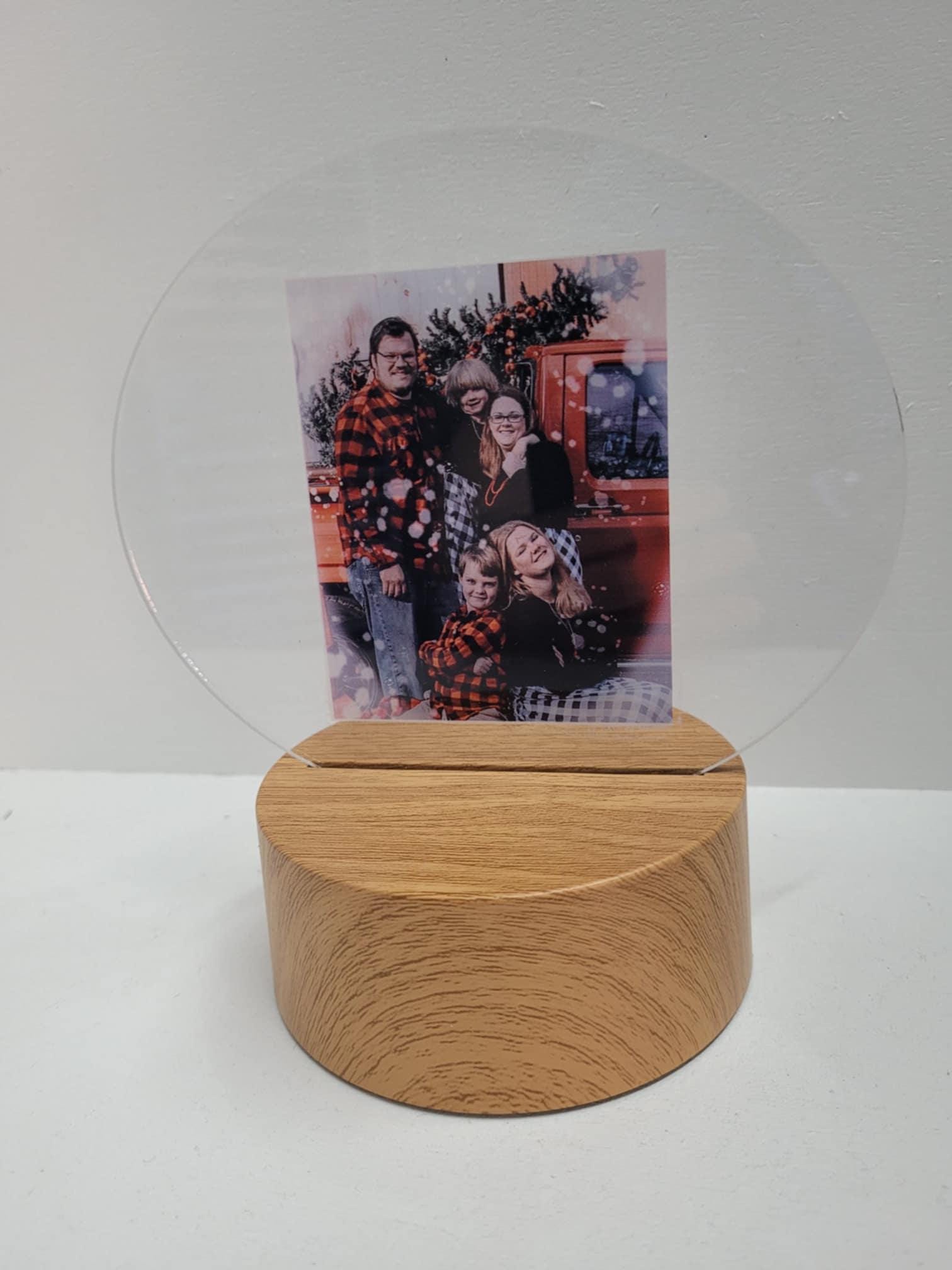 This listing is showcasing our Custom Acrylic Printed sign that sits on an LED light up Base! The size of the acrylic pictured is approximately 5" wide x 6" tall. The acrylic is approx. 1/8" thick. It will be printed on the back of the acrylic.
