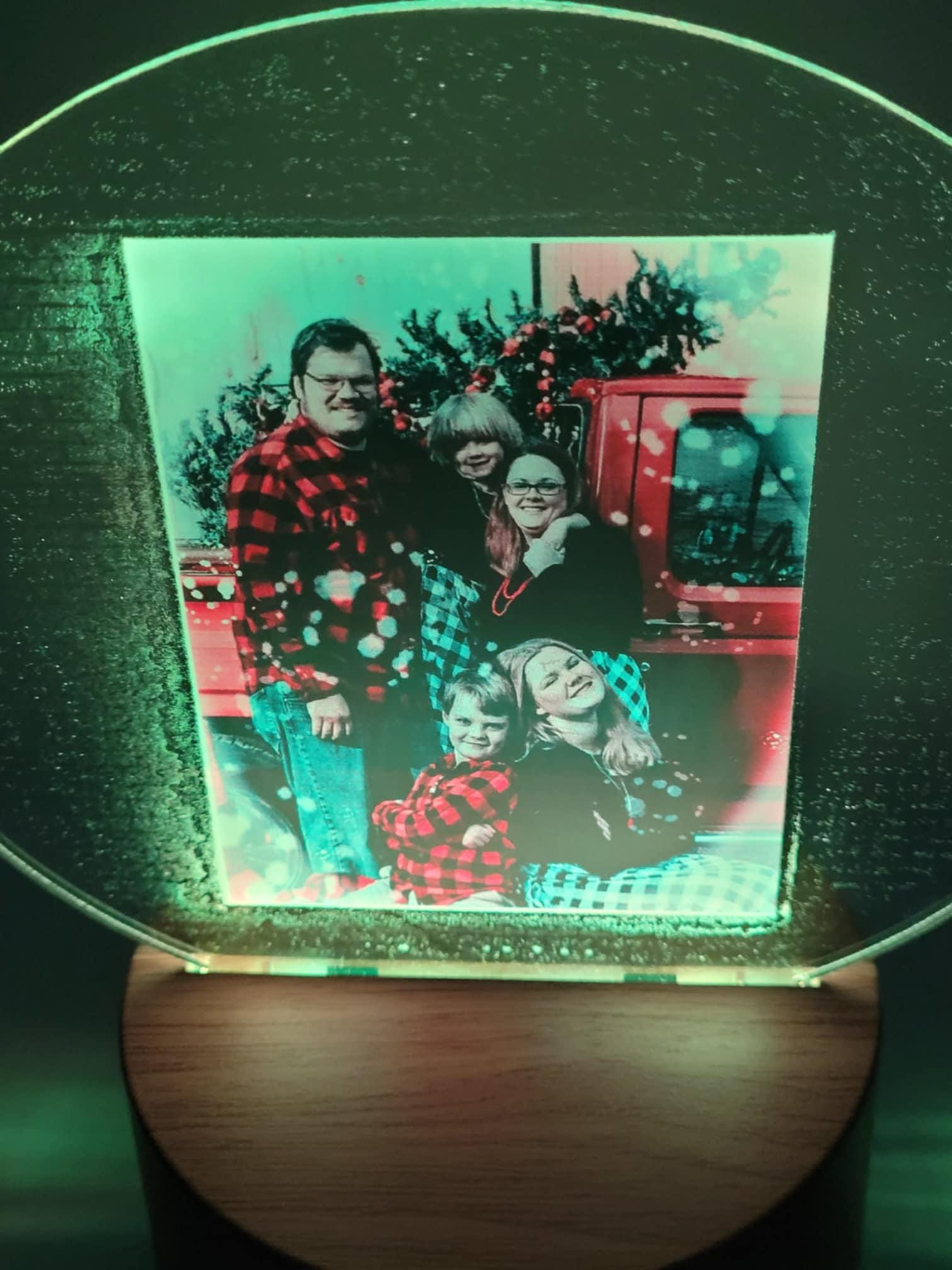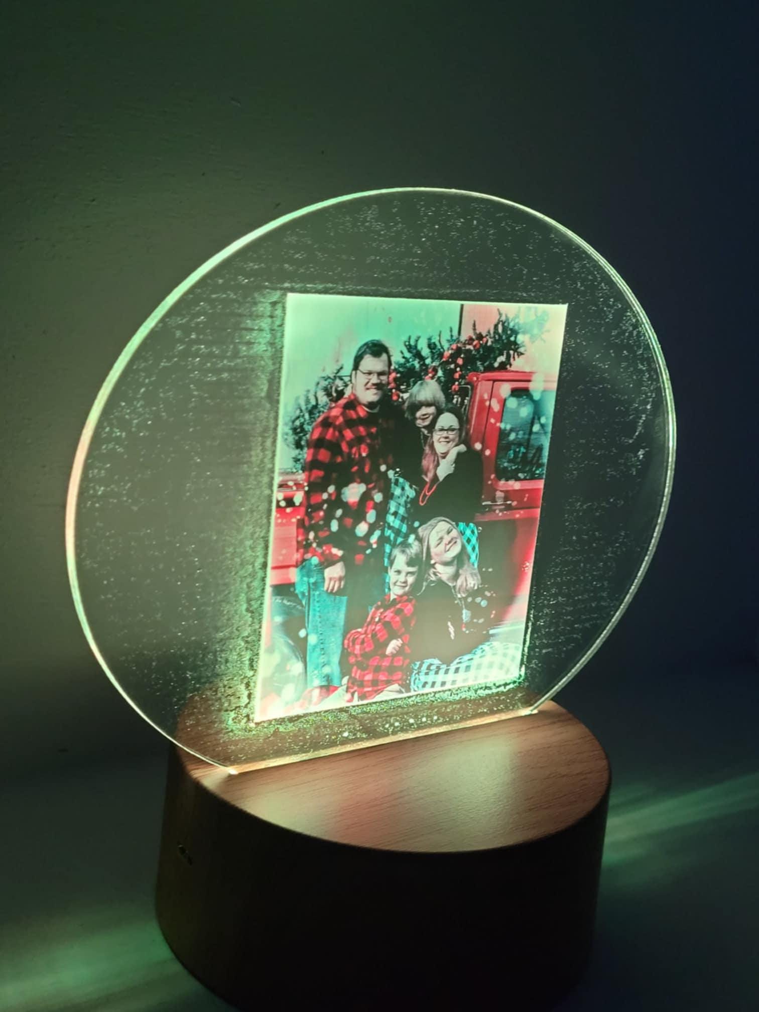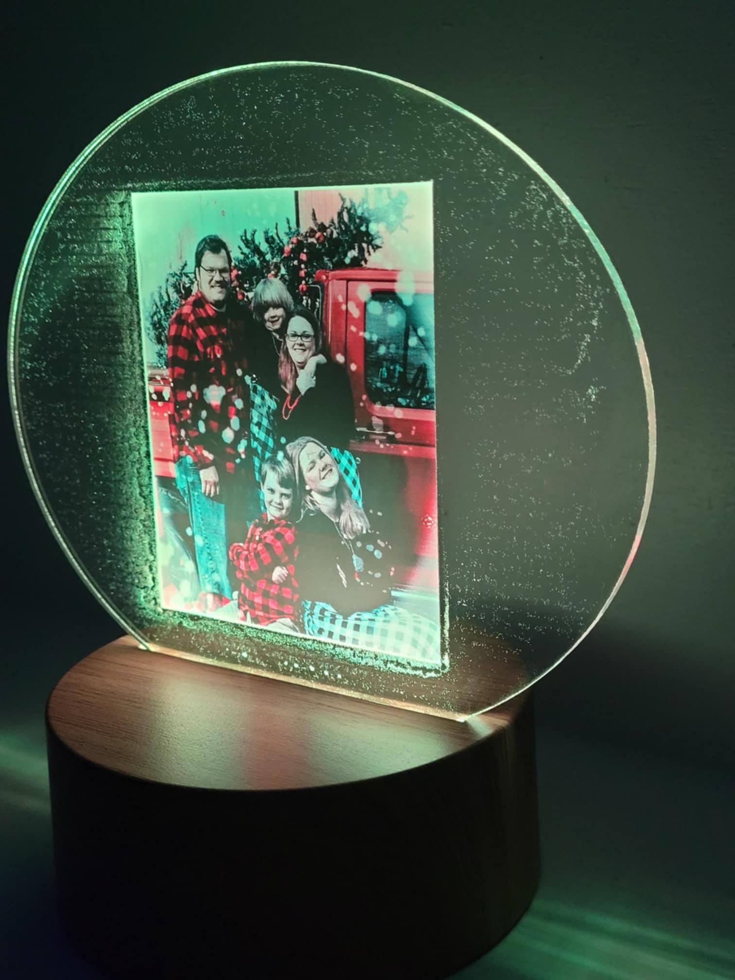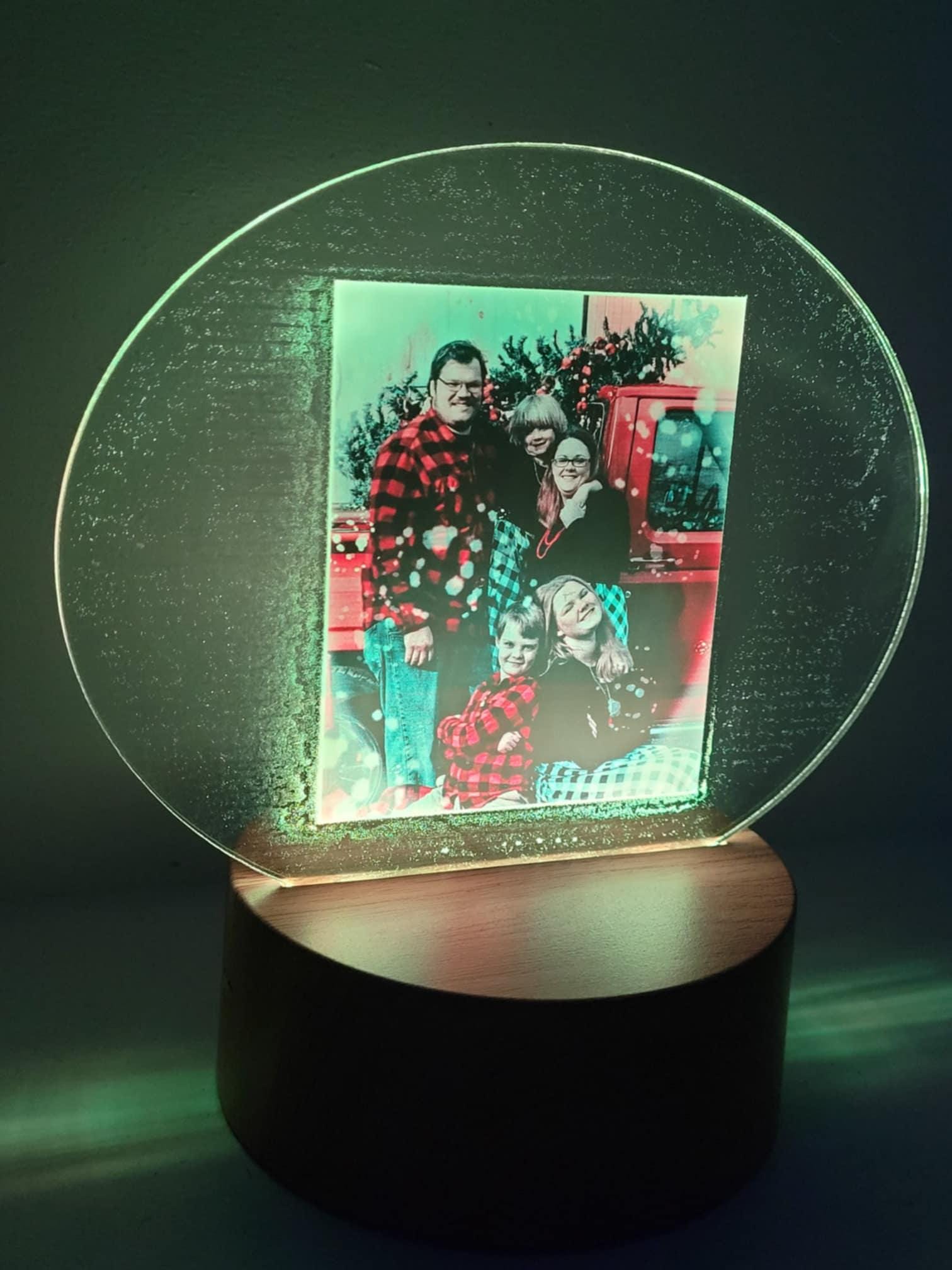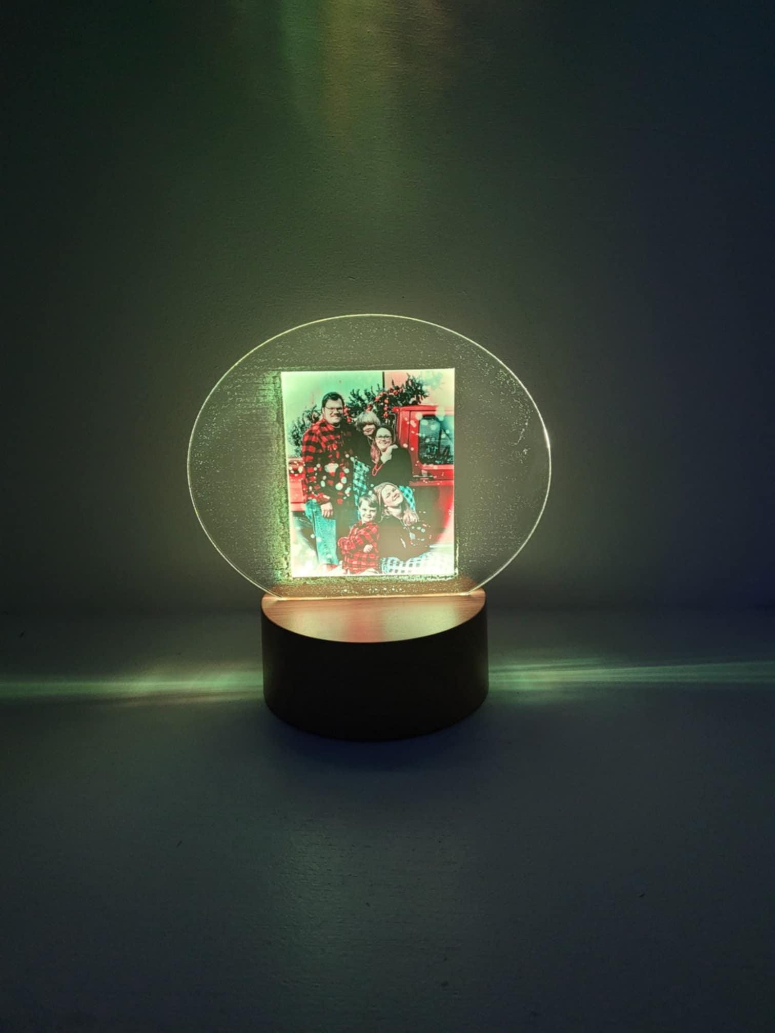 This listing is showcasing our Custom Acrylic Printed sign that sits on an LED light up Base! The size of the acrylic pictured is approximately 5" wide x 6" tall. The acrylic is approx. 1/8" thick. It will be printed on the back of the acrylic.
