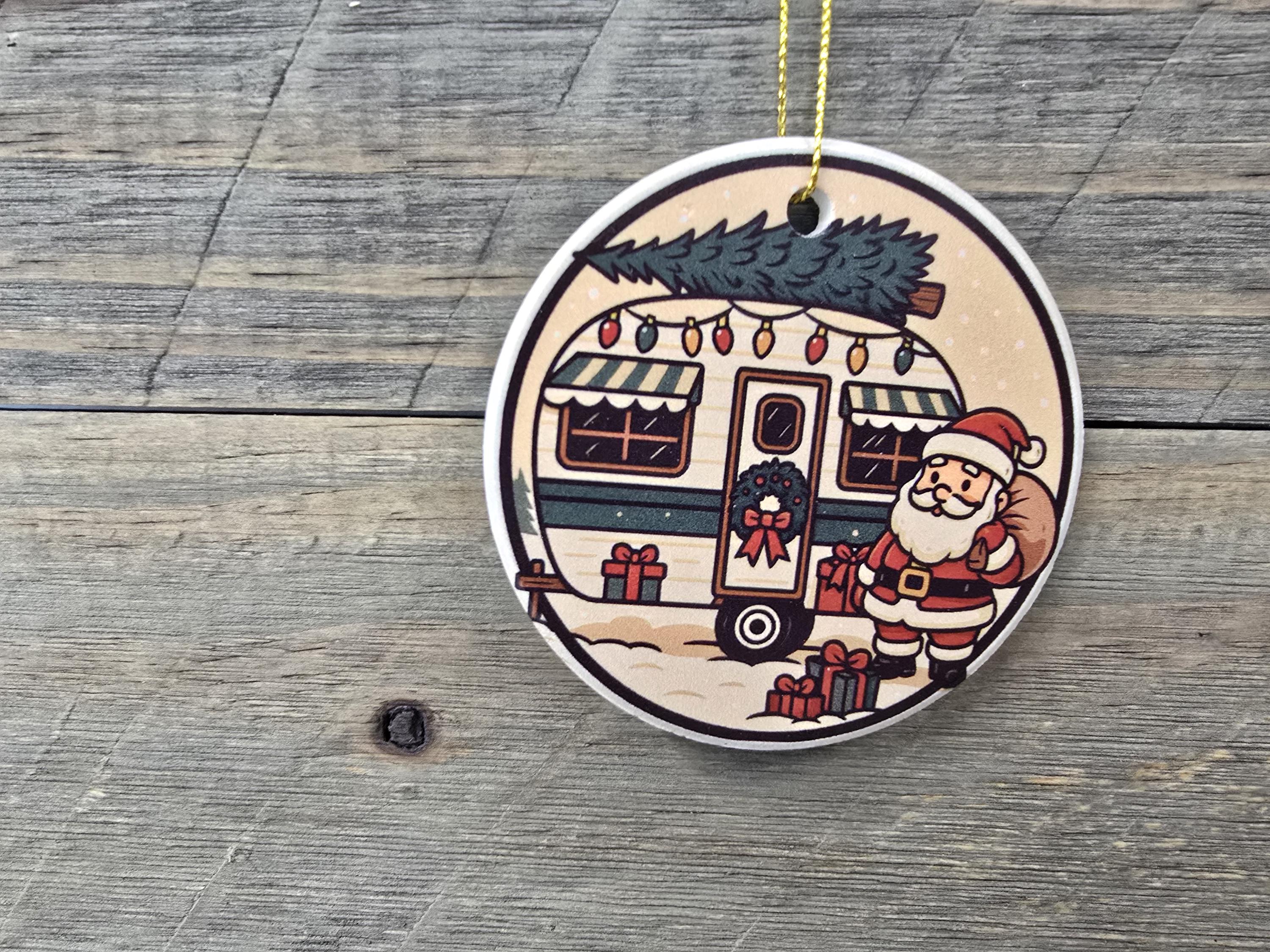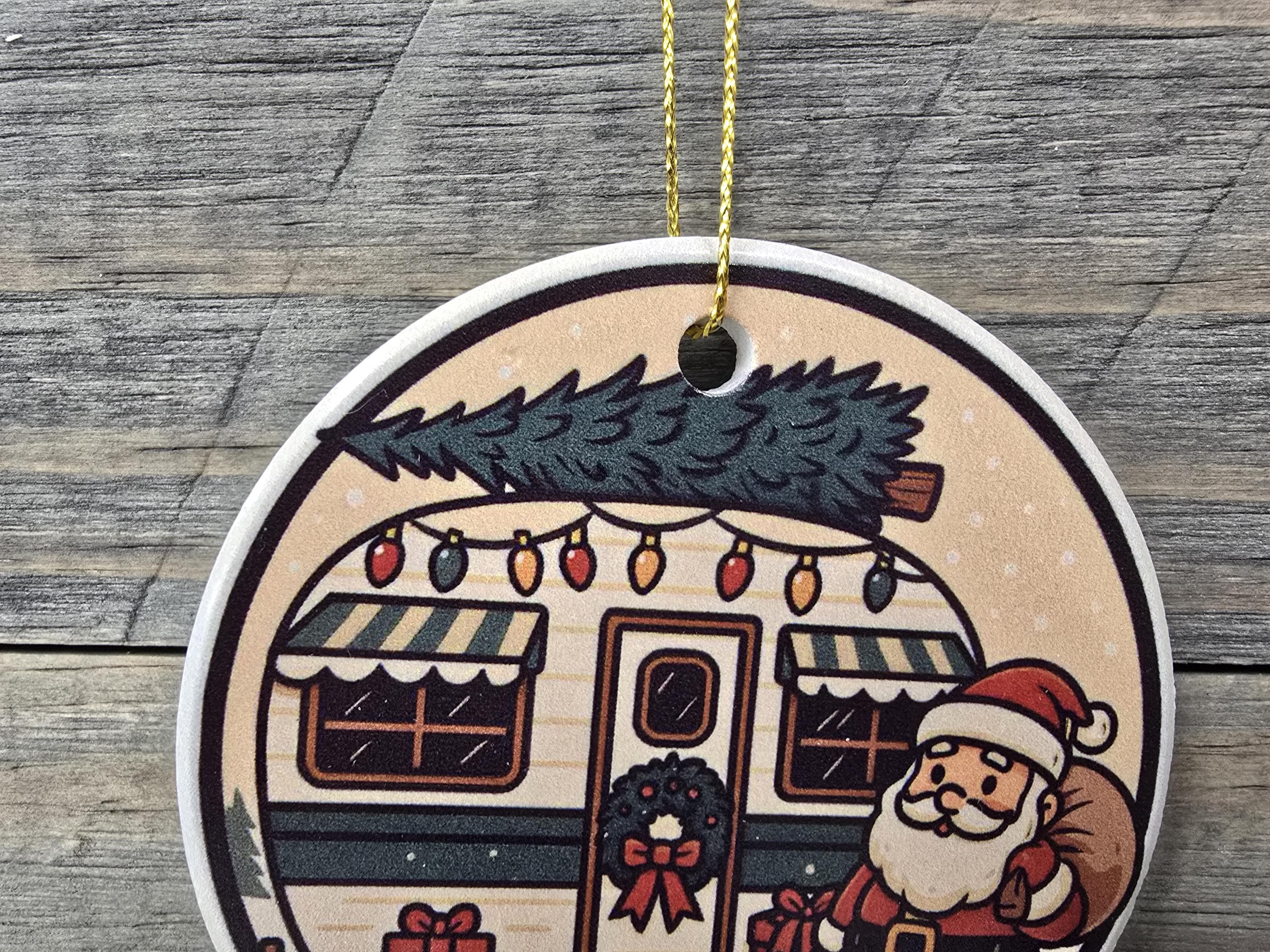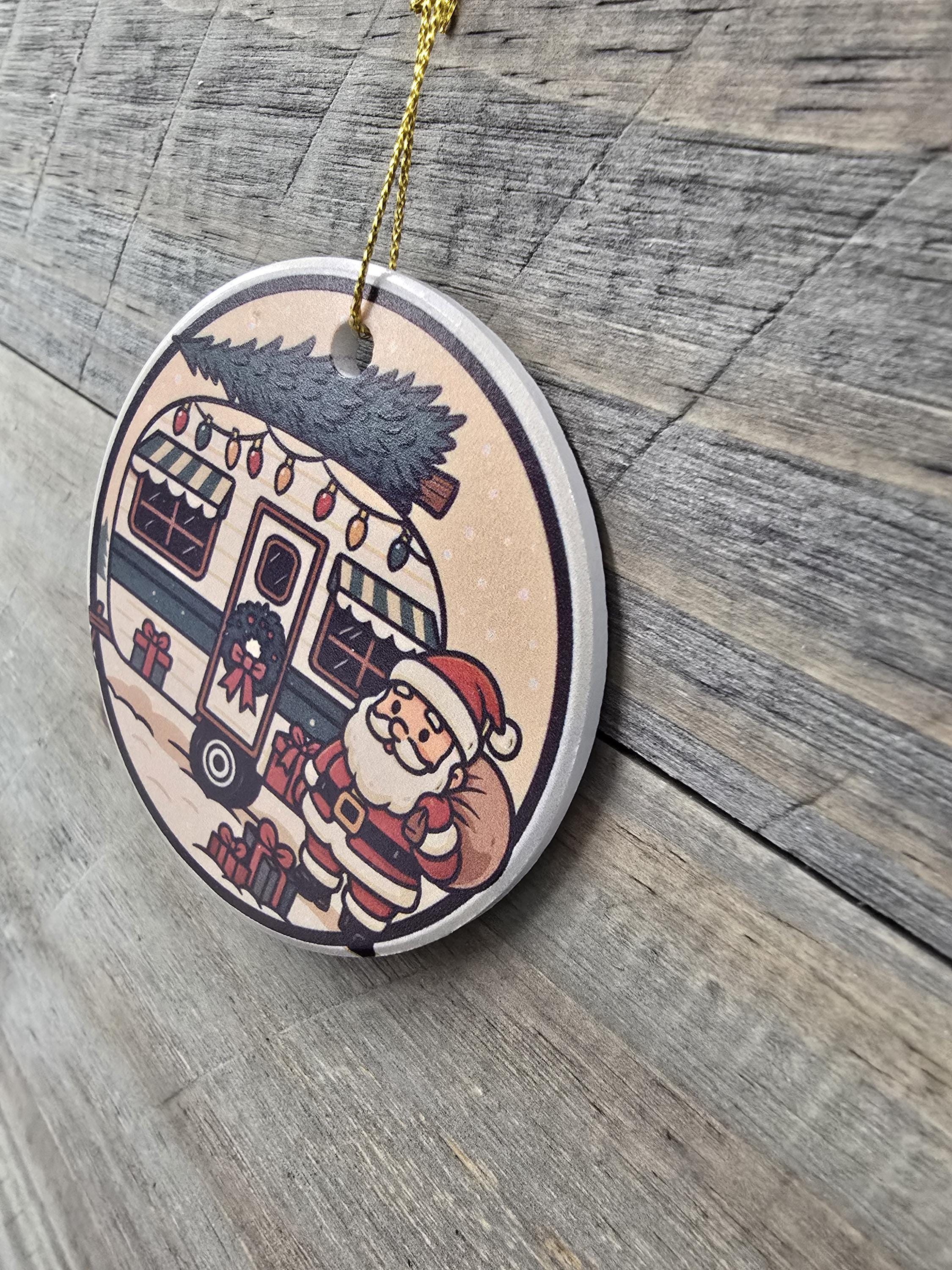 Celebrate the magic of the season with this charming ceramic ornament featuring Santa delivering presents that is perfect for the holiday season and for camping enthusiasts. Designed to evoke cozy winter nights and festive farmhouse charm, this ornament makes a perfect addition to your Christmas tree decorations or a thoughtful holiday gift for loved ones.