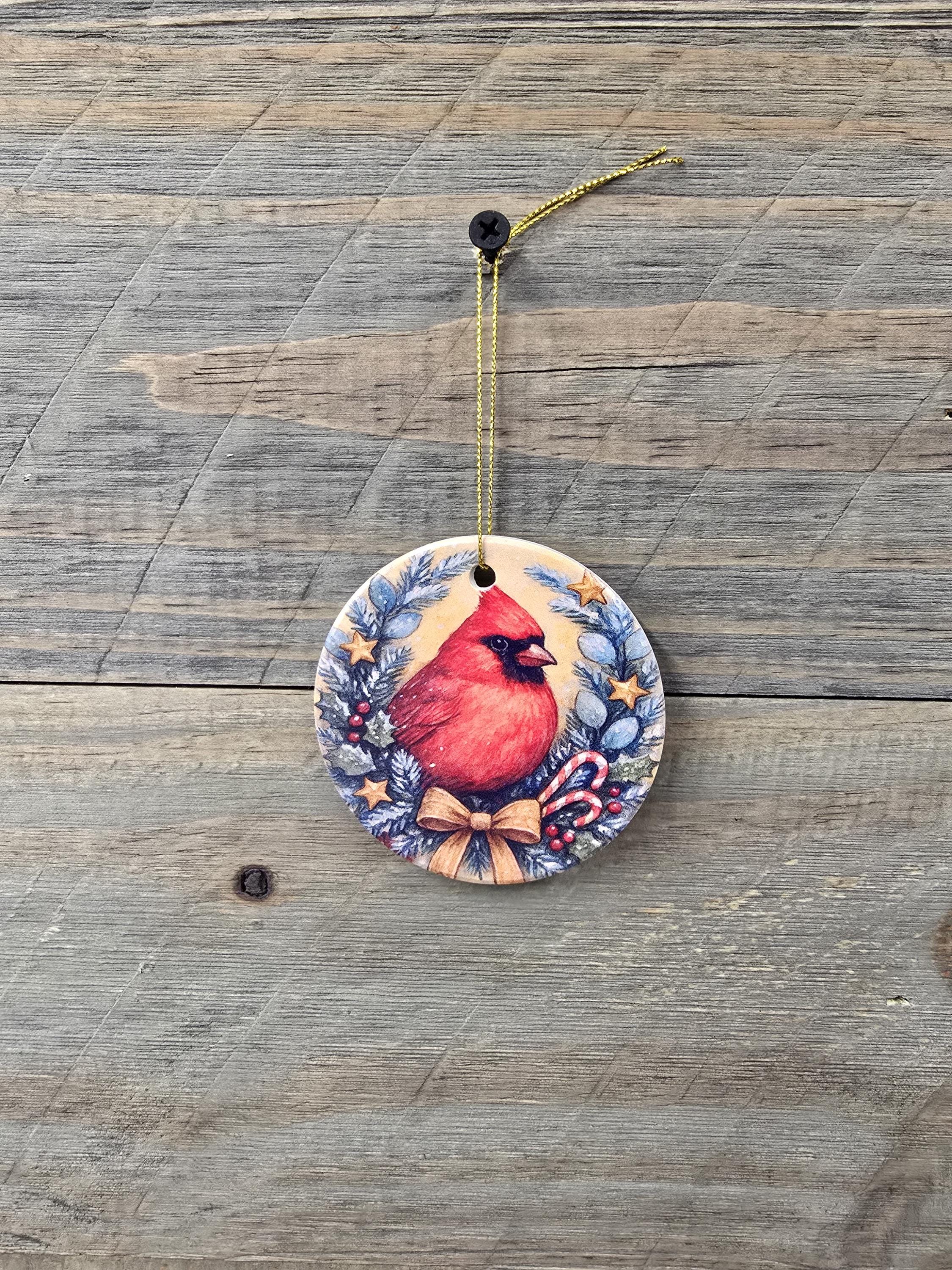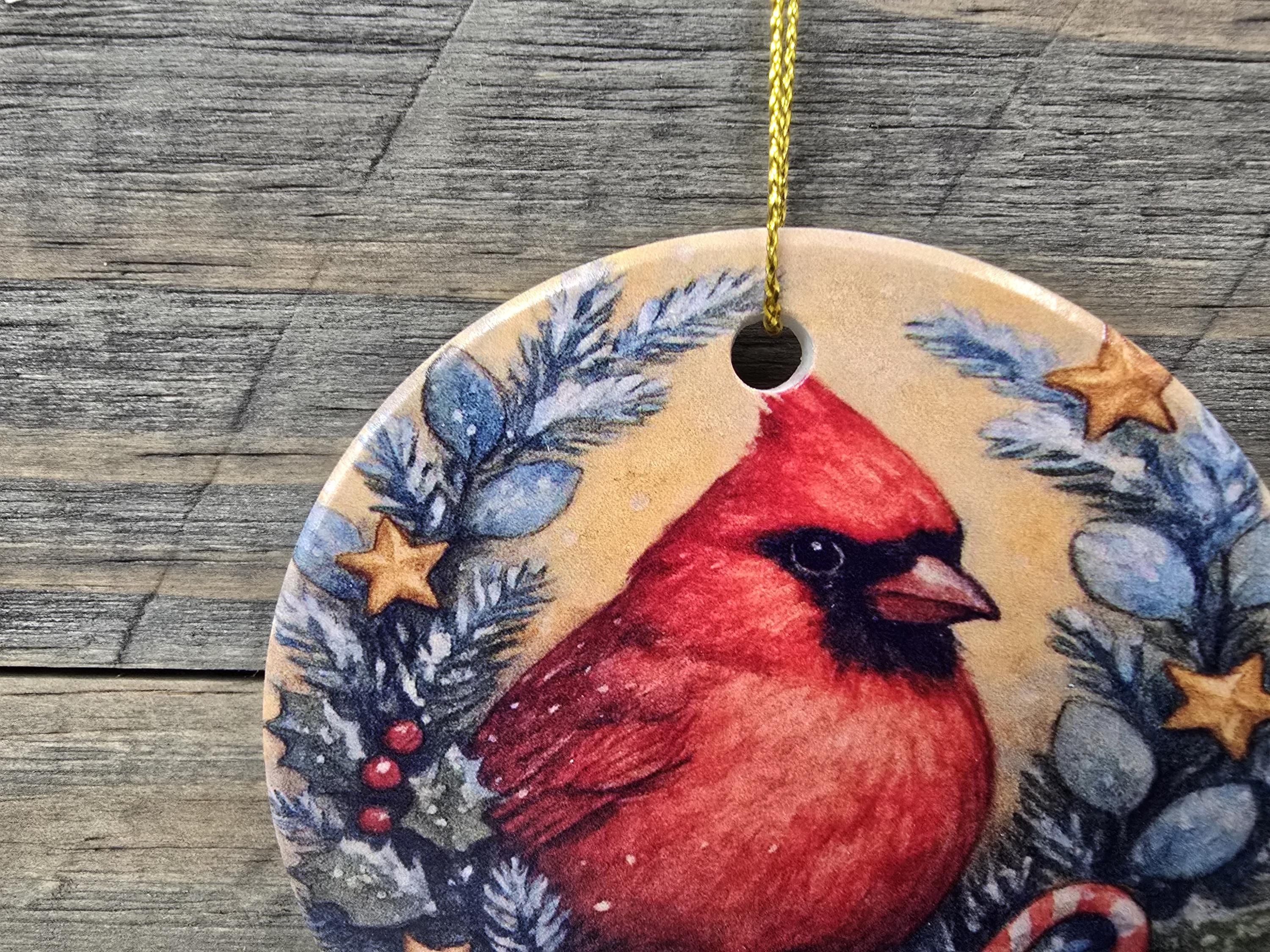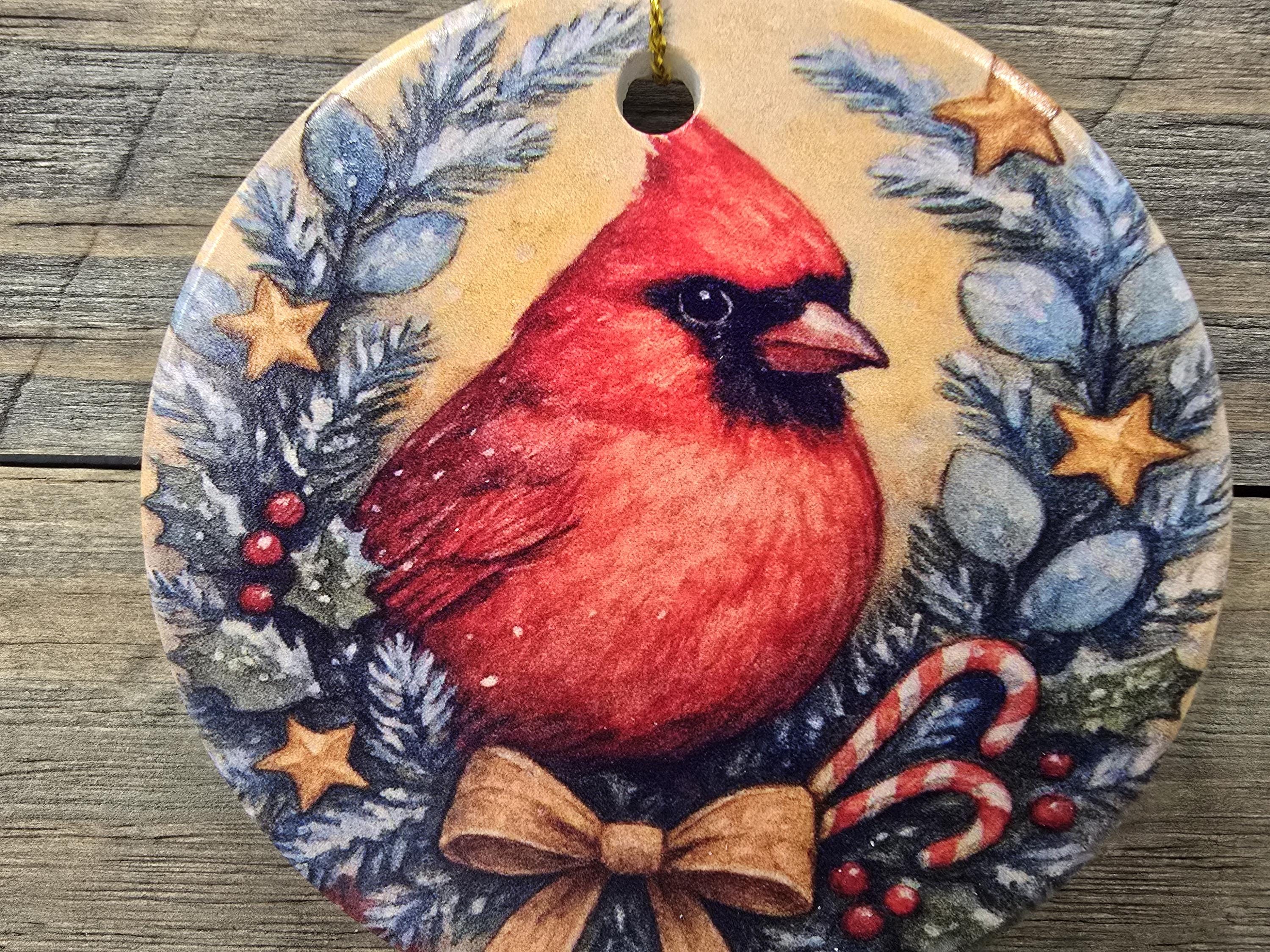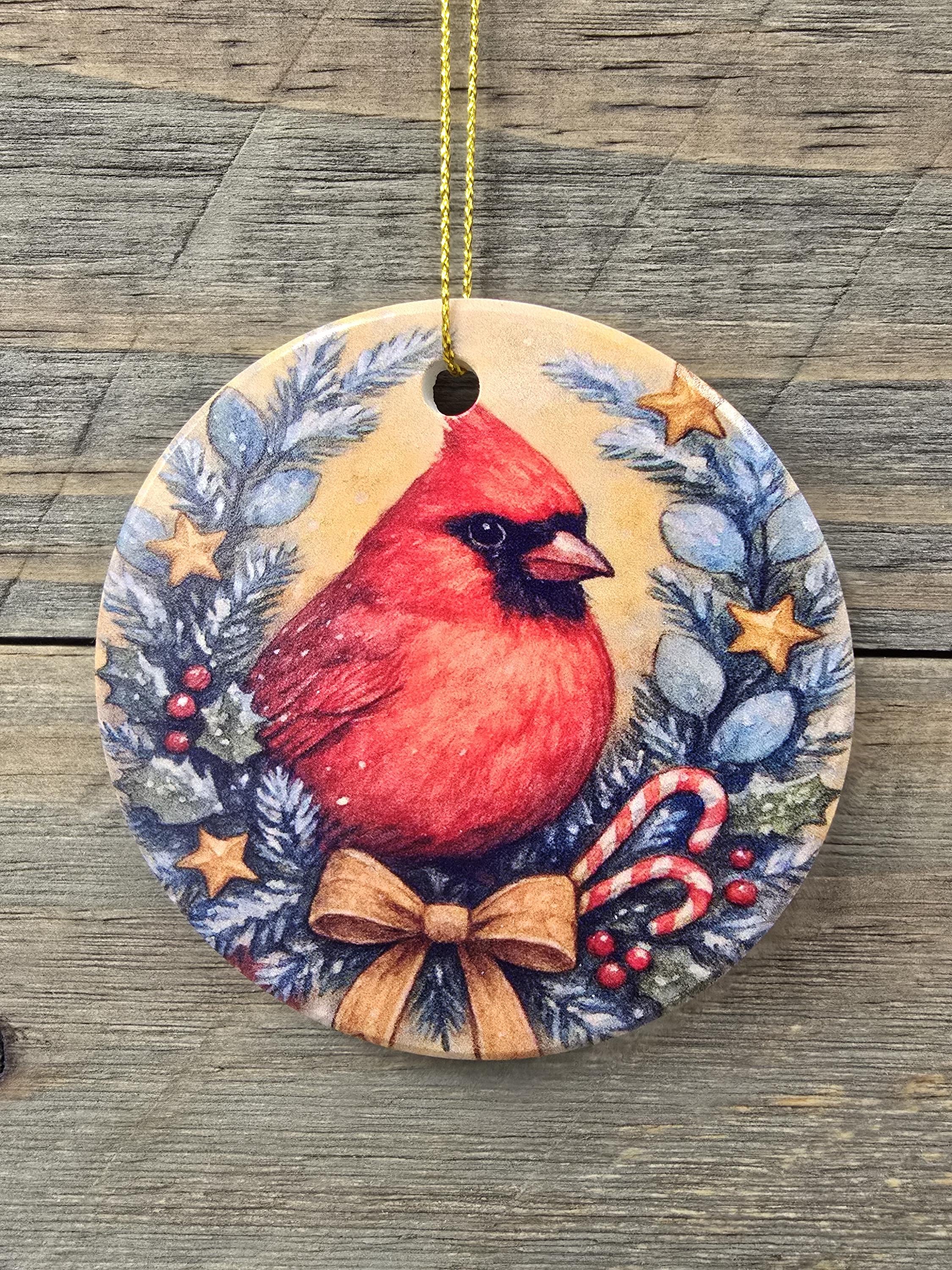 Celebrate the magic of the season with this charming ceramic ornament featuring a cardinal and a classic wreath perfect for the holiday season. Designed to evoke cozy winter nights and festive farmhouse charm, this ornament makes a perfect addition to your Christmas tree decorations or a thoughtful holiday gift for loved ones.