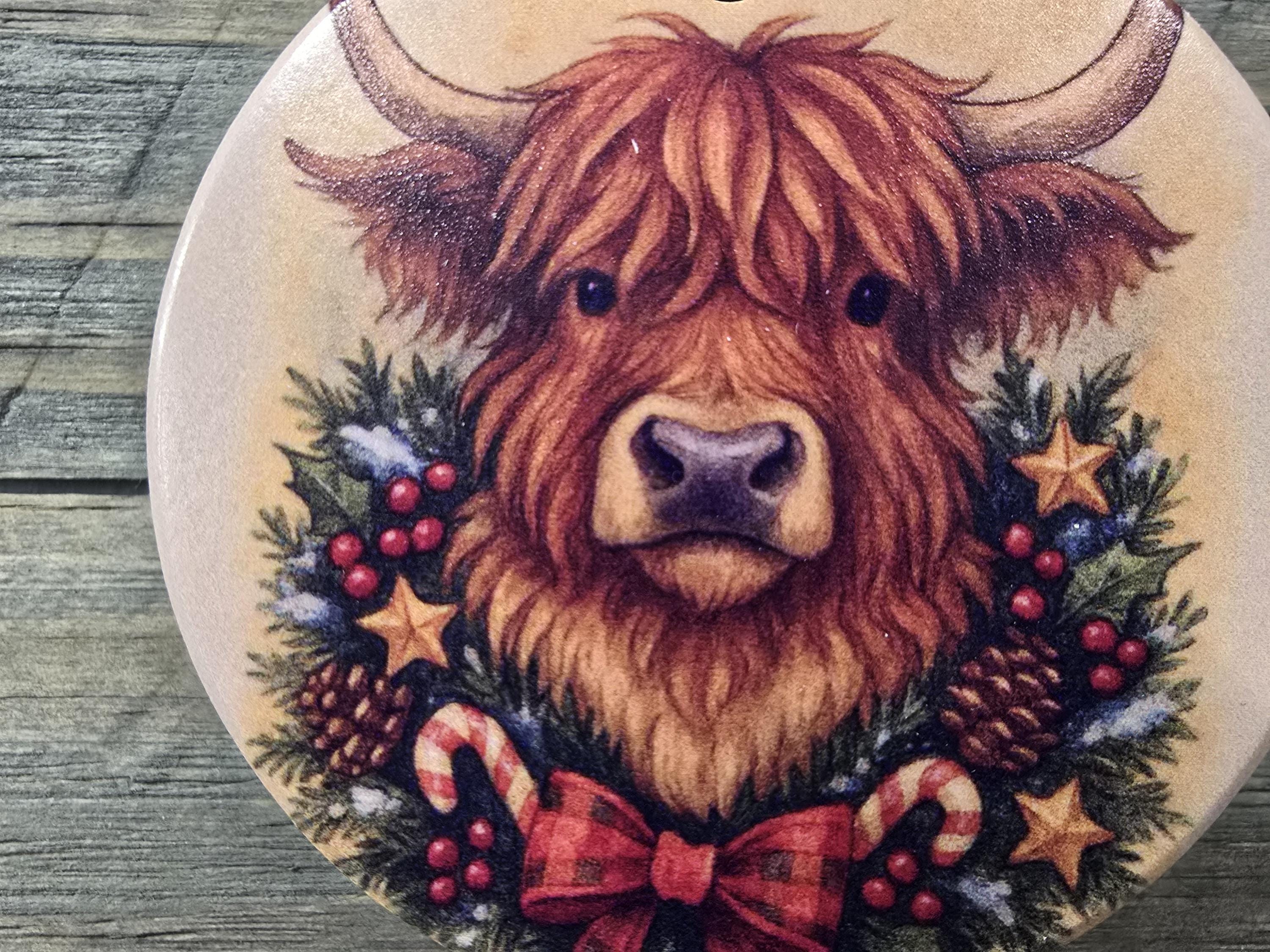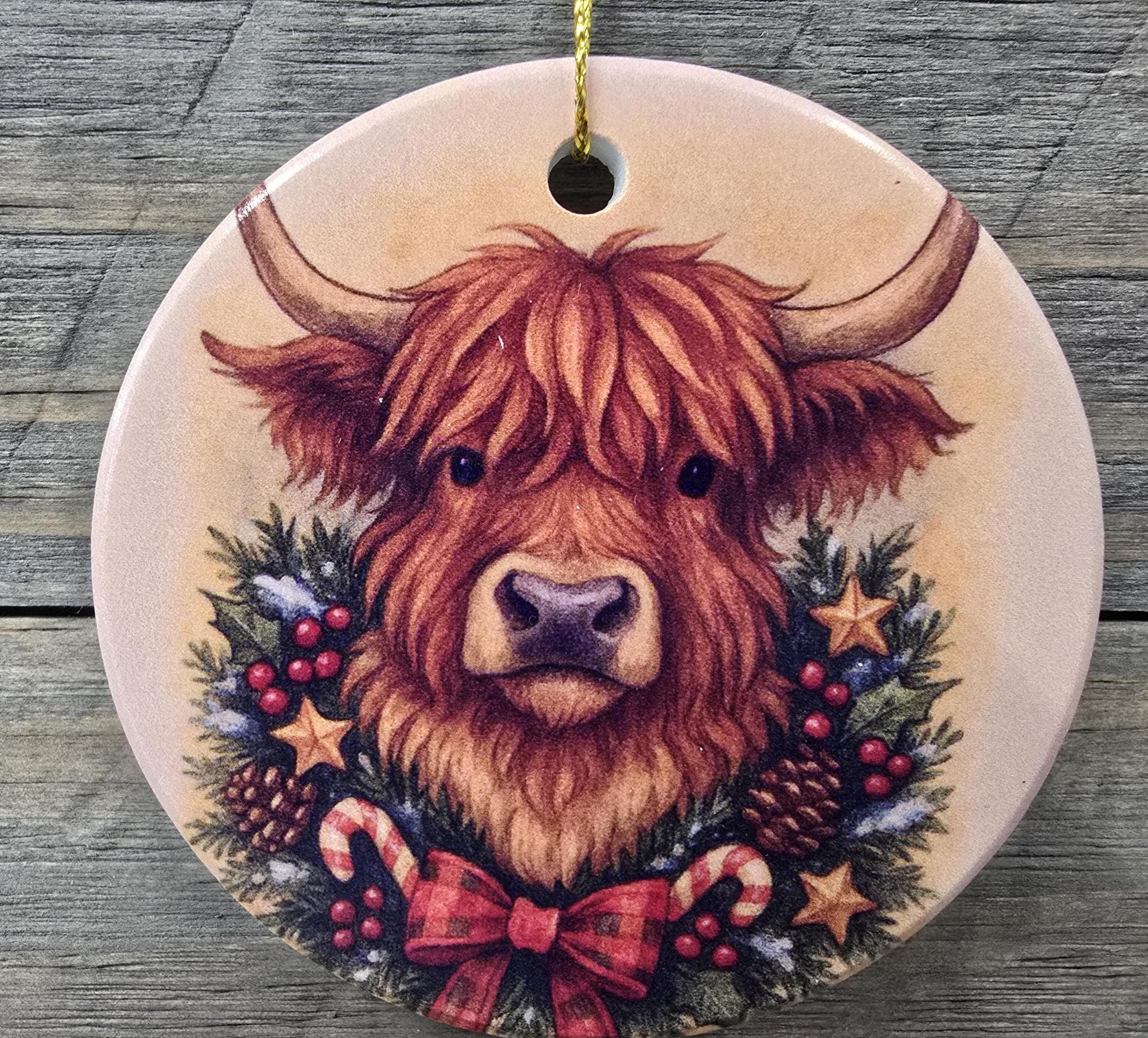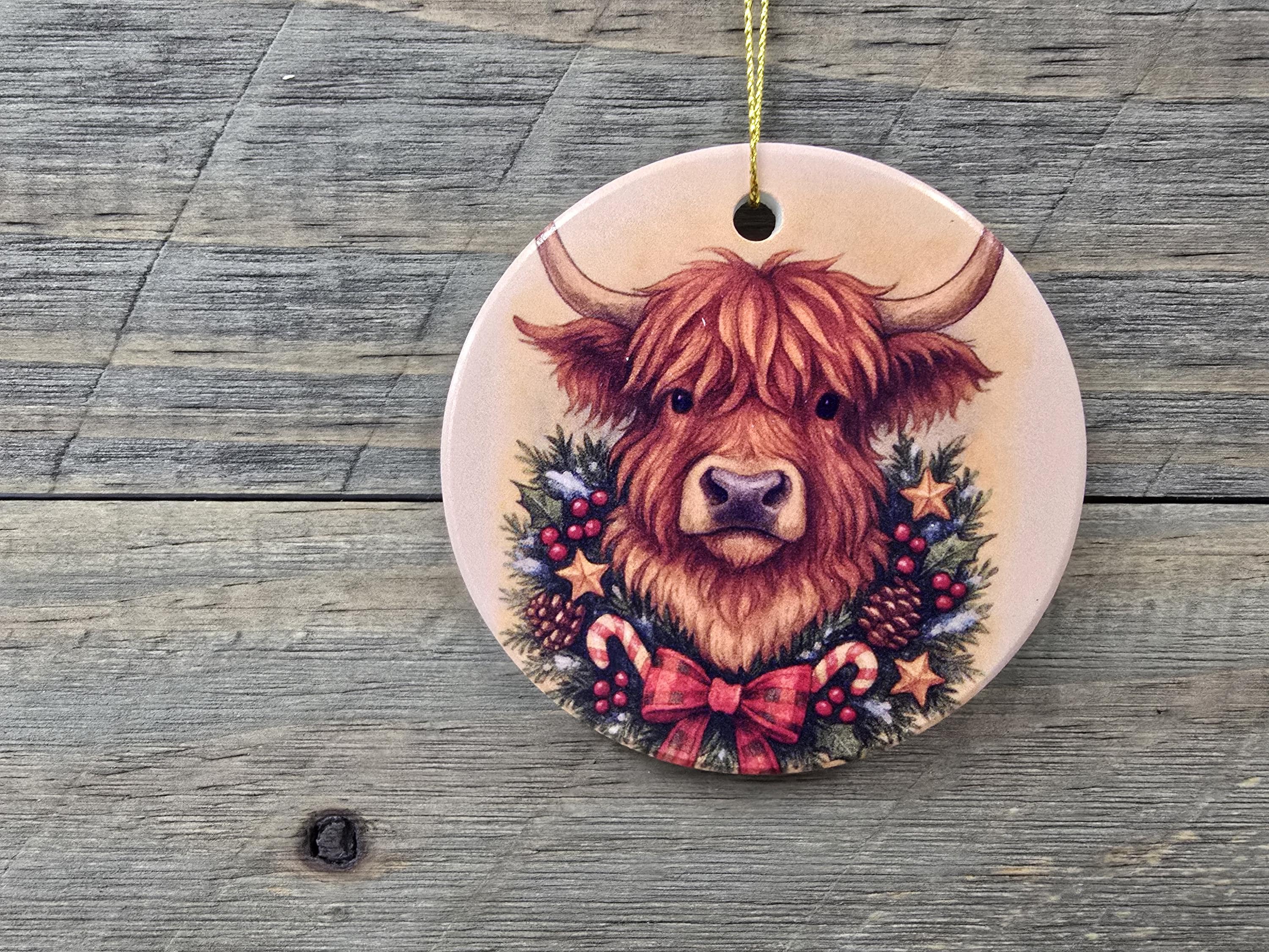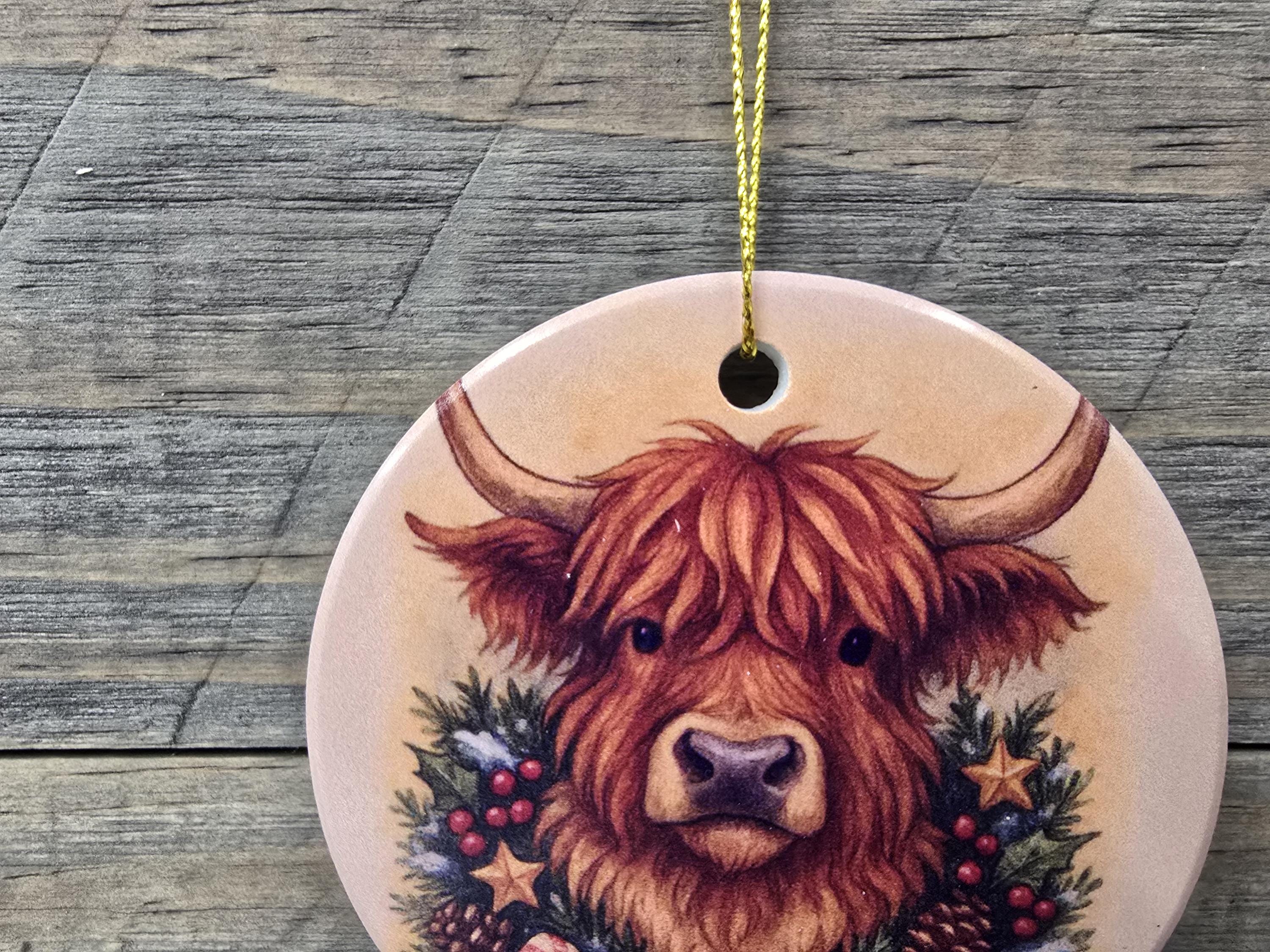 Celebrate the magic of the season with this charming ceramic ornament featuring a Highland cow wearing a wreath that is perfect for the holiday season. Designed to evoke a festive farmhouse charm, this ornament makes a perfect addition to your Christmas tree decorations or a thoughtful holiday gift for loved ones.