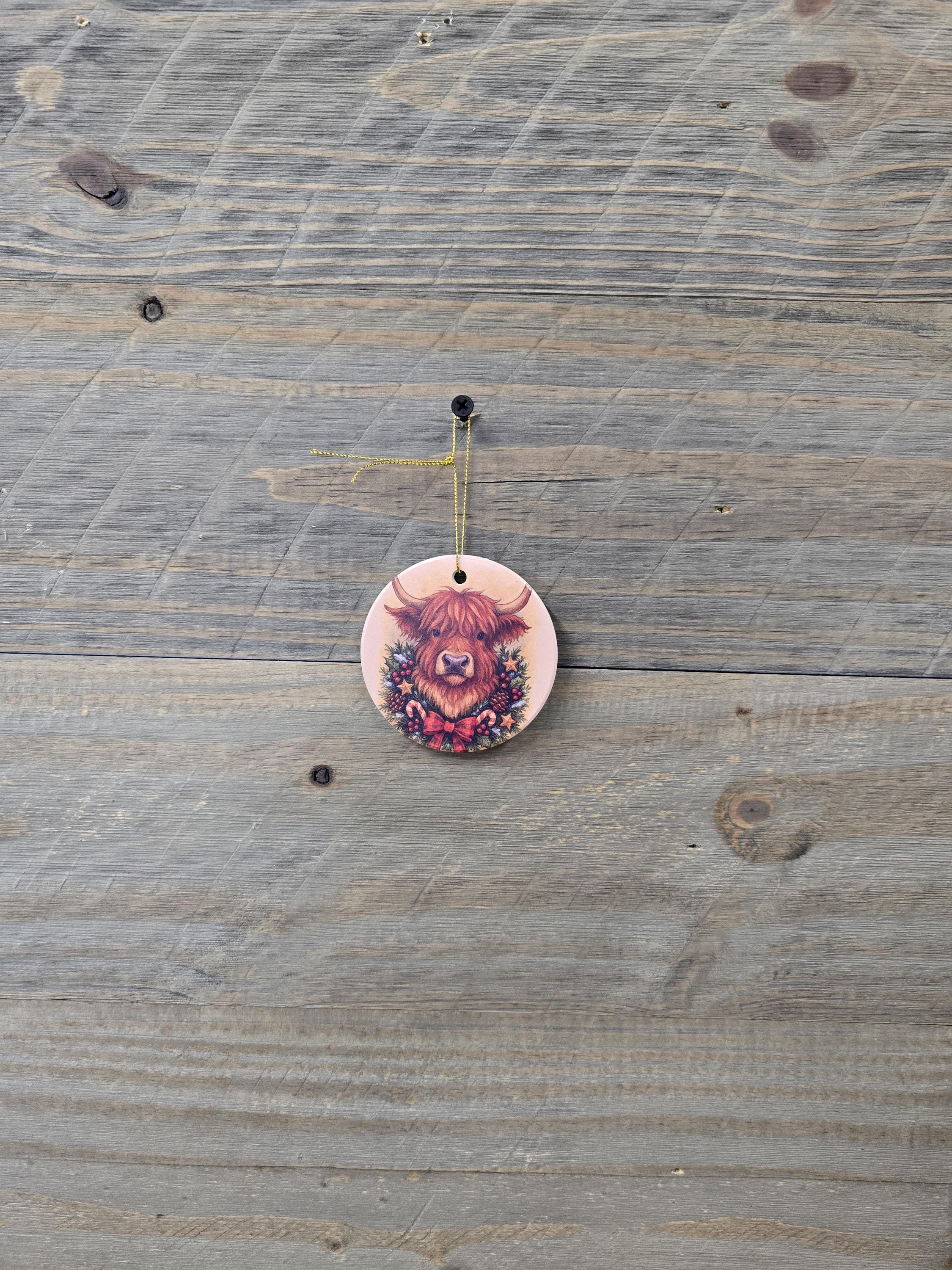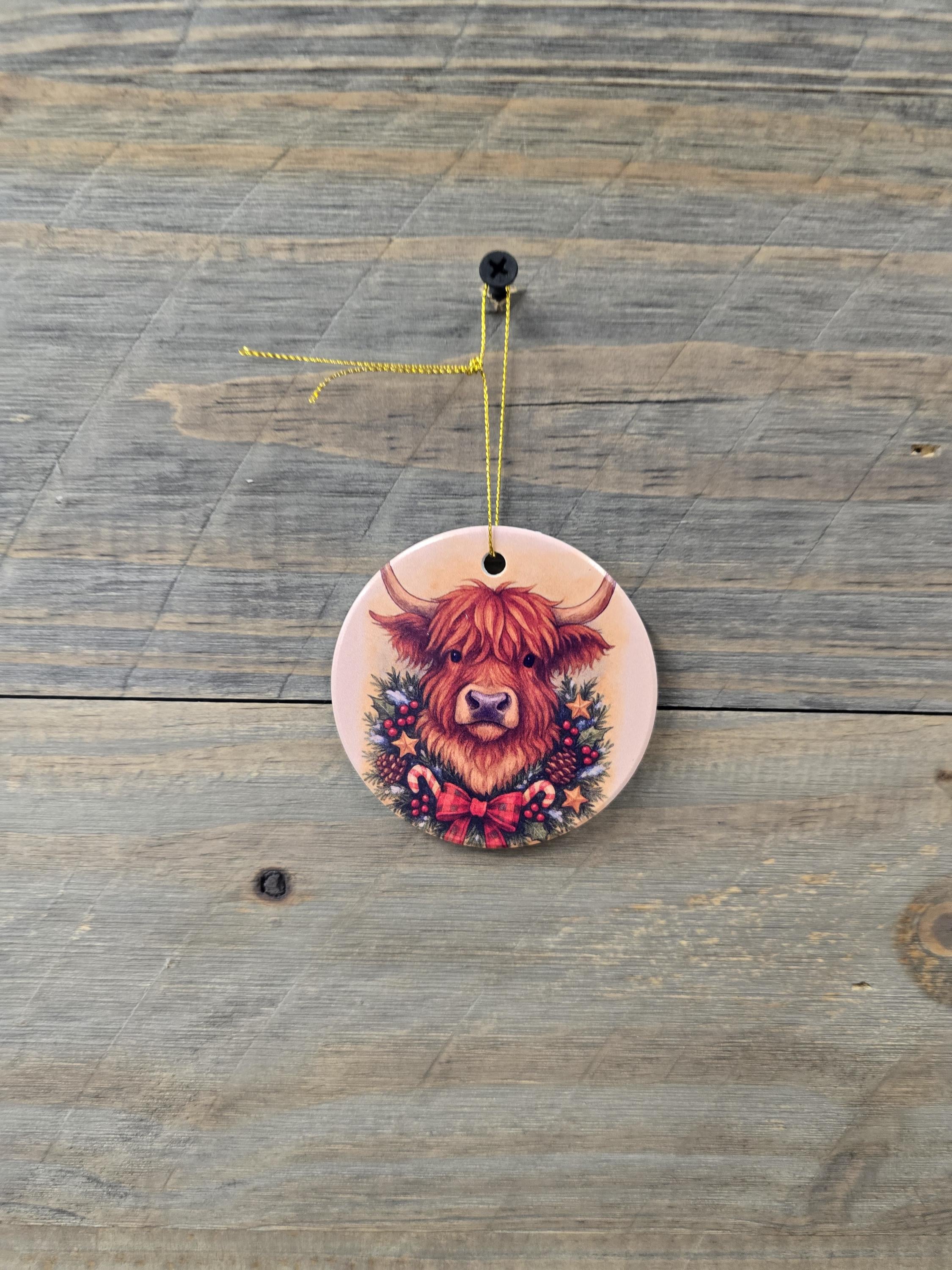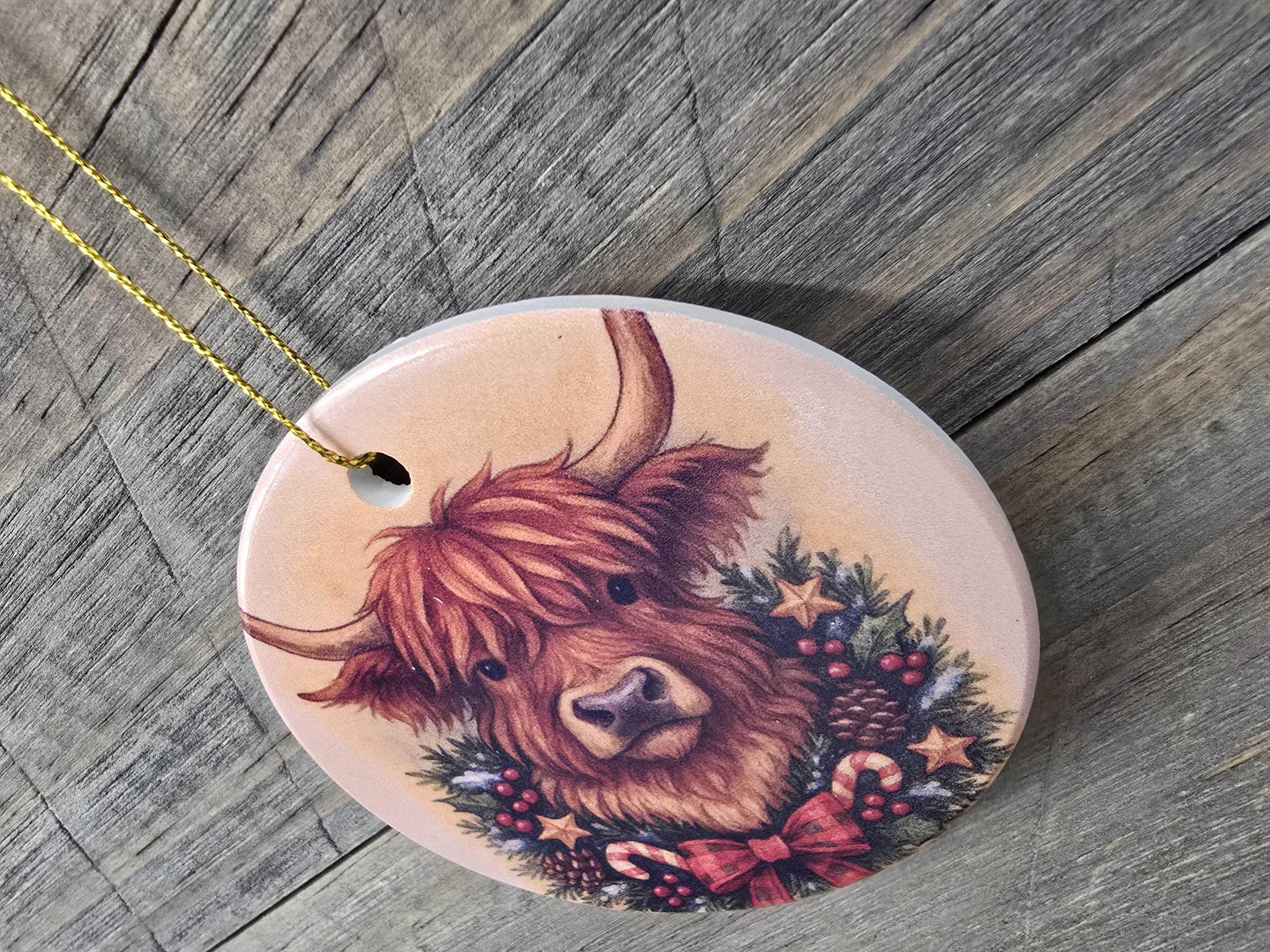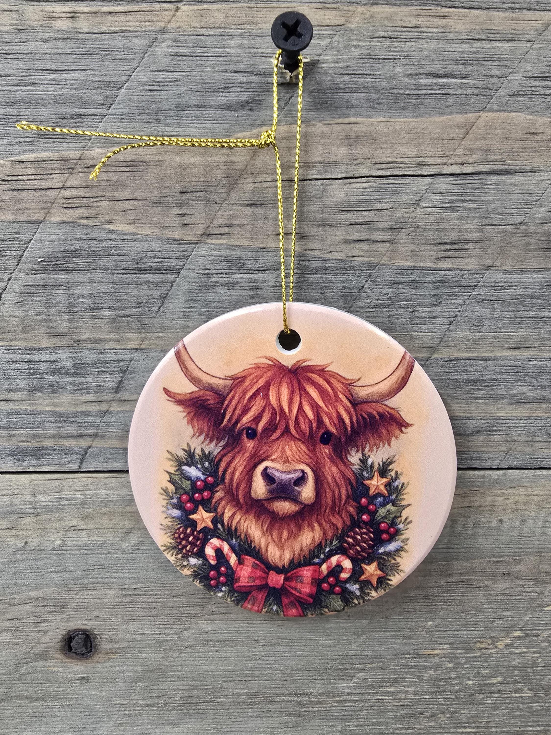 Celebrate the magic of the season with this charming ceramic ornament featuring a Highland cow wearing a wreath that is perfect for the holiday season. Designed to evoke a festive farmhouse charm, this ornament makes a perfect addition to your Christmas tree decorations or a thoughtful holiday gift for loved ones.