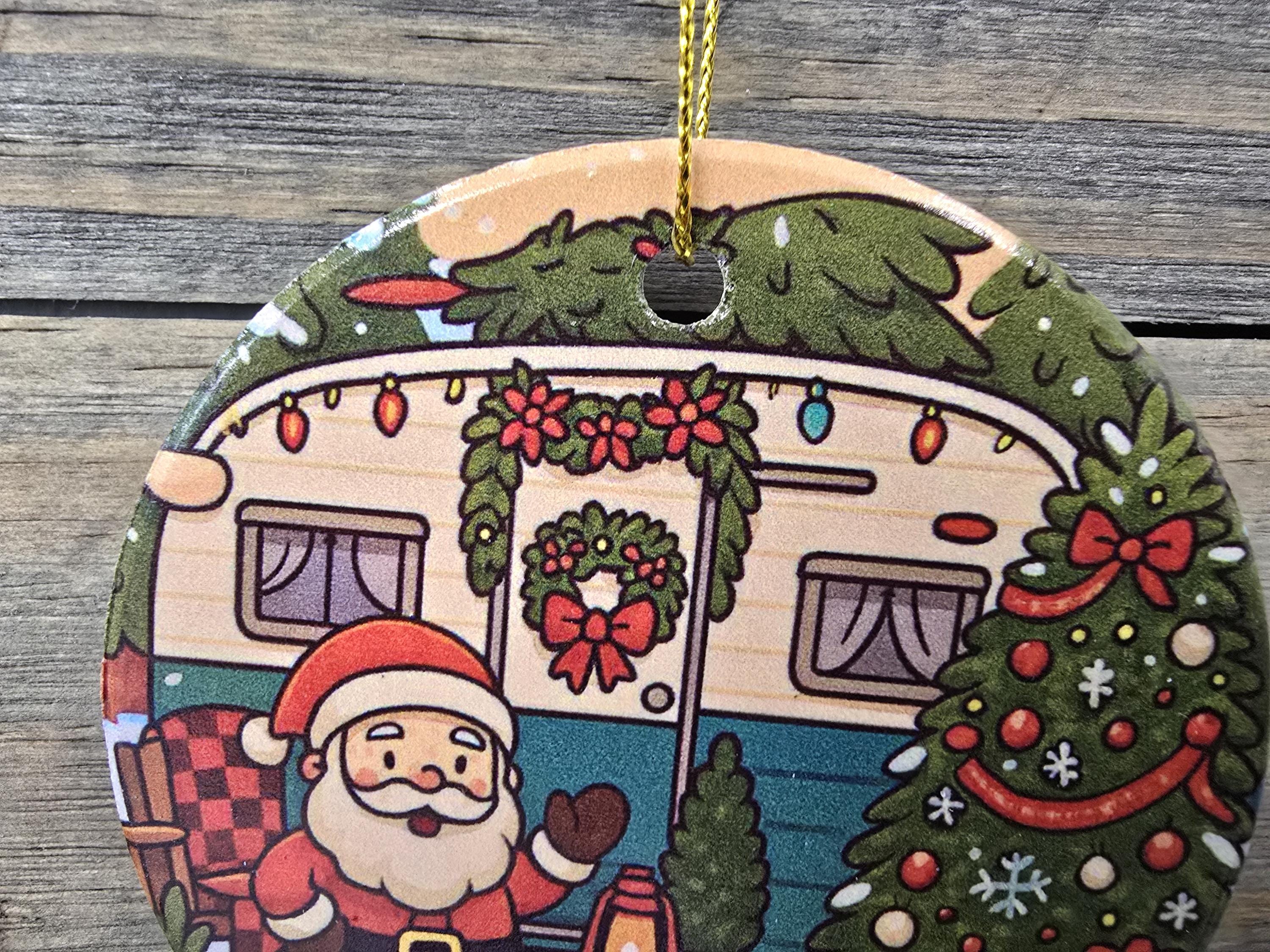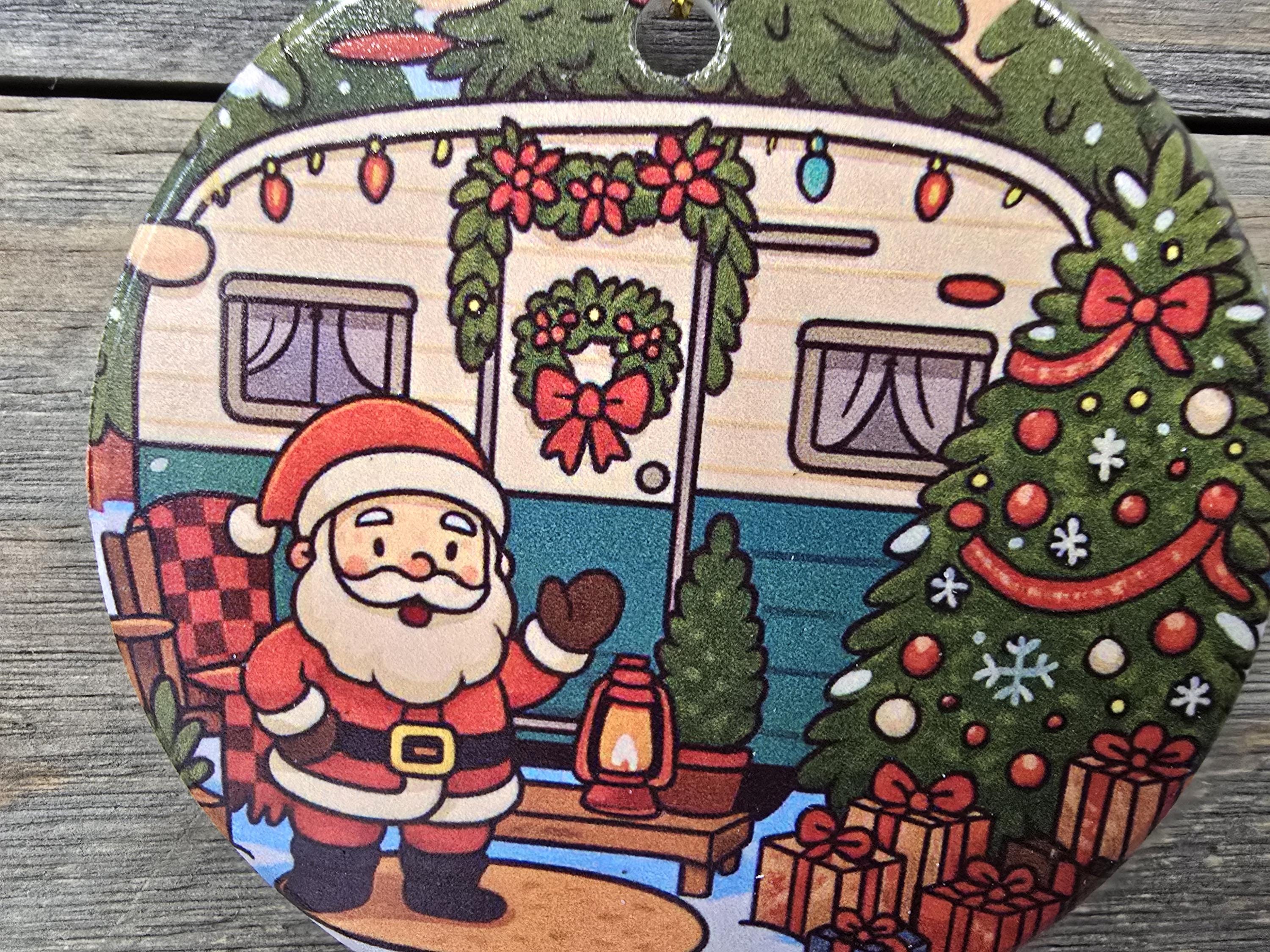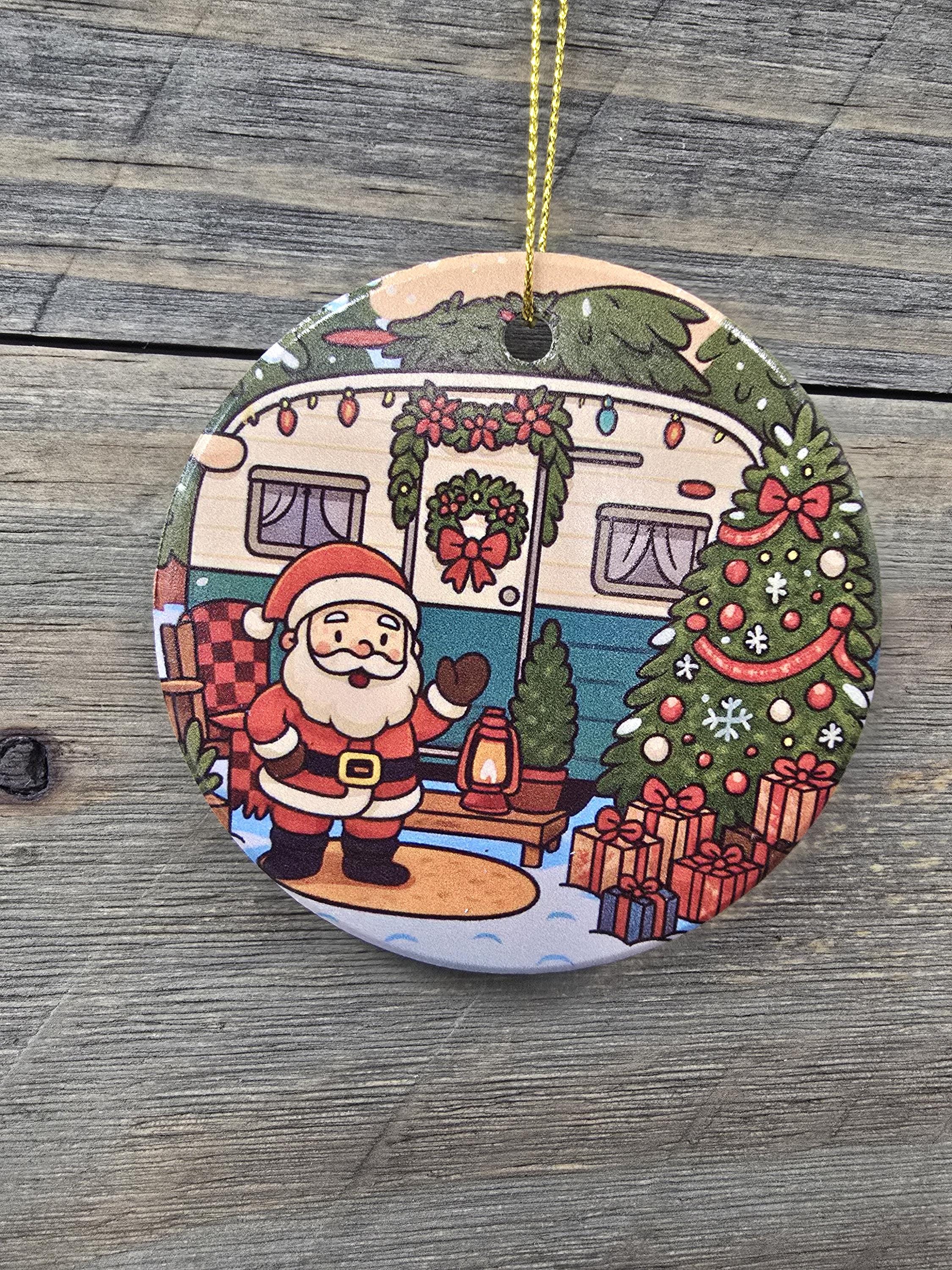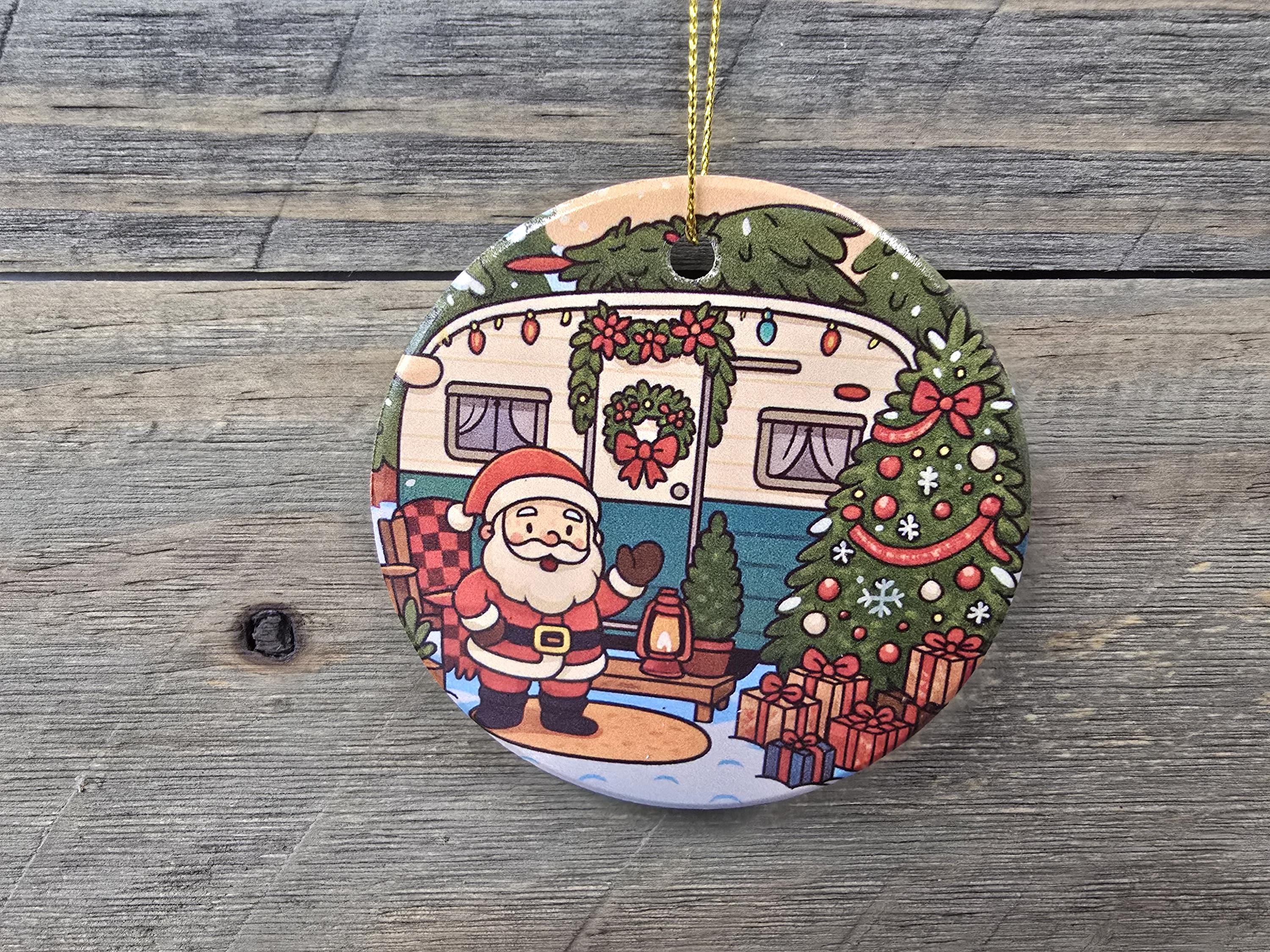 Celebrate the magic of the season with this charming ceramic ornament featuring Santa delivering presents that is perfect for the holiday season and for camping enthusiasts. Designed to evoke cozy winter nights and festive farmhouse charm, this ornament makes a perfect addition to your Christmas tree decorations or a thoughtful holiday gift for loved ones.