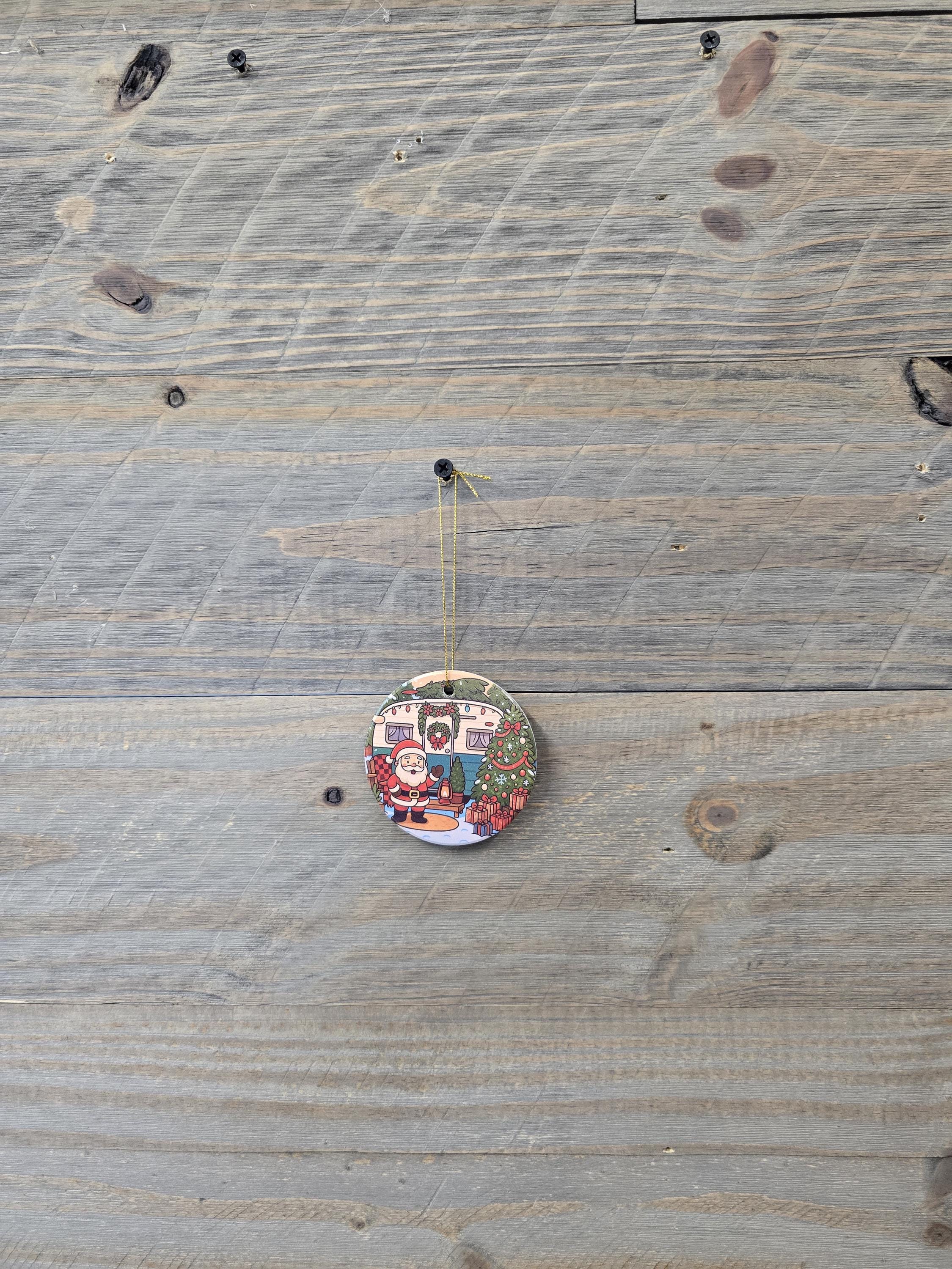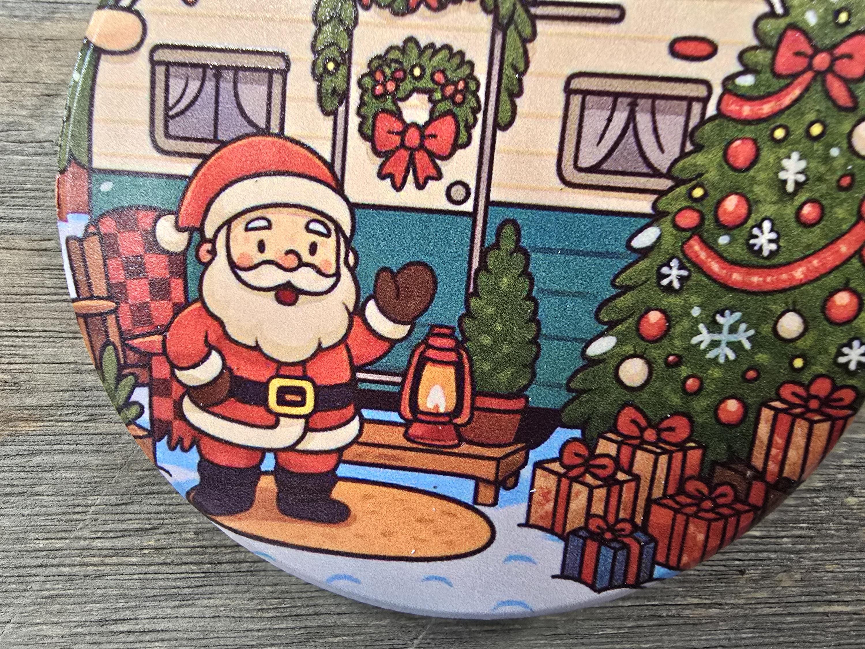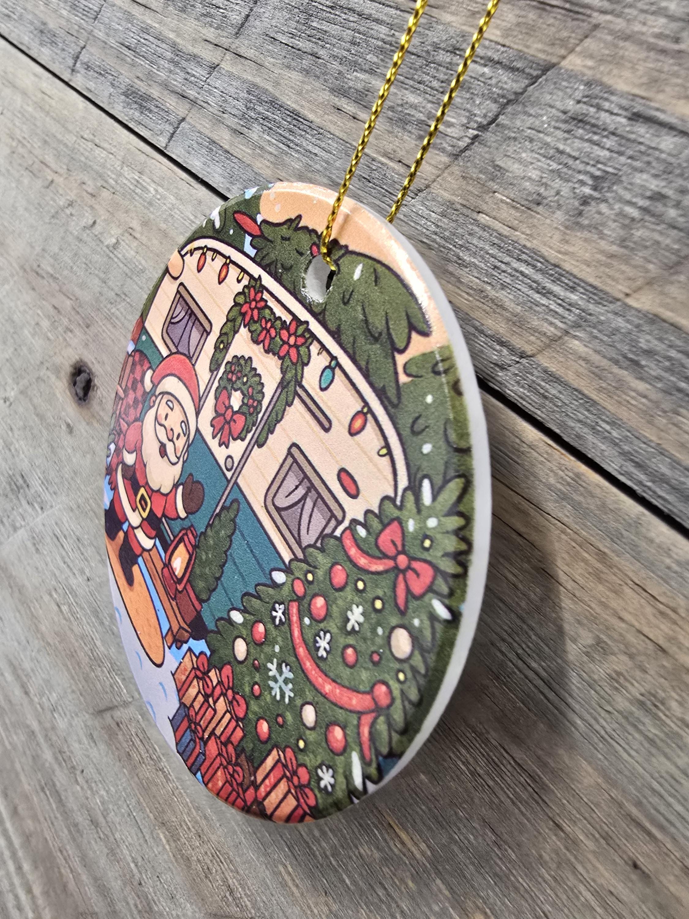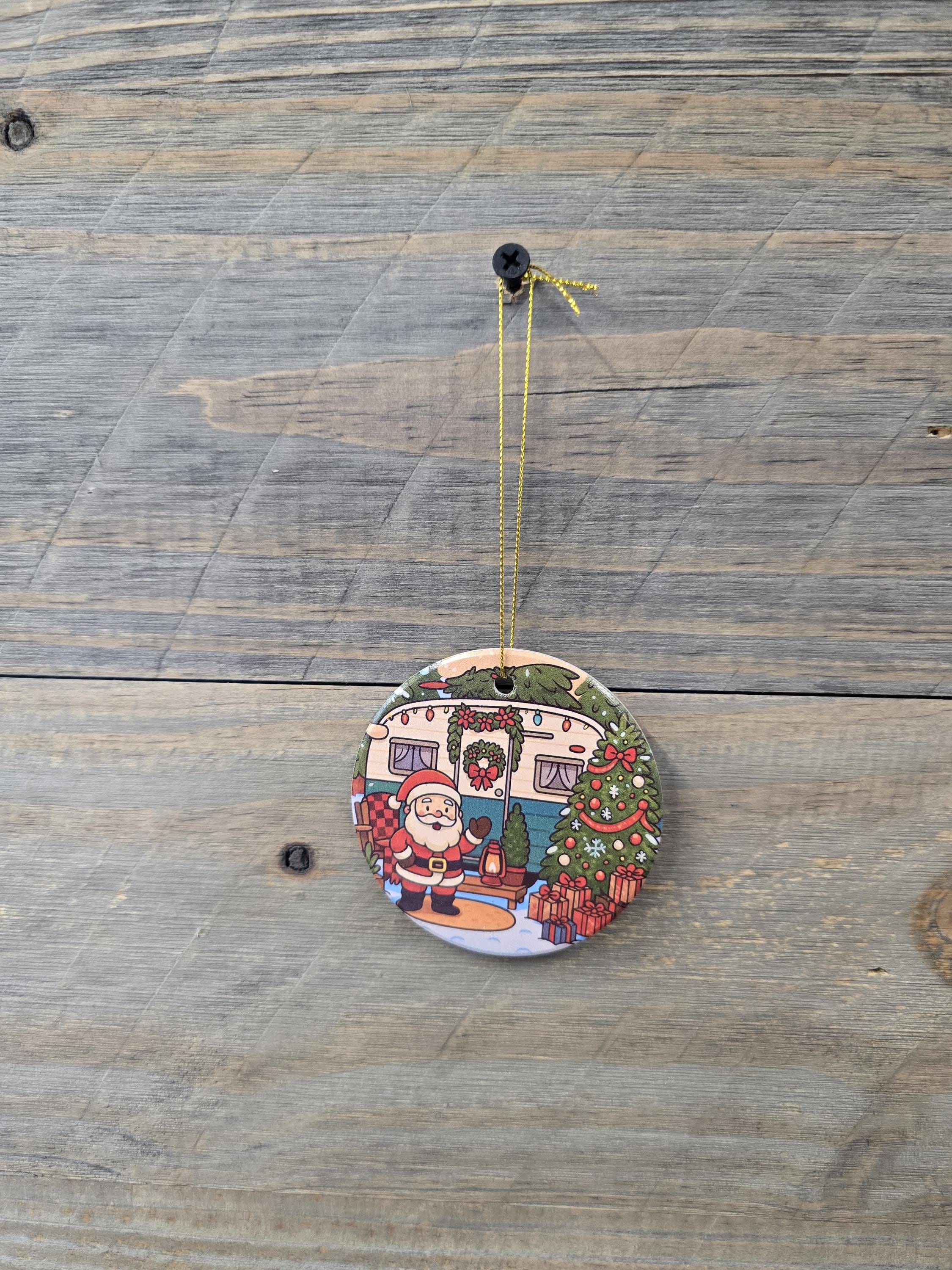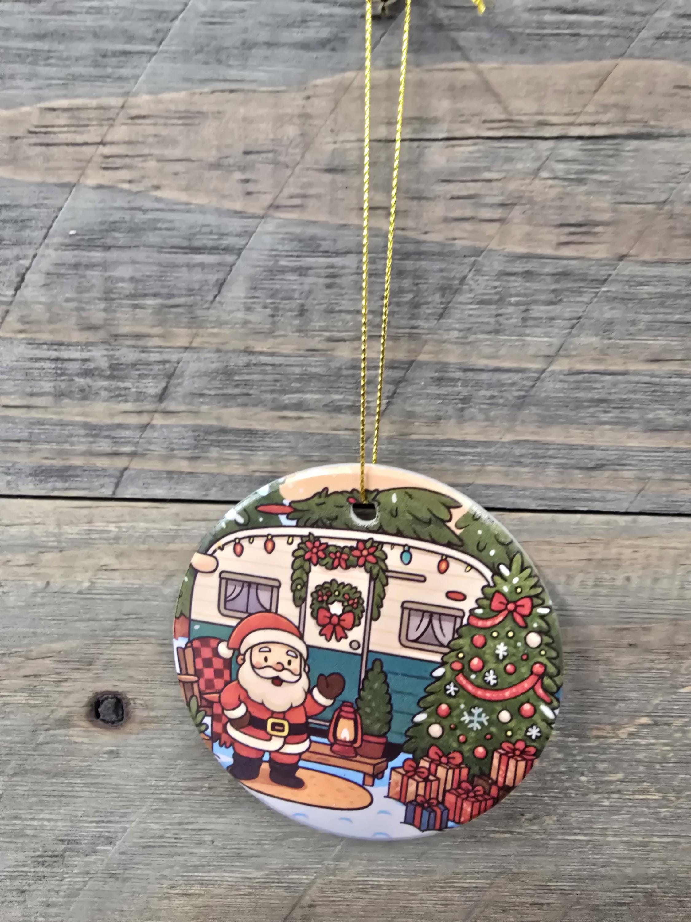 Celebrate the magic of the season with this charming ceramic ornament featuring Santa delivering presents that is perfect for the holiday season and for camping enthusiasts. Designed to evoke cozy winter nights and festive farmhouse charm, this ornament makes a perfect addition to your Christmas tree decorations or a thoughtful holiday gift for loved ones.