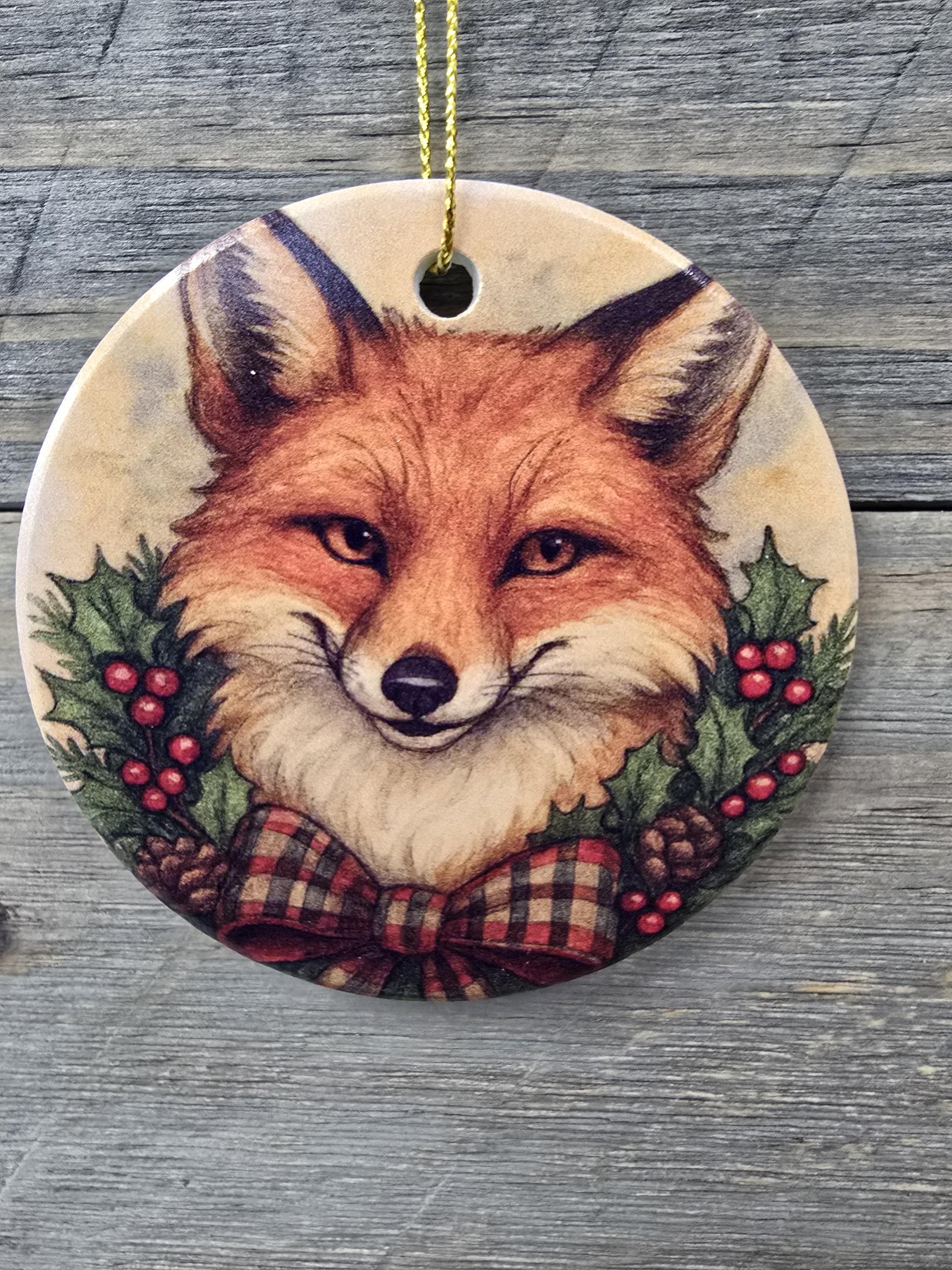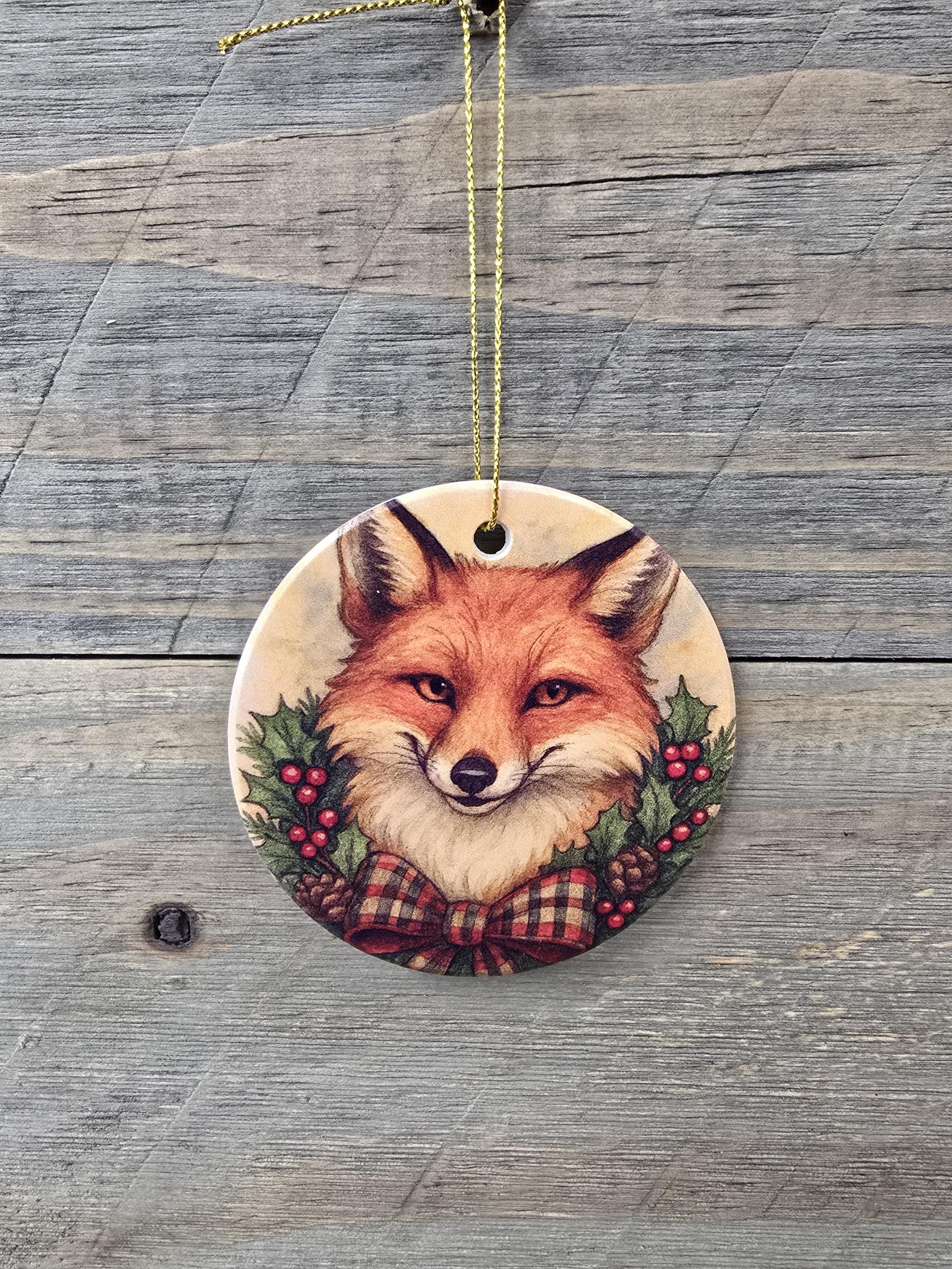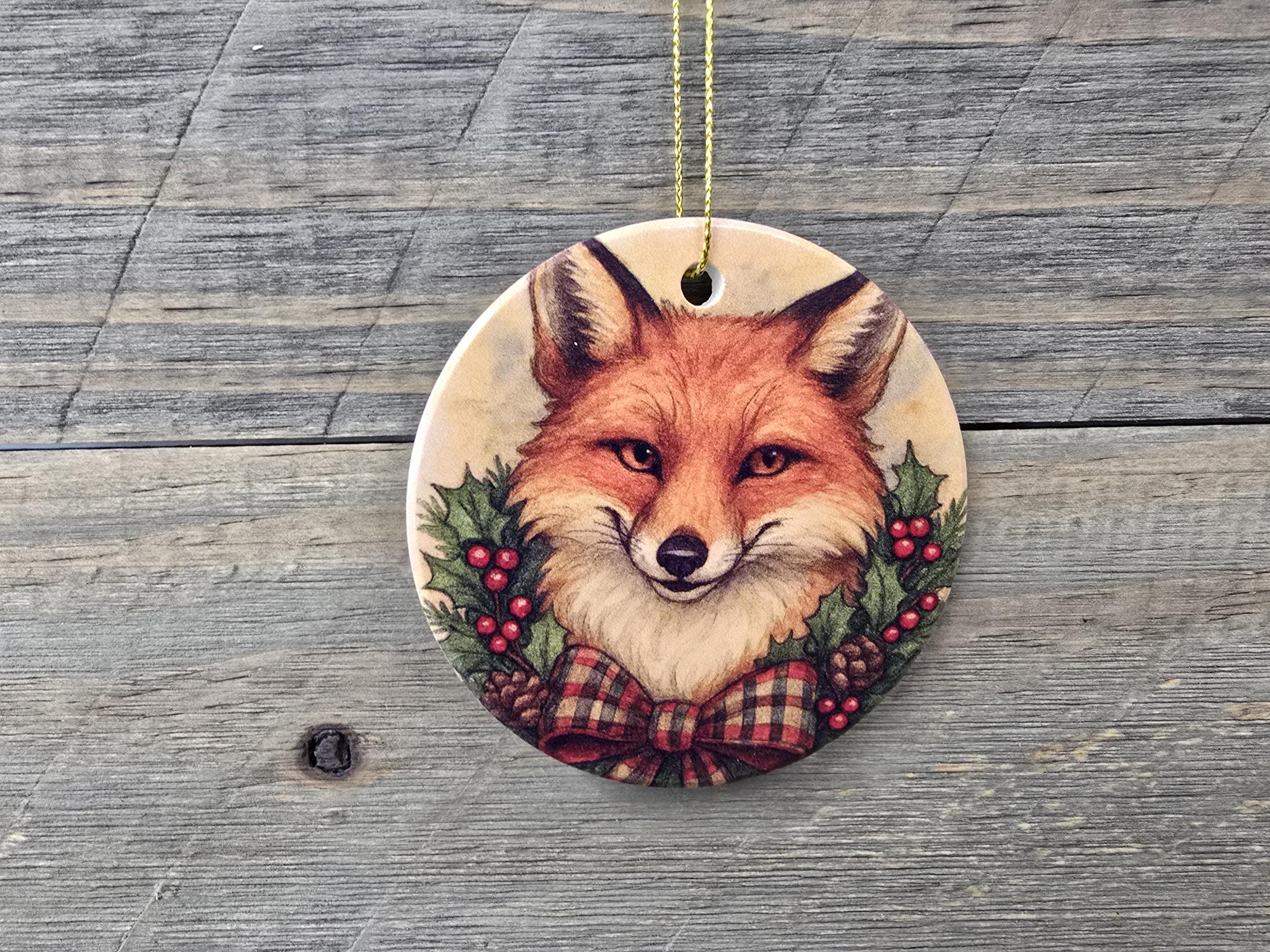 Celebrate the magic of the season with this charming ceramic ornament featuring a festive fox wearing a wreath that is perfect for the holiday season. Designed to evoke a festive farmhouse charm, this ornament makes a perfect addition to your Christmas tree decorations or a thoughtful holiday gift for loved ones.