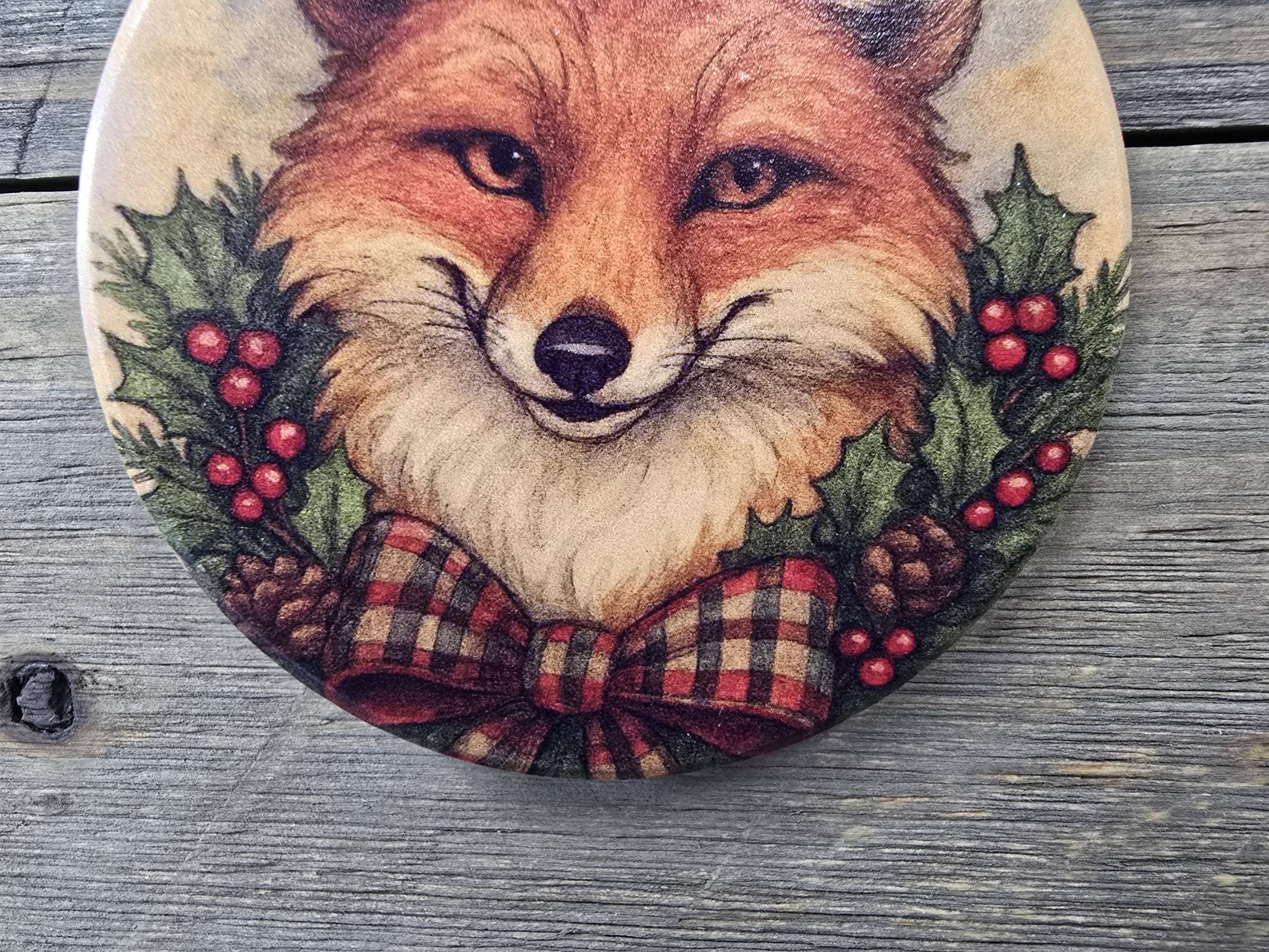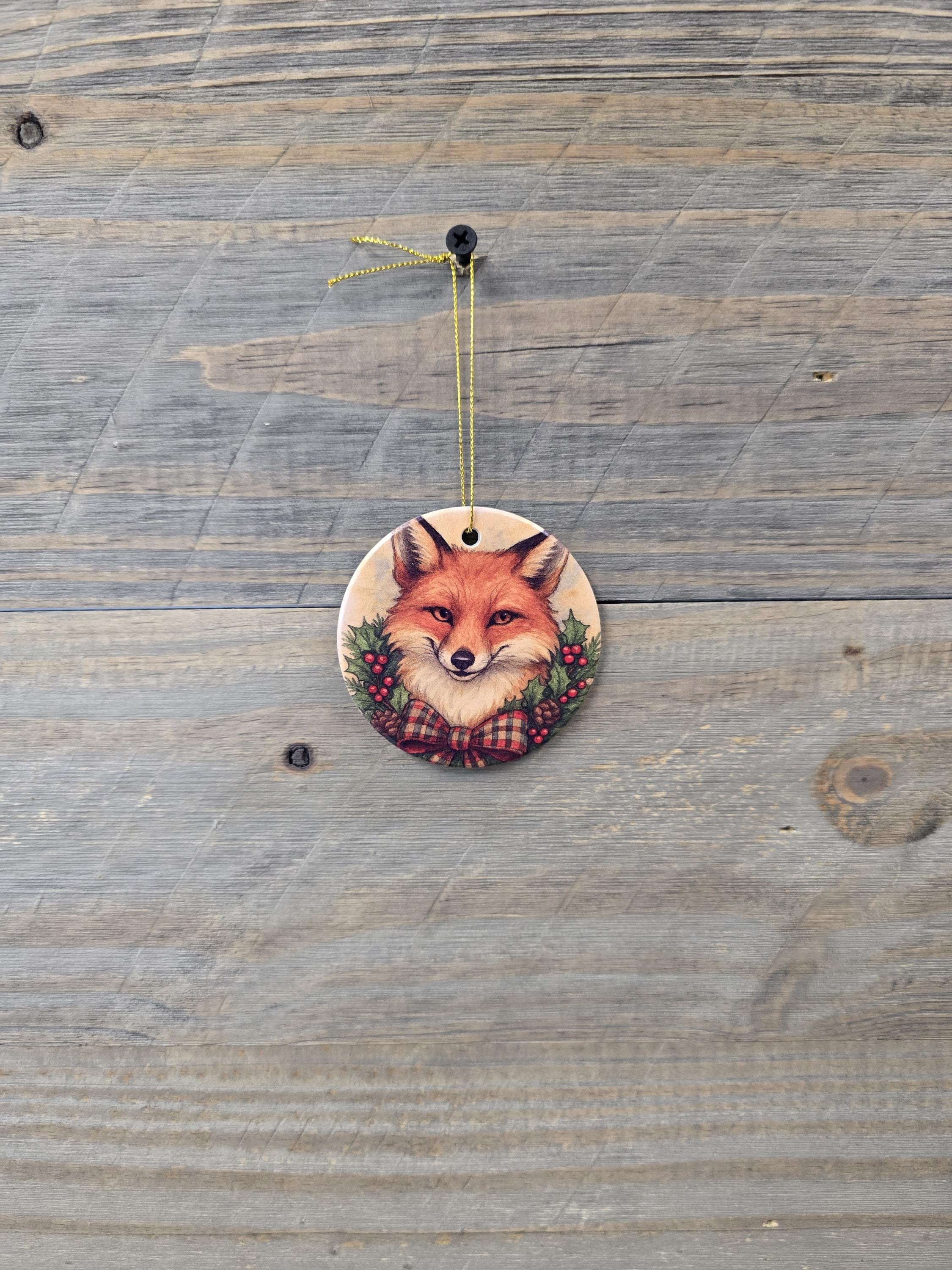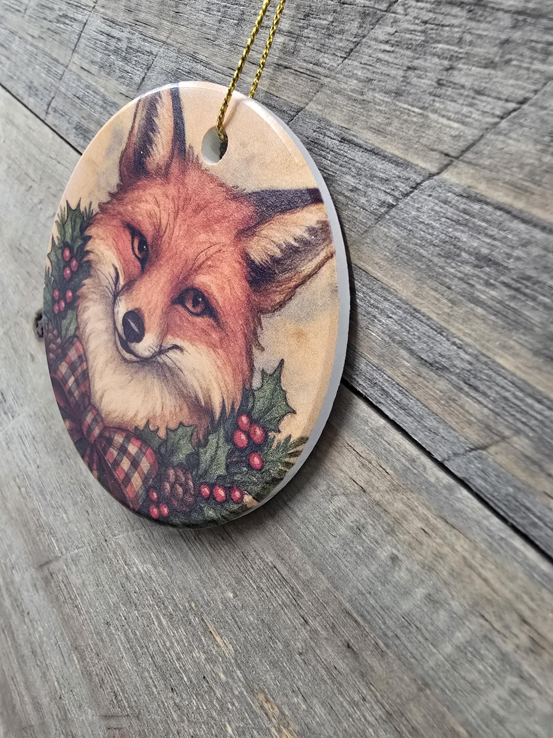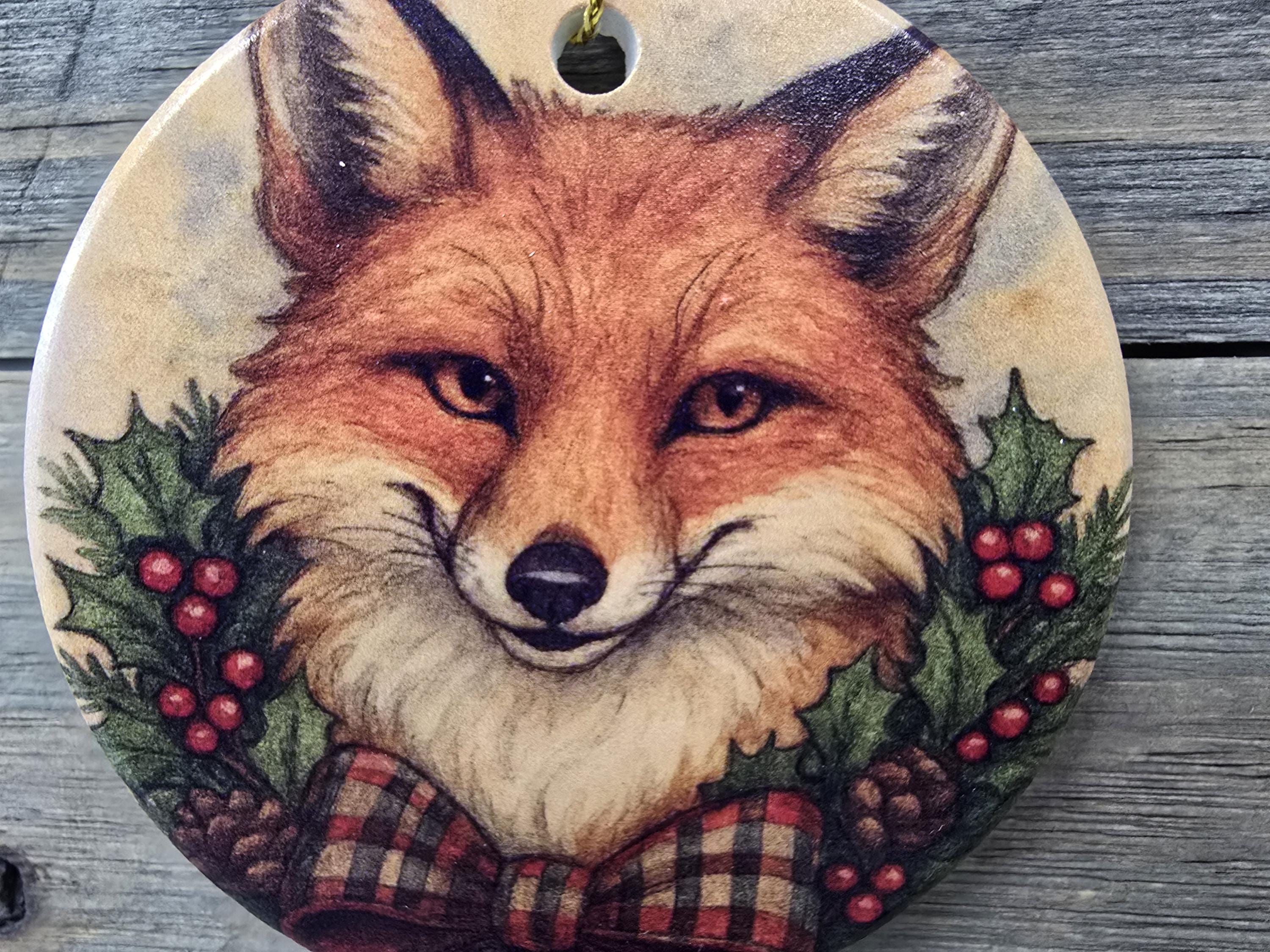Celebrate the magic of the season with this charming ceramic ornament featuring a festive fox wearing a wreath that is perfect for the holiday season. Designed to evoke a festive farmhouse charm, this ornament makes a perfect addition to your Christmas tree decorations or a thoughtful holiday gift for loved ones.