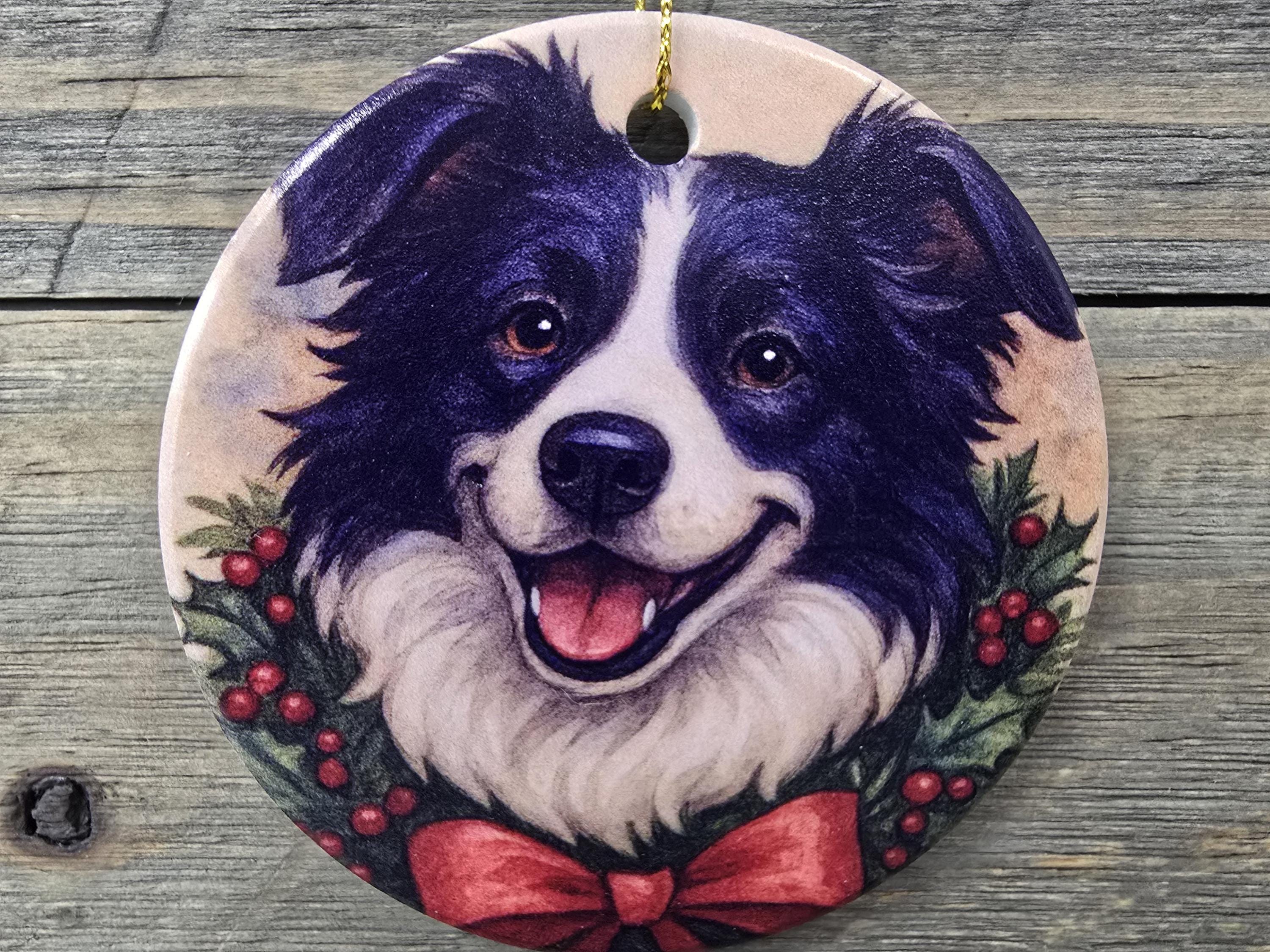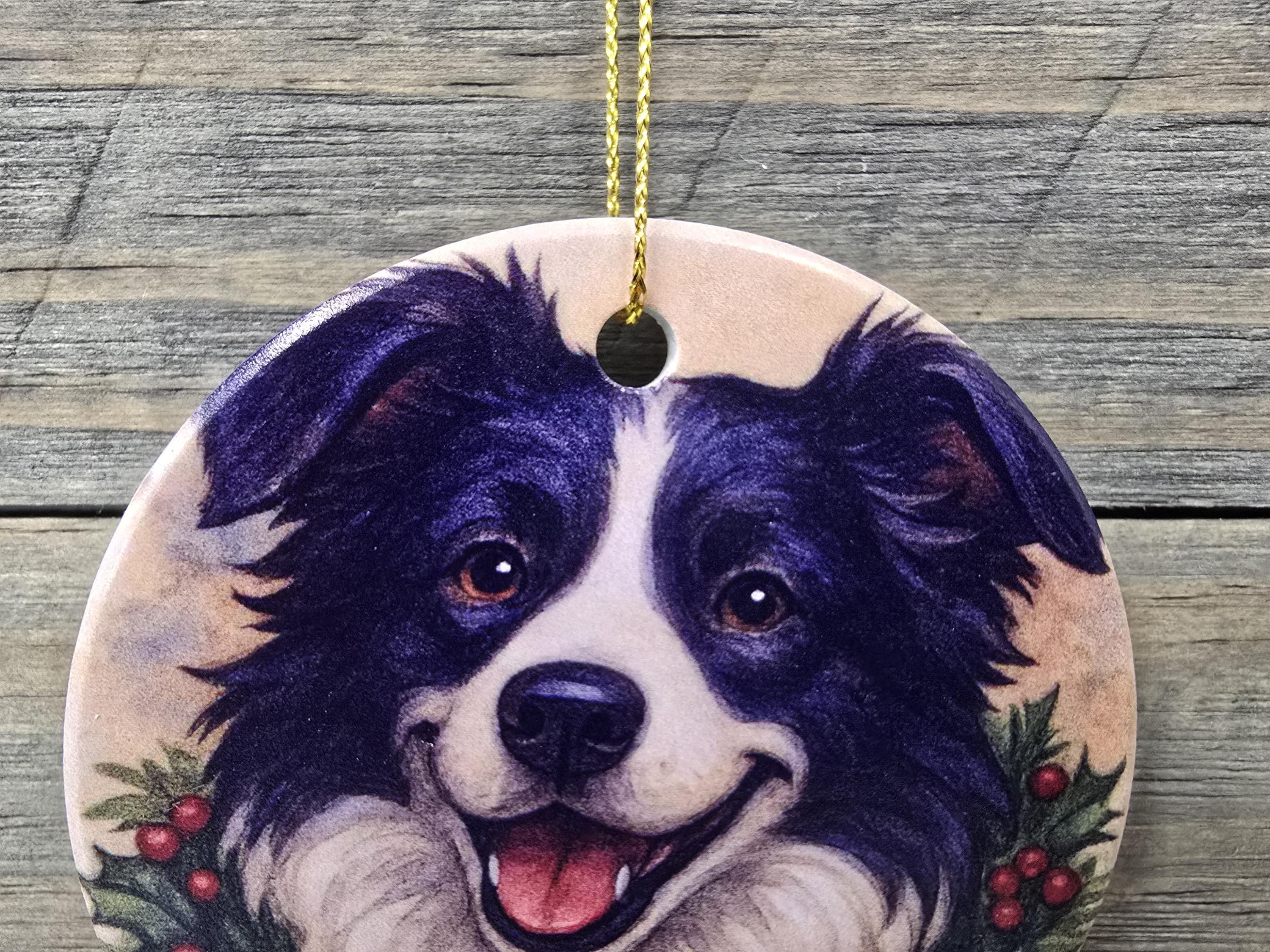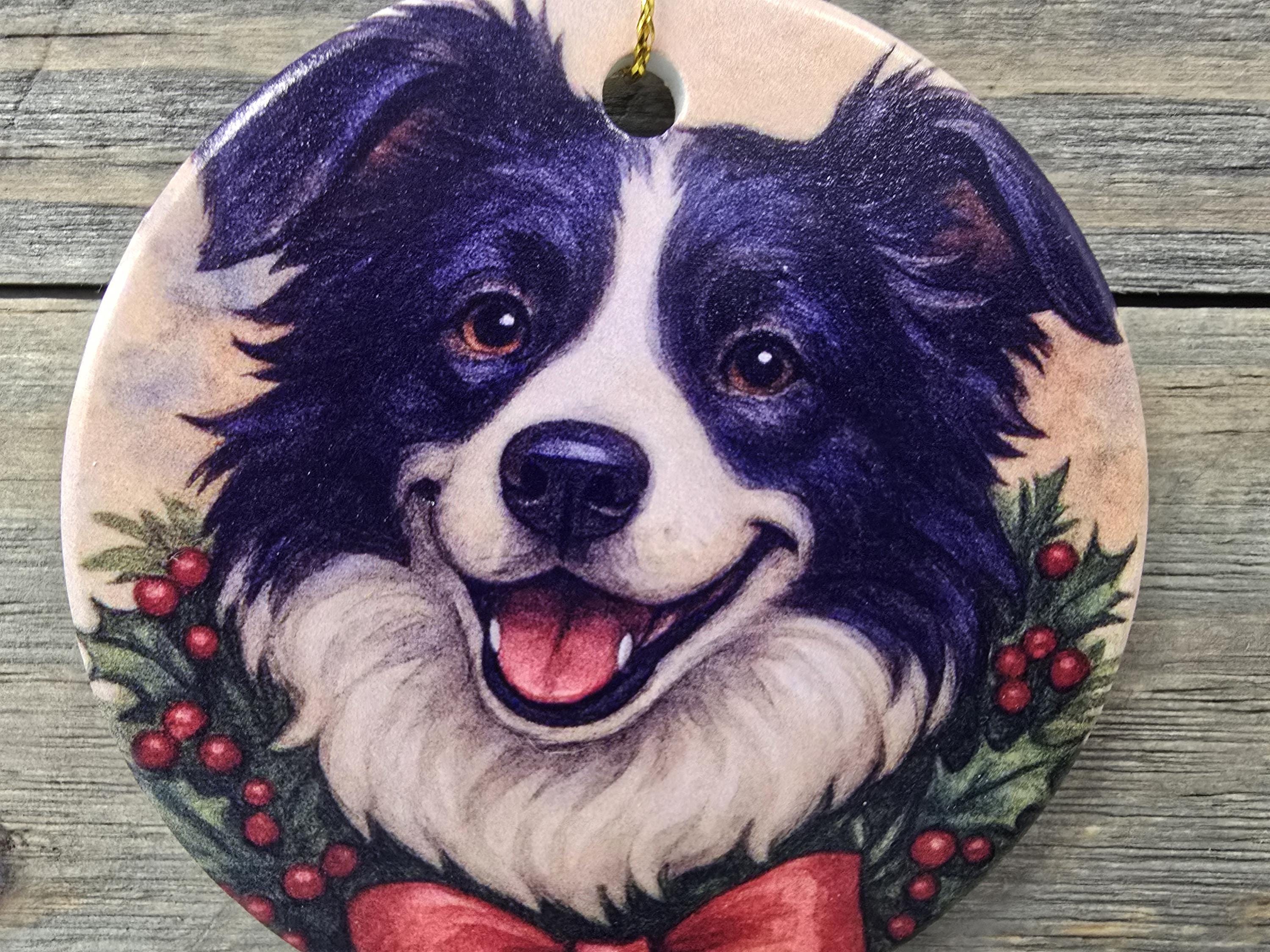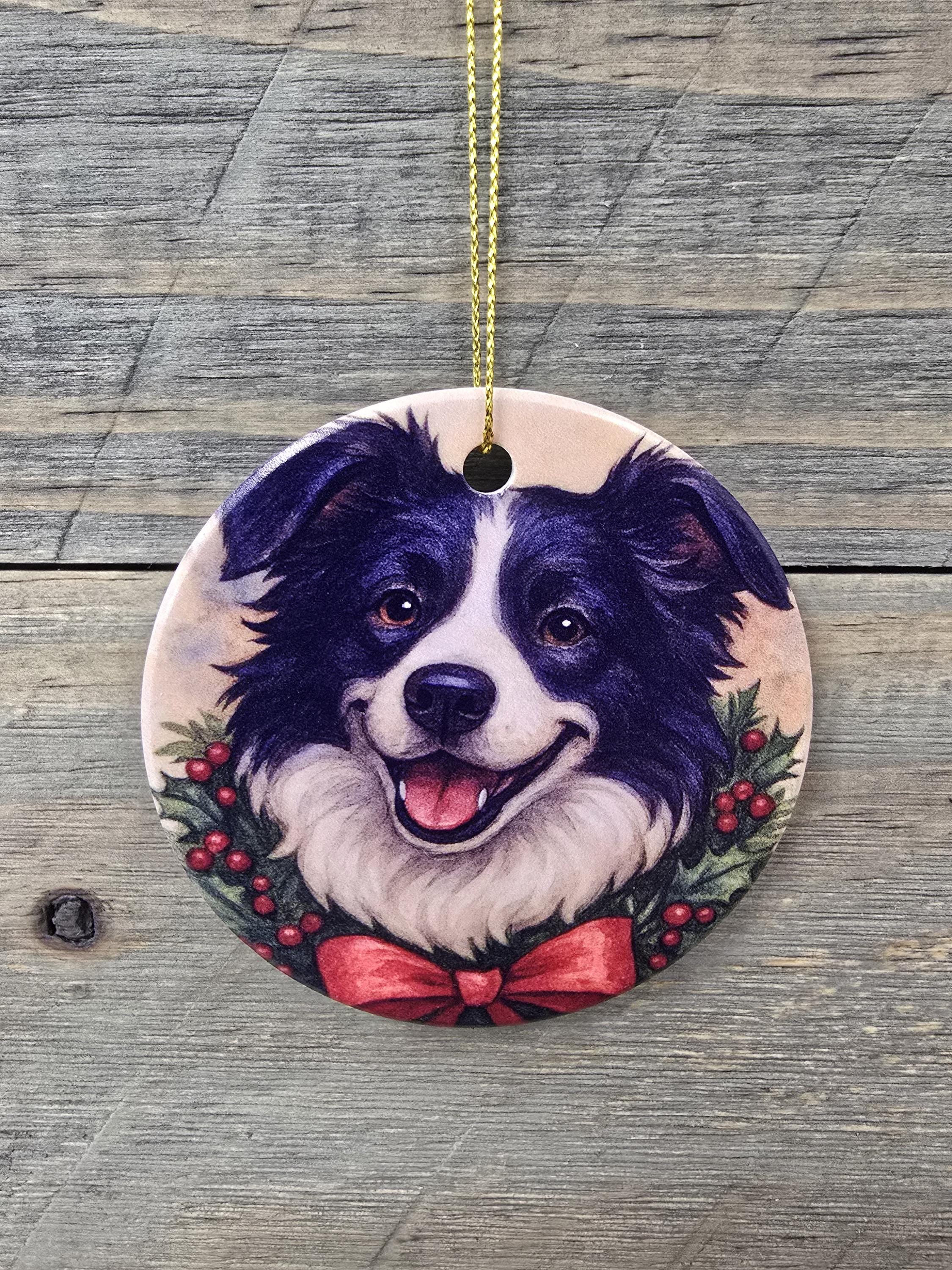 Celebrate the magic of the season with this charming ceramic ornament featuring a festive dog wearing a wreath that is perfect for the holiday season. Designed to evoke a festive farmhouse charm, this ornament makes a perfect addition to your Christmas tree decorations or a thoughtful holiday gift for loved ones.