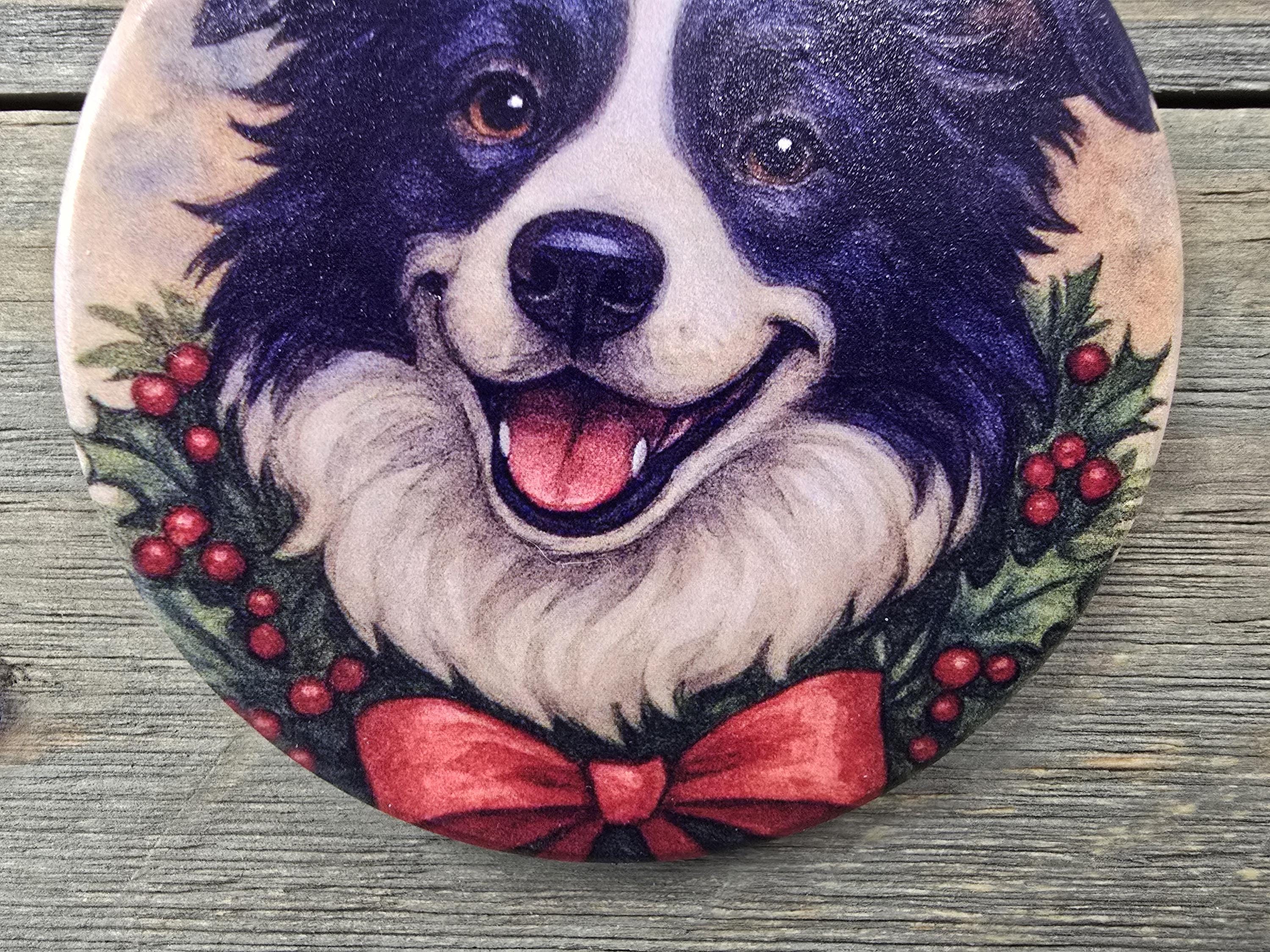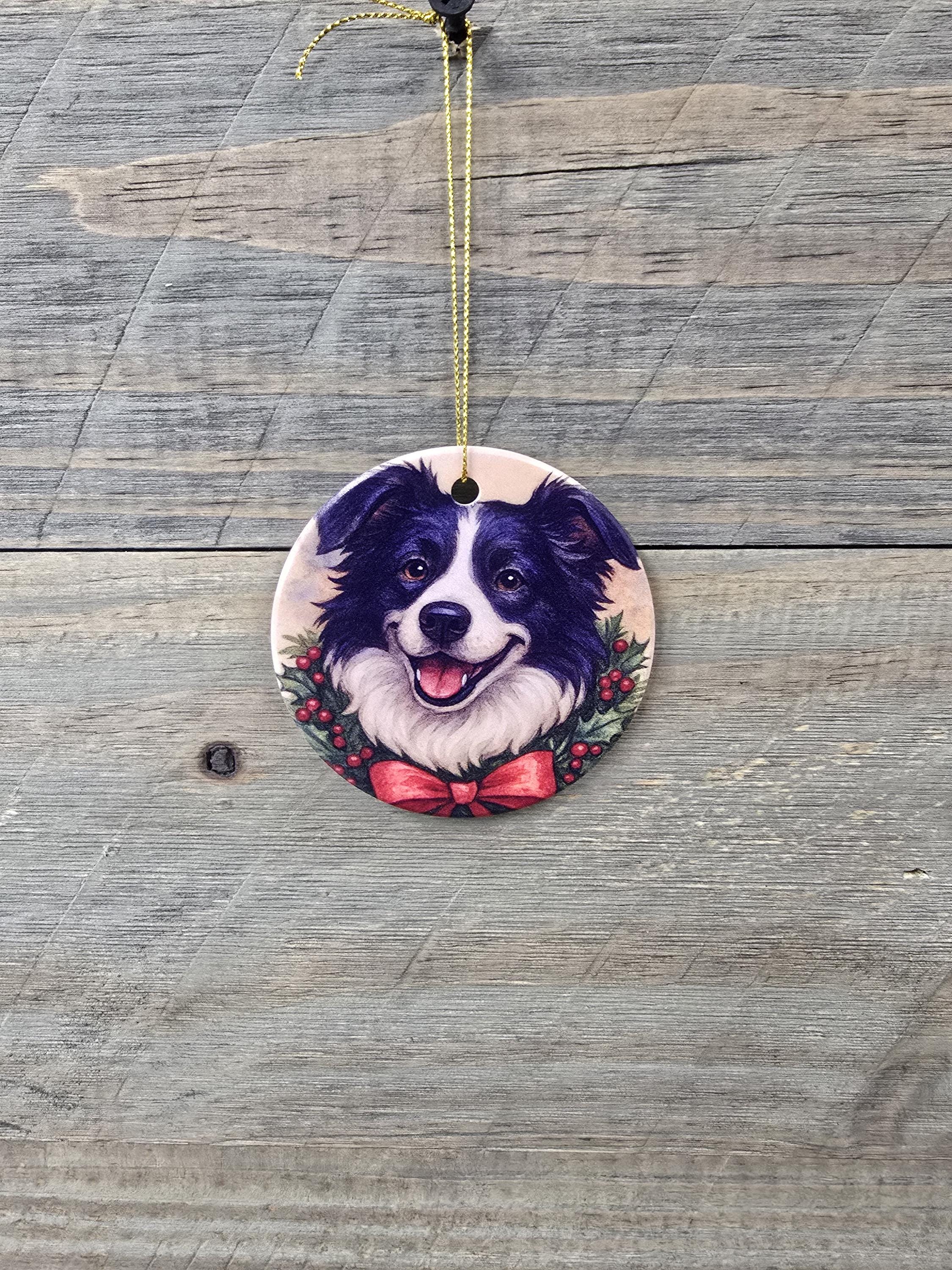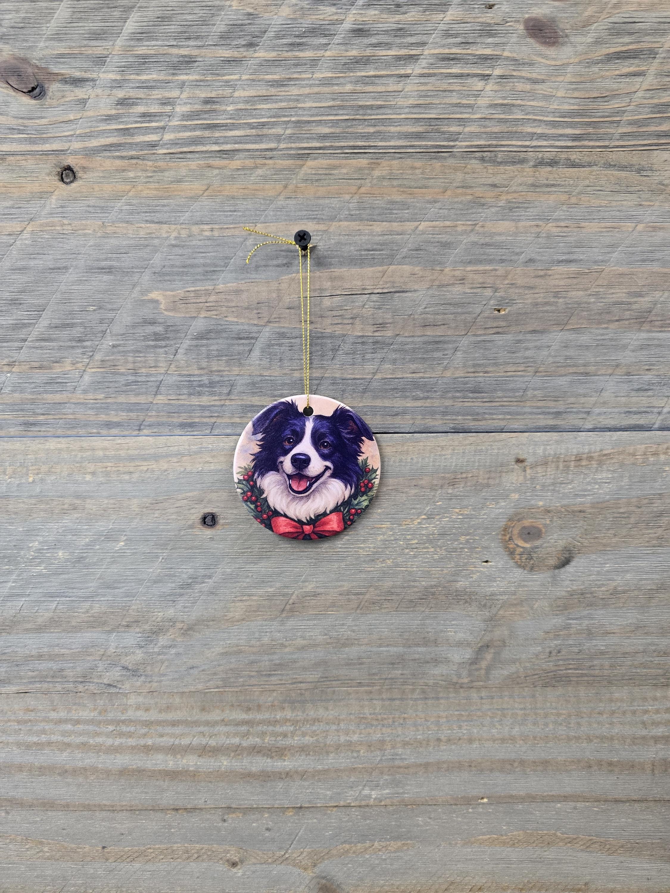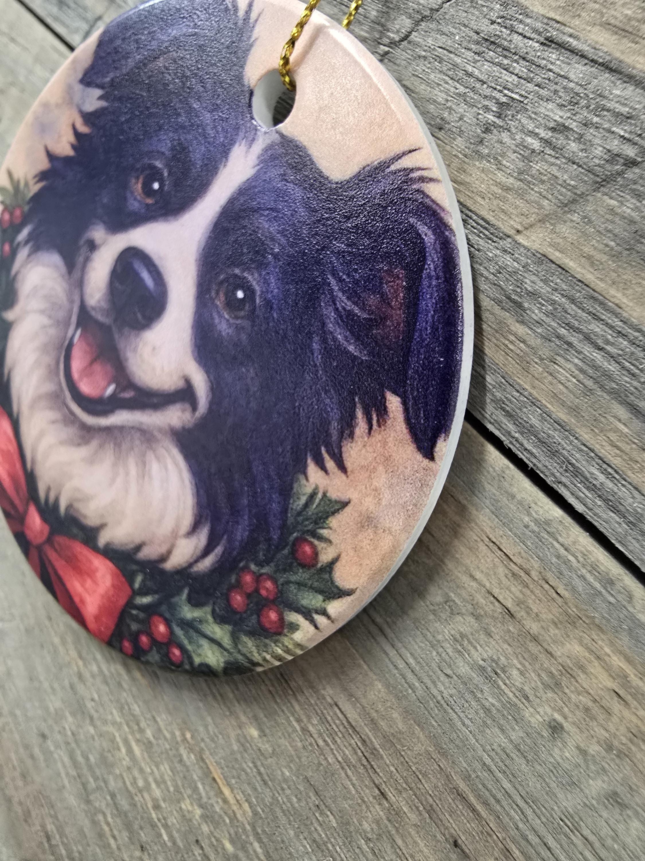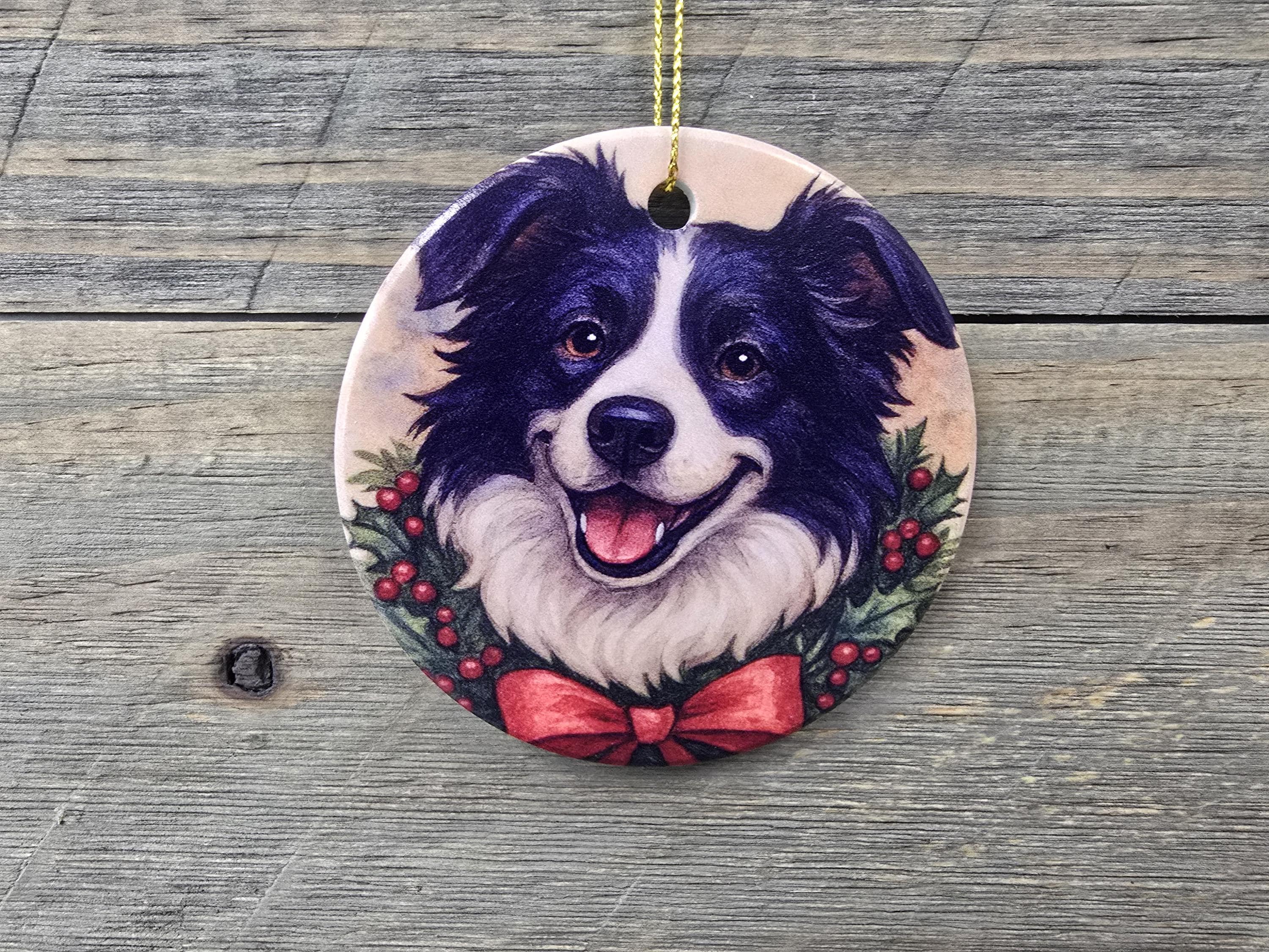 Celebrate the magic of the season with this charming ceramic ornament featuring a festive dog wearing a wreath that is perfect for the holiday season. Designed to evoke a festive farmhouse charm, this ornament makes a perfect addition to your Christmas tree decorations or a thoughtful holiday gift for loved ones.