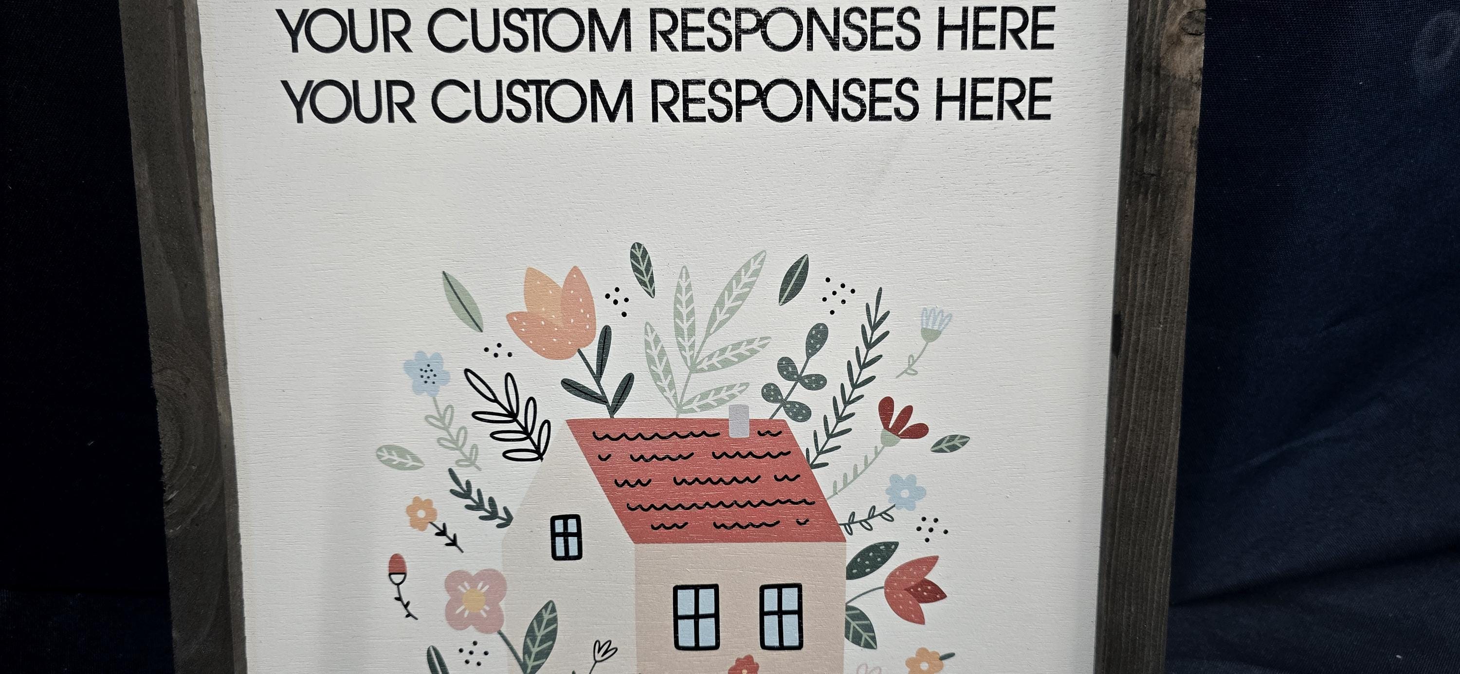All components can be customized. This sign has a solid wood frame stained ebony, and natural wood backerboard.