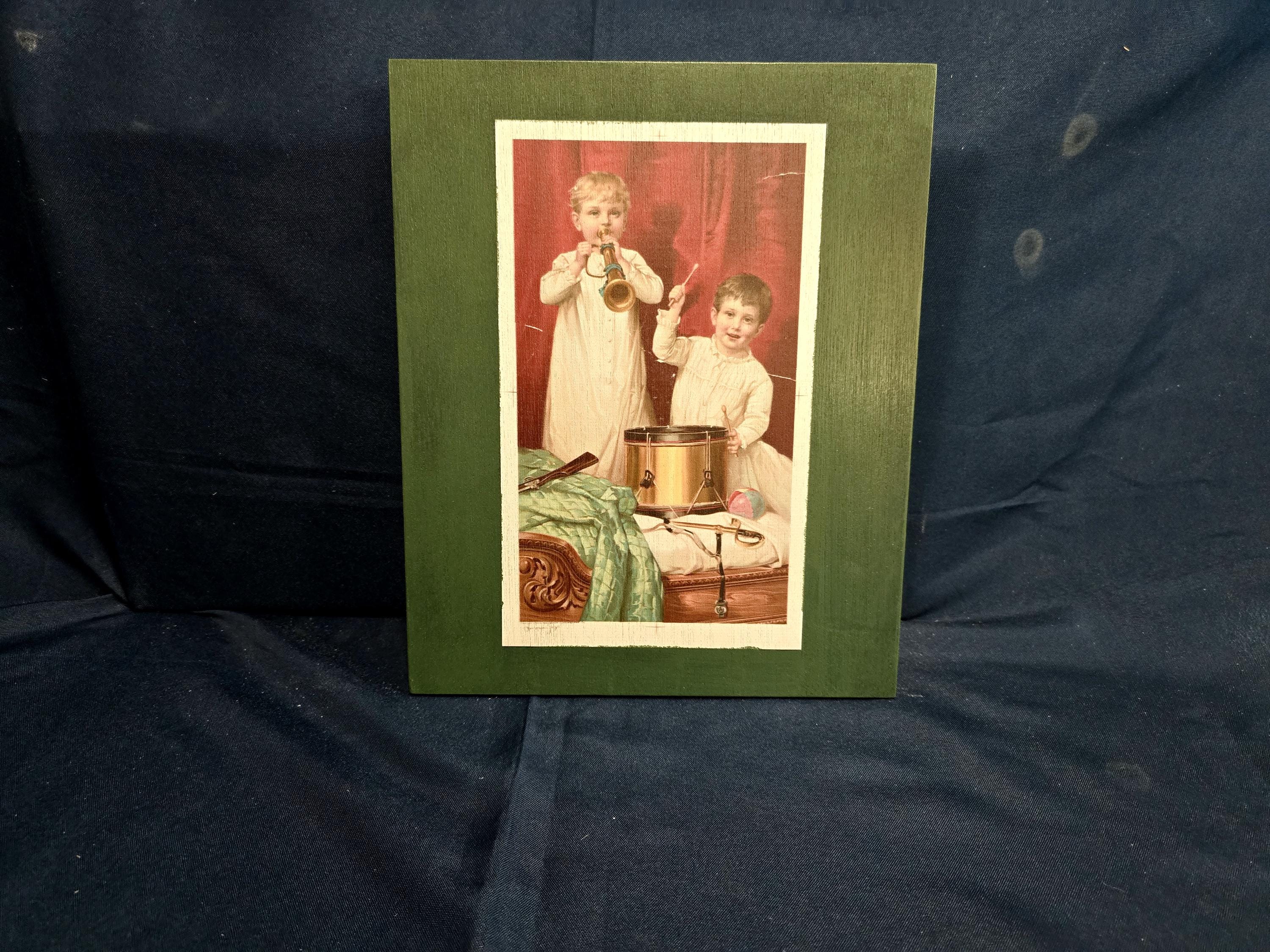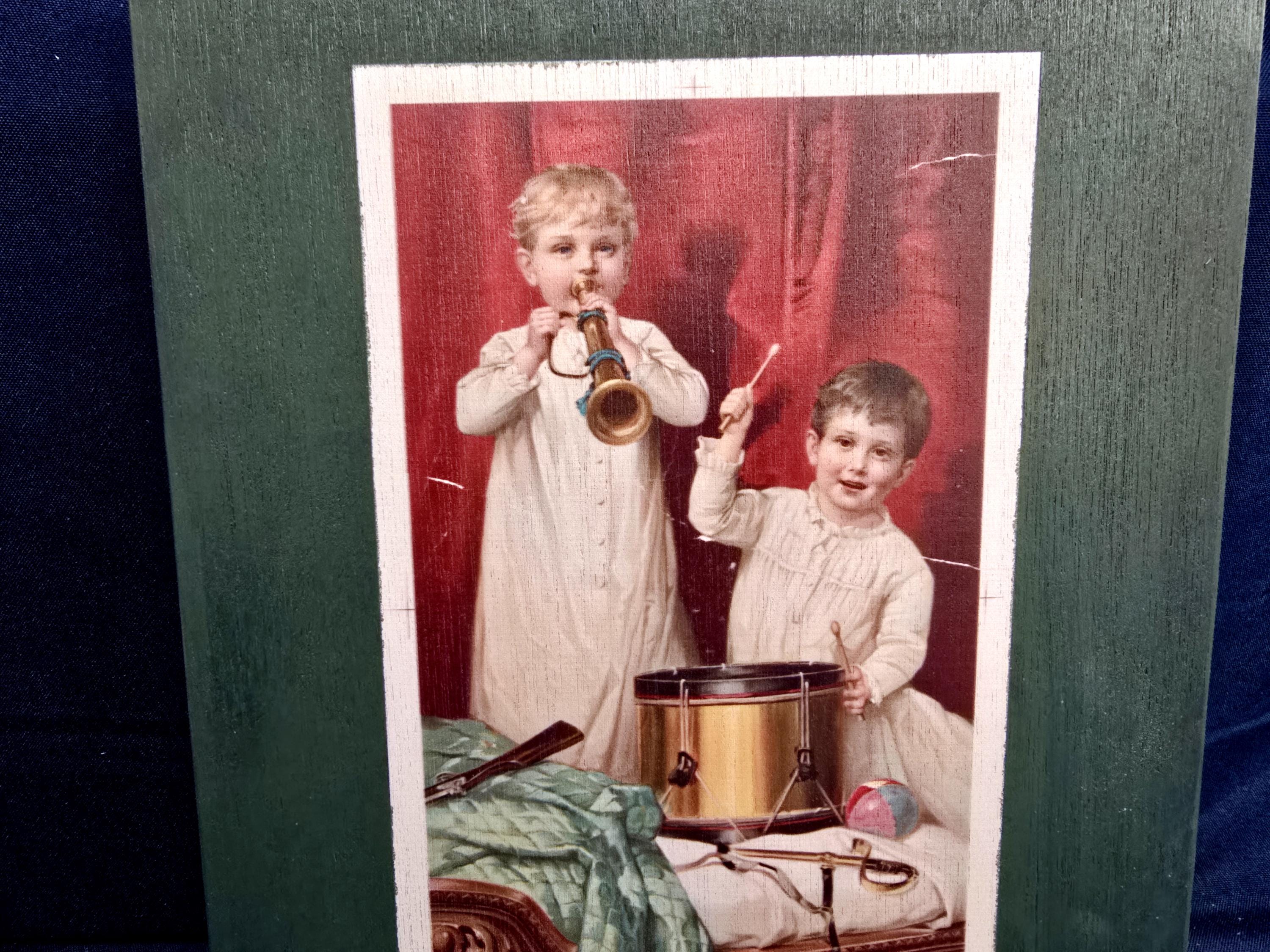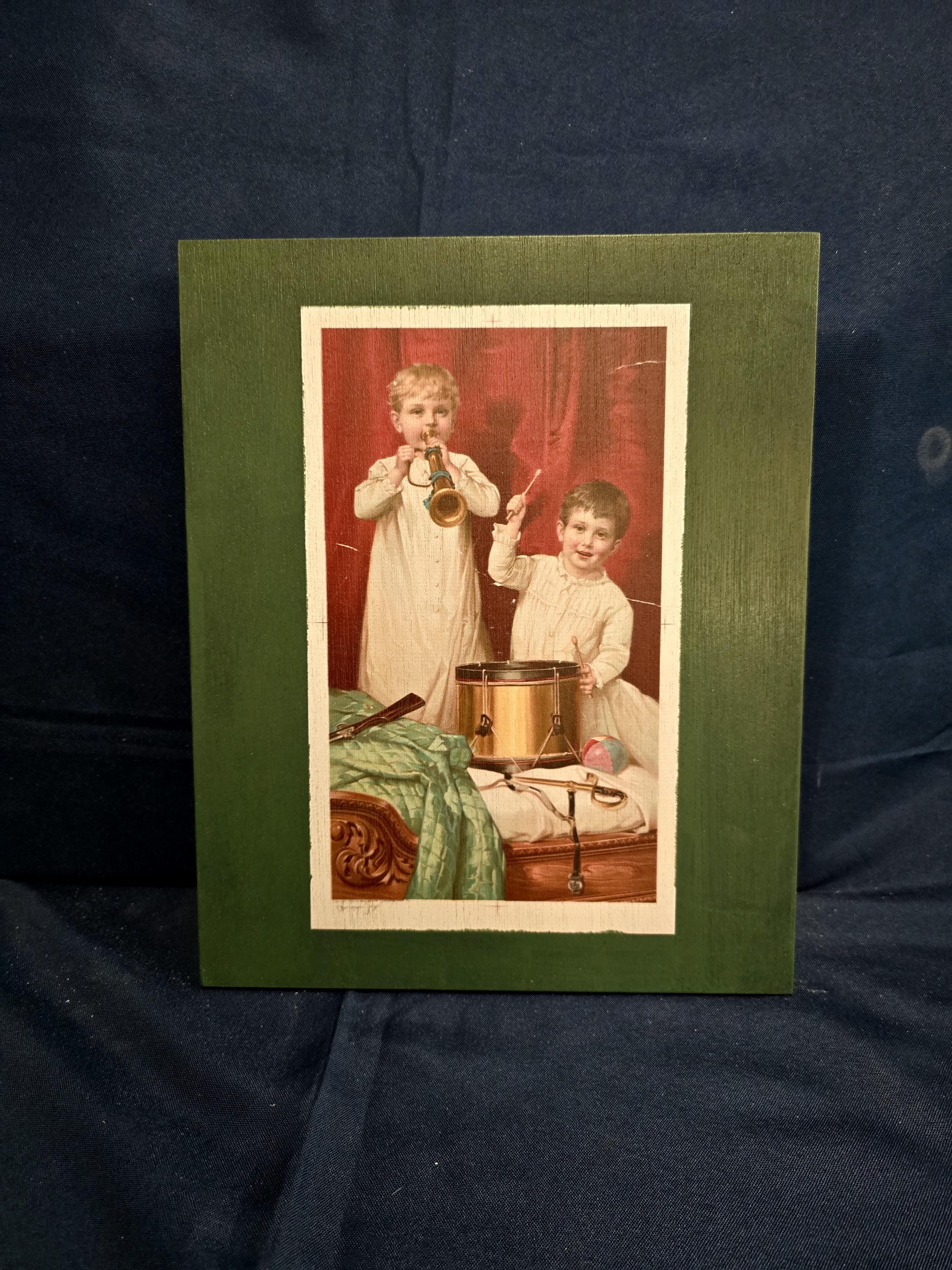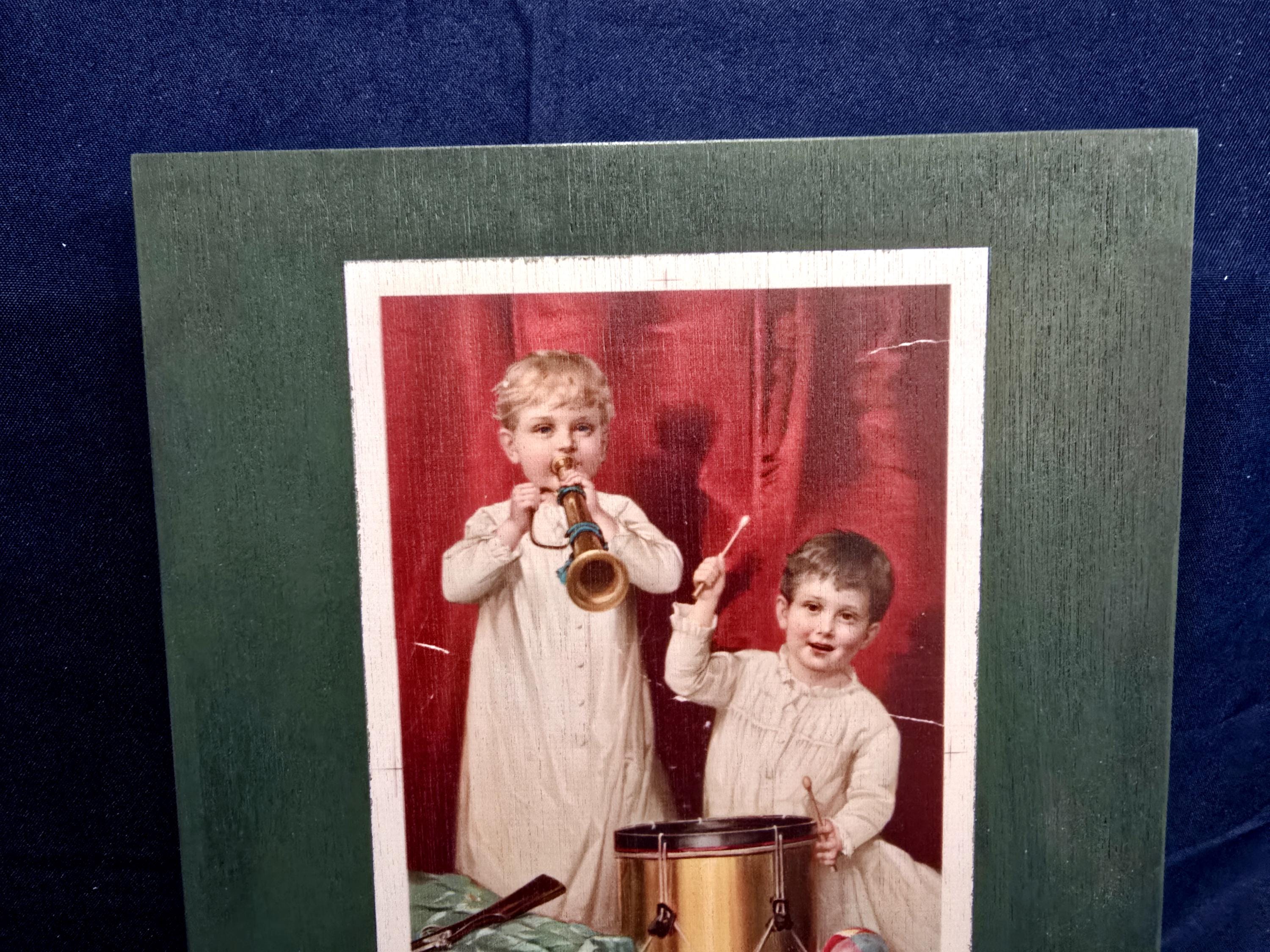 Drummer Boy and Trumpet Player Vintage Holiday Photo Printed on wood Sign for Christmas Display