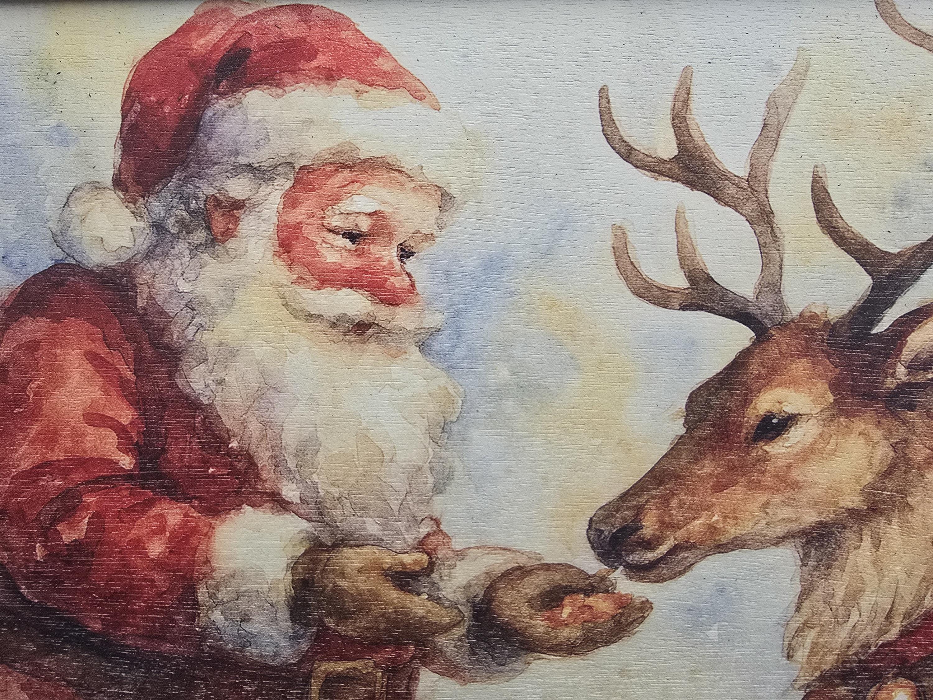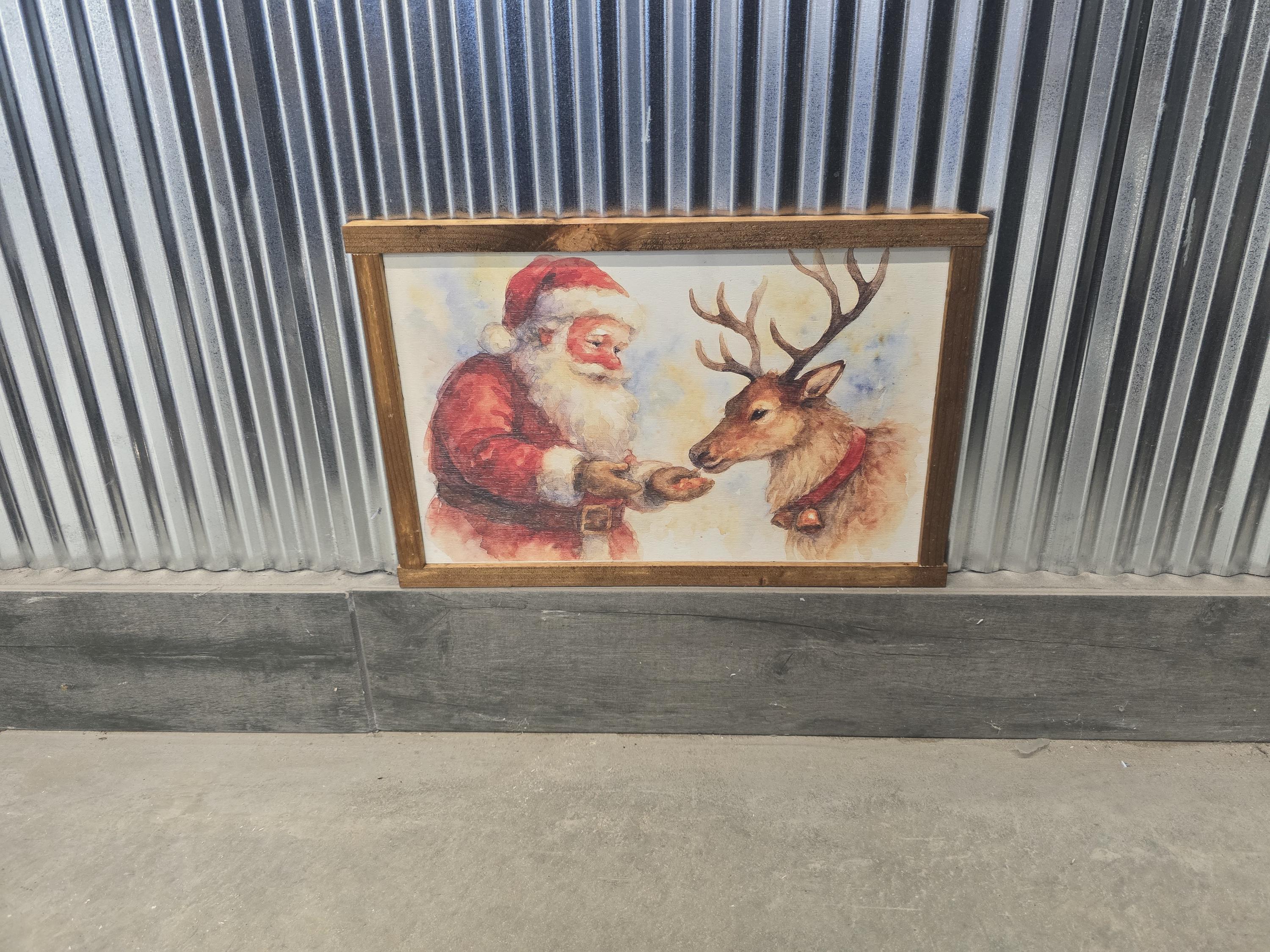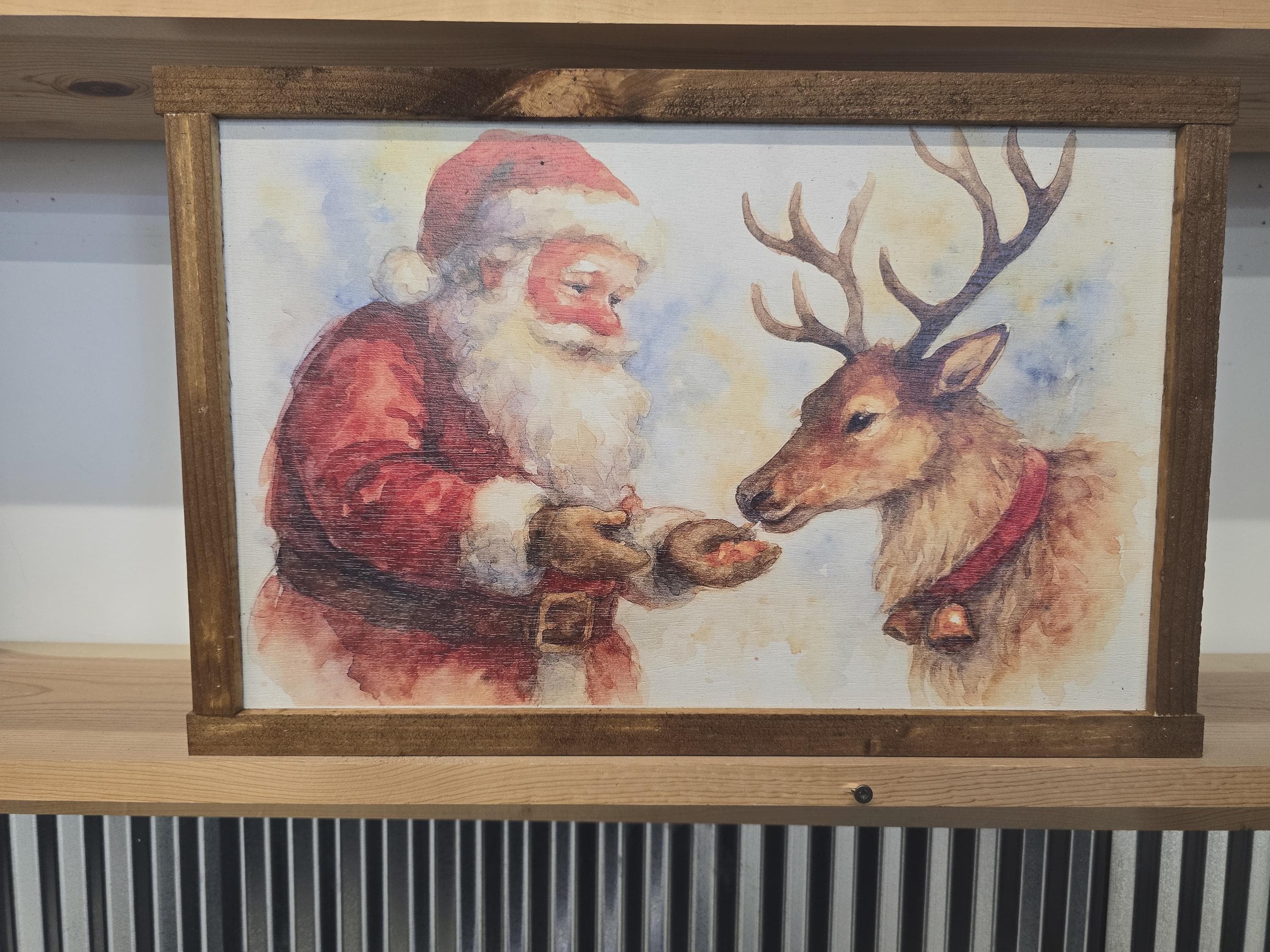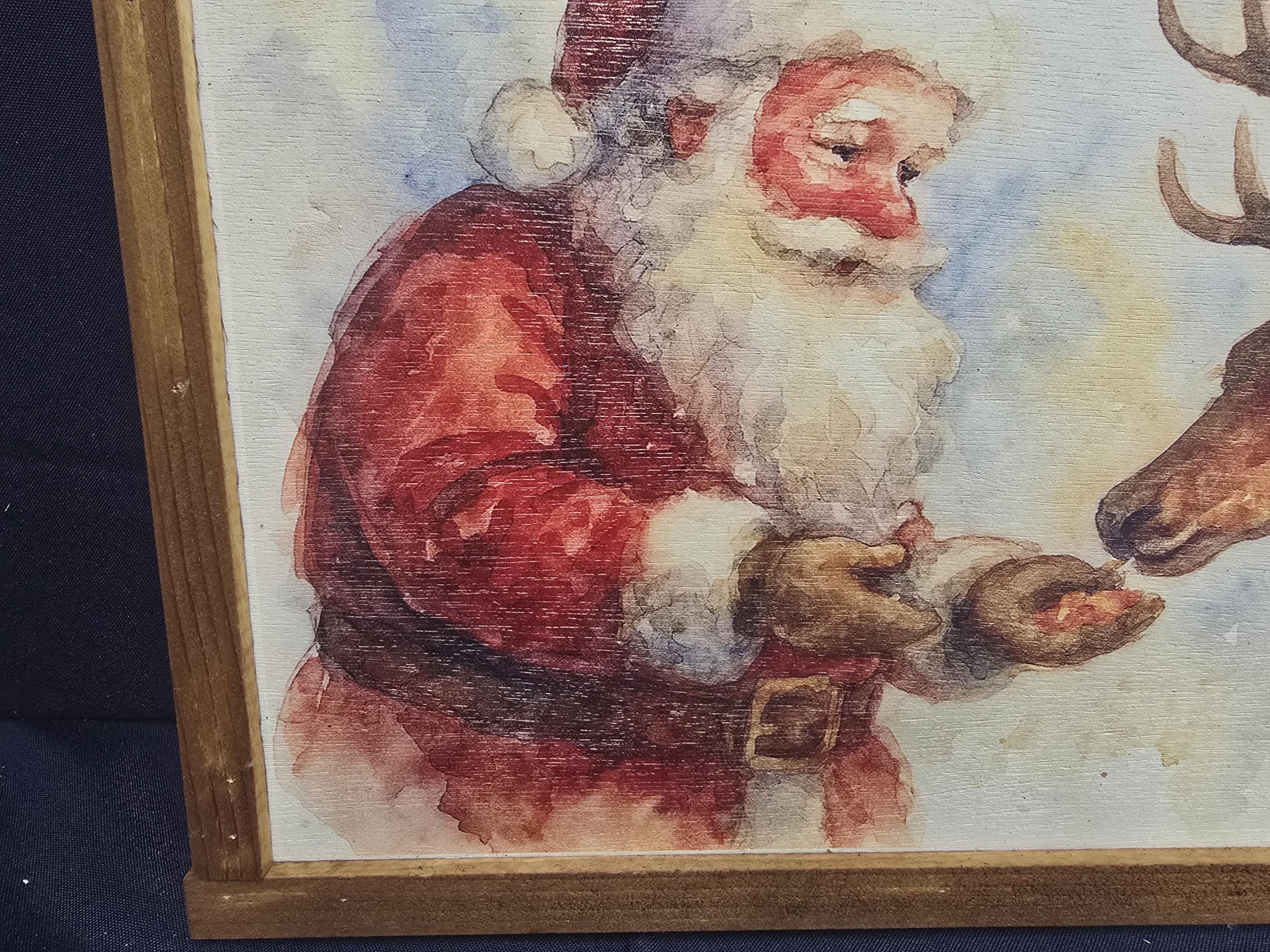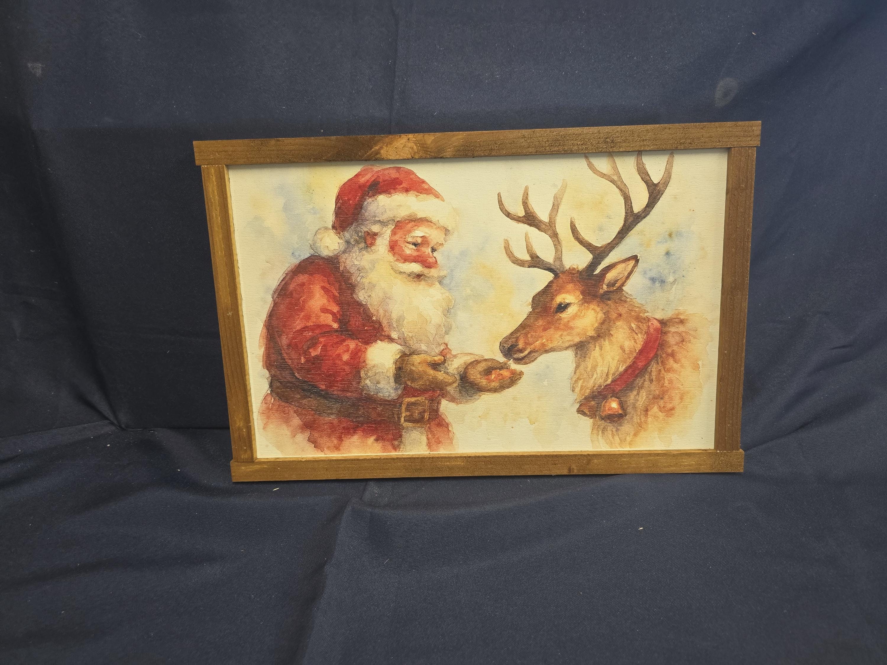 Santa and Reindeer Printed Wood Wall Art Sign with Frame