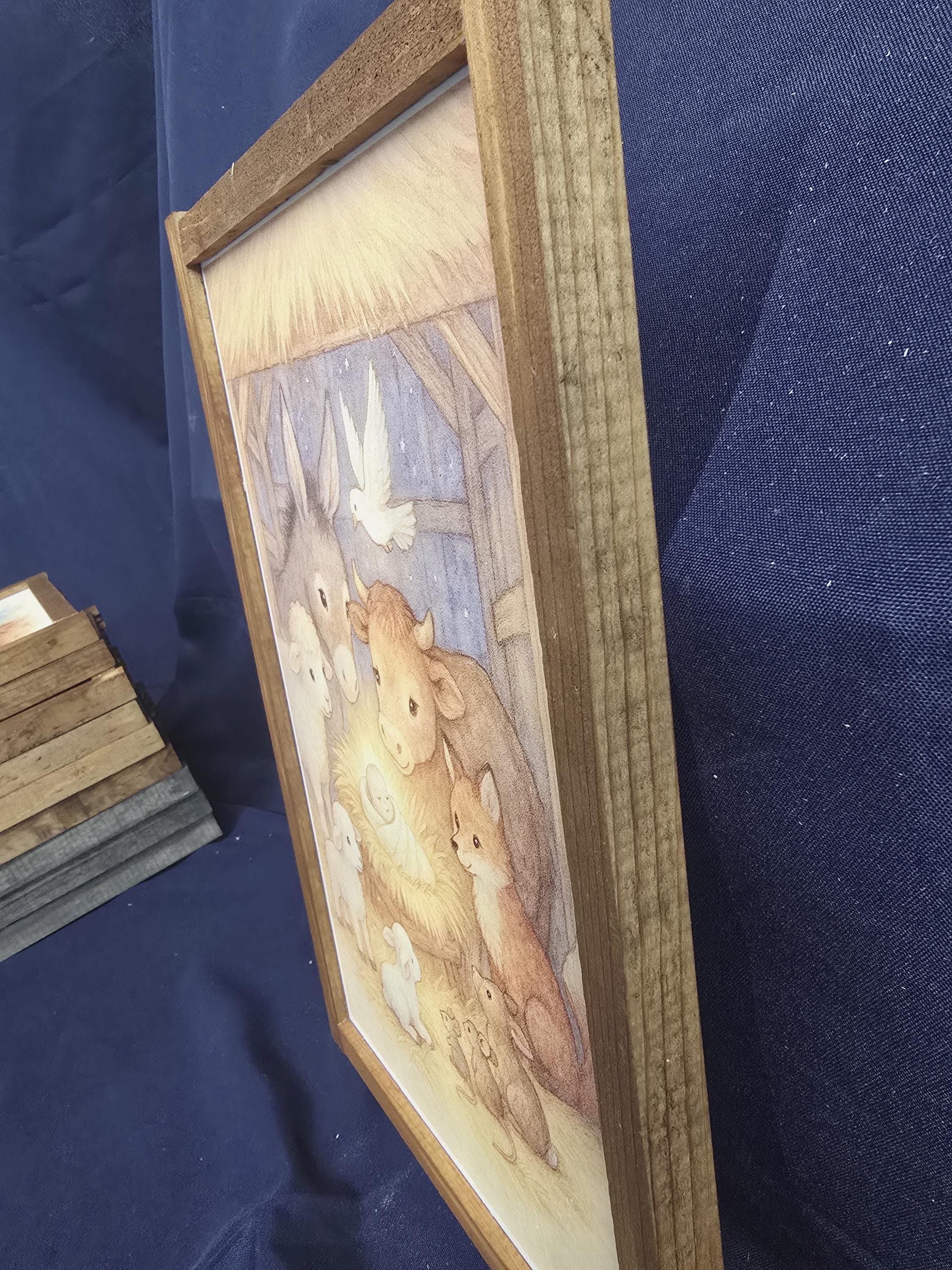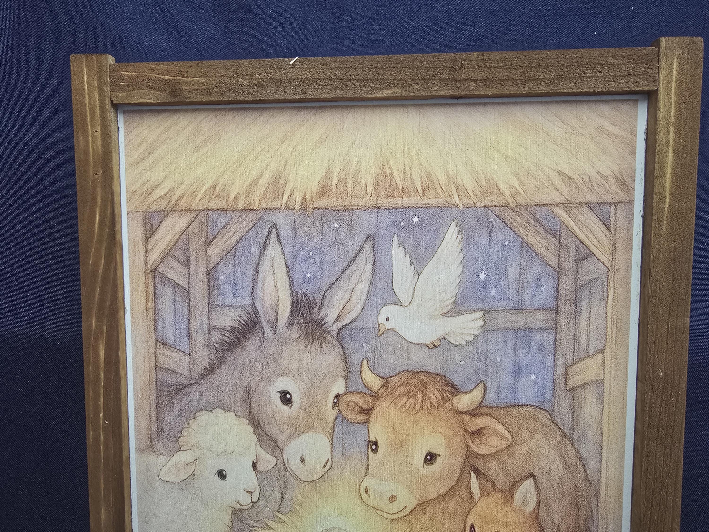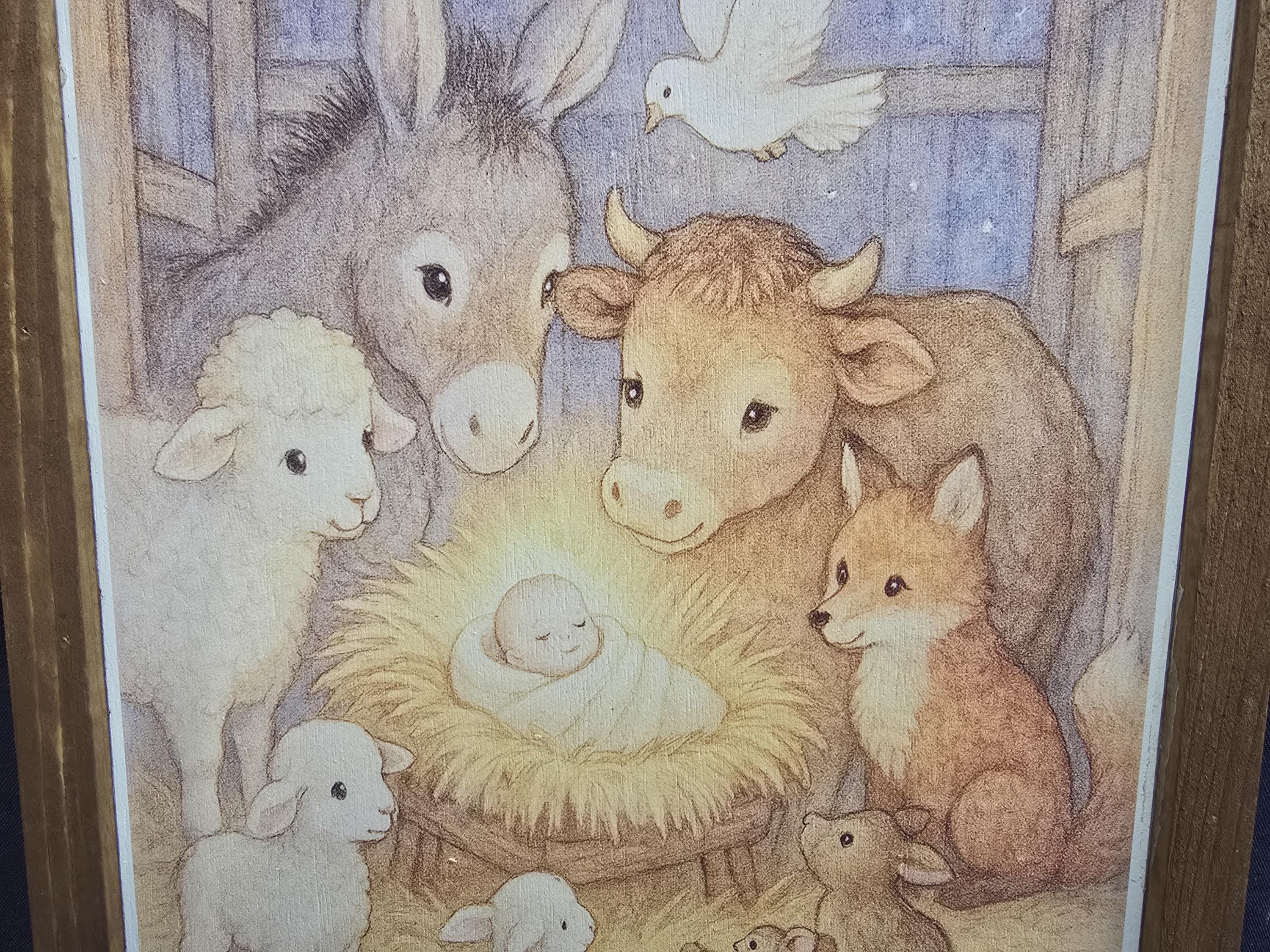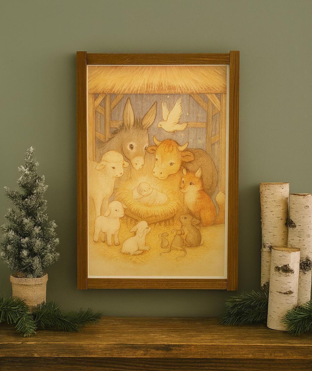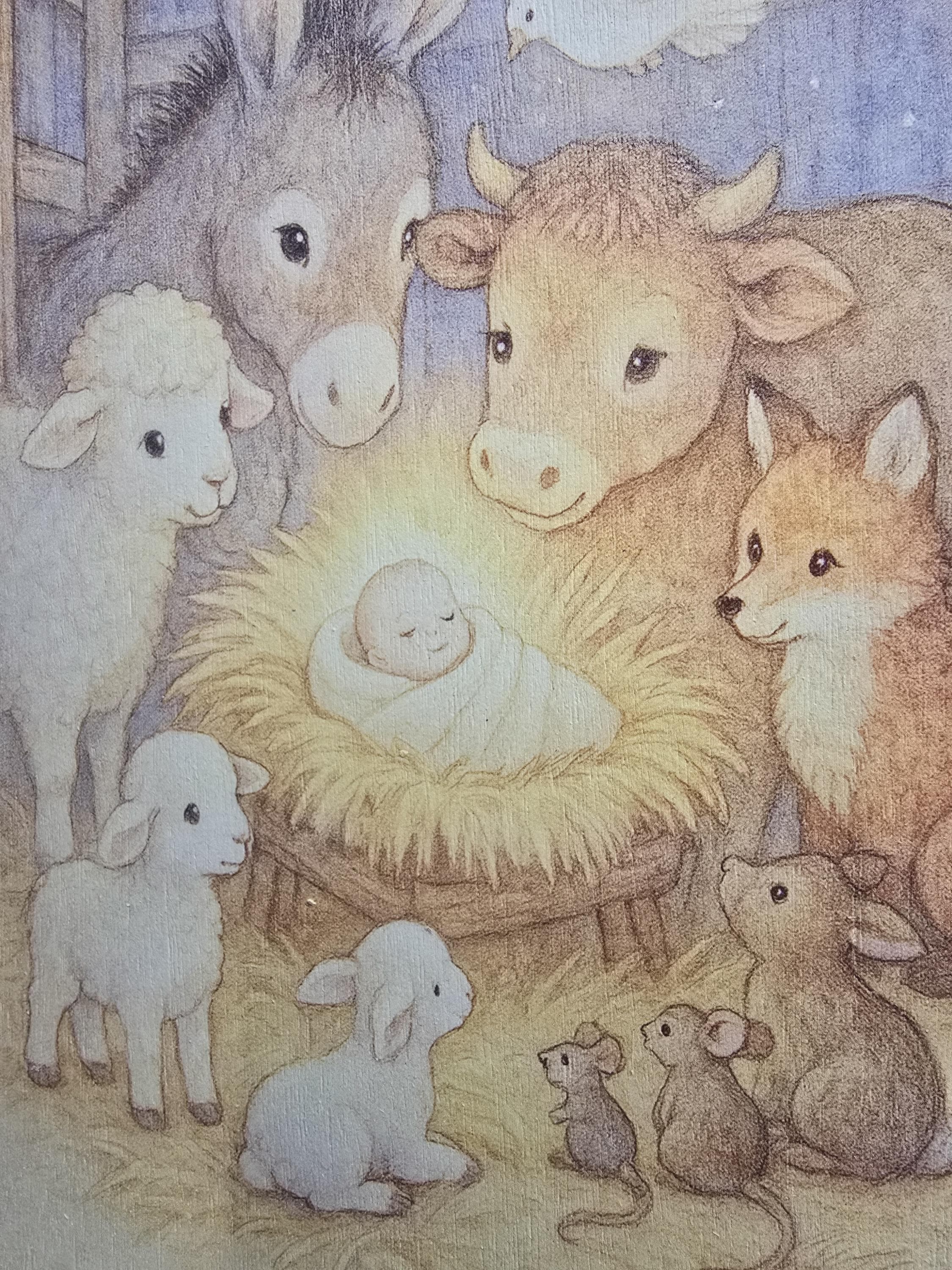 A tender and peaceful nativity scene featuring Baby Jesus resting in the manger, surrounded by gentle farm animals. This softly illustrated artwork captures warmth, love, and quiet reverence, making it a beautiful reminder of the true meaning of Christmas.