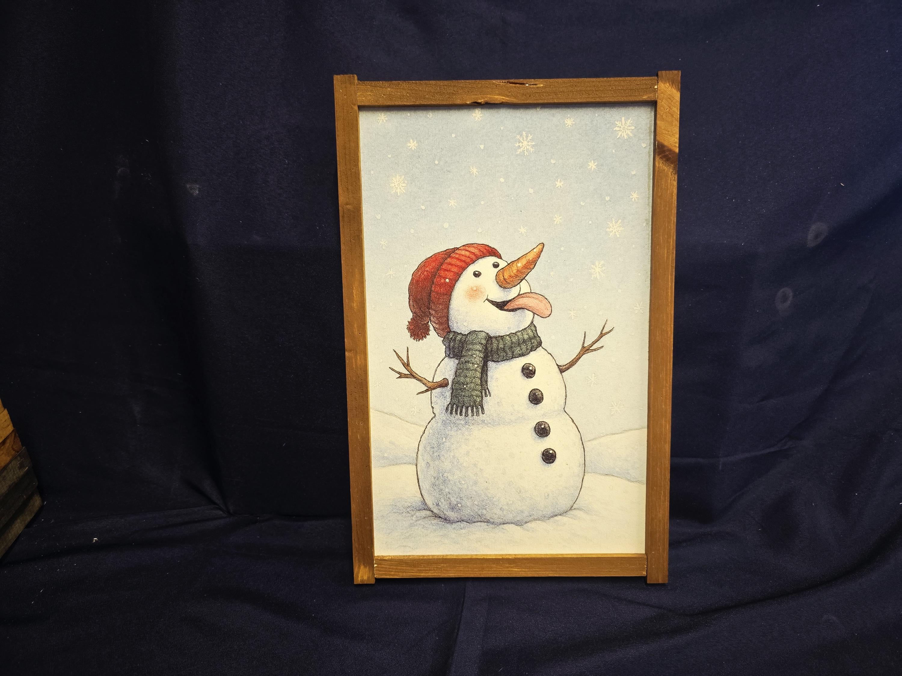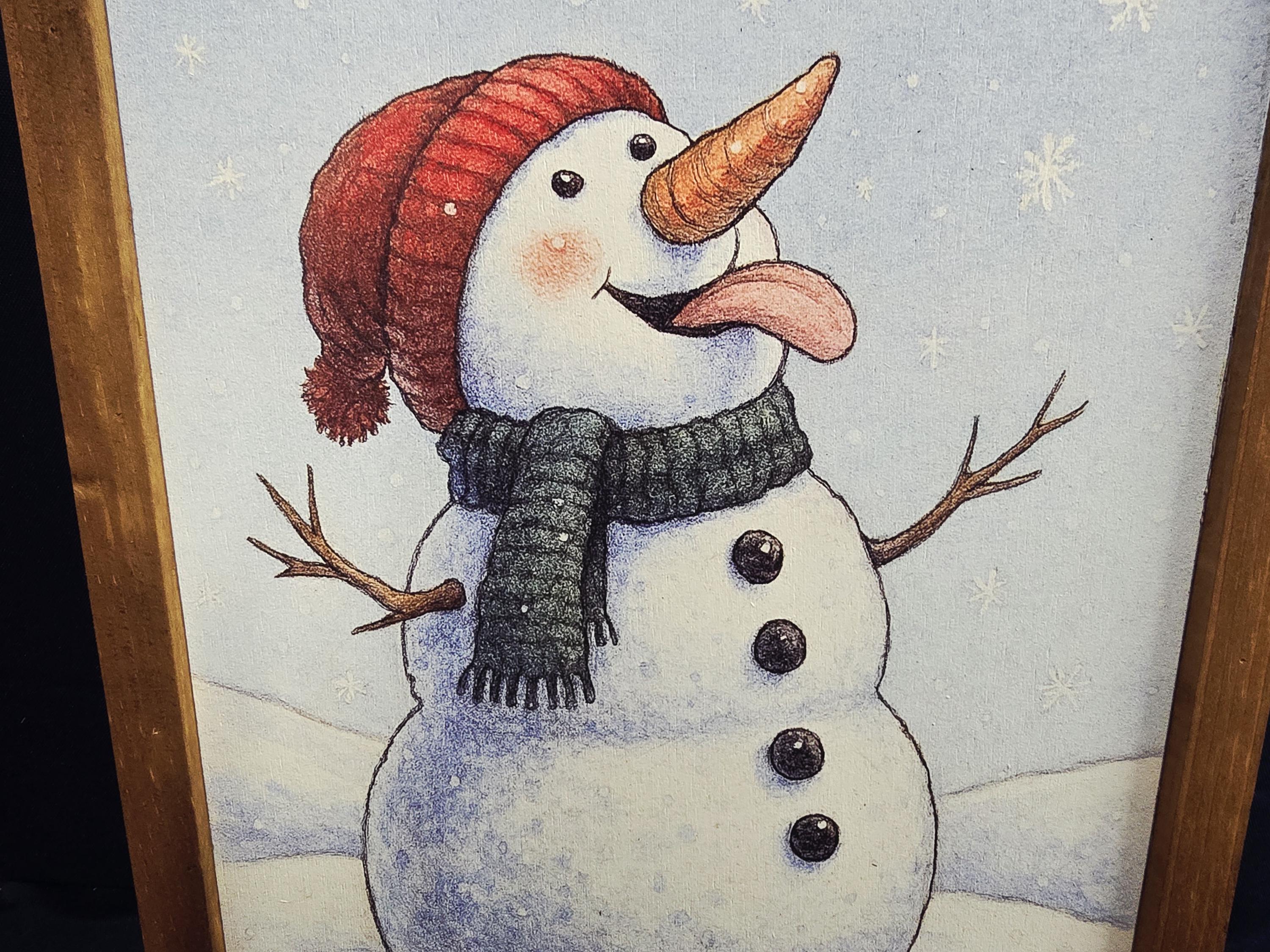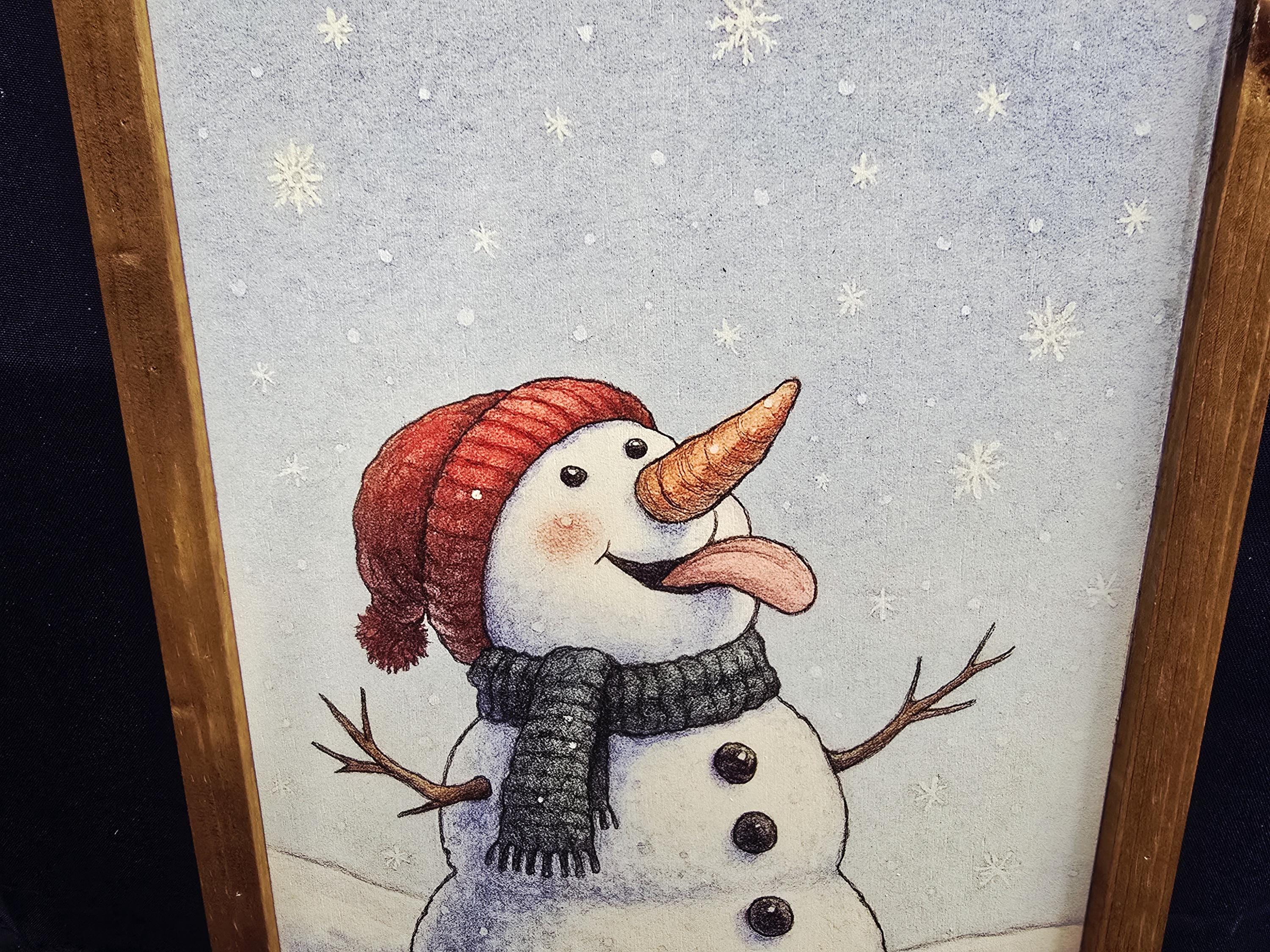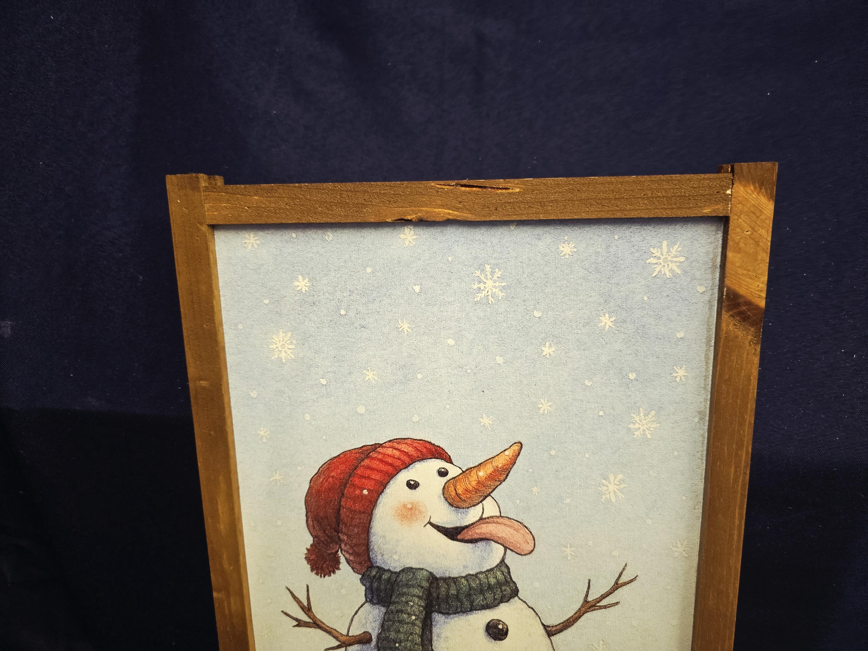 Snowman eating snow cartoon printed on wood sign for holiday decoration and vignette