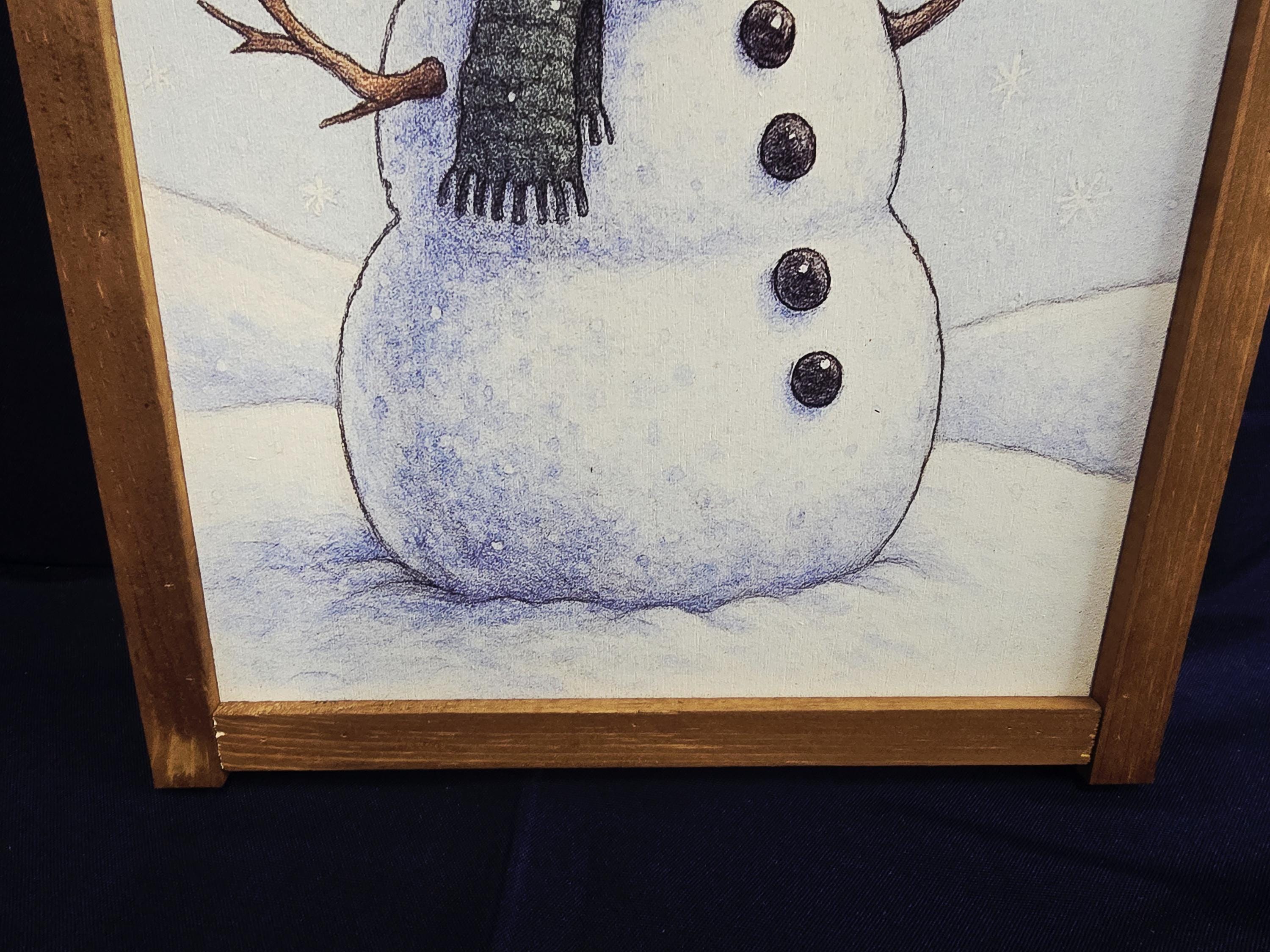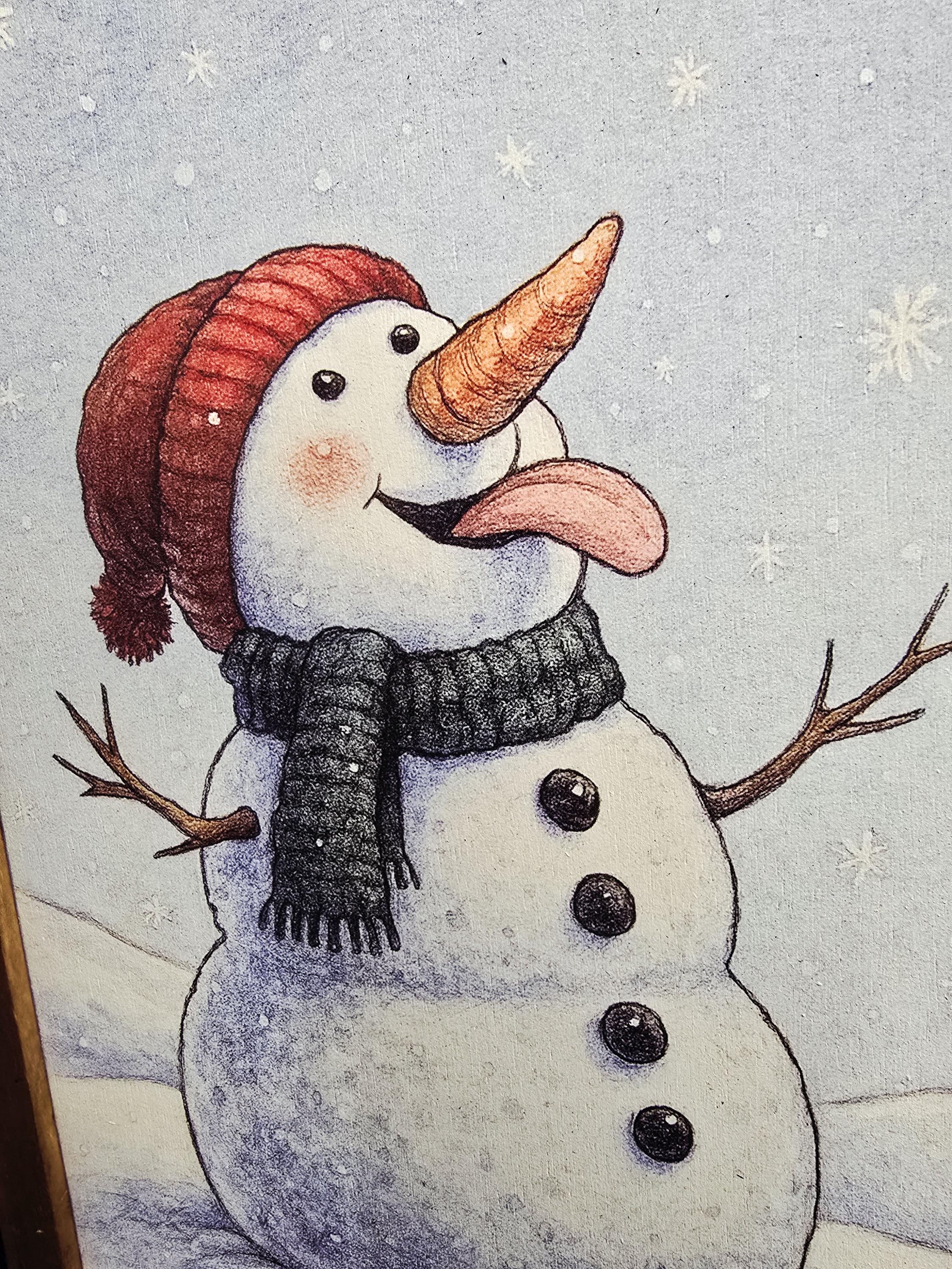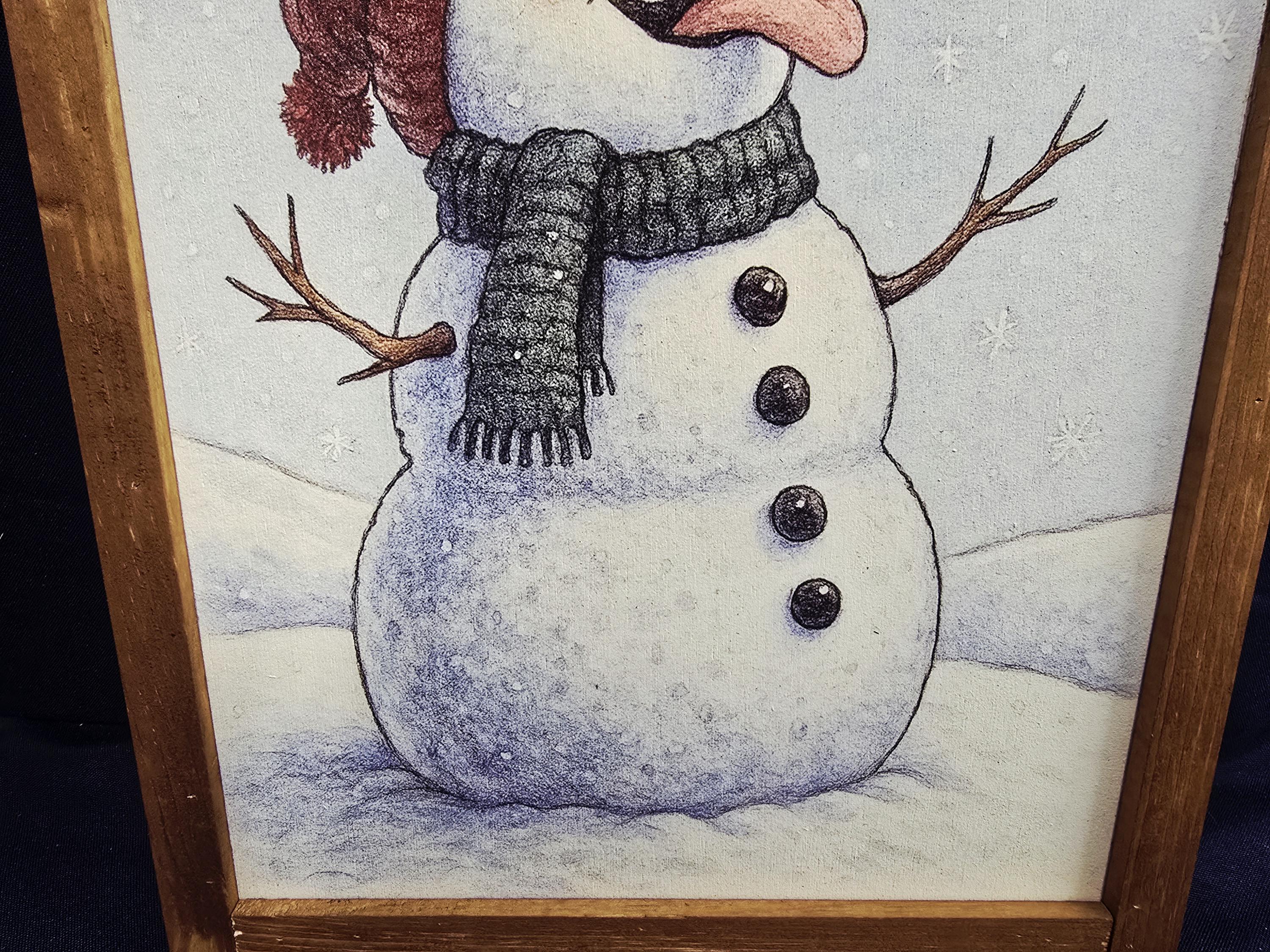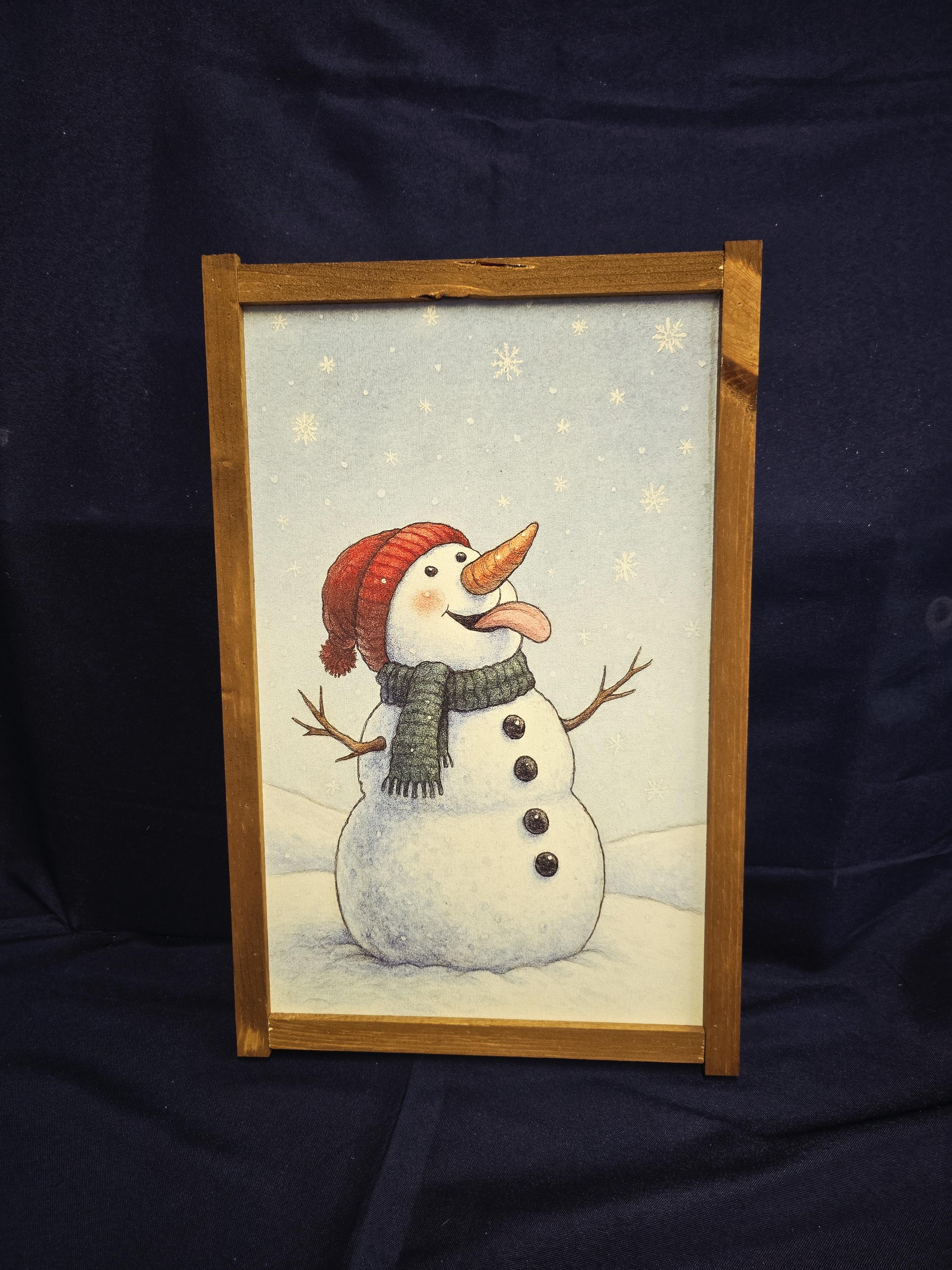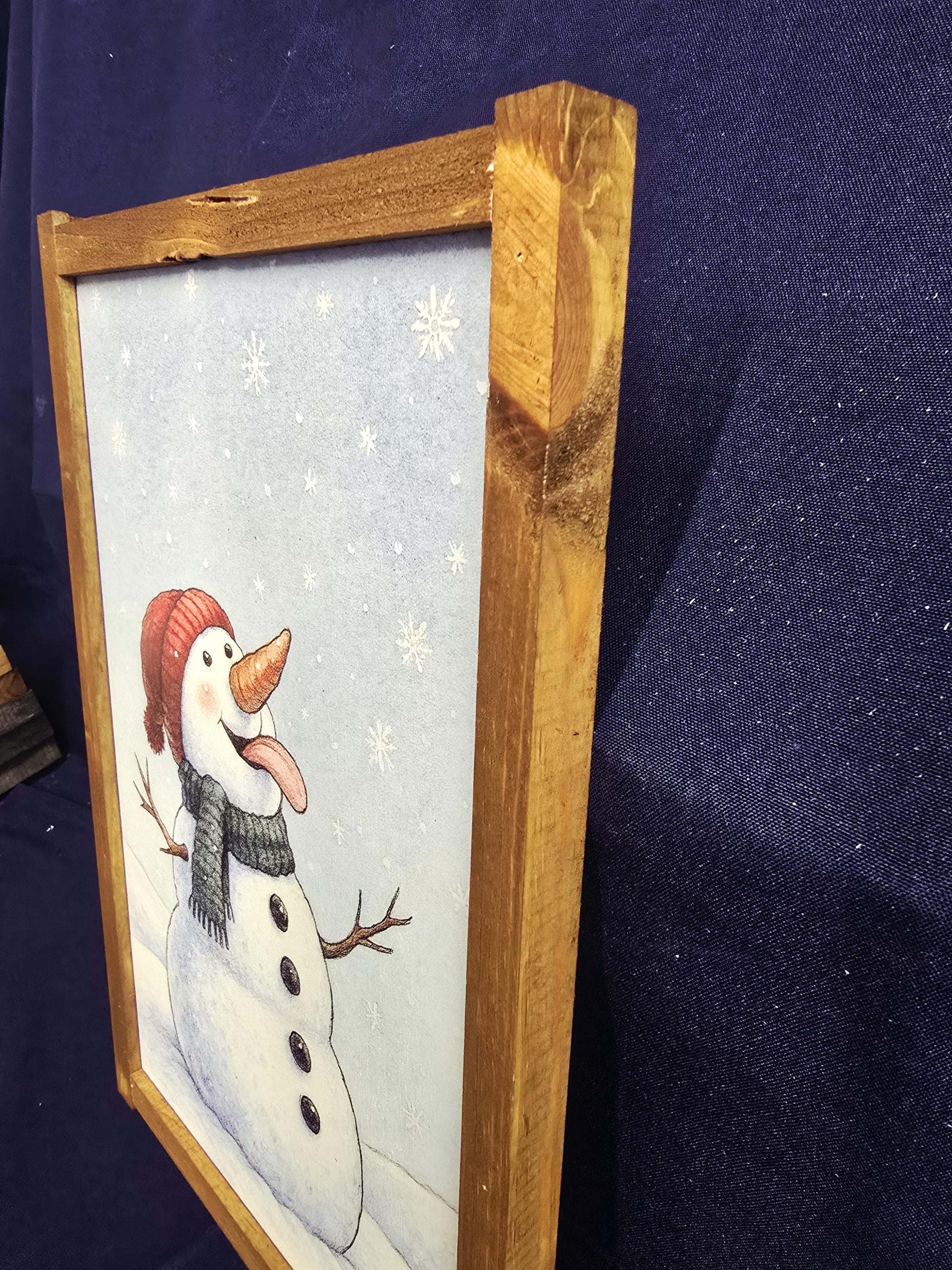 Snowman eating snow cartoon printed on wood sign for holiday decoration and vignette