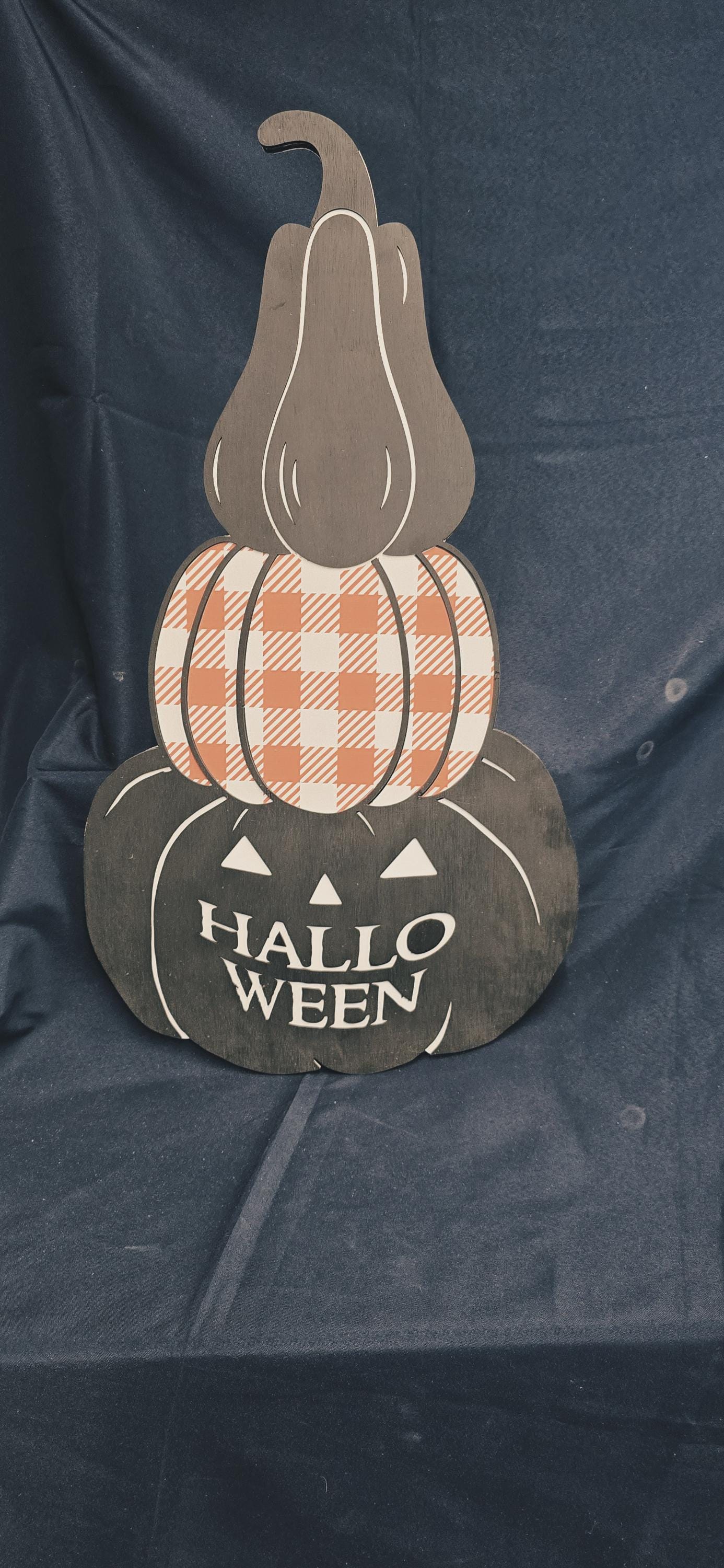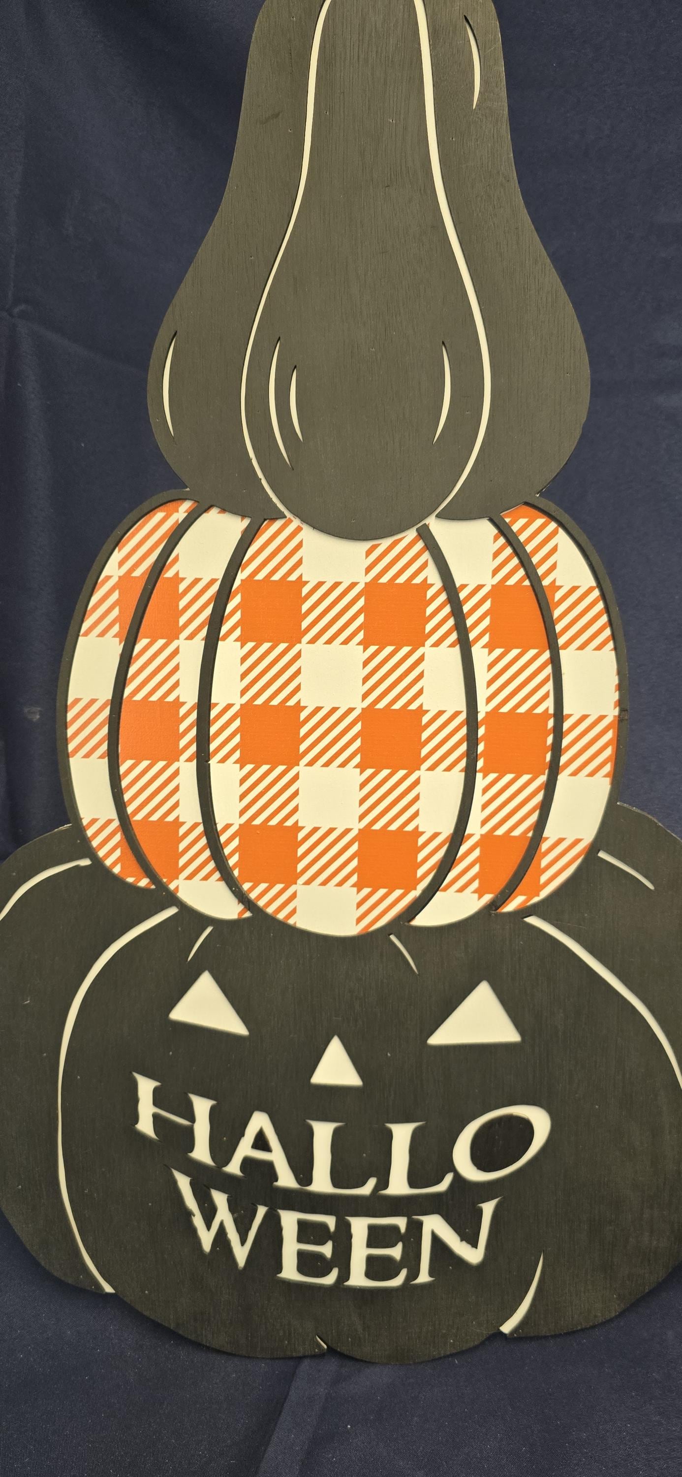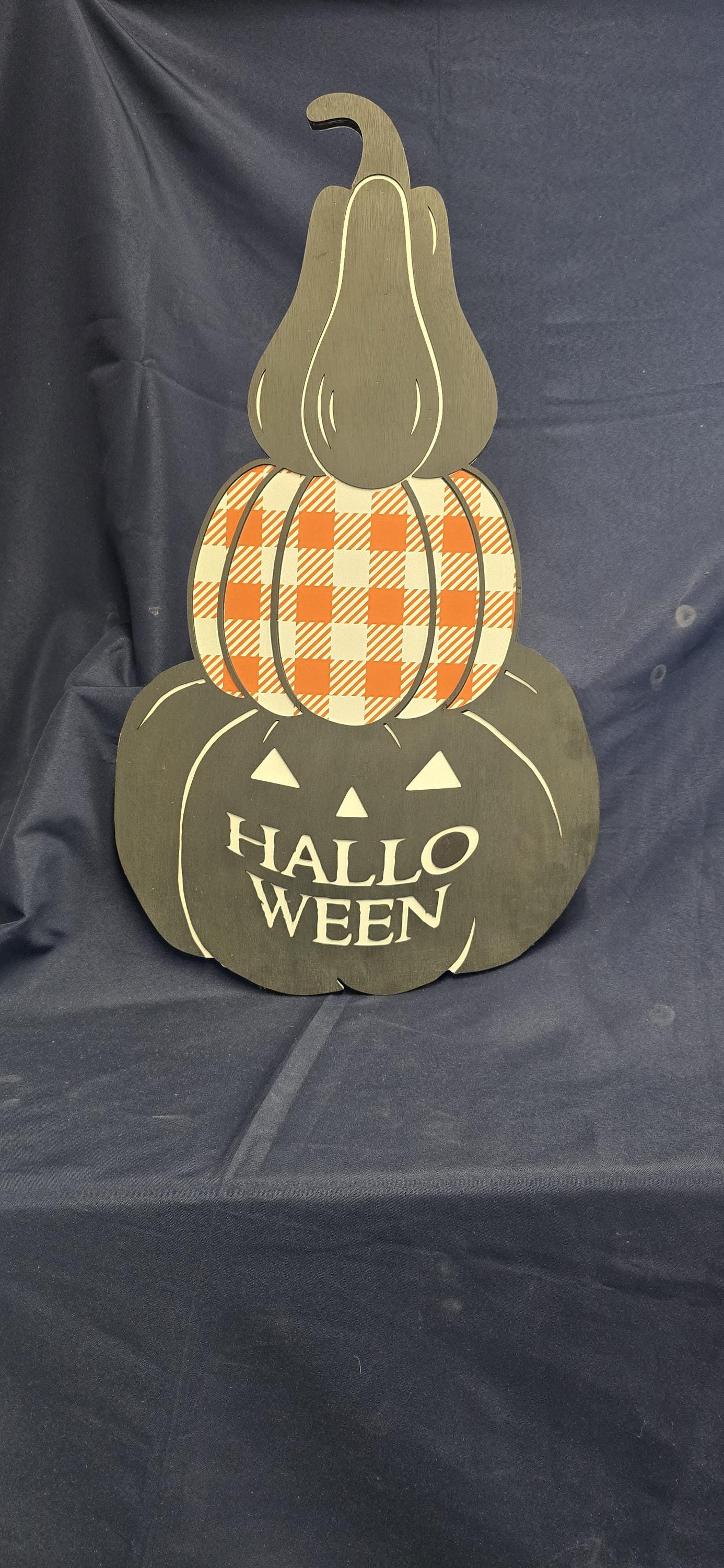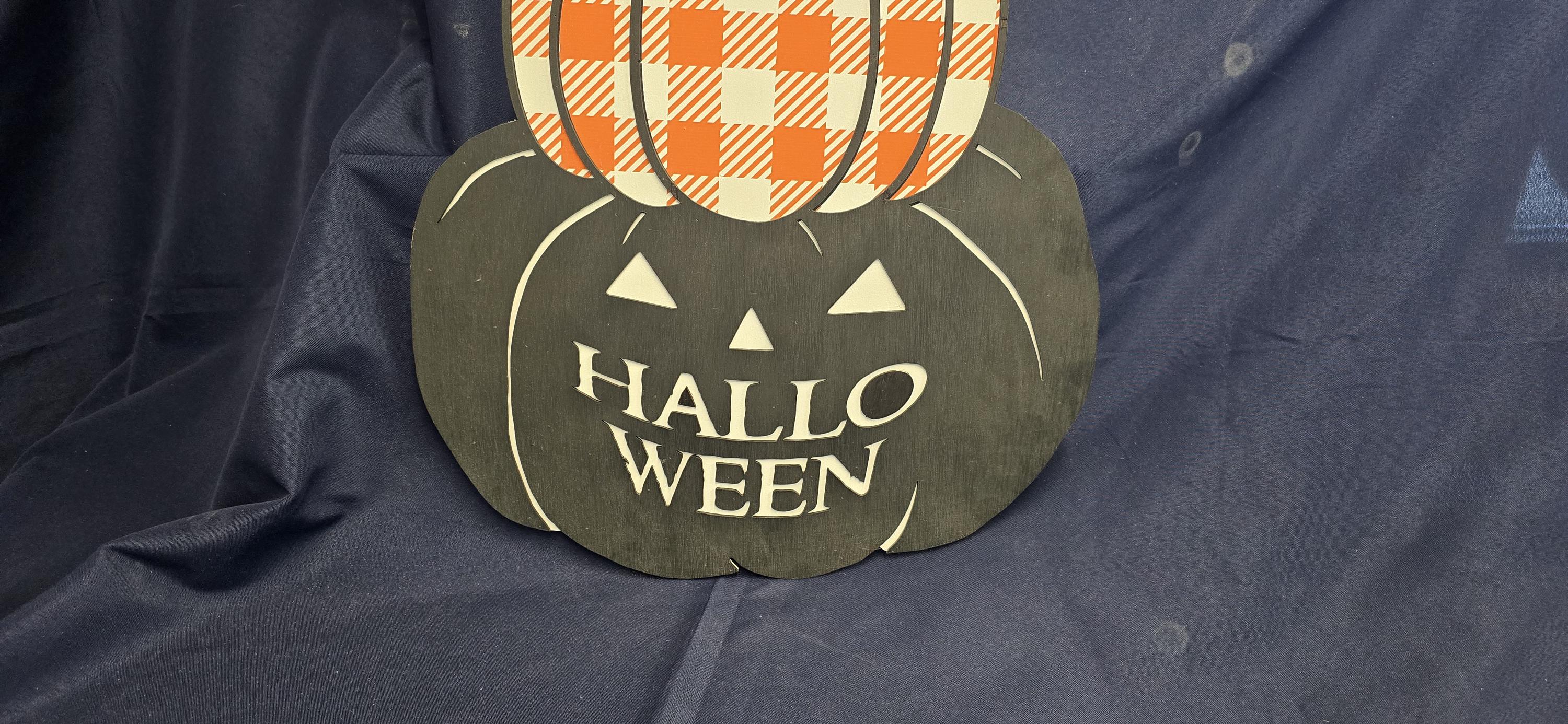 The item we are offering is a wonderful handmade, decorative Halloween sign. We are offering this sign in new sizes, so please review the pull-down menu of the listing! The size is in inches, and it is the overall size of the size, frame included. It is mounted on black painted 3/8 inch plywood with 1/4 inch laser cut plywood letters with printed graphic on the pumpkins.