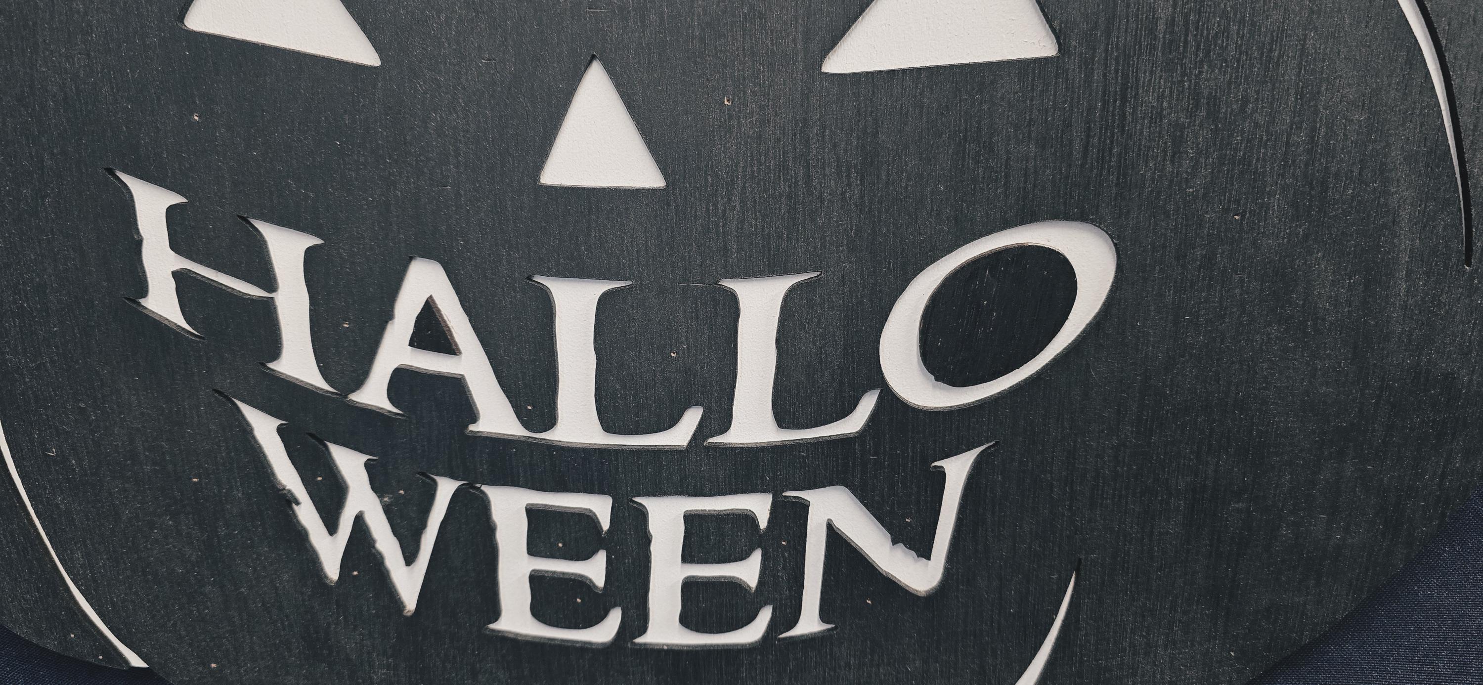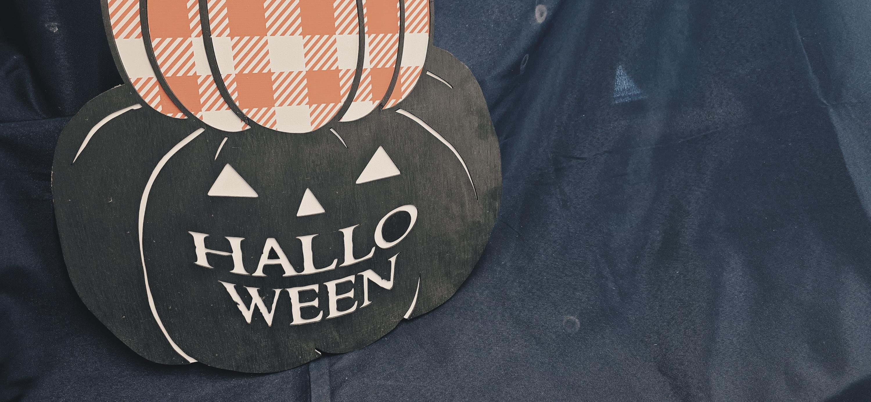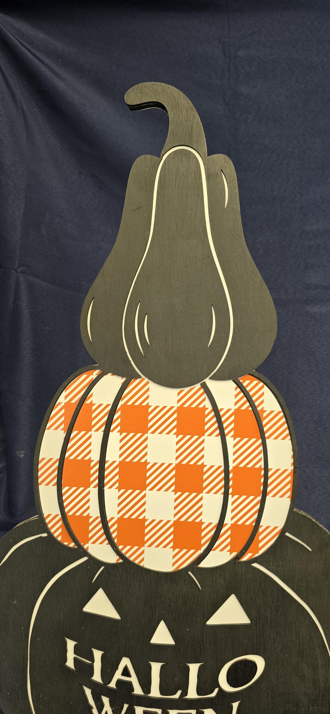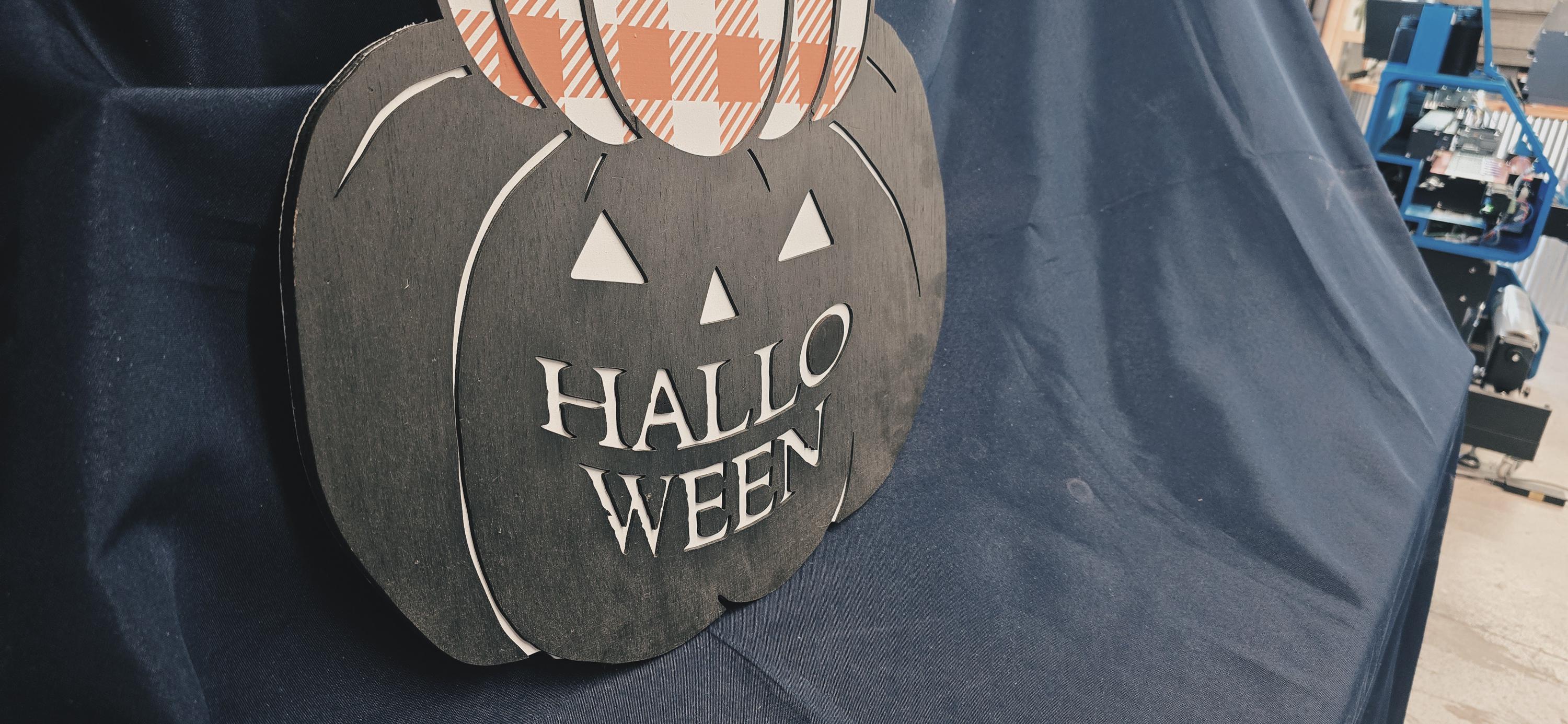 The item we are offering is a wonderful handmade, decorative Halloween sign. We are offering this sign in new sizes, so please review the pull-down menu of the listing! The size is in inches, and it is the overall size of the size, frame included. It is mounted on black painted 3/8 inch plywood with 1/4 inch laser cut plywood letters with printed graphic on the pumpkins.