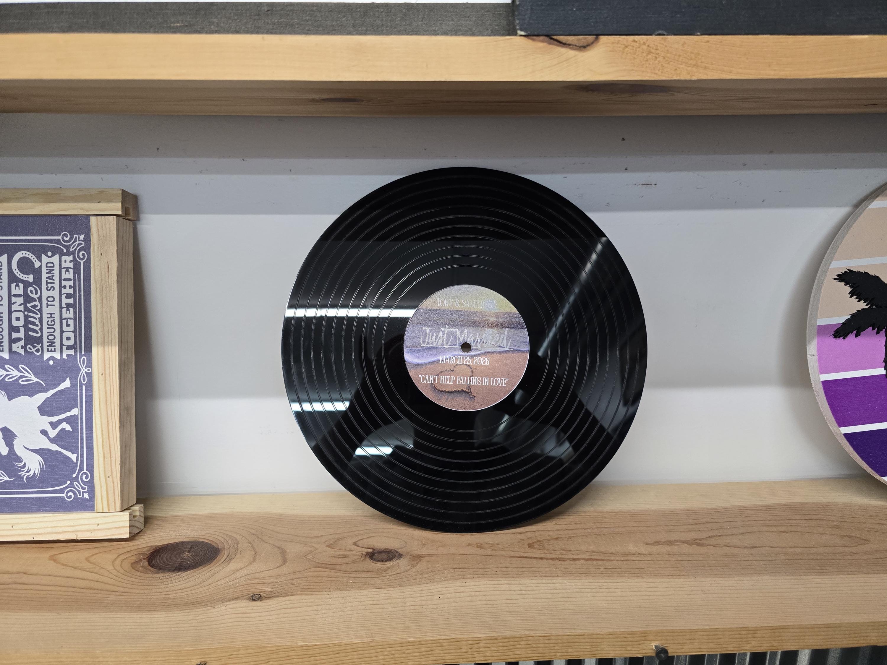 This listing is showcasing our acrylic vinyl record inspired wedding keepsake sign. The size pictured is 12”. Our acrylic sign is 1/8 inches thick and is printed with high quality outdoor weatherproof ink that is fadeproof and the lines are engraved into the acrylic.