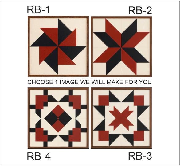 Bring timeless Americana charm to your space with this set of four faux-framed barn quilt blocks, each printed directly onto durable white PVC siding. Featuring bold geometric patterns in deep red, black, and cream, these designs evoke traditional quilt motifs with a modern twist. The printed faux wood frame and vertical grain texture give the illusion of handcrafted depth β all on a single flat panel.