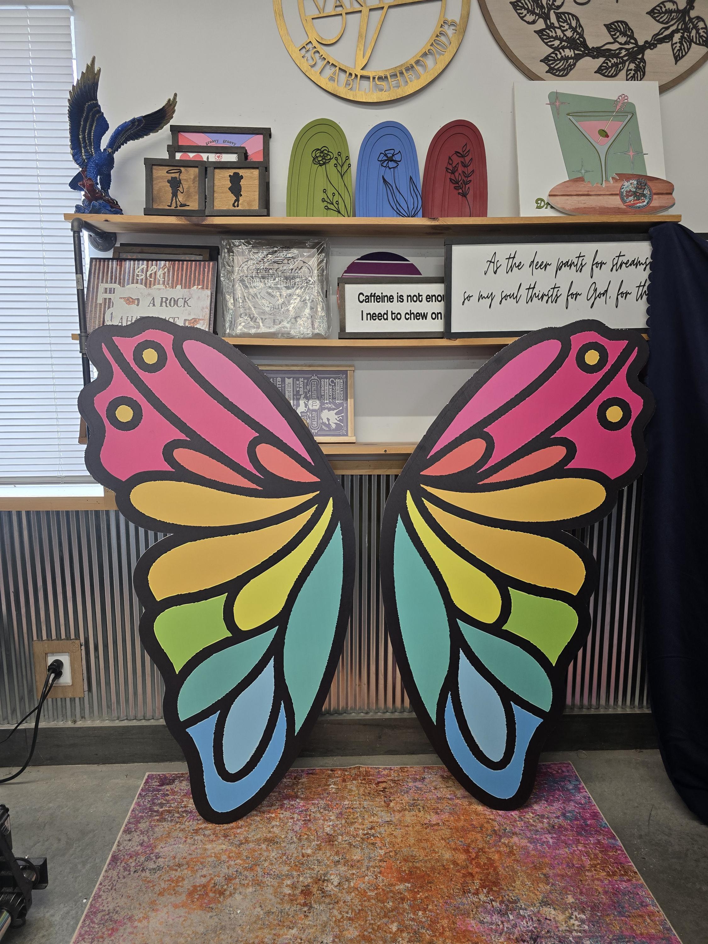 Add playful charm to your business setup with these butterfly wings cutouts! Crafted from weatherproof PVC for lasting durability indoors or out printed with high quality weatherproof ink. With its cheerful design and bright colors, this piece is perfect for porches, storefronts, or party scenes.