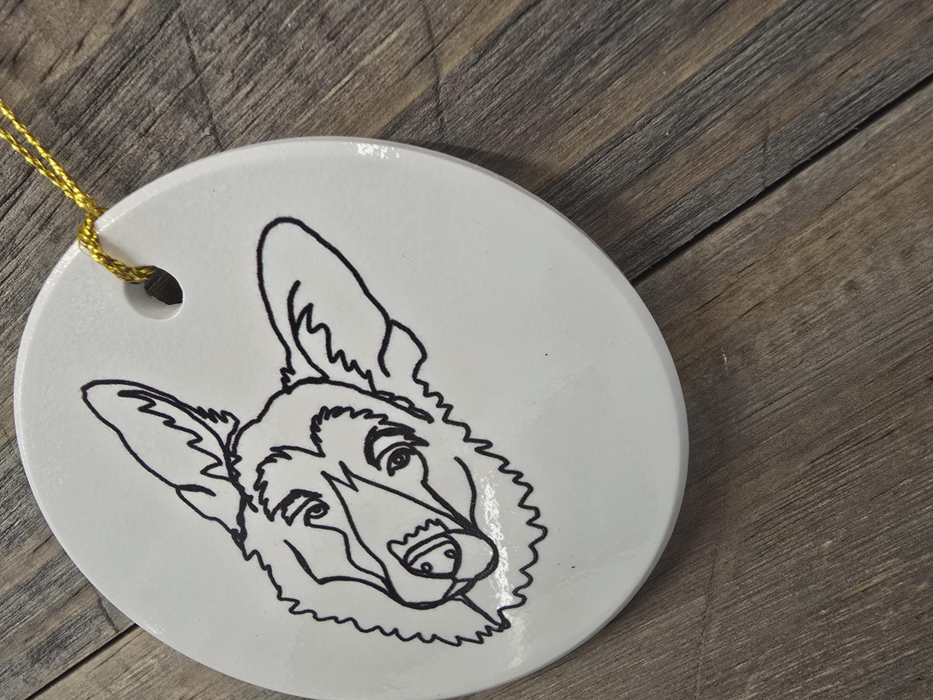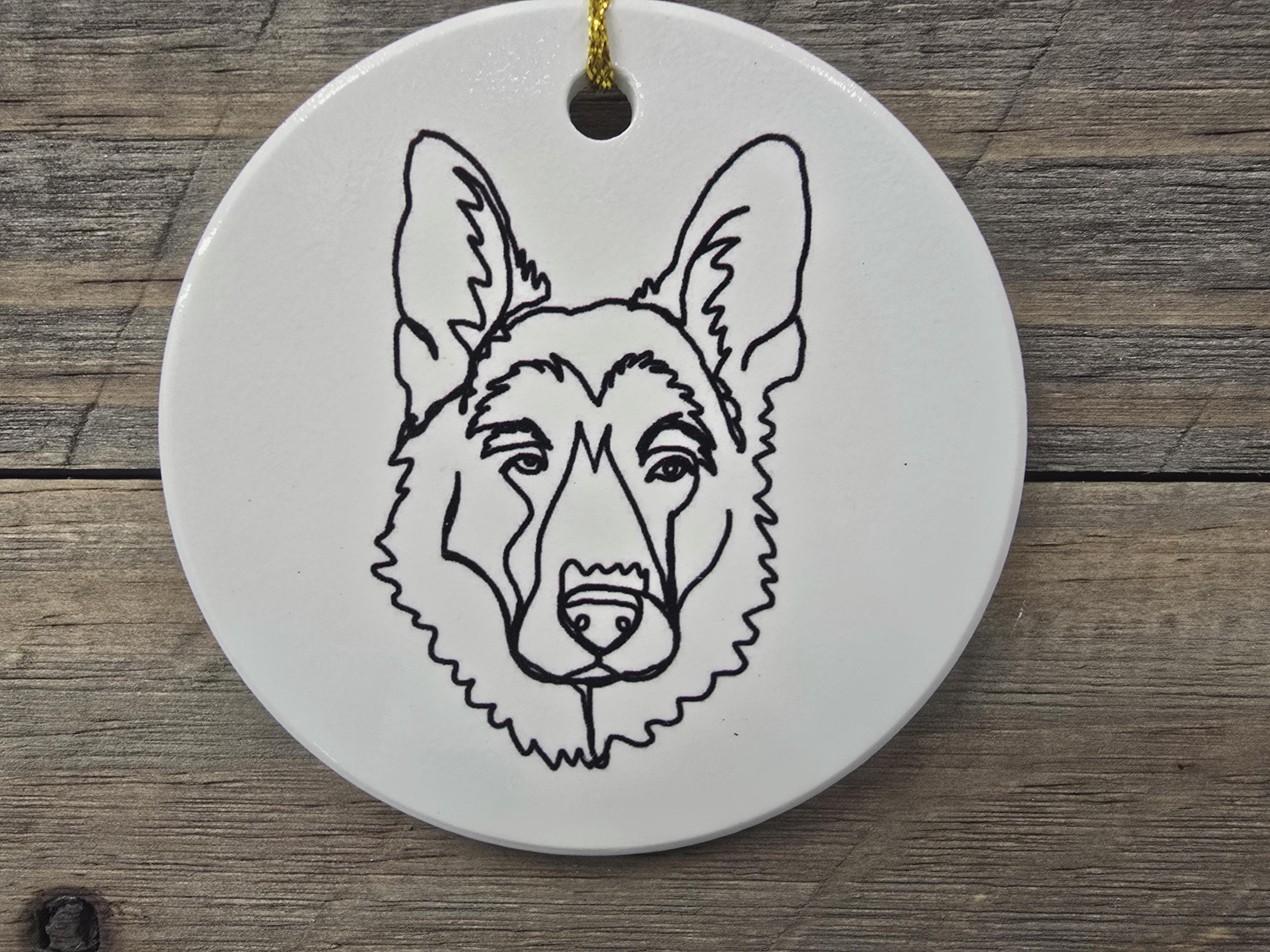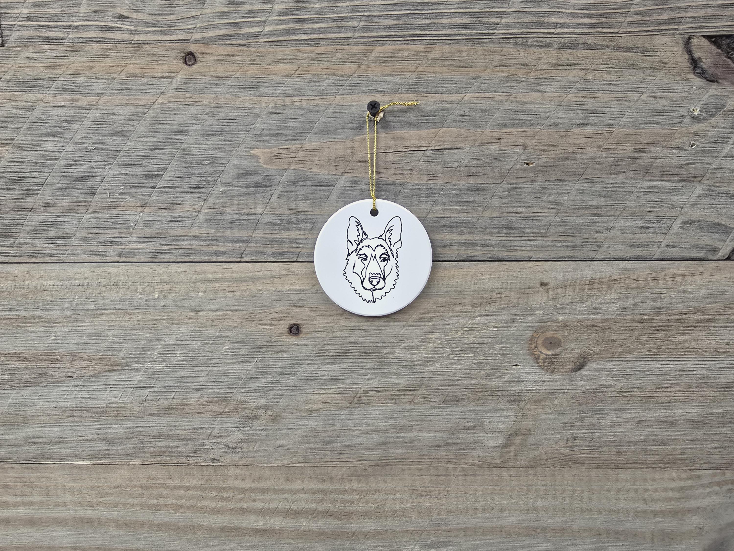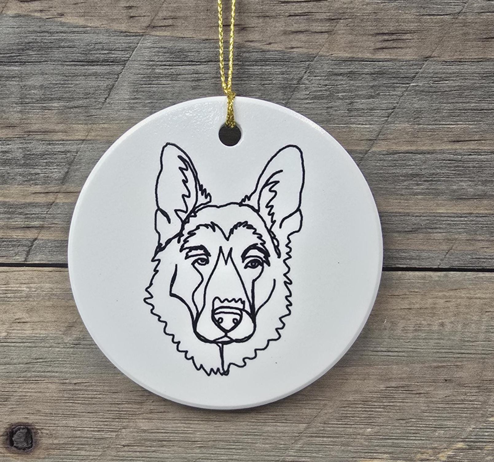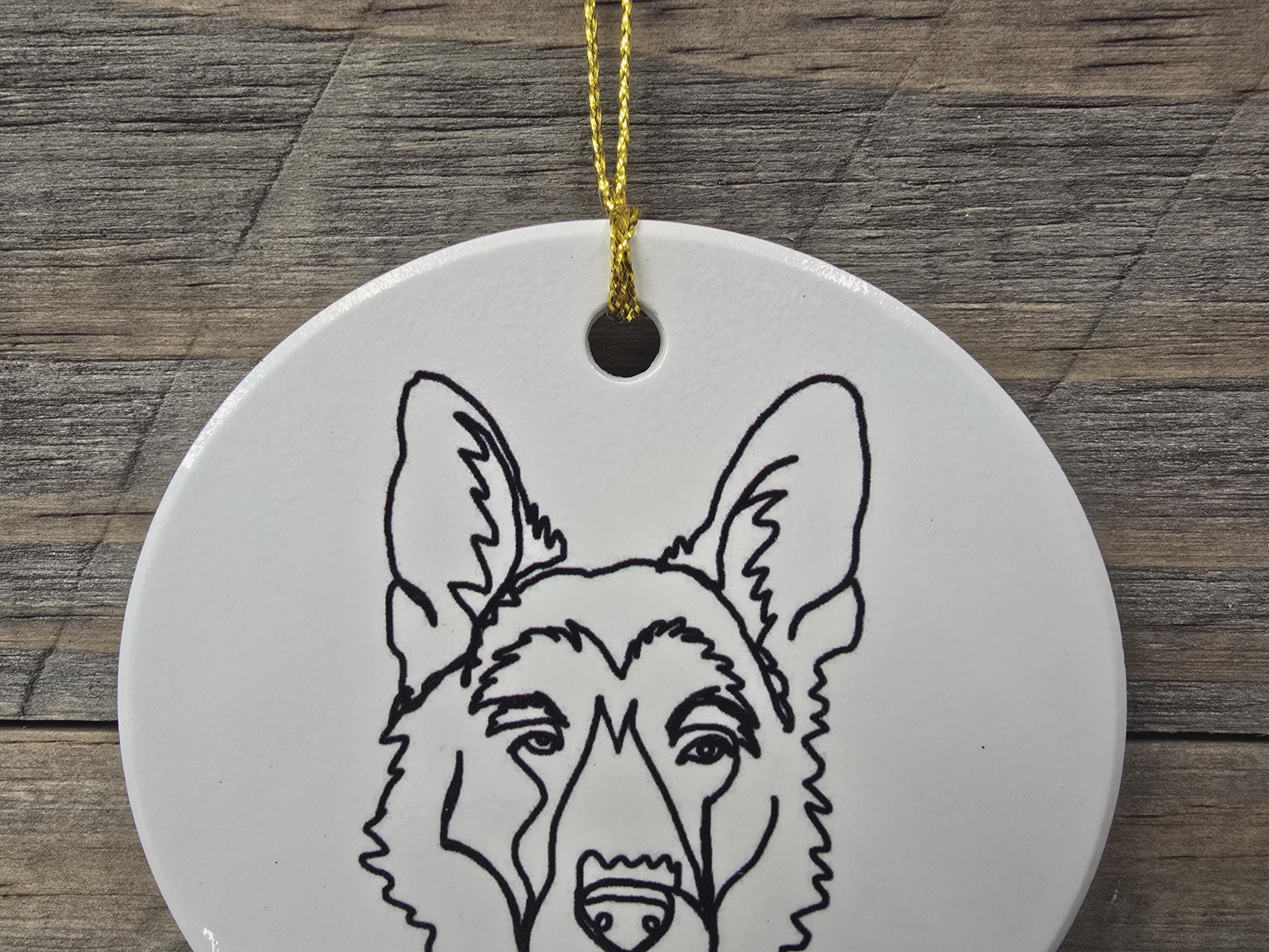 Celebrate your love for German Shepherds with this elegant ceramic ornament featuring a minimalist line drawing of the breed’s iconic face. Handcrafted with a glossy white finish and accented by a gold string for easy hanging, this ornament is perfect for pet lovers, holiday decor, or year-round display. Its clean design and timeless charm make it a thoughtful gift for dog owners and breed enthusiasts alike.