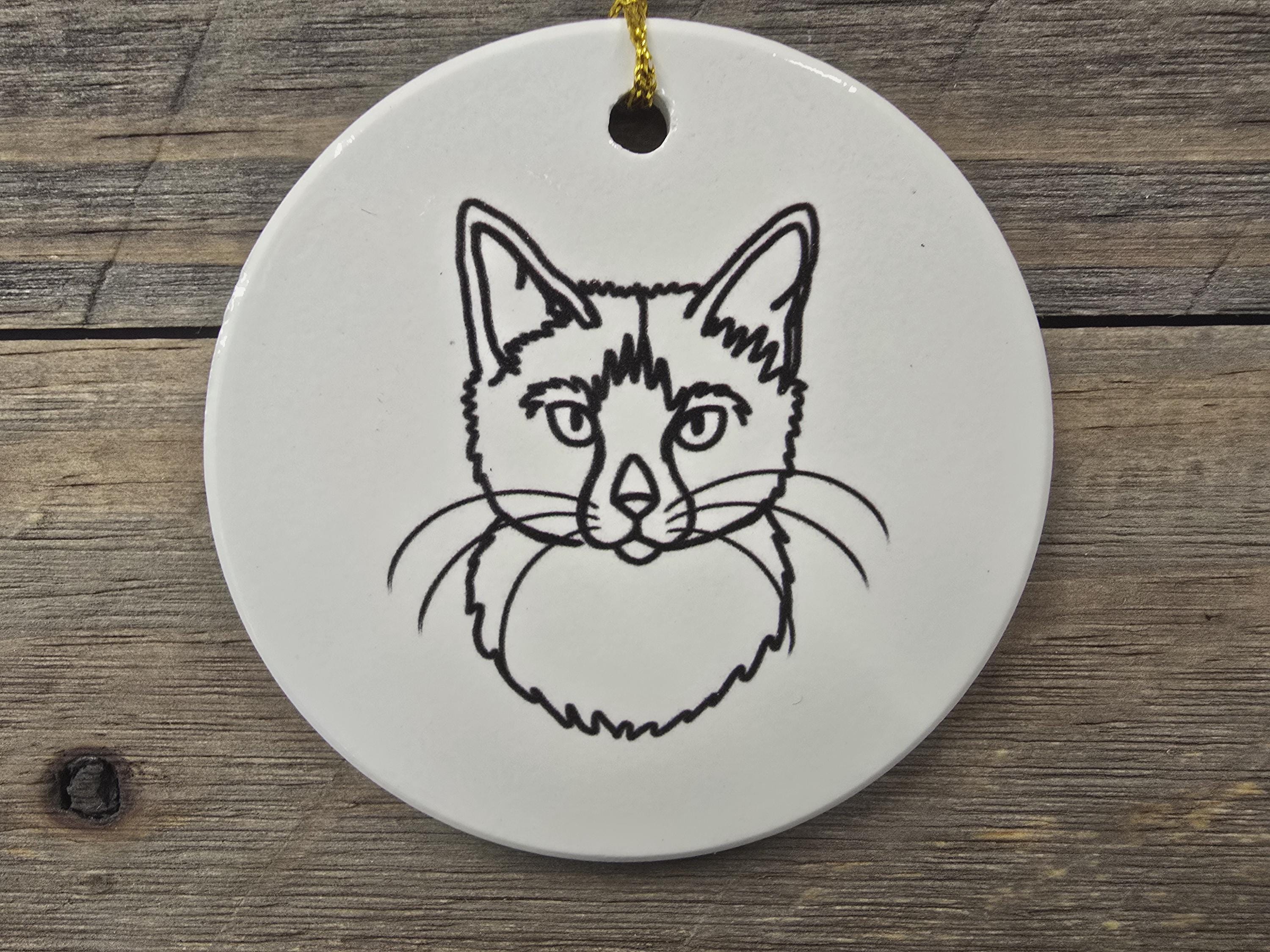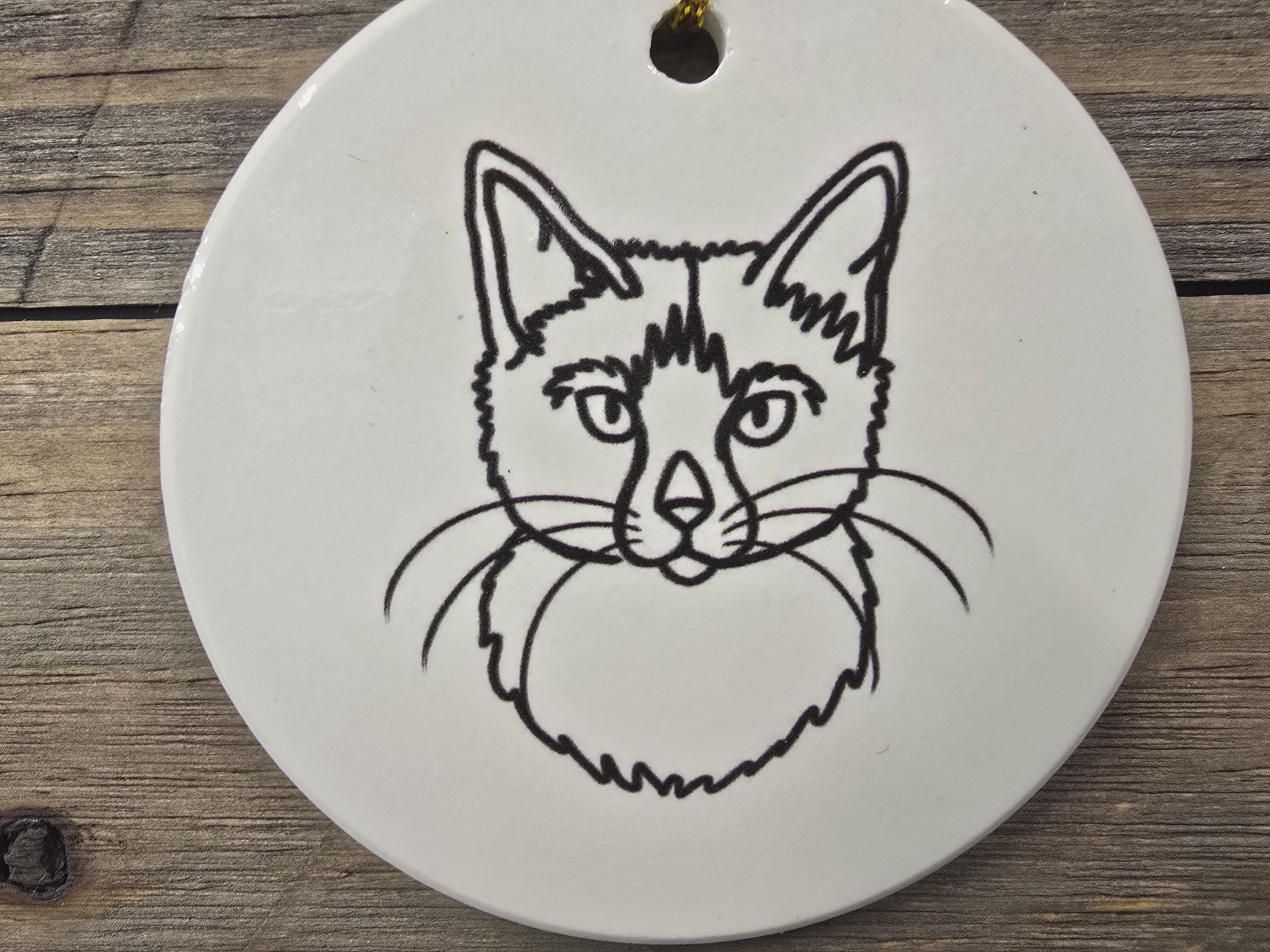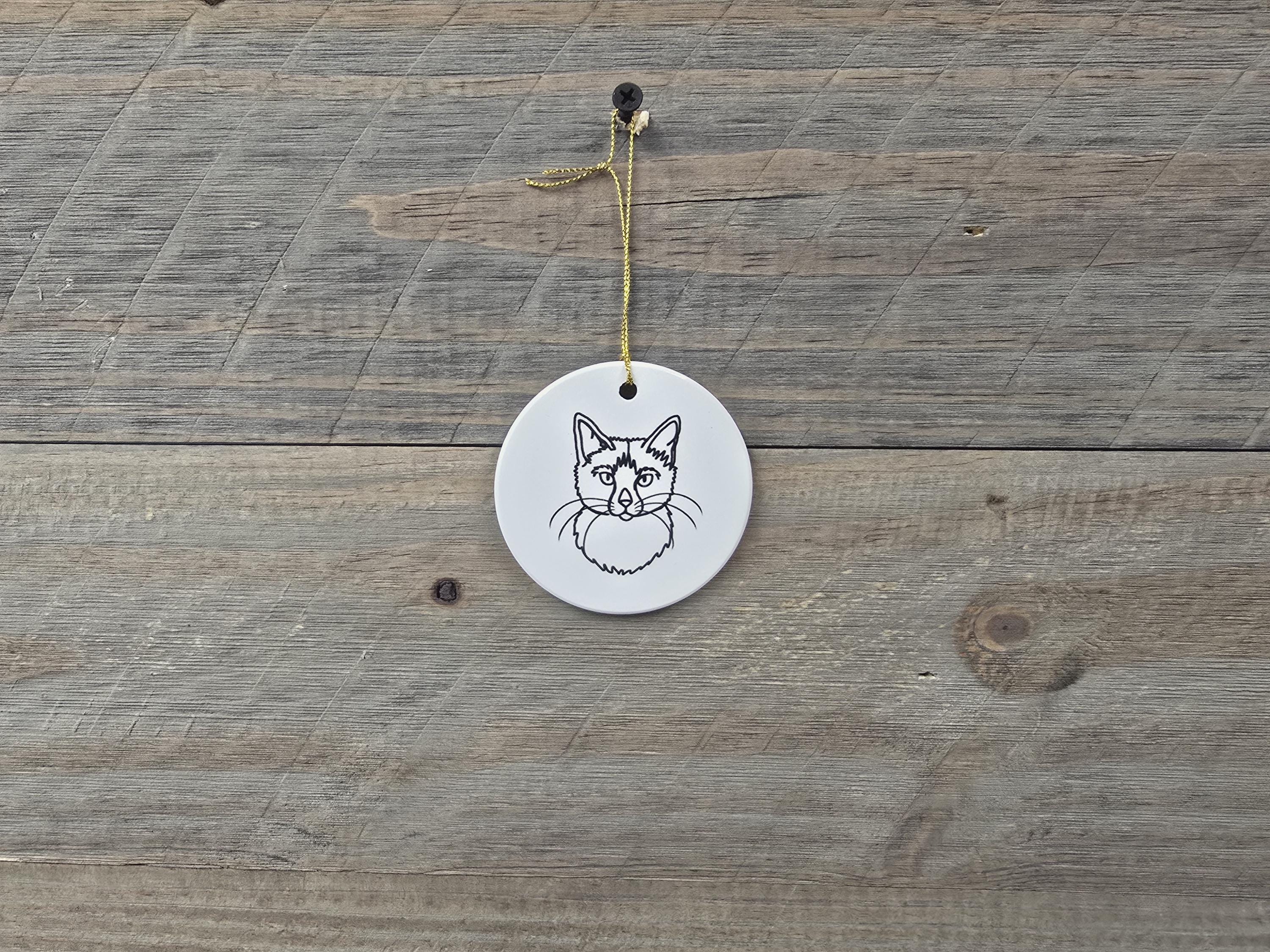 Celebrate your feline affection with this sleek ceramic ornament featuring a minimalist line drawing of a cat’s expressive face. With its glossy white finish and elegant gold string, this handcrafted piece is perfect for holiday decorating, pet memorials, or year-round display. Whether you're gifting a fellow cat lover or honoring your own furry friend, this ornament adds a touch of modern charm to any space.