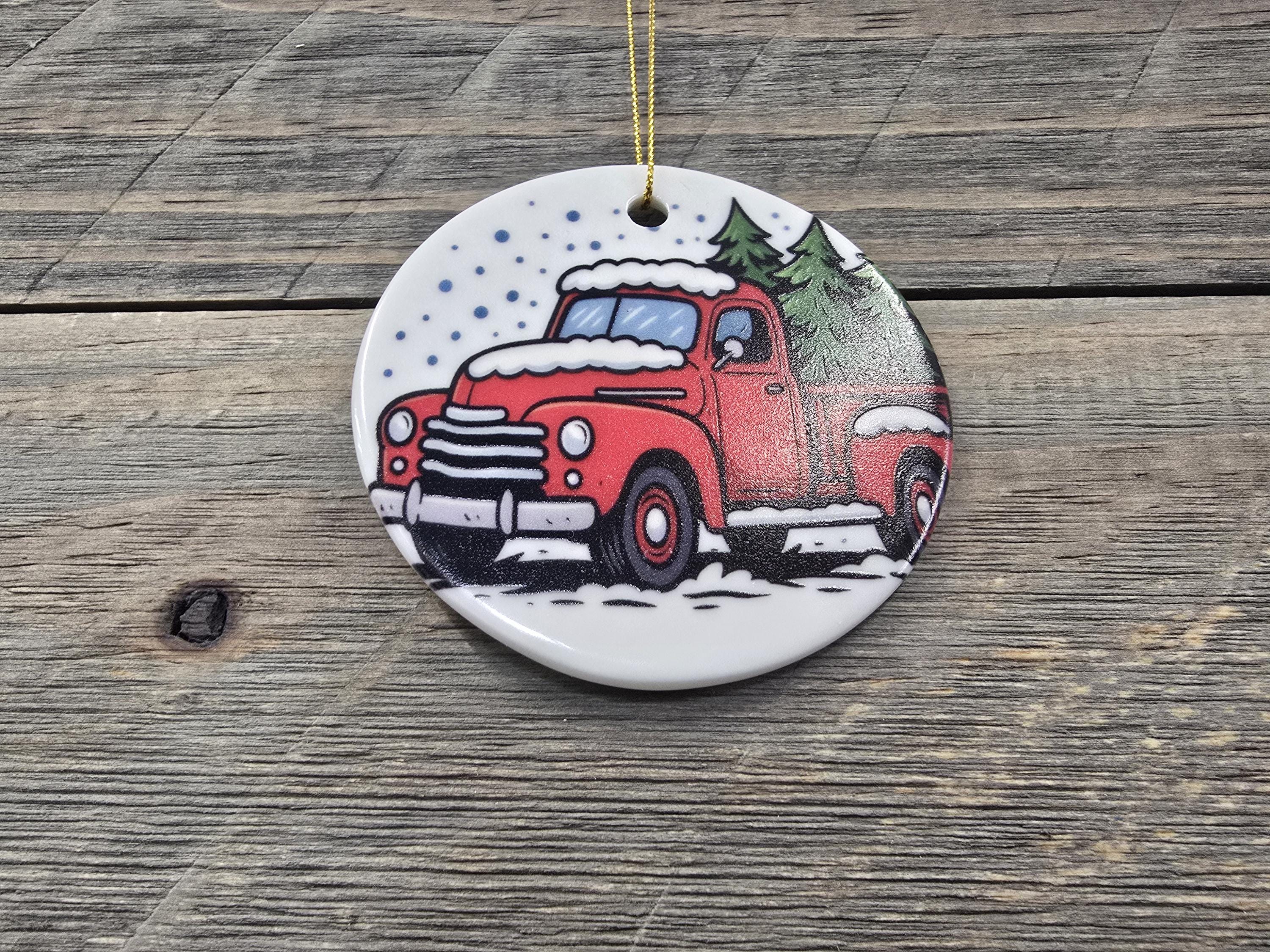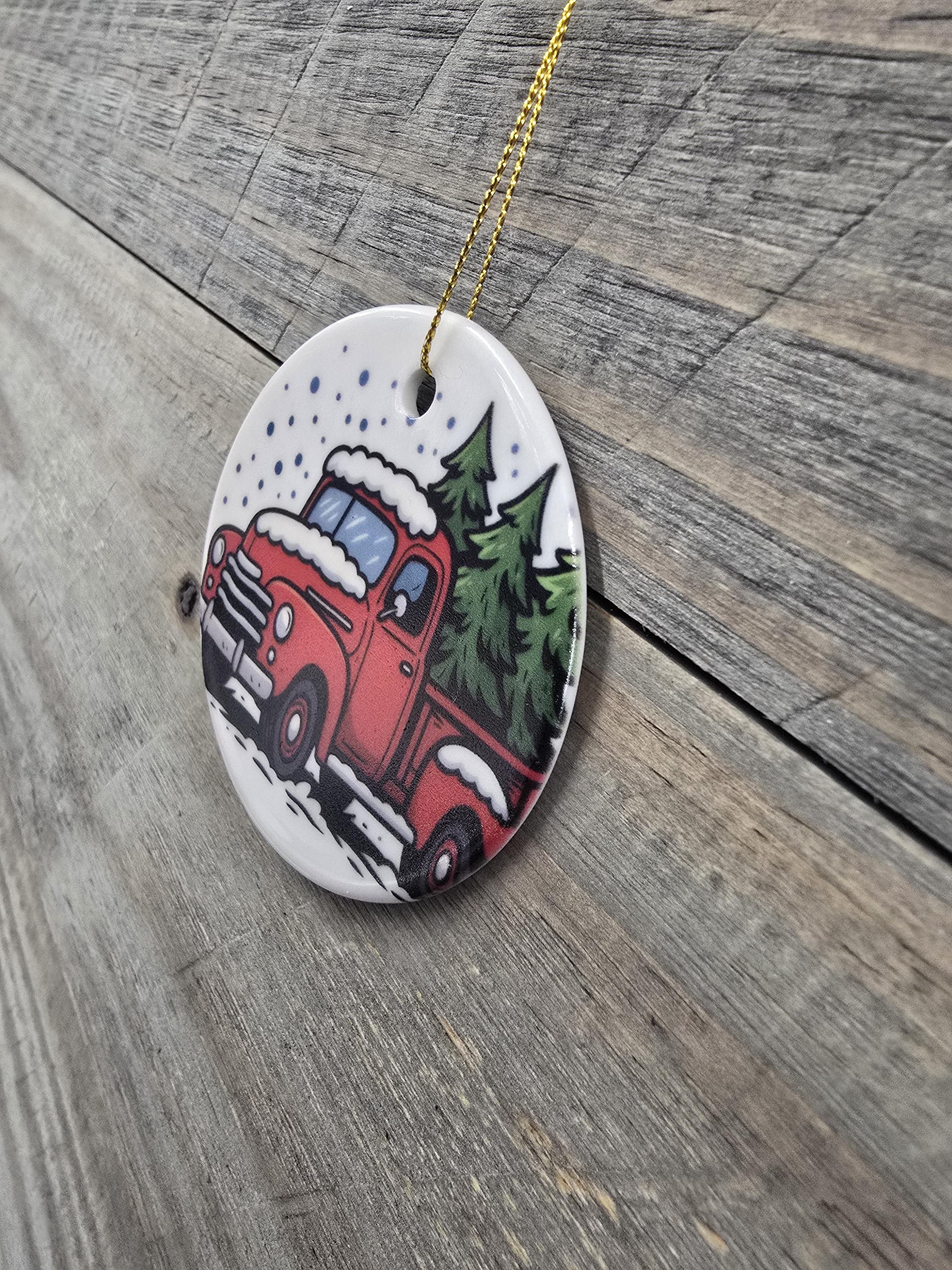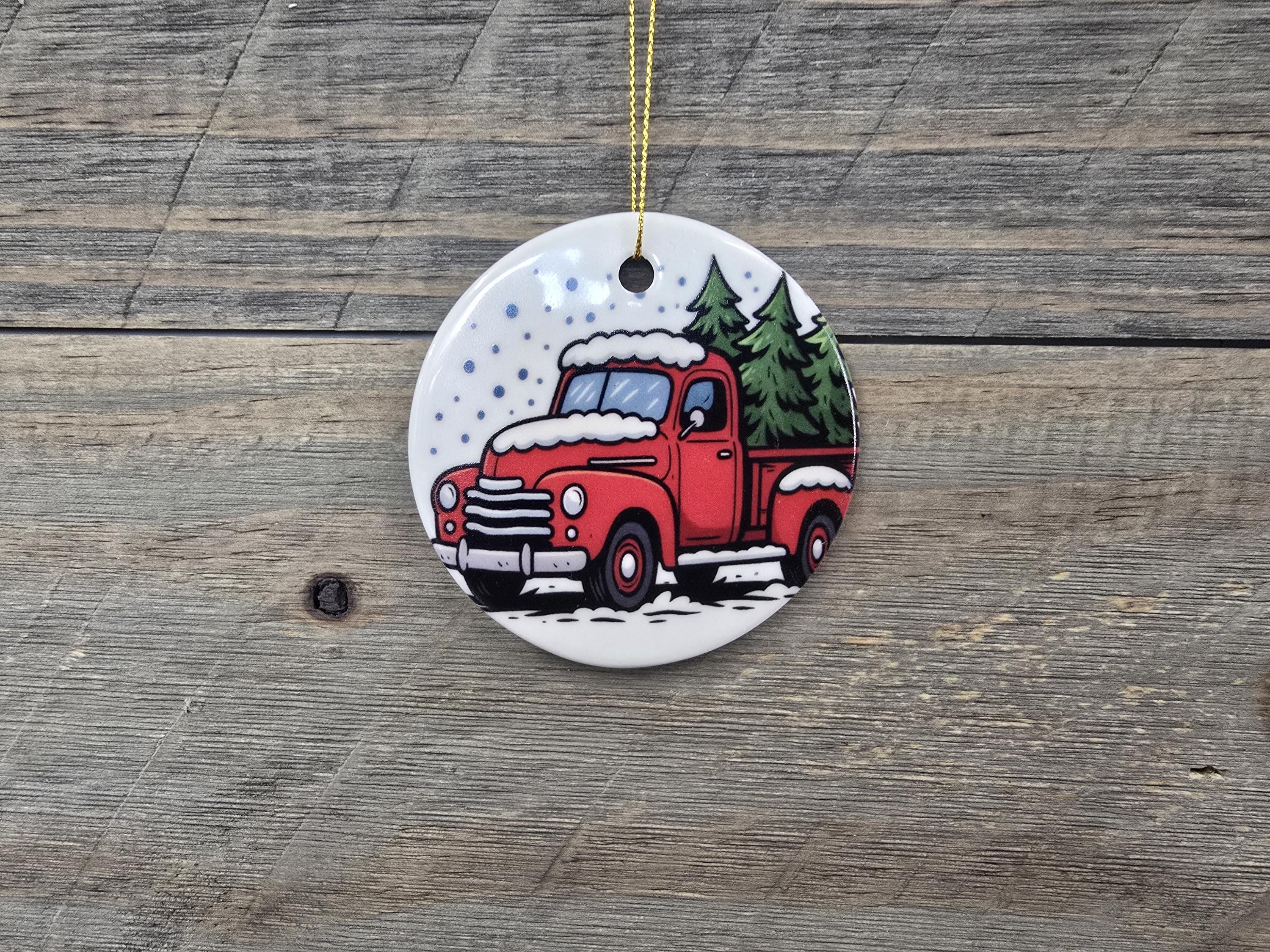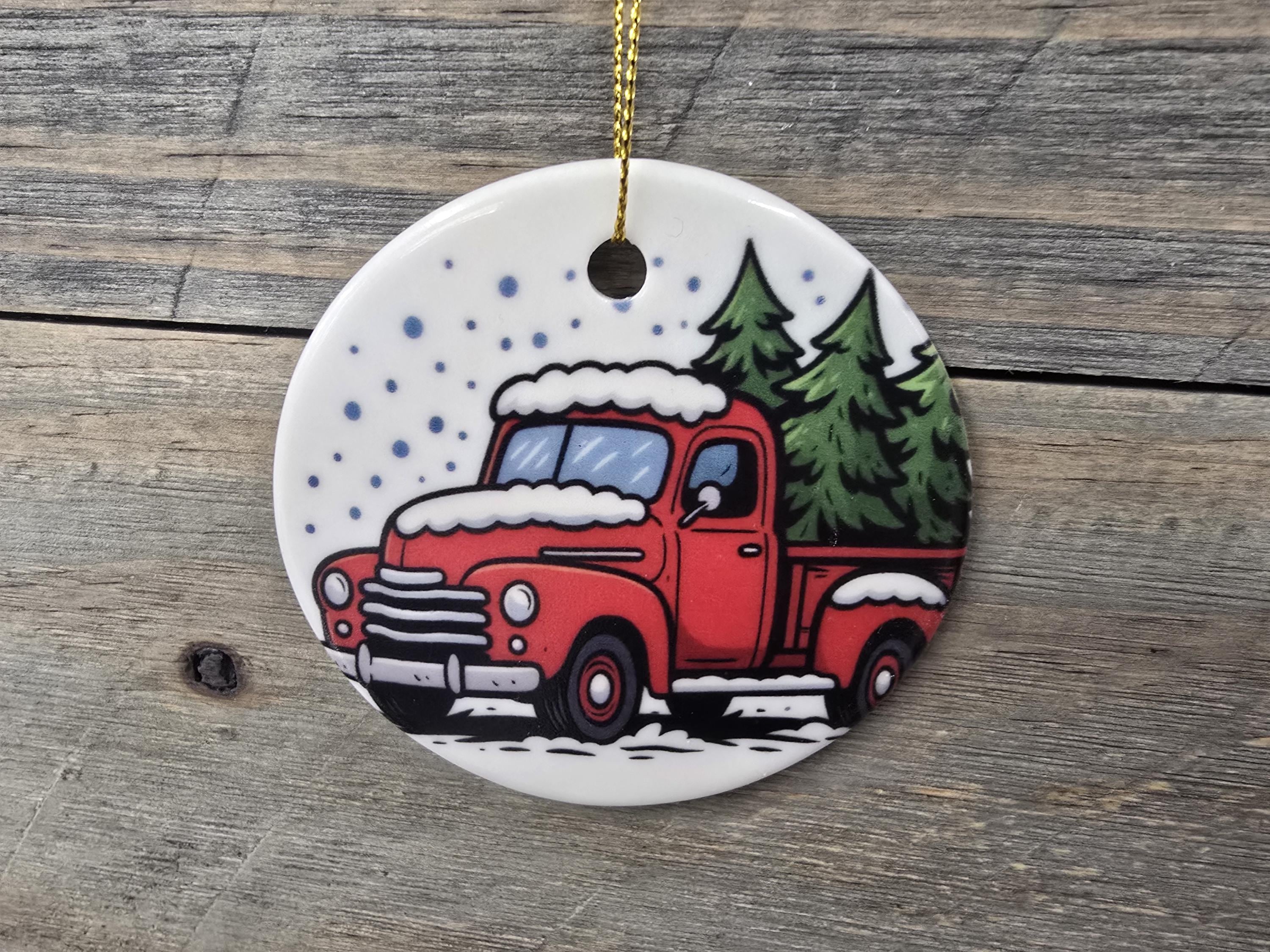 Celebrate the charm of a country Christmas with this handcrafted ceramic ornament featuring a classic red vintage truck hauling a festive evergreen through a snowy forest. The nostalgic design evokes warm holiday memories, making it a perfect addition to your tree or a thoughtful gift for lovers of rustic and farmhouse style. Each ornament is finished with a gold string for easy hanging and adds a cozy, wintry touch to any holiday decor.