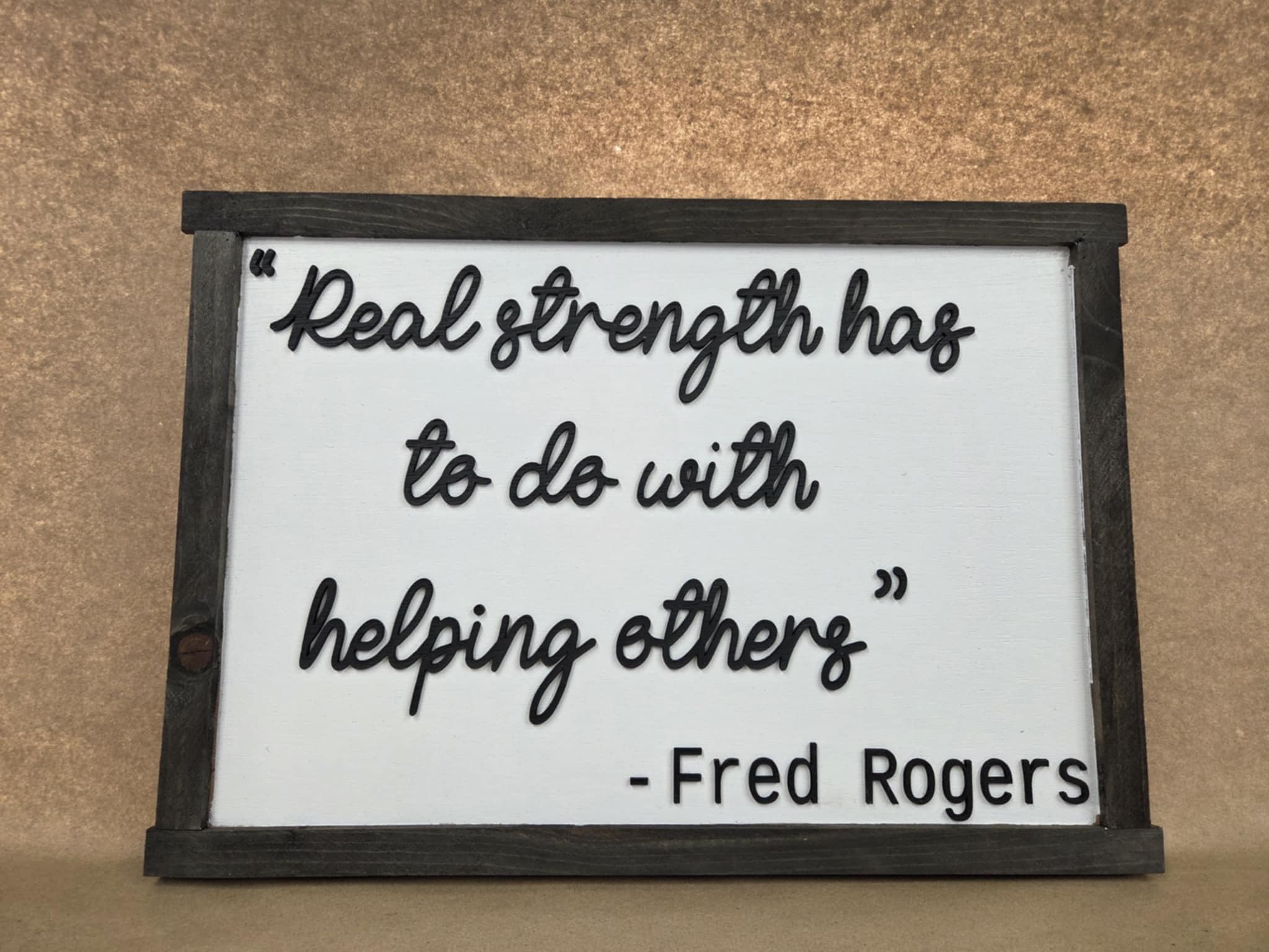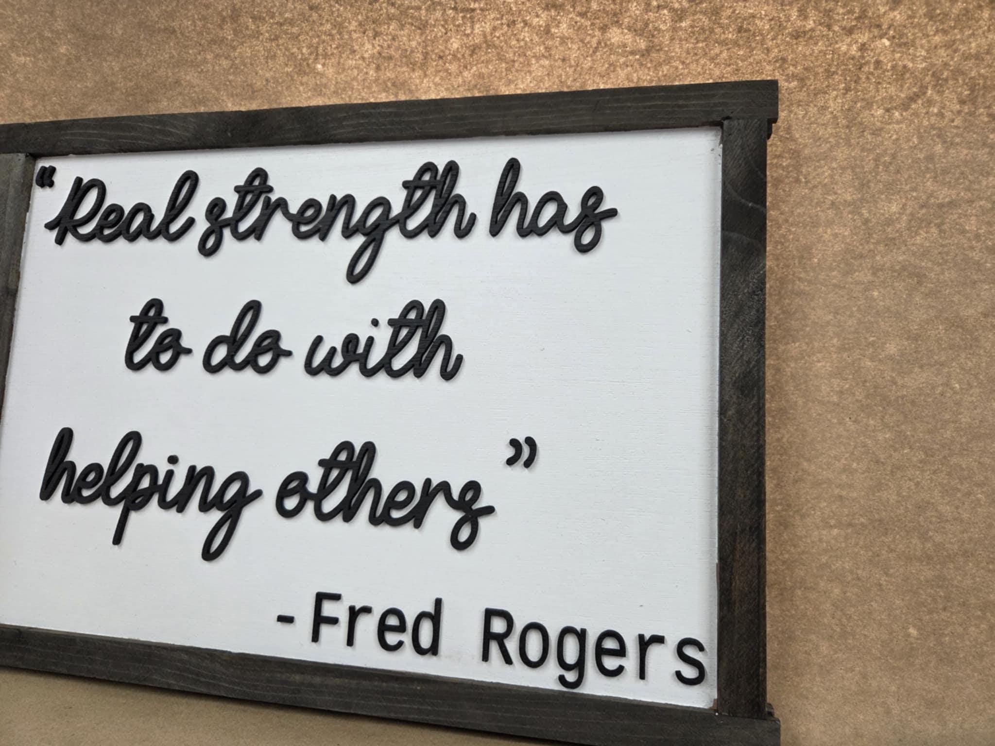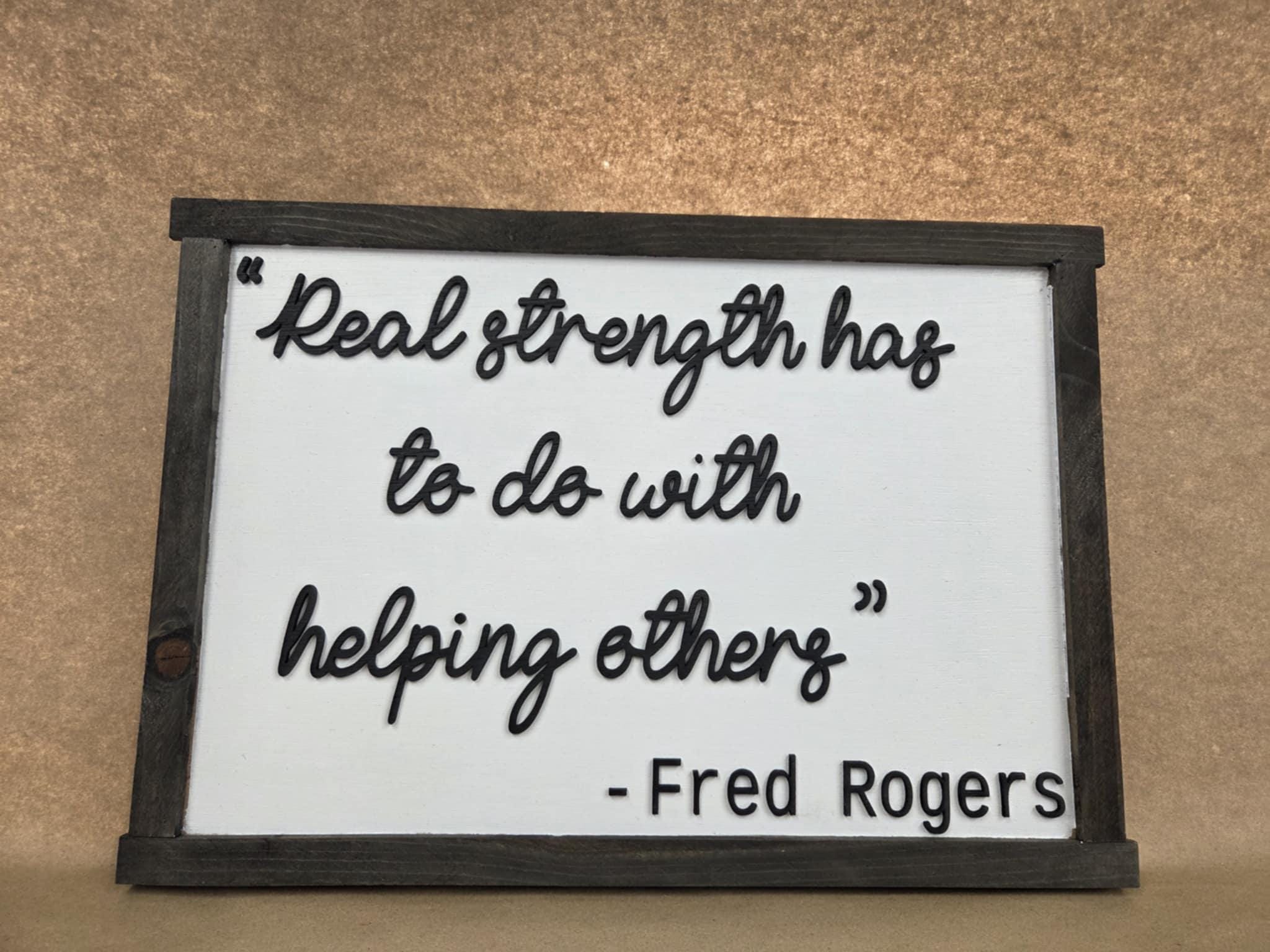 Celebrate kindness and compassion with this beautifully crafted wooden sign featuring the heartfelt quote from Fred Rogers: “Real strength has to do with helping others.” Set against a clean white background and framed in rustic wood, this piece brings warmth and wisdom to any space. Perfect for gifting or adding a meaningful touch to your home, classroom, or office.