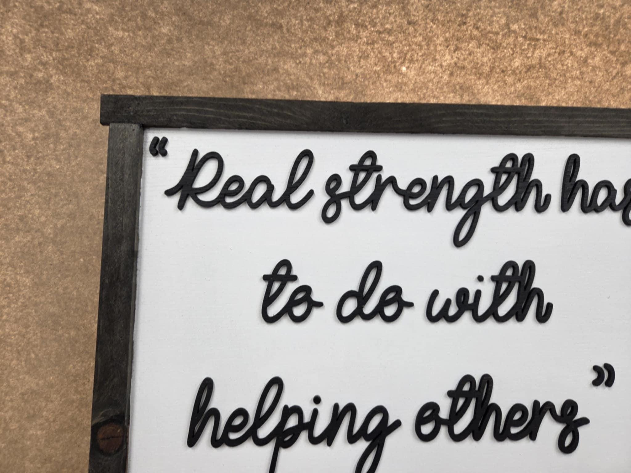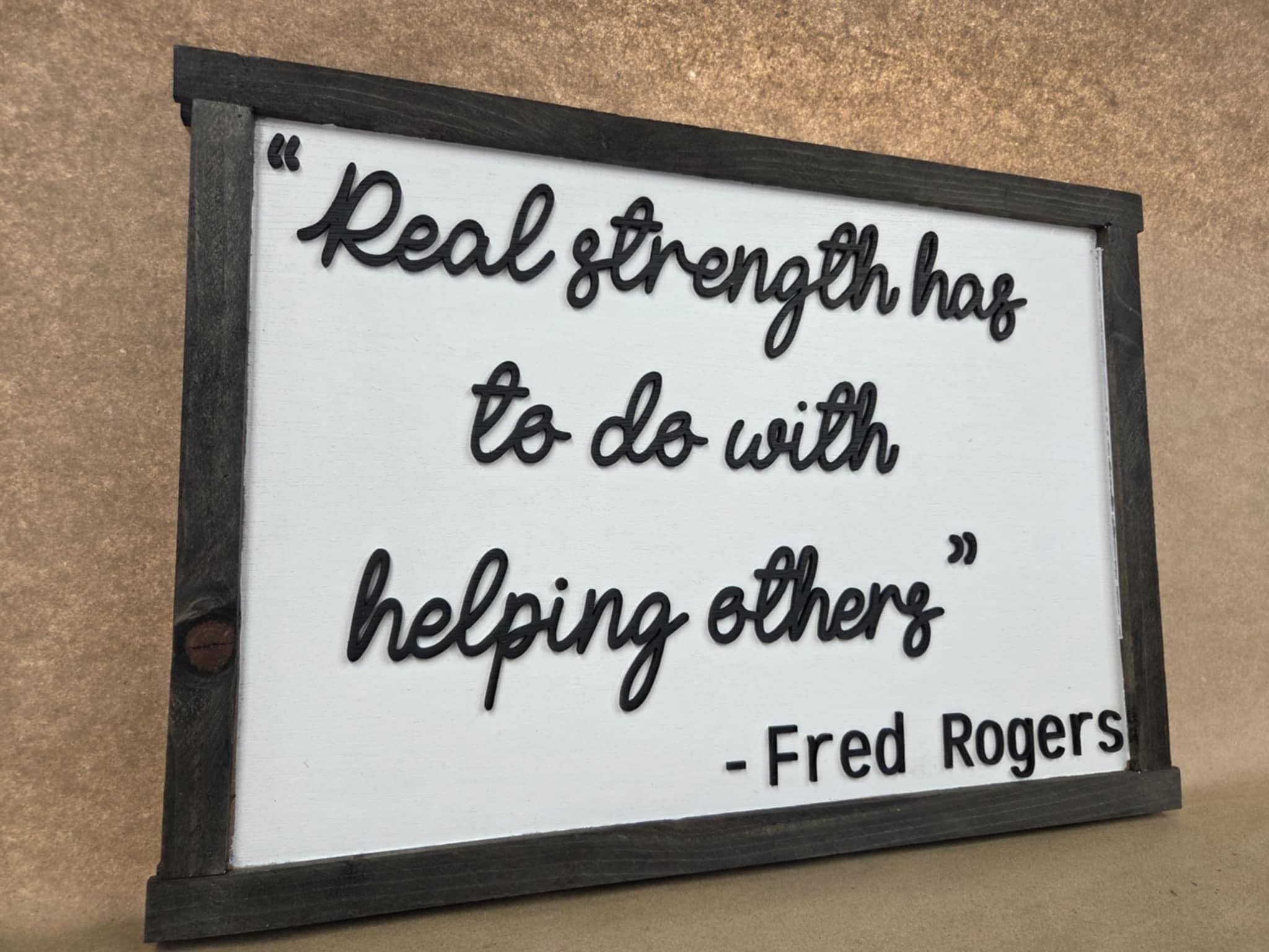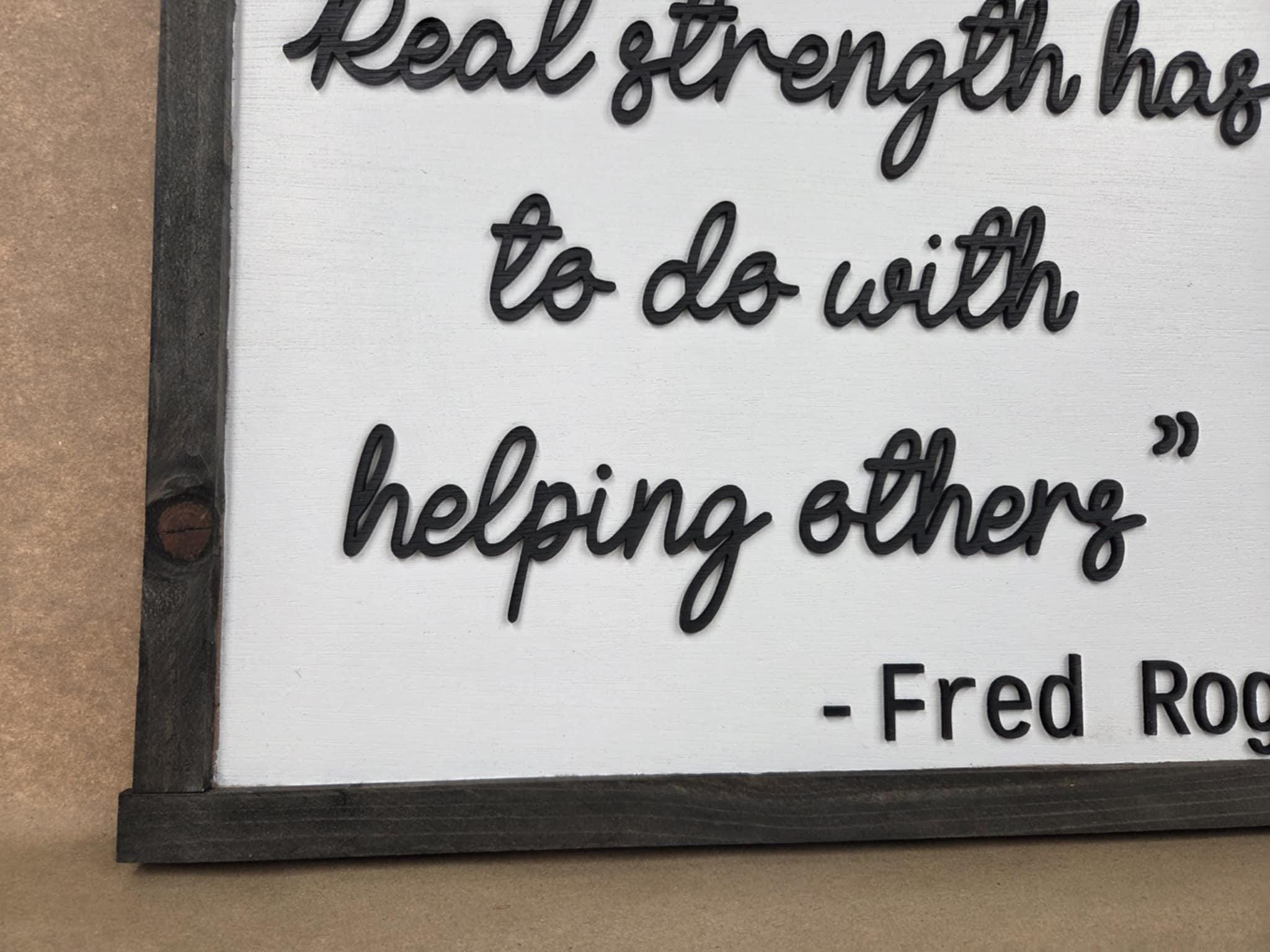Celebrate kindness and compassion with this beautifully crafted wooden sign featuring the heartfelt quote from Fred Rogers: “Real strength has to do with helping others.” Set against a clean white background and framed in rustic wood, this piece brings warmth and wisdom to any space. Perfect for gifting or adding a meaningful touch to your home, classroom, or office.