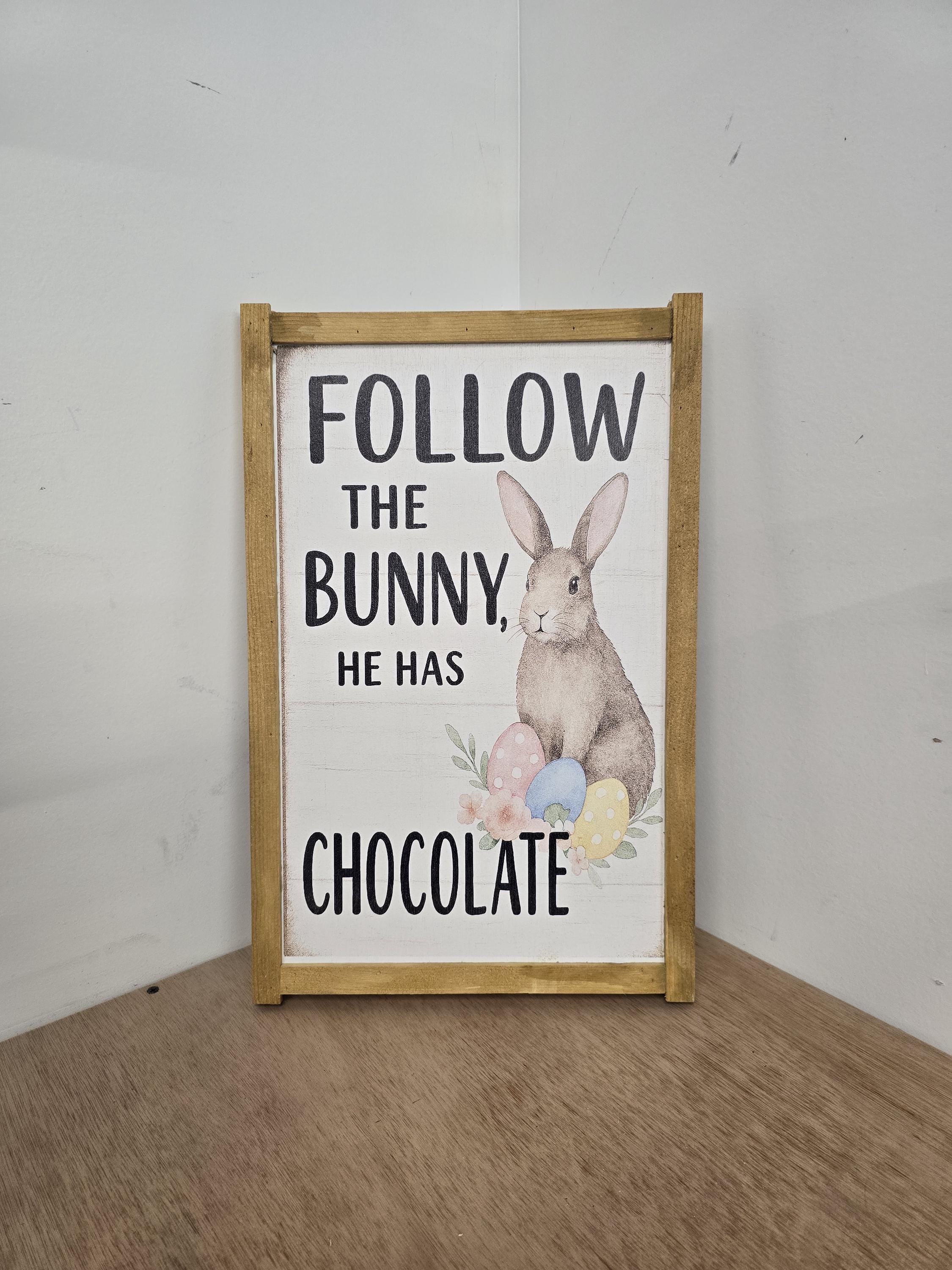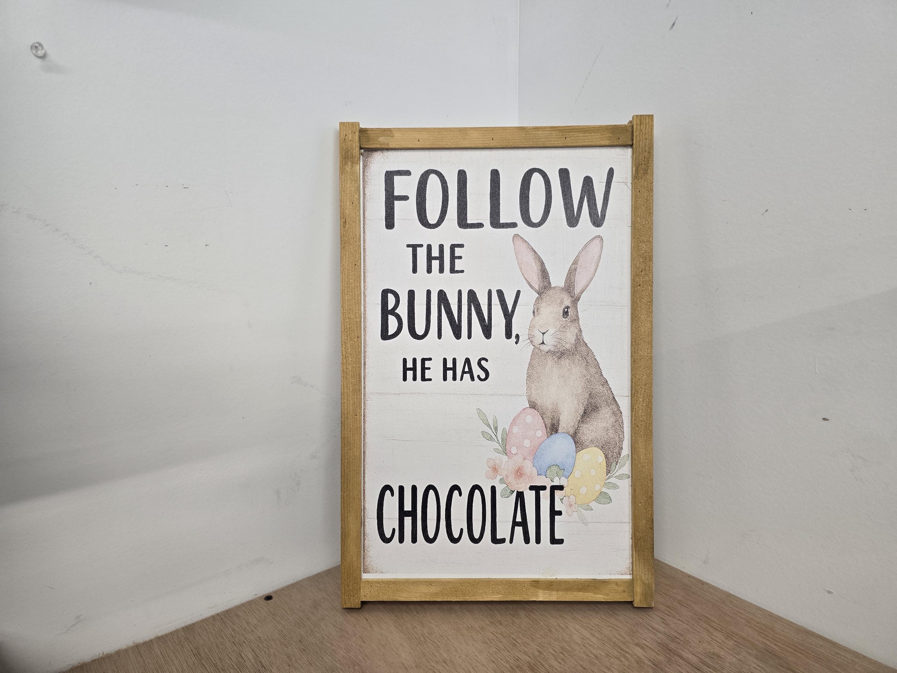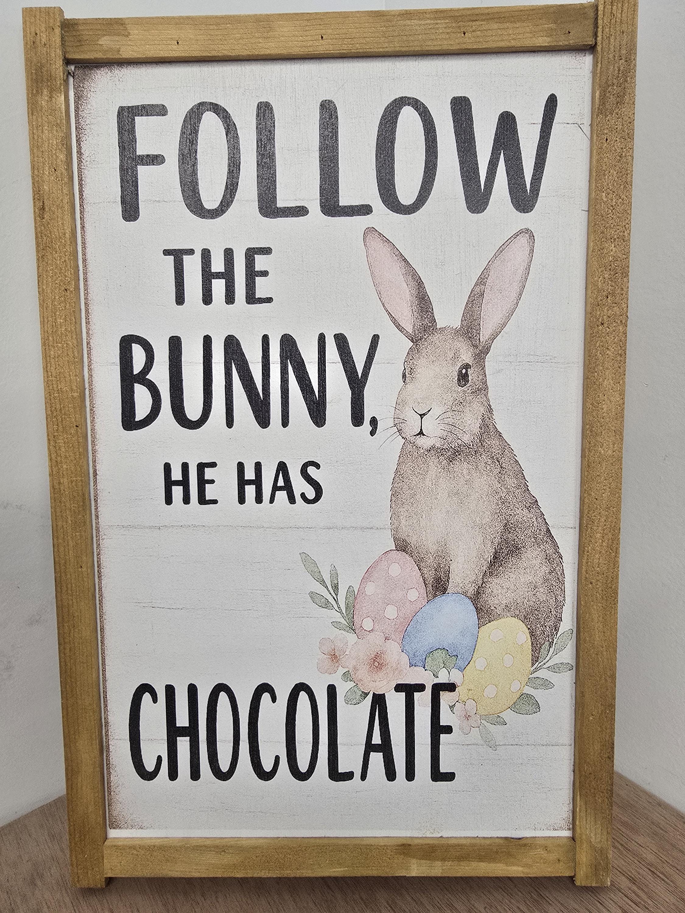 Celebrate the sweetness of spring with this charming Easter sign featuring a whimsical brown bunny surrounded by pastel eggs and florals. Framed in rustic wood, it reads “Follow the Bunny, He Has Chocolate” – a playful nod to everyone’s favorite holiday treat. Perfect for Easter baskets, seasonal mantels, or entryway decor, this piece adds a cheerful touch to your home. Makes a delightful gift for chocolate lovers, bunny fans, or anyone who enjoys festive farmhouse style.