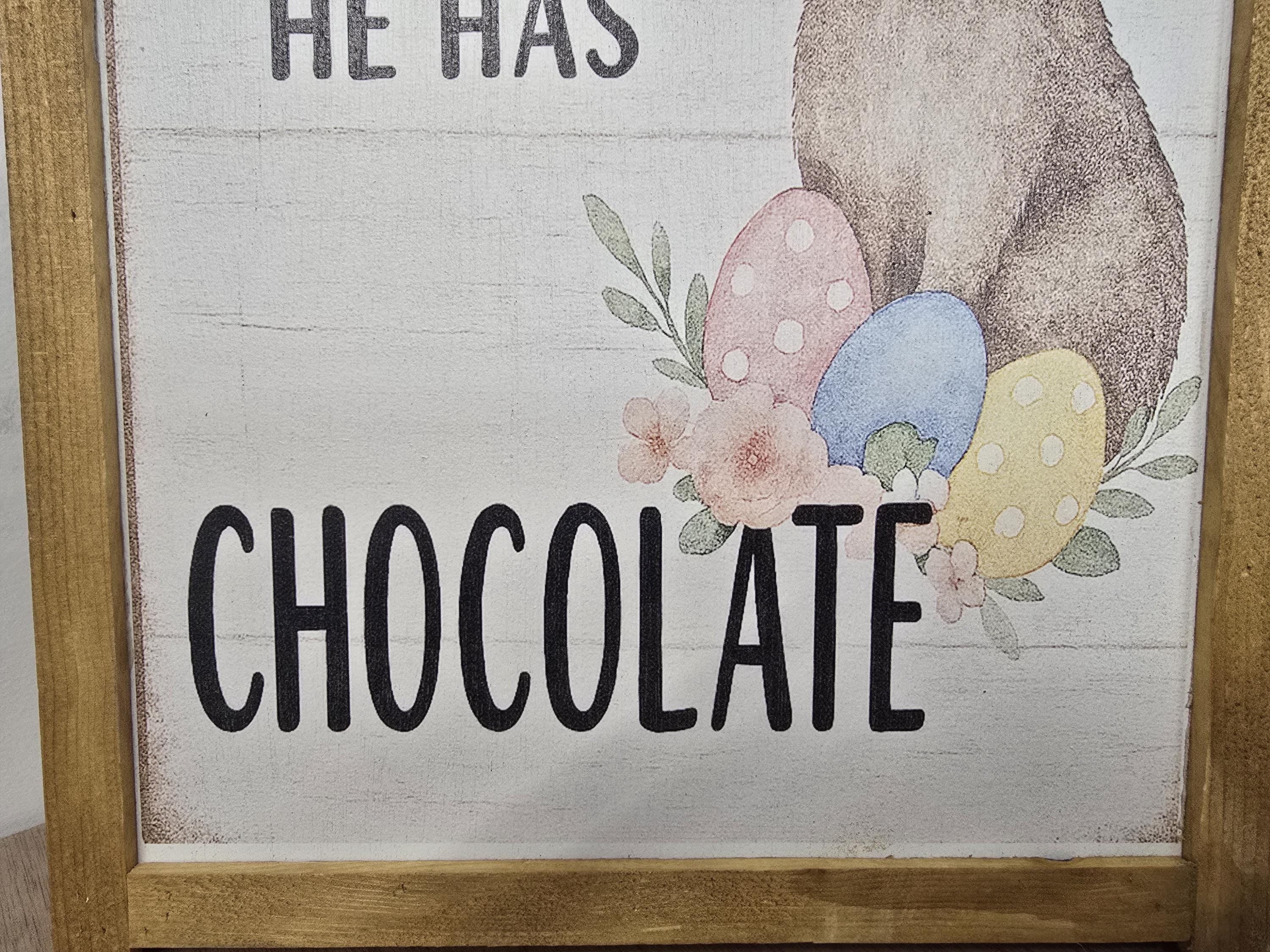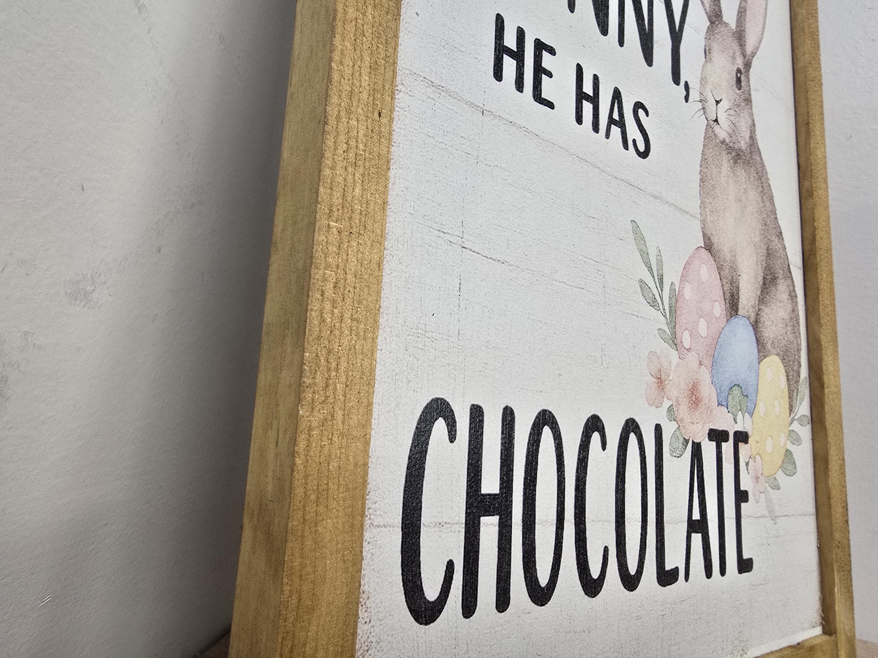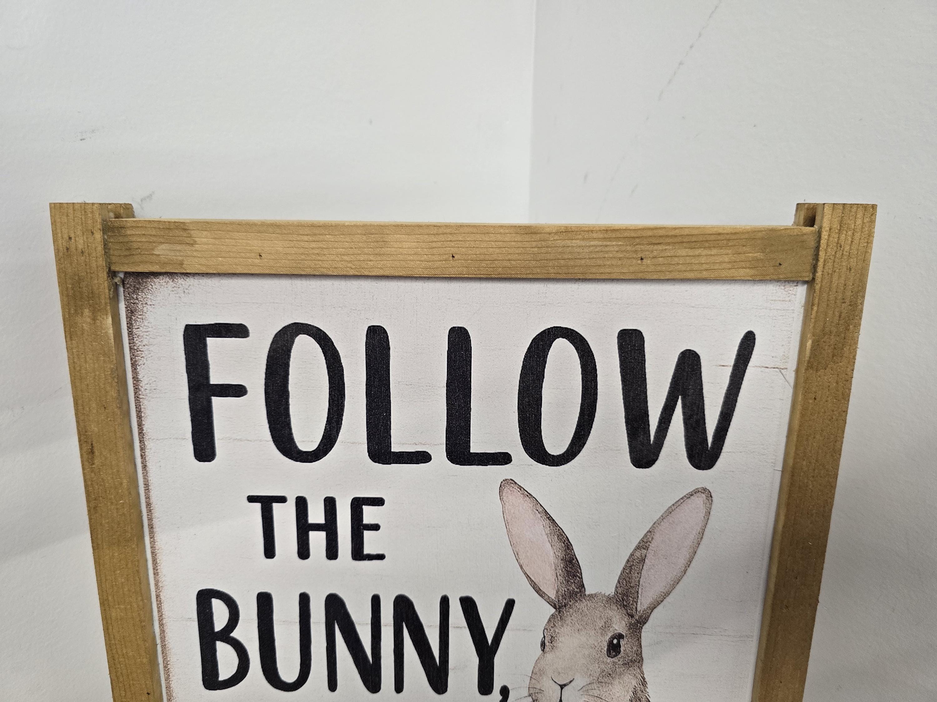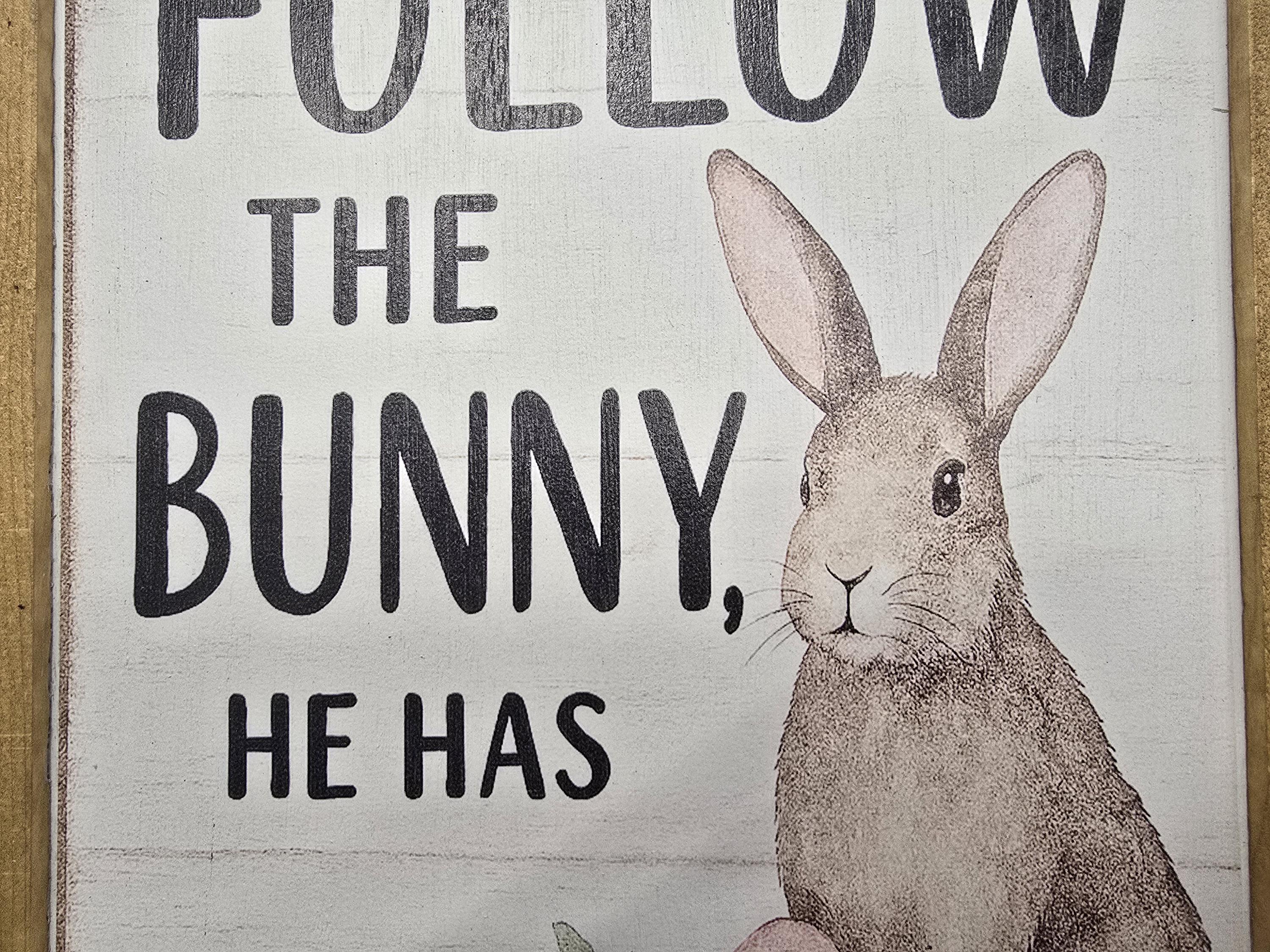 Celebrate the sweetness of spring with this charming Easter sign featuring a whimsical brown bunny surrounded by pastel eggs and florals. Framed in rustic wood, it reads “Follow the Bunny, He Has Chocolate” – a playful nod to everyone’s favorite holiday treat. Perfect for Easter baskets, seasonal mantels, or entryway decor, this piece adds a cheerful touch to your home. Makes a delightful gift for chocolate lovers, bunny fans, or anyone who enjoys festive farmhouse style.