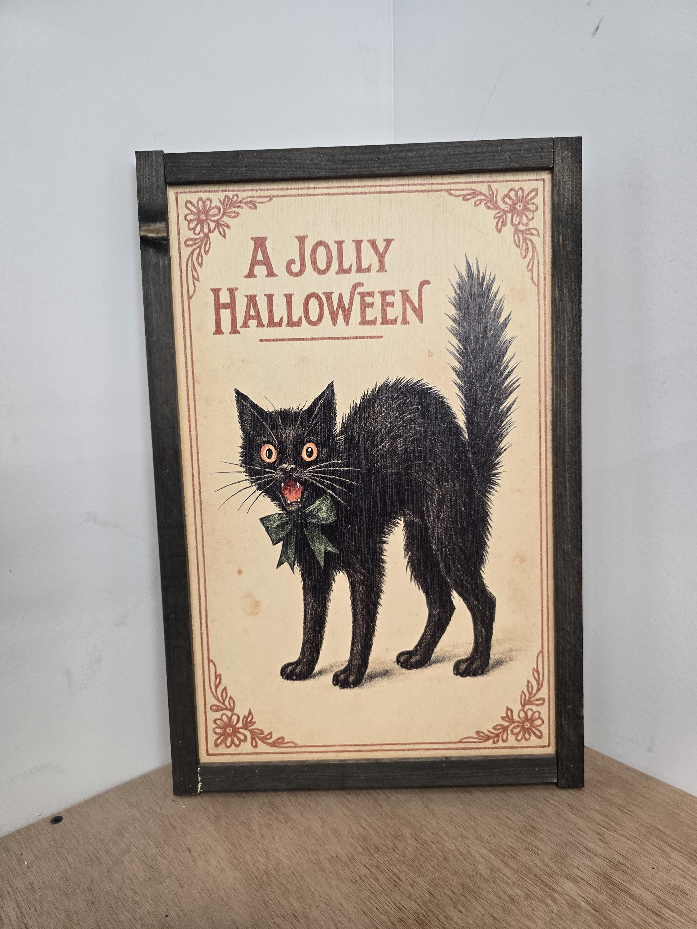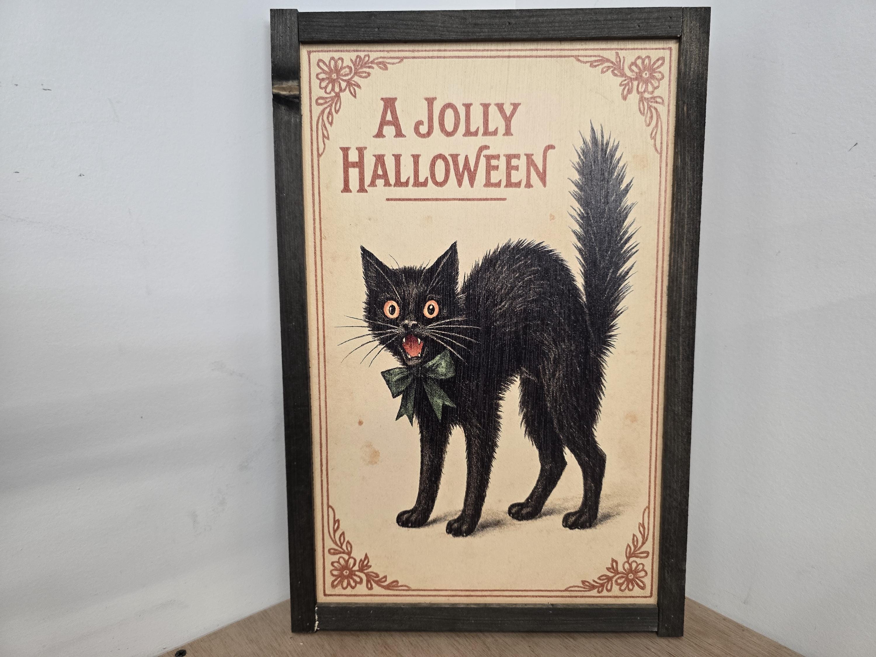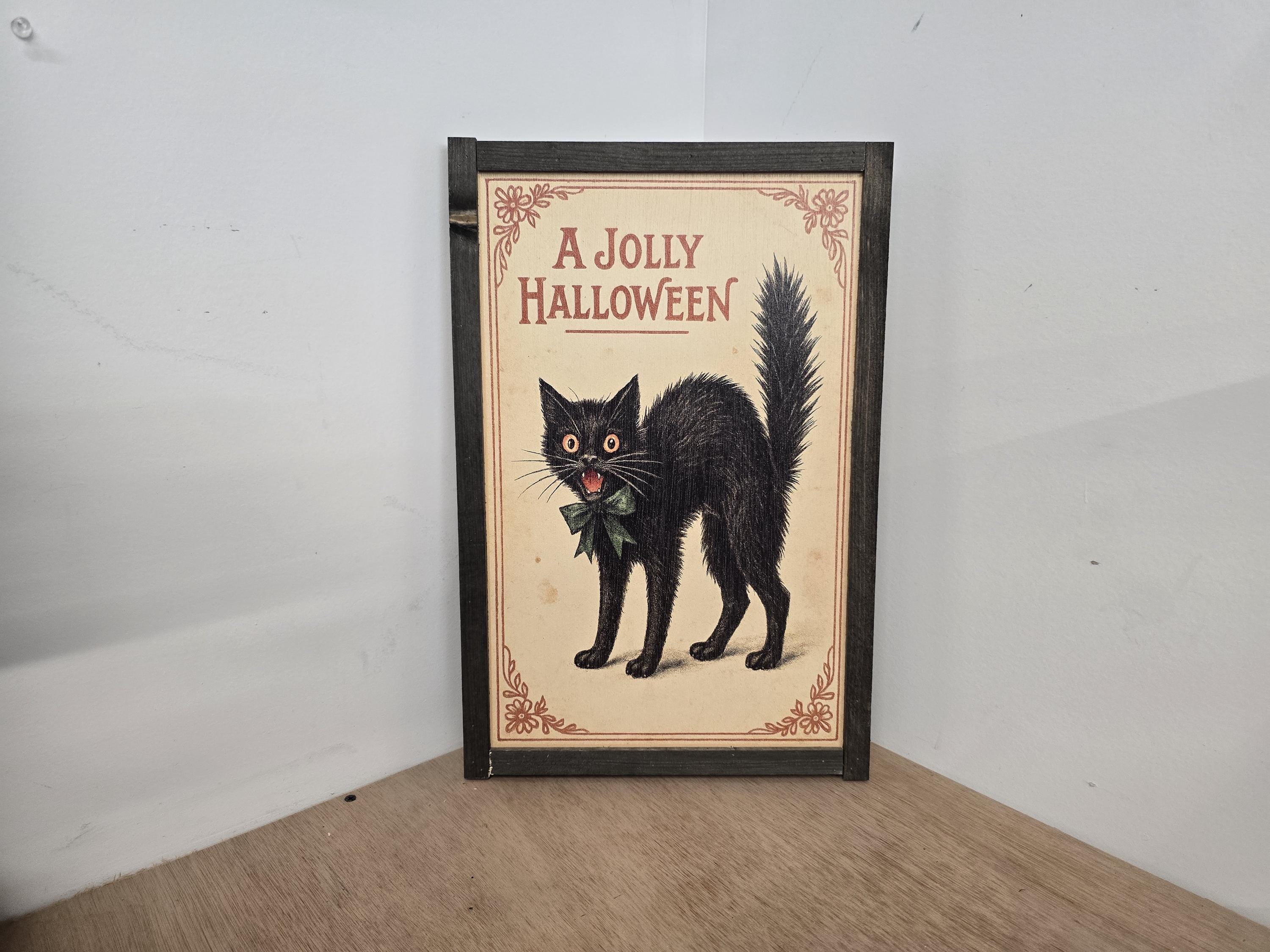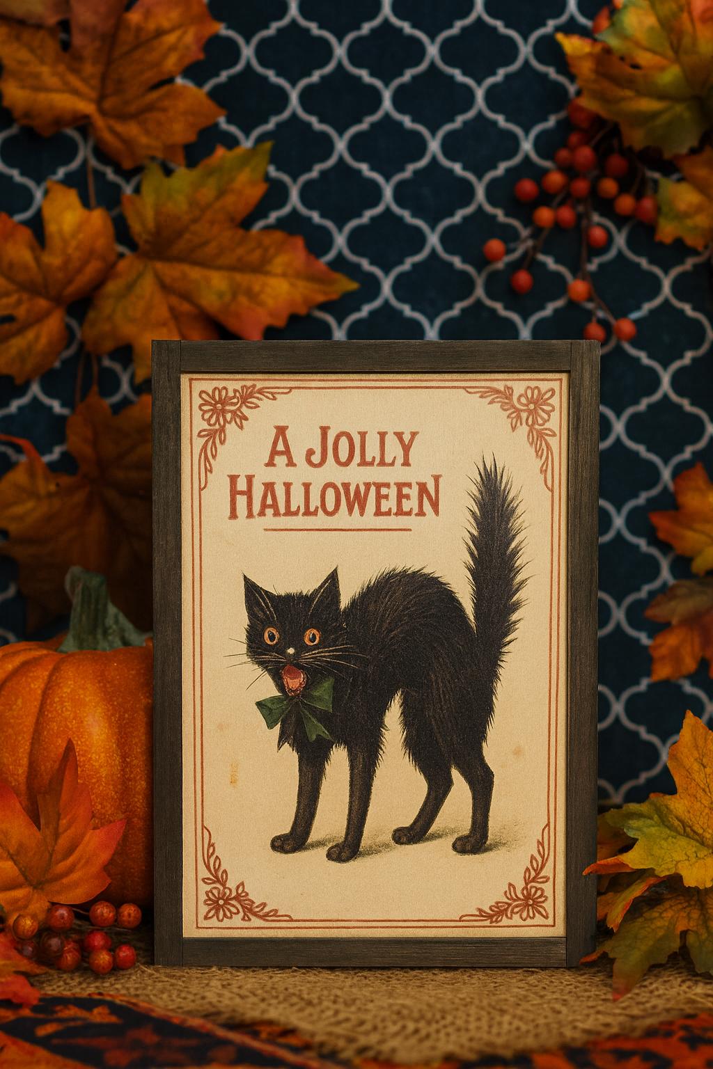 Add a touch of vintage charm to your Halloween decor with this delightful retro print featuring a classic black cat illustration. With its arched back, wide eyes, and green bow, this feline captures the playful spookiness of old-fashioned Halloween celebrations. The bold red “A JOLLY HALLOWEEN” greeting and decorative corner accents evoke early 20th-century postcard art, perfect for collectors and seasonal decorators alike.