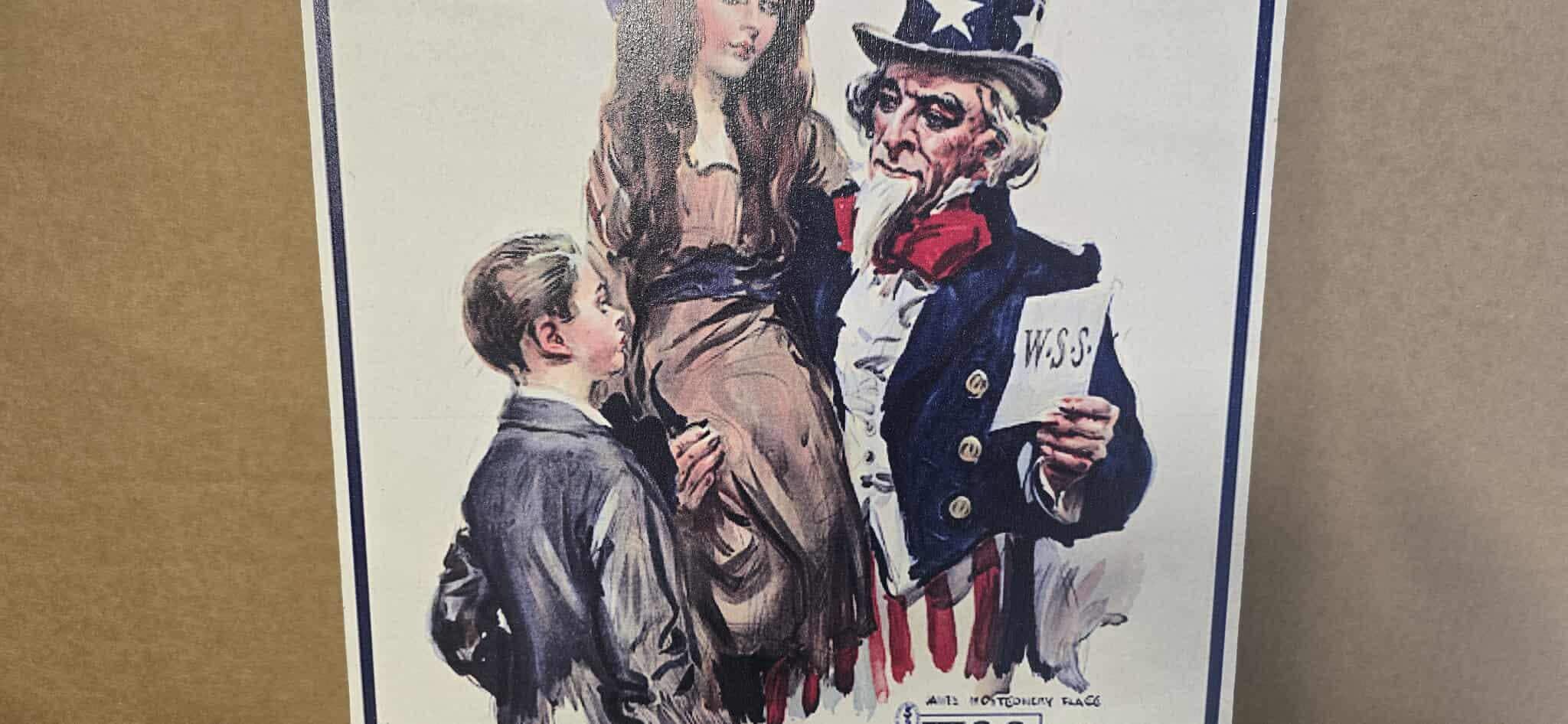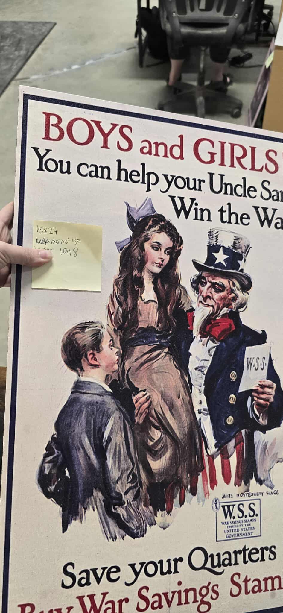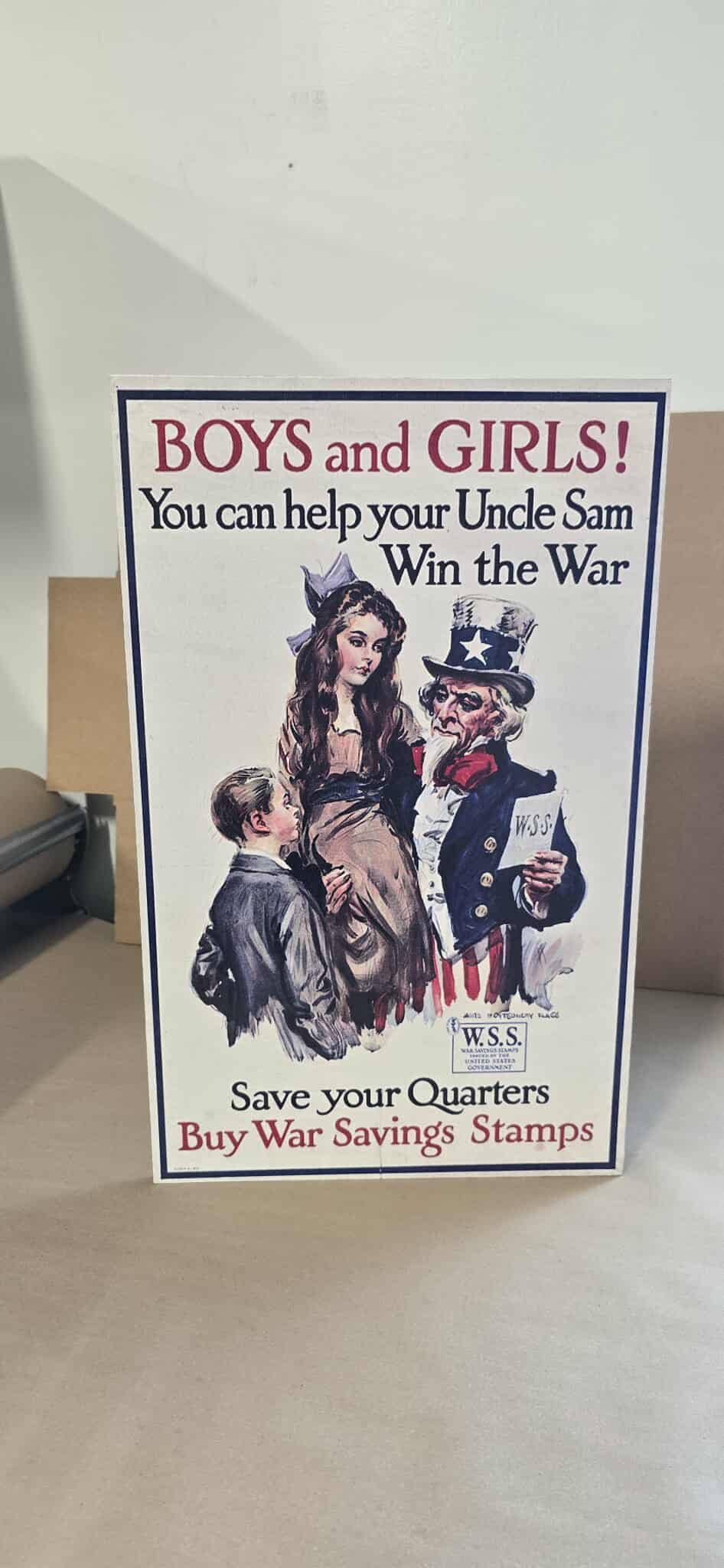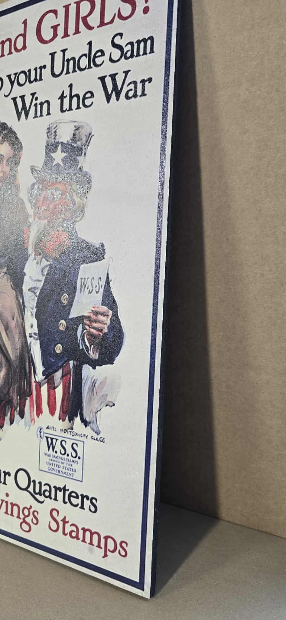 Perfect for history buffs, educators, and vintage art collectors, this unframed wood print adds historical depth to any study, classroom, or Americana-themed decor. A compelling reminder of unity and national pride during wartime.