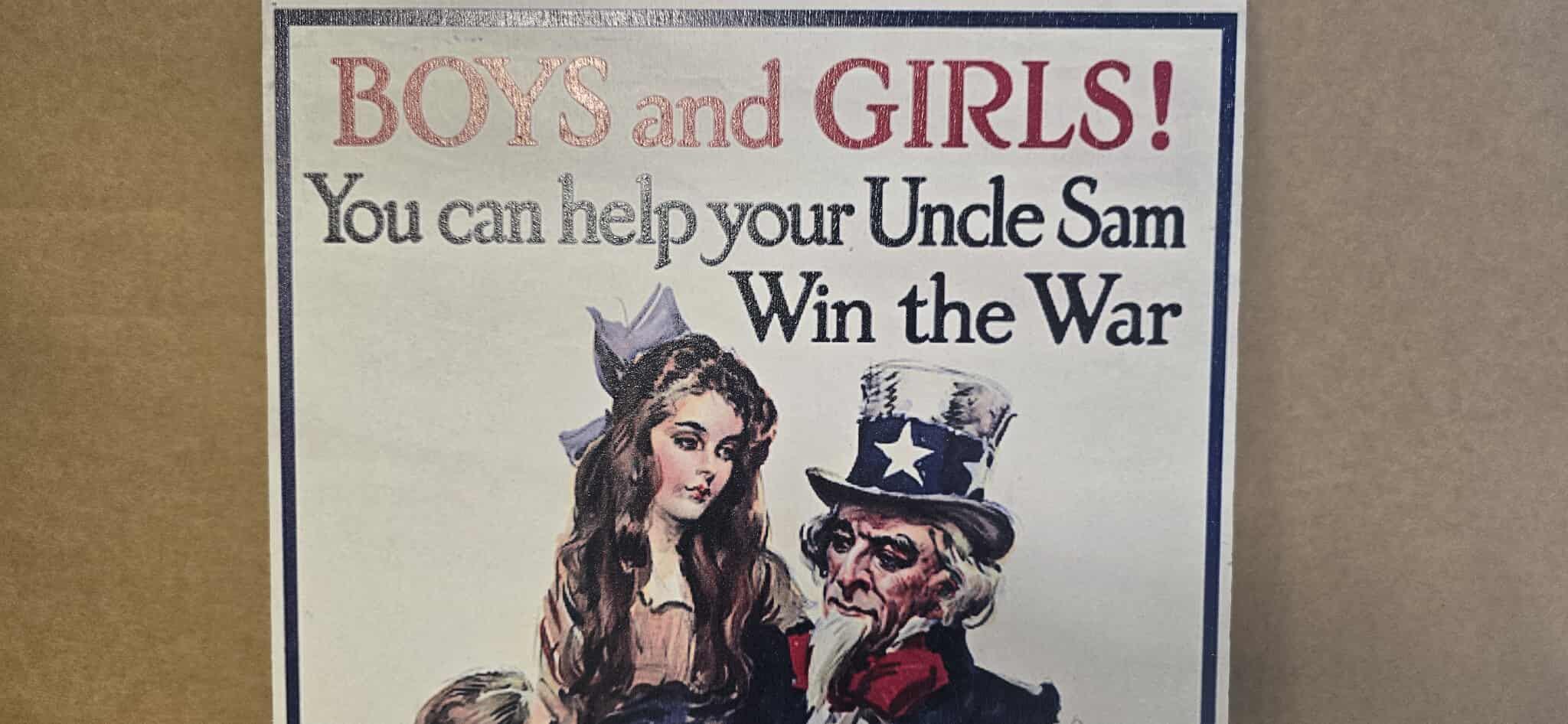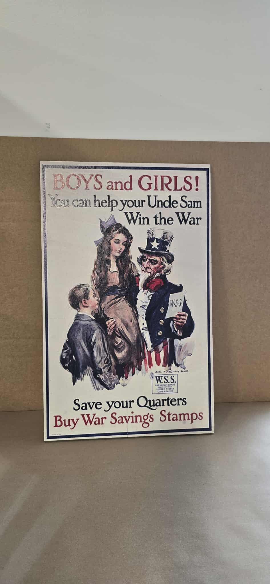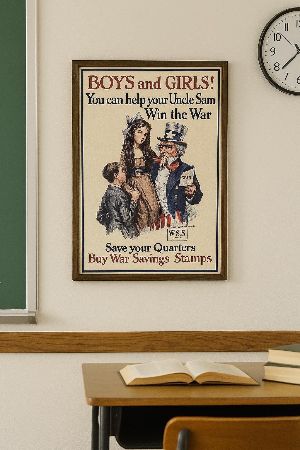 Capture a piece of American history with this vintage-style World War I propaganda poster reproduction. Featuring the iconic figure of Uncle Sam engaging with children, this artwork encouraged young Americans to support the war effort by purchasing War Savings Stamps. With bold typography and classic imagery, it reflects the patriotic spirit and civic duty of the era.