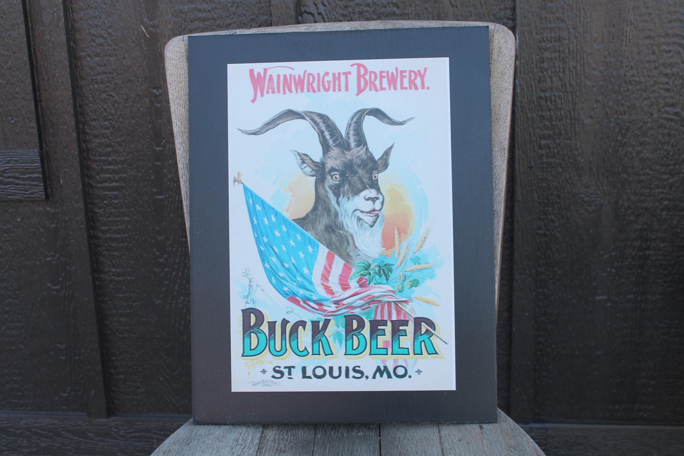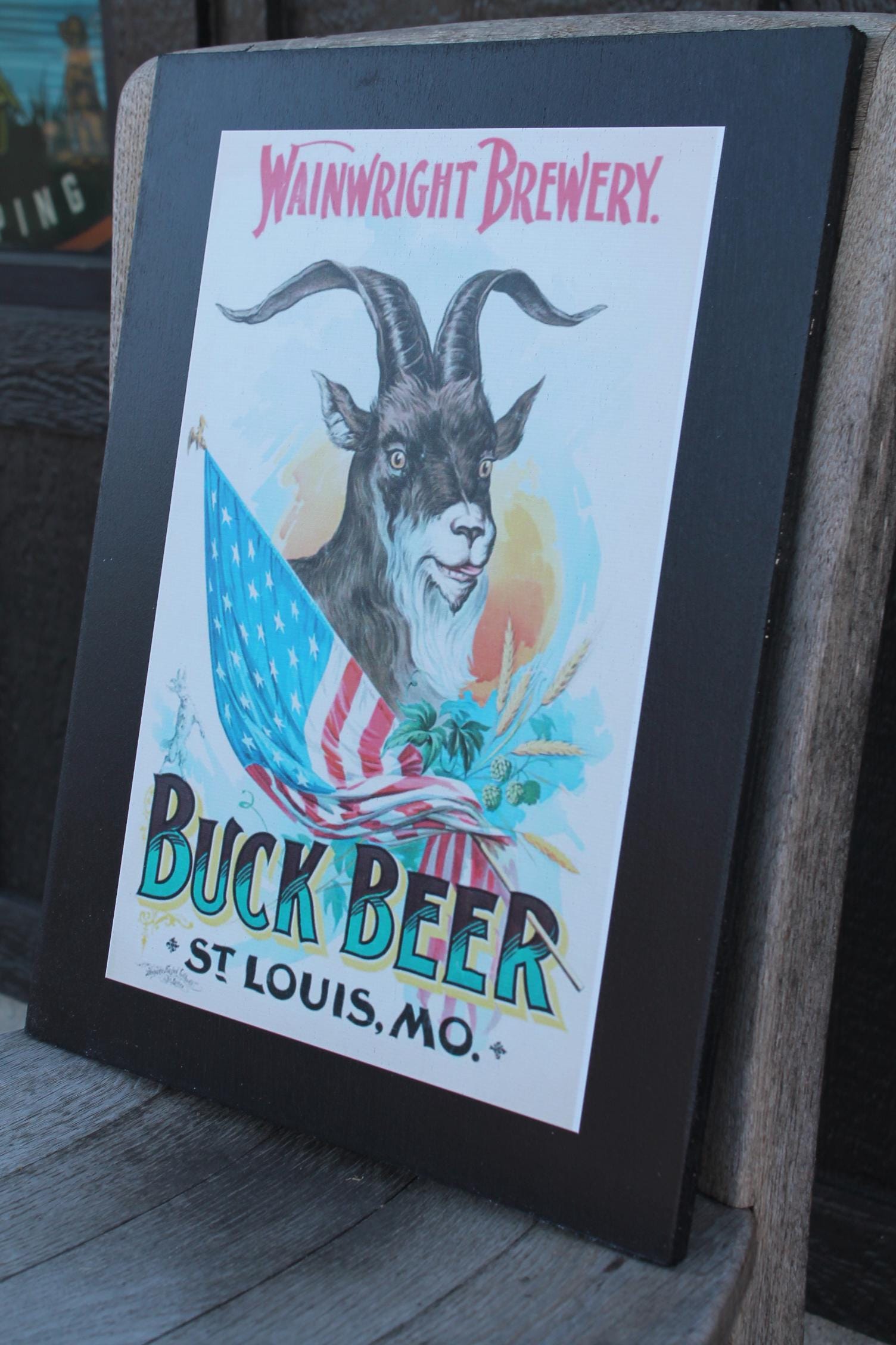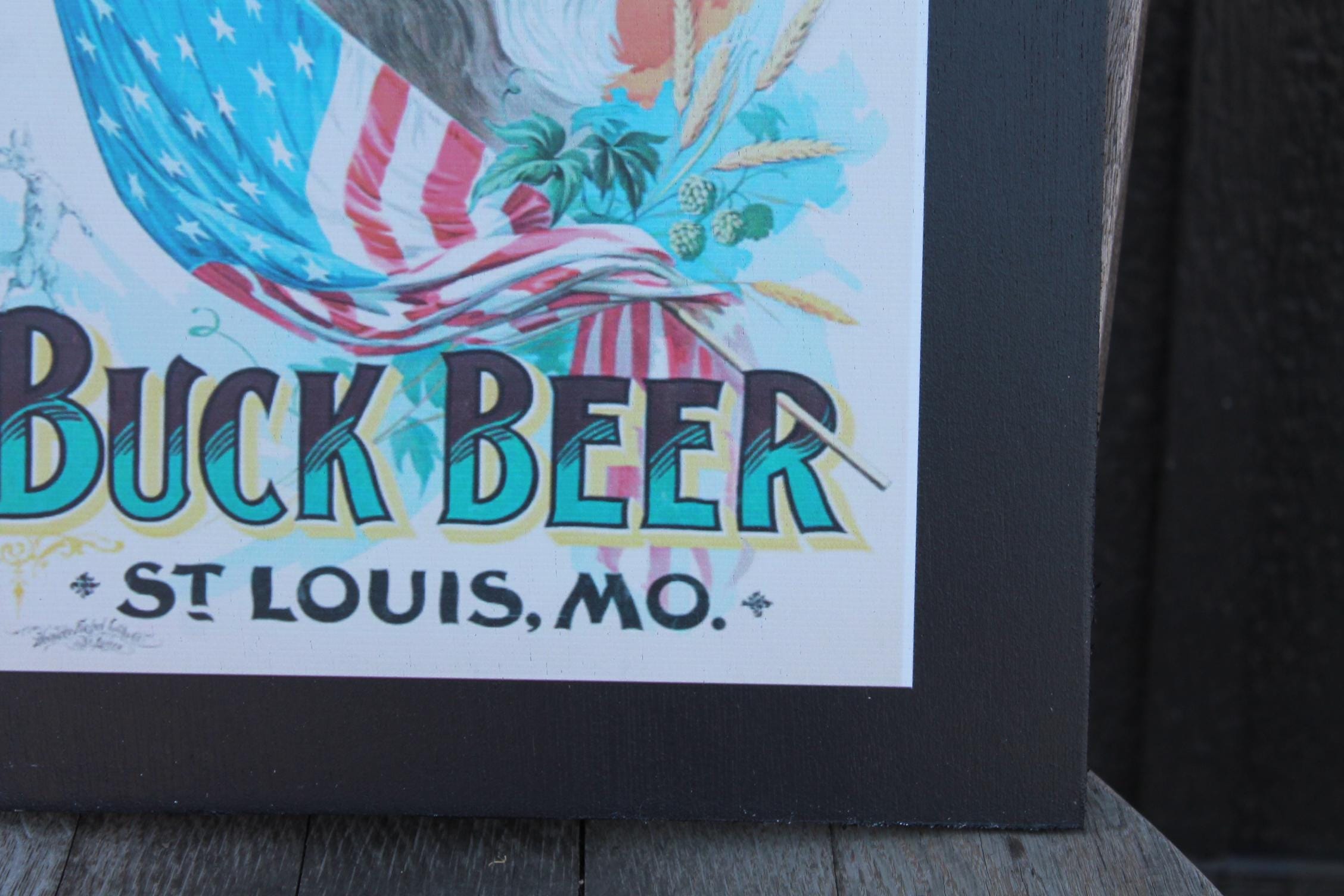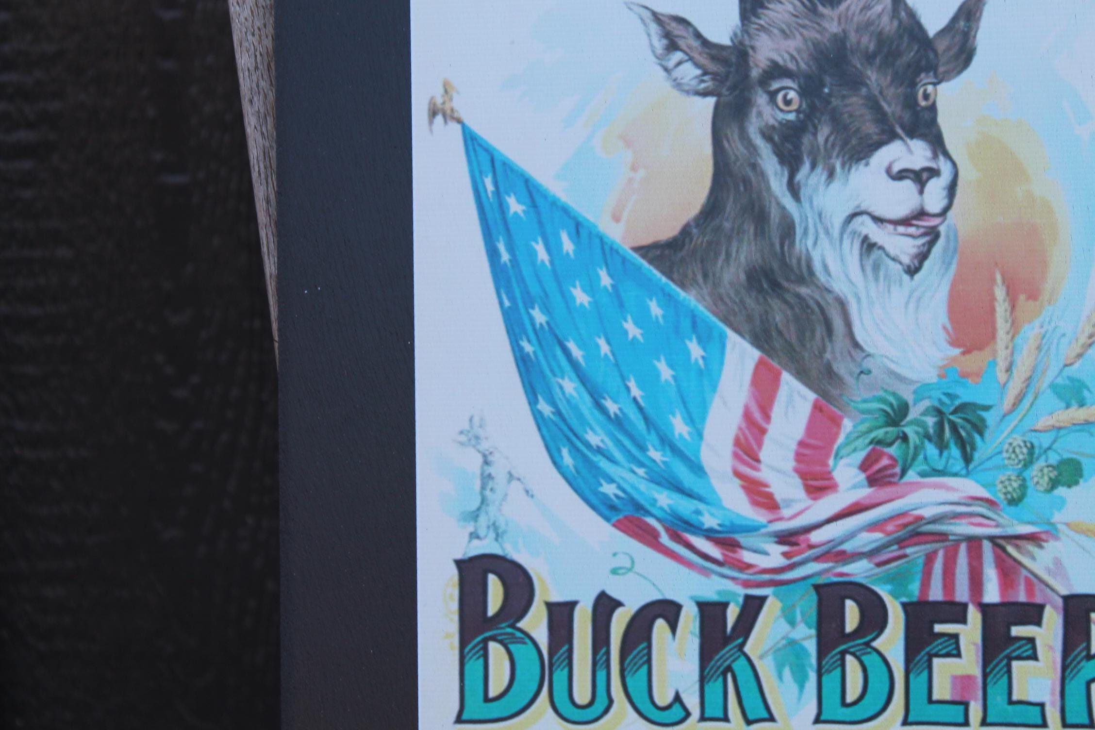 Celebrate classic American brewing heritage with this vintage-style Buck Beer poster wood print from Wainwright Brewery, St. Louis. Featuring a bold illustration of a goat wrapped in the American flag, surrounded by hops and barley, this artwork captures the spirited charm of early 20th-century beer advertising.