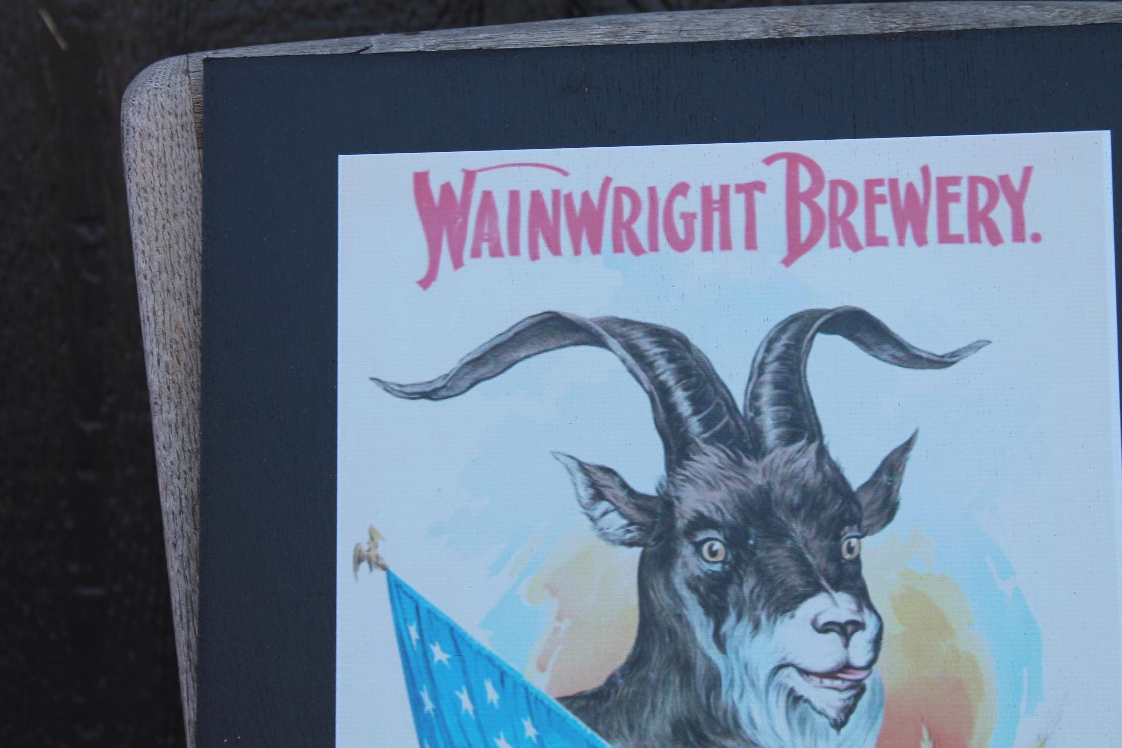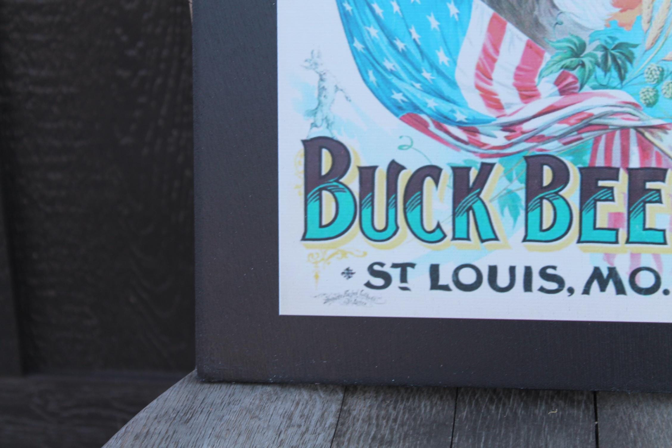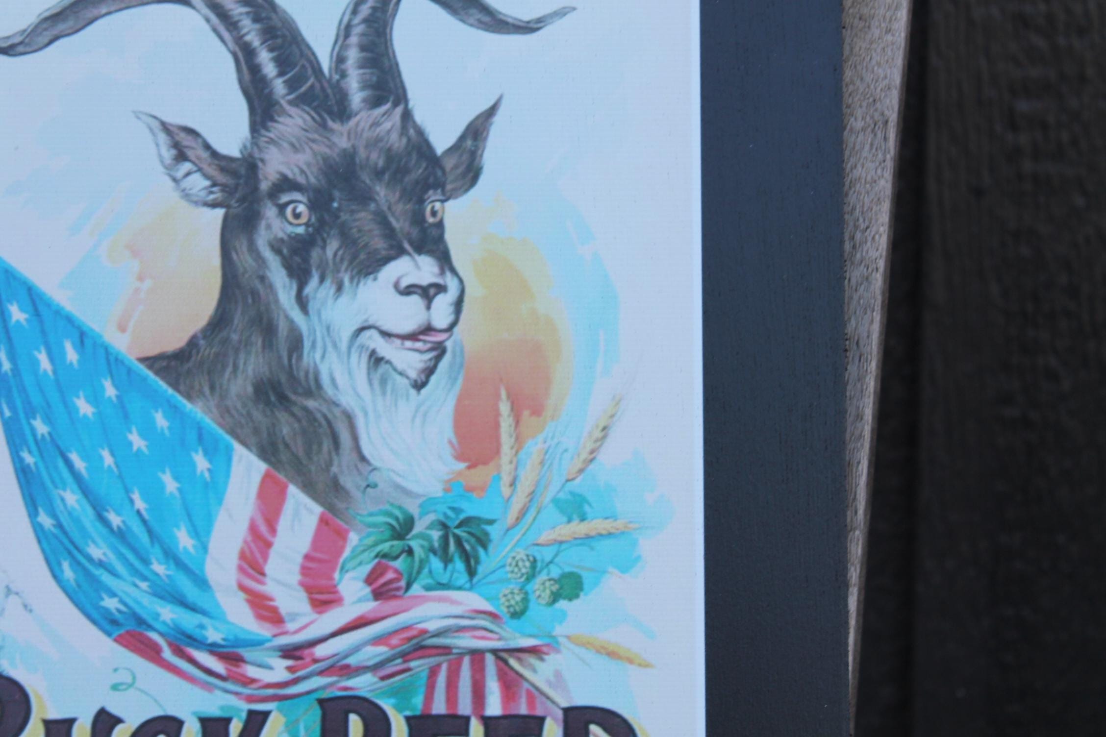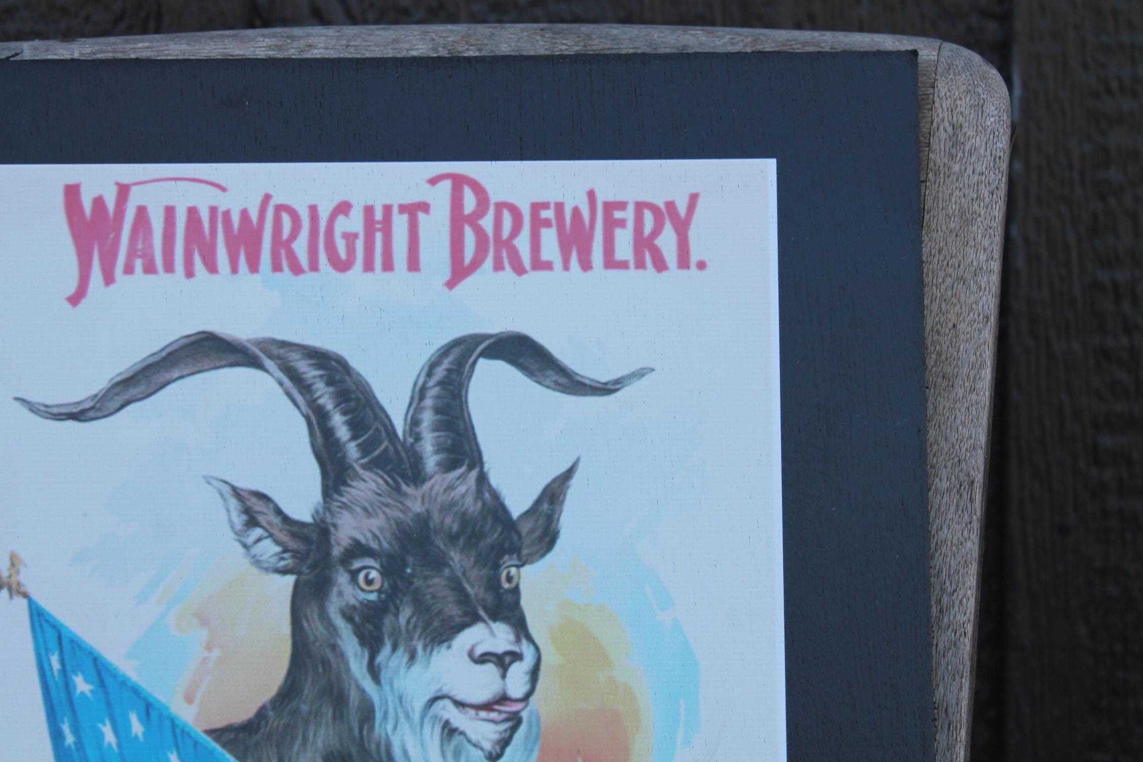 Celebrate classic American brewing heritage with this vintage-style Buck Beer poster wood print from Wainwright Brewery, St. Louis. Featuring a bold illustration of a goat wrapped in the American flag, surrounded by hops and barley, this artwork captures the spirited charm of early 20th-century beer advertising.